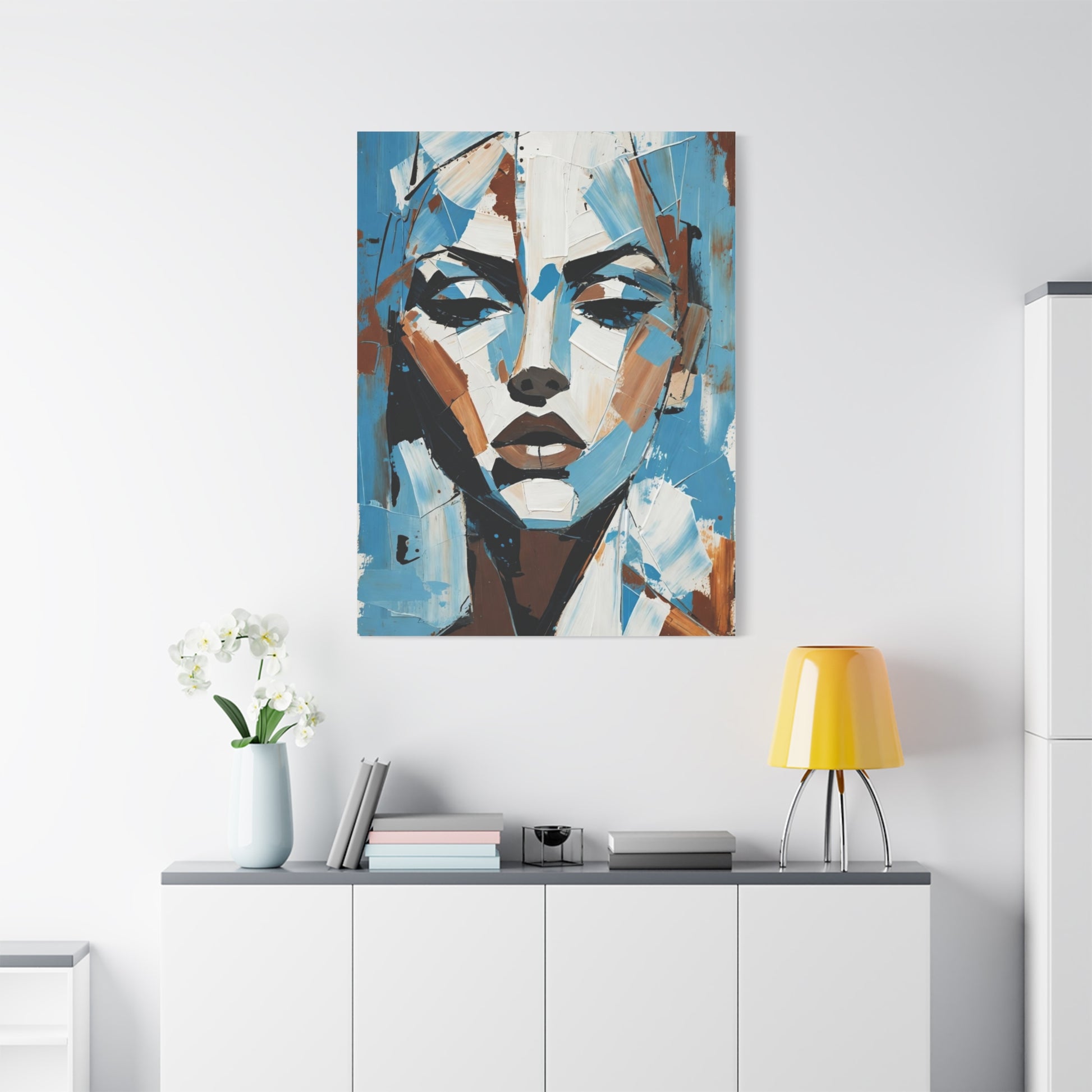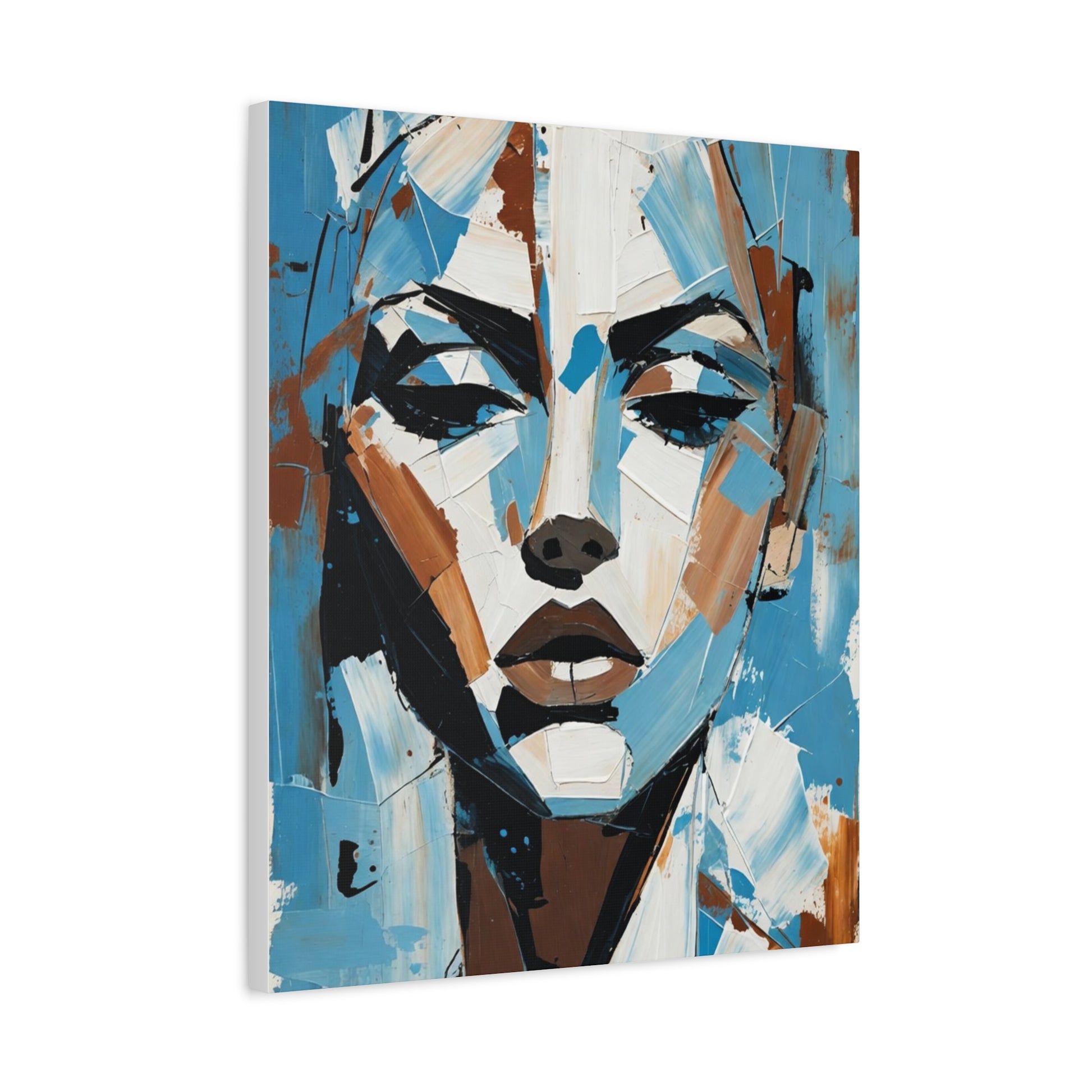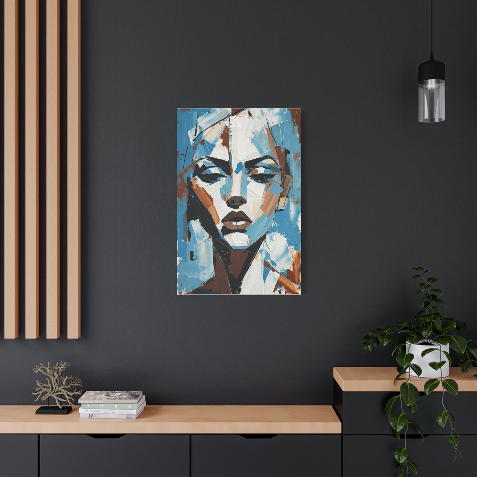 A bold, contemporary canvas print that brings striking abstract portraiture into any room. Thick, textured brushstrokes in cool blues and warm browns form a stylized female face that feels both distant and magnetic. The matte stretched canvas adds depth without glare, so the layered paint effects and strong contrasts read clearly from across a living room or studio. Hung on a clean white wall, it becomes a quiet focal point — modern, introspective, and expressive. For someone who curates spaces with personality, this piece anchors a gallery wall, completes a minimalist lounge, or adds soulful color to a creative workspace.