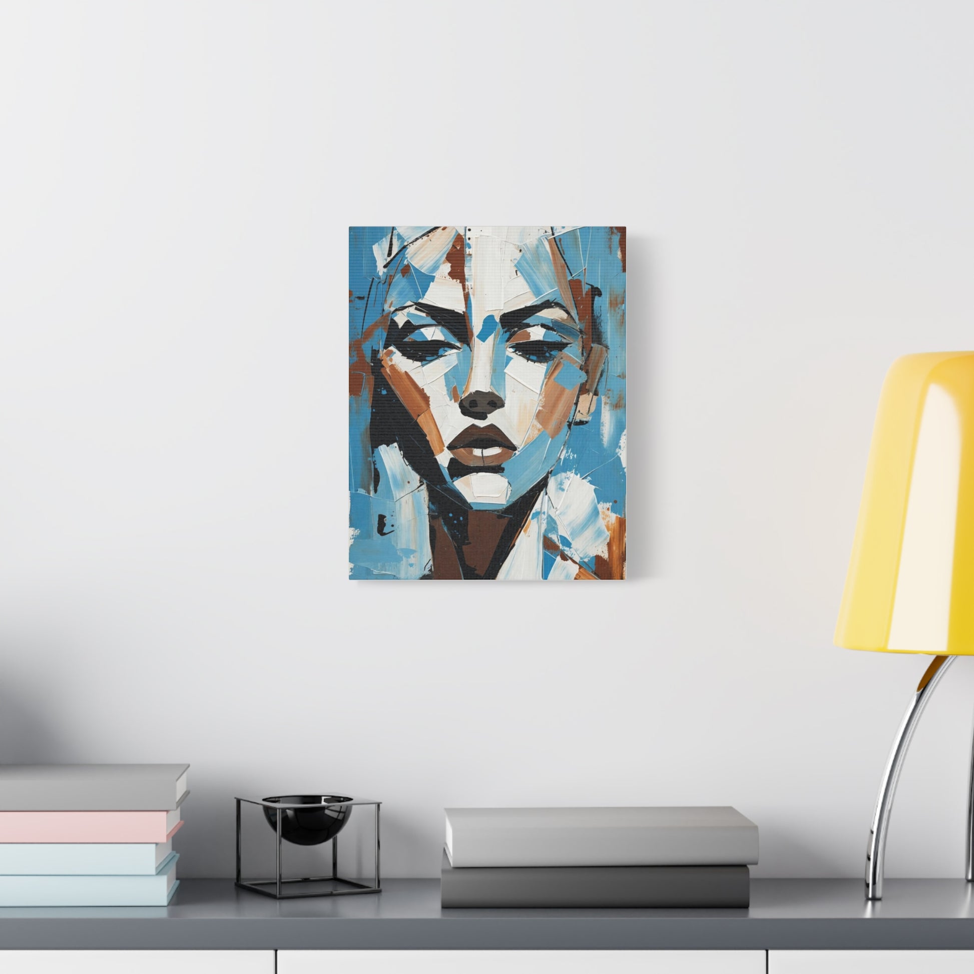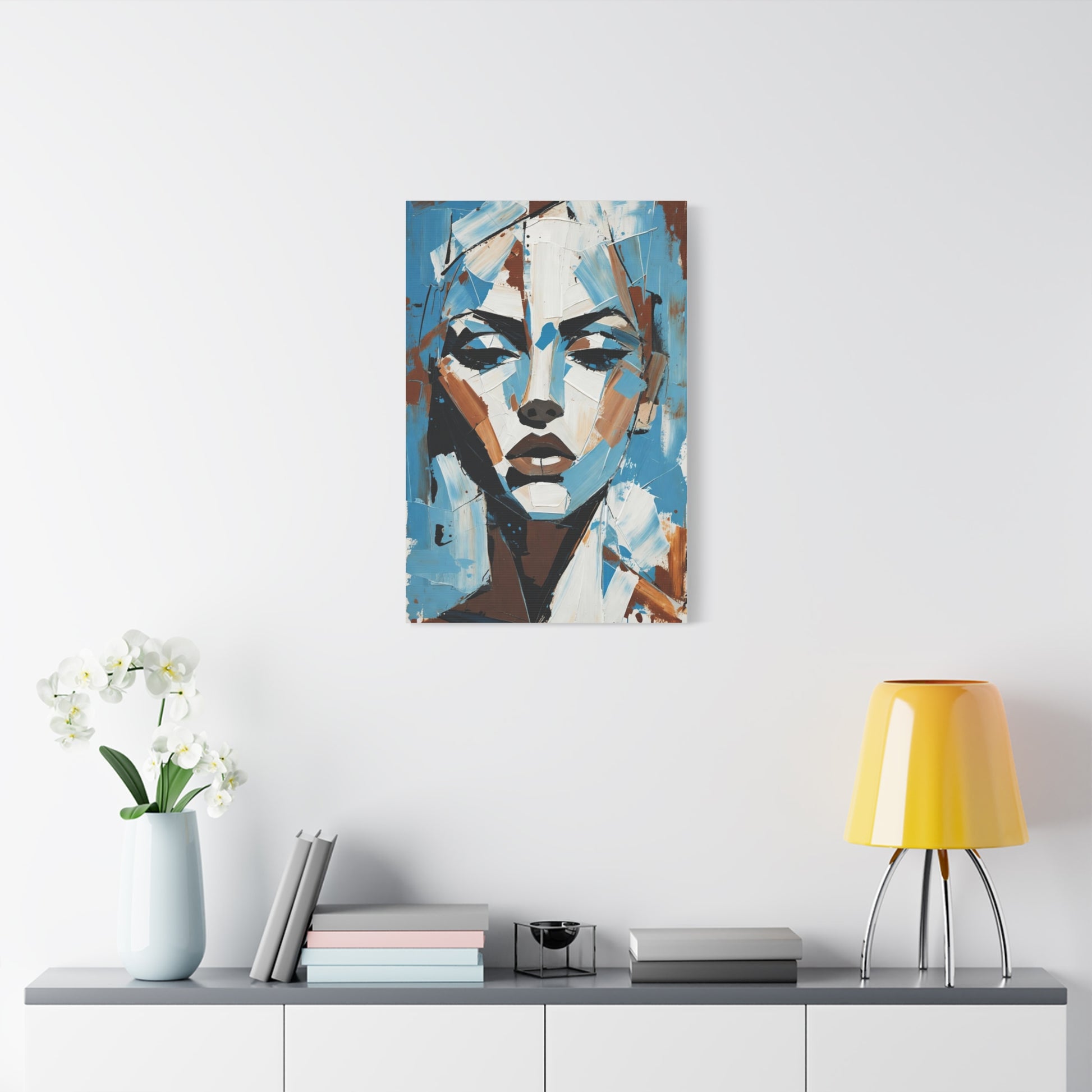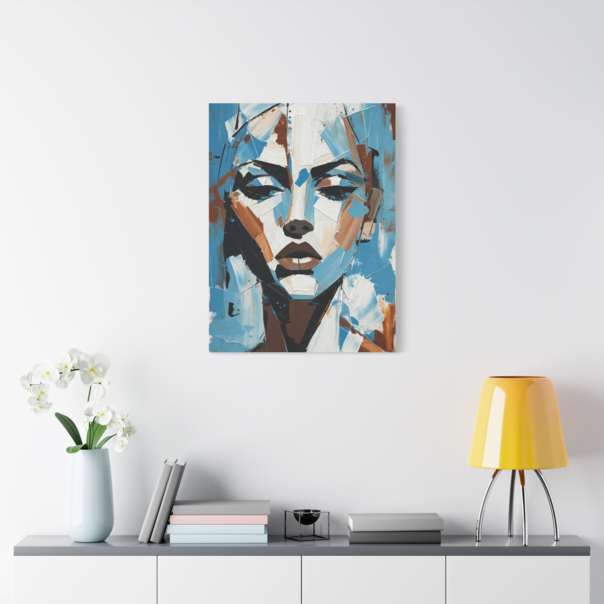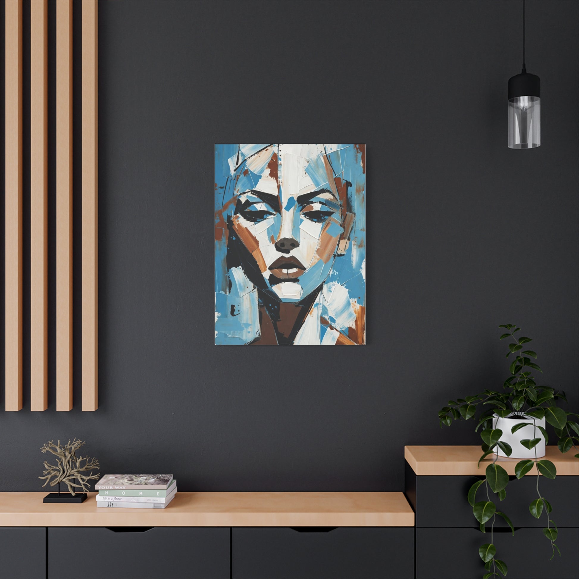 A bold, contemporary canvas print that brings striking abstract portraiture into any room. Thick, textured brushstrokes in cool blues and warm browns form a stylized female face that feels both distant and magnetic. The matte stretched canvas adds depth without glare, so the layered paint effects and strong contrasts read clearly from across a living room or studio. Hung on a clean white wall, it becomes a quiet focal point — modern, introspective, and expressive. For someone who curates spaces with personality, this piece anchors a gallery wall, completes a minimalist lounge, or adds soulful color to a creative workspace.