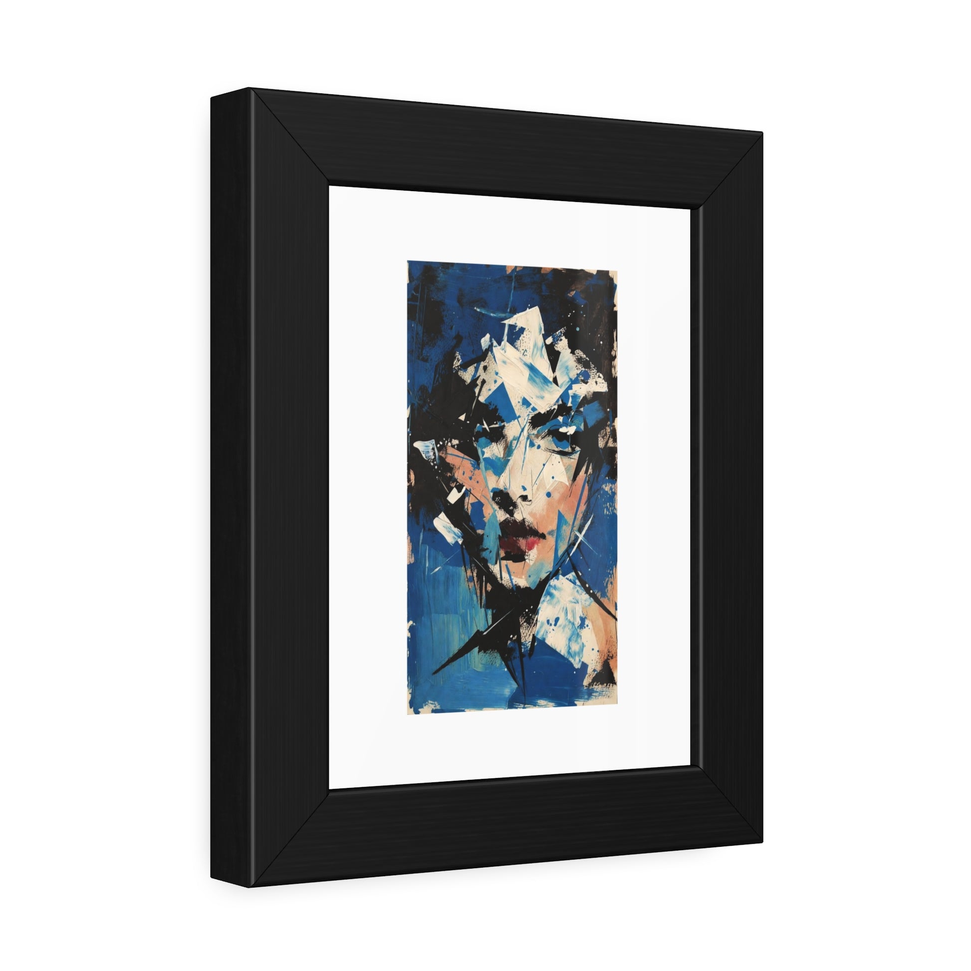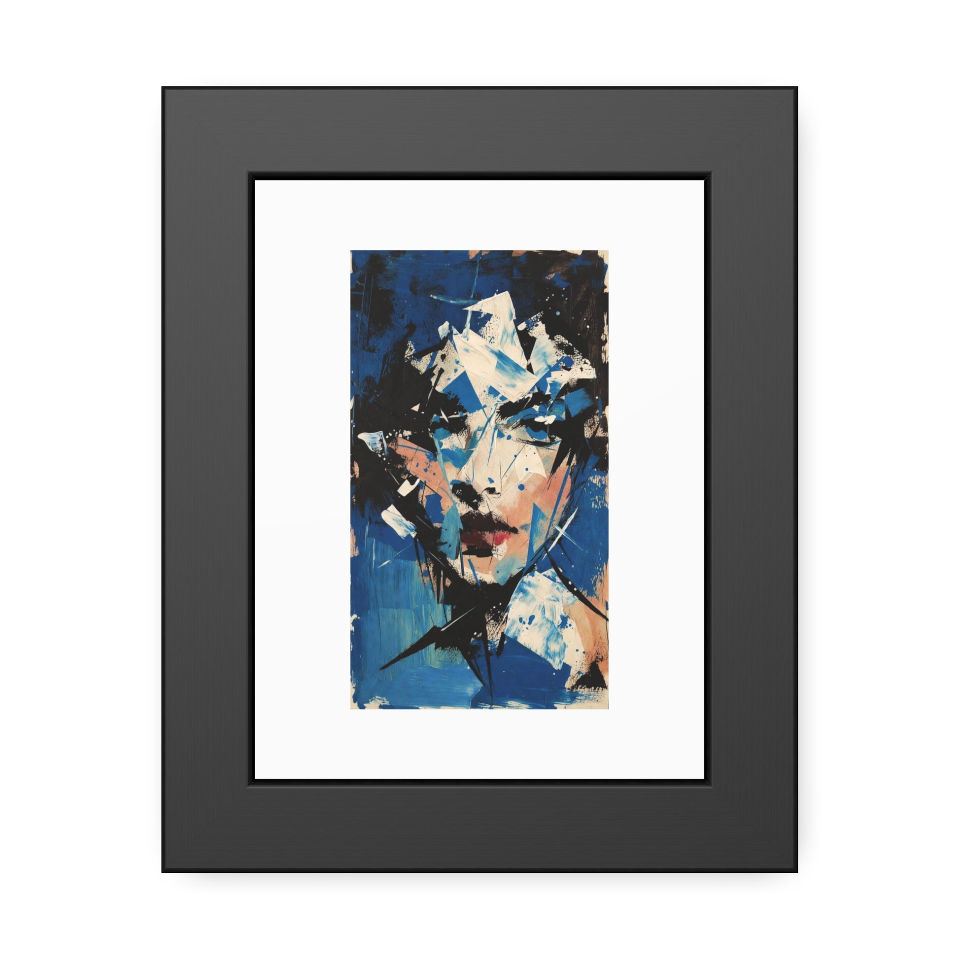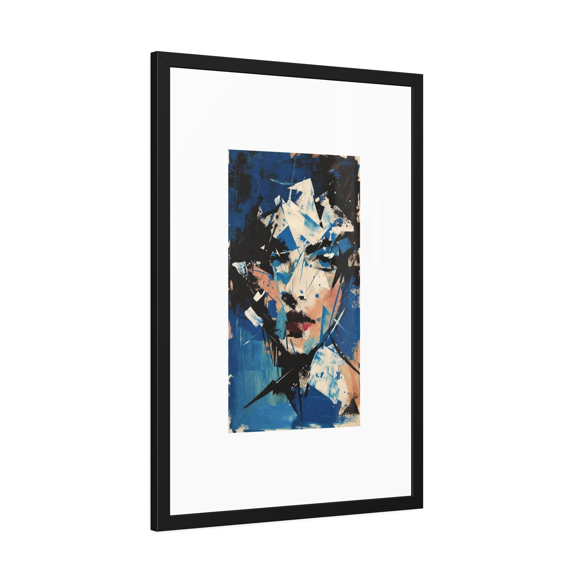 A striking framed paper poster that brings bold, modern art into the room with effortless presence. The expressive portrait uses fractured shapes and a moody blue palette that feels both intimate and cinematic. Each image is printed on your choice of fine art or semi-gloss paper, then nestled in a matte black pinewood frame with brown paper backing and shatter‑proof plexiglass — ready to hang straight from the moment it arrives. It anchors gallery walls, apartment nooks, or office corners with a confident, contemporary voice.