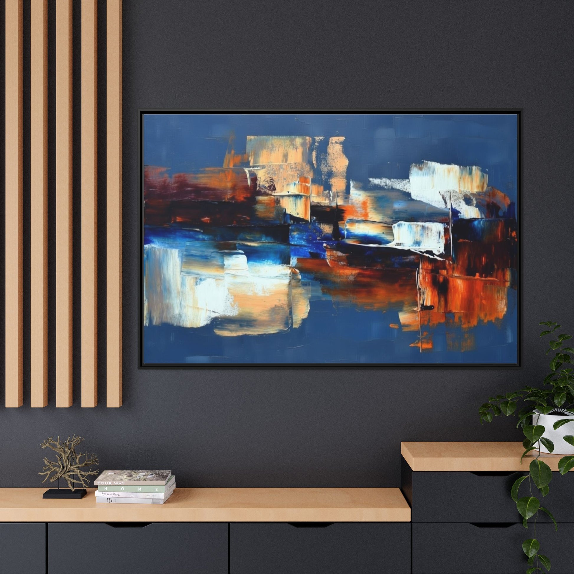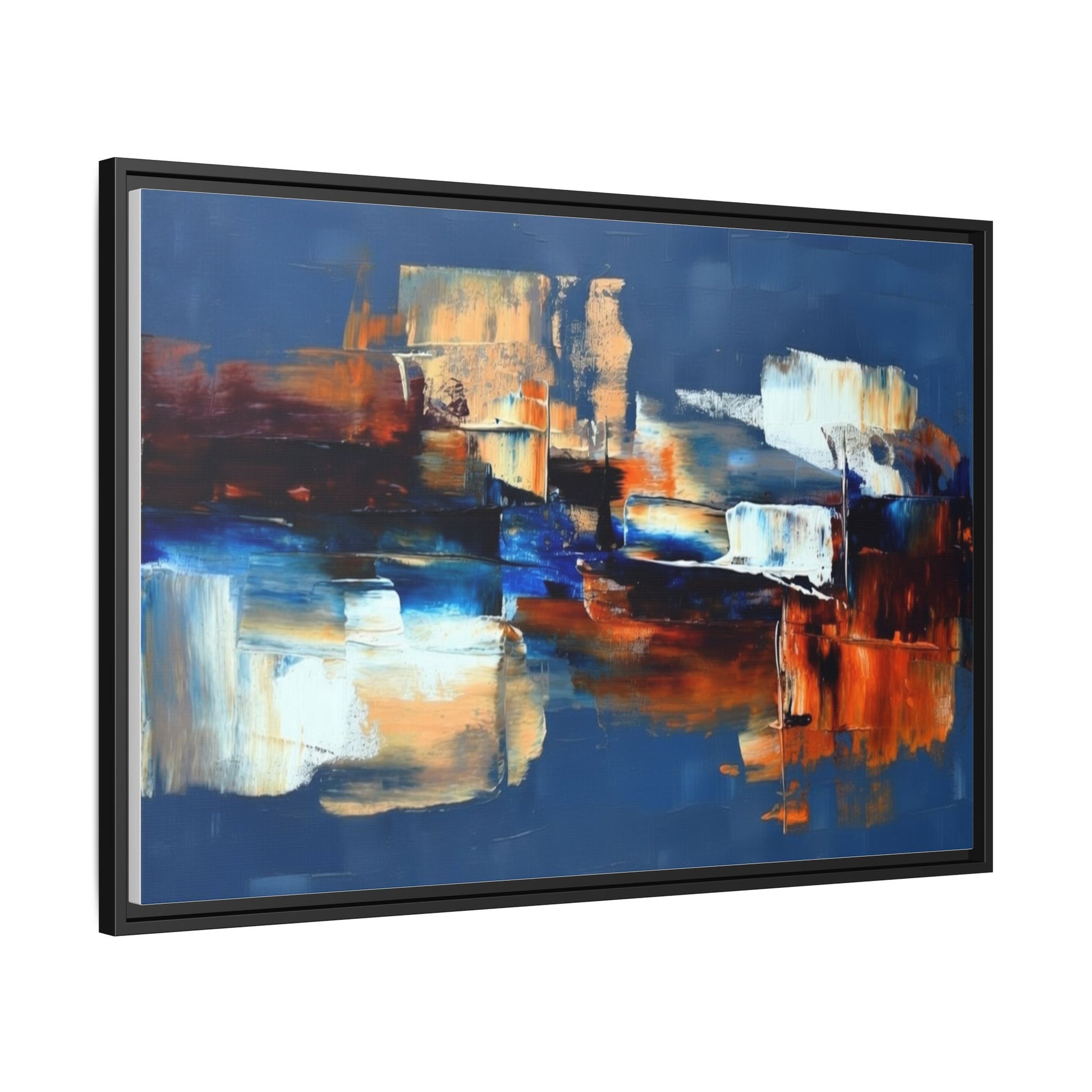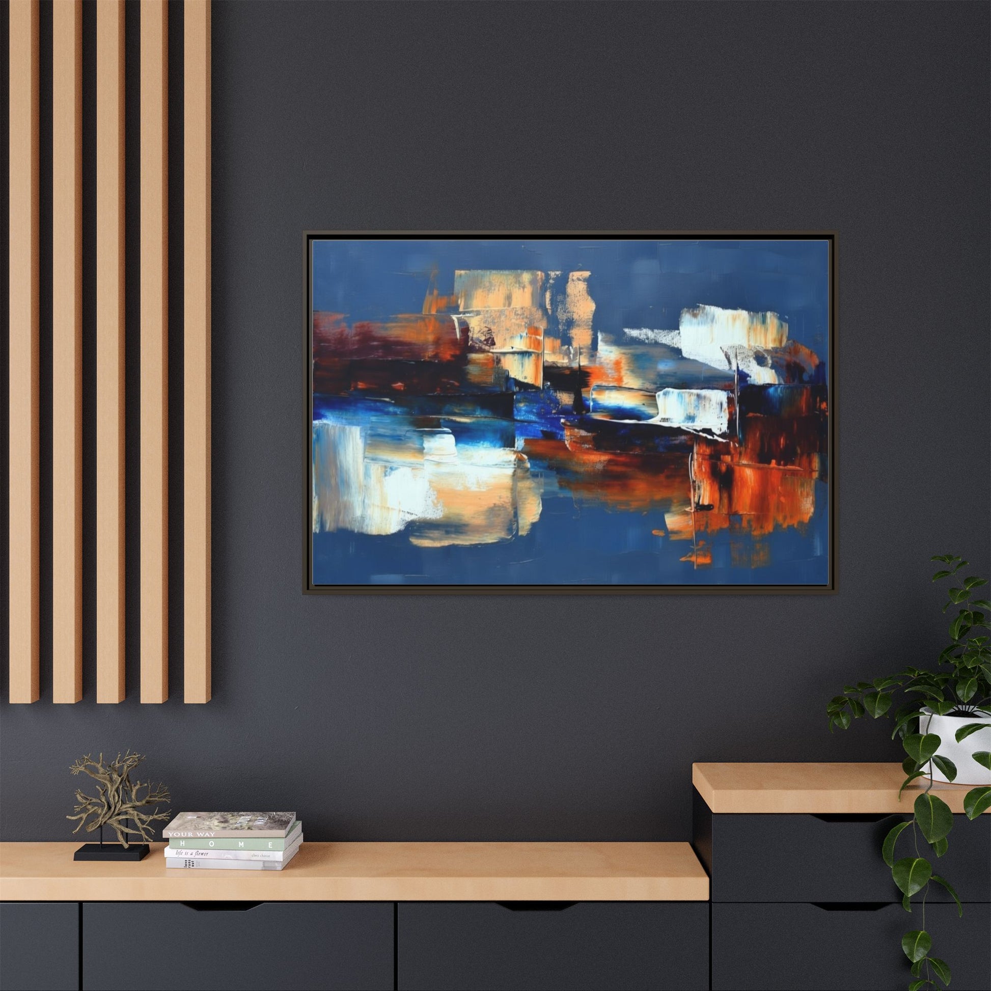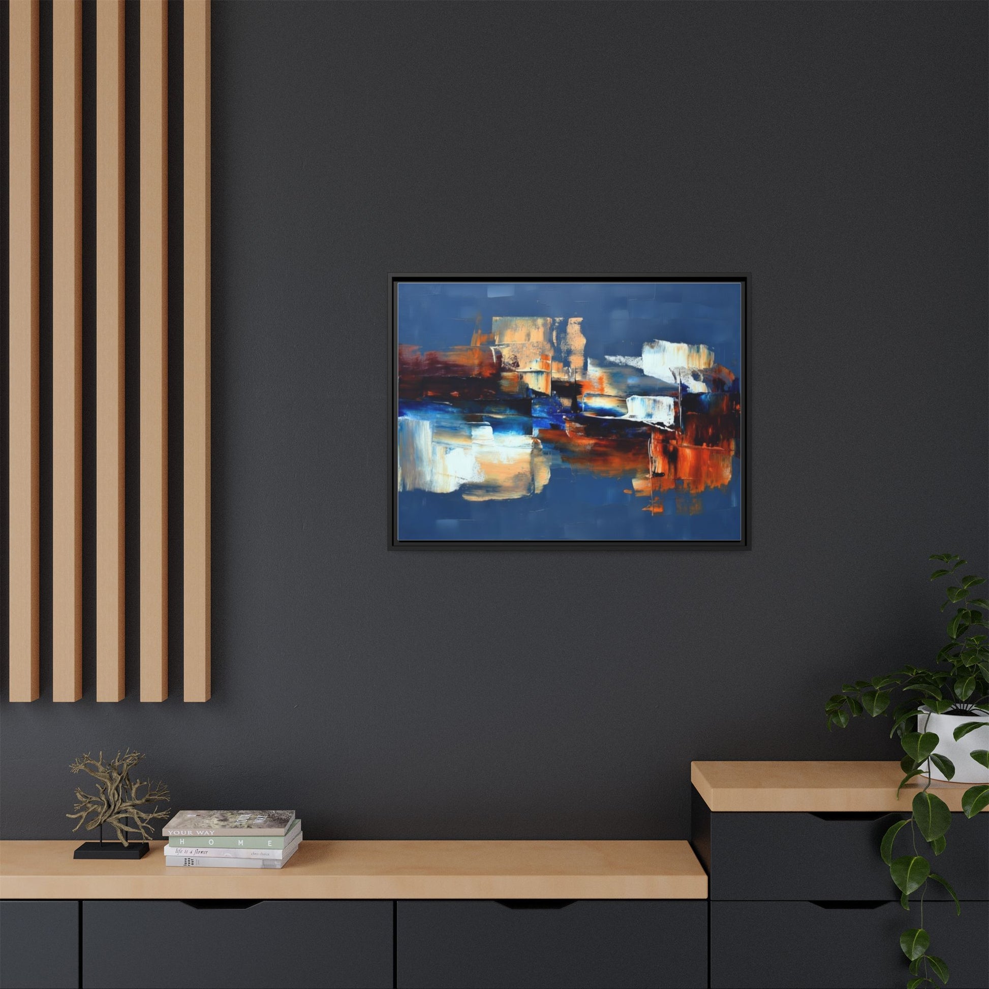This framed matte canvas brings painterly depth and modern energy to walls that need personality. Rich indigo and warm amber strokes form an abstract landscape that reads differently from every angle — bold where it needs to be, quietly layered elsewhere. The slim pine frame in black gives the piece a gallery-ready presence while the matte coating keeps glare low and colors true. Hang it over a sofa, in a hallway, or above a desk to anchor a room with color and movement. It pairs naturally with mid-century and contemporary interiors, and adds a confident, handcrafted touch to curated spaces.