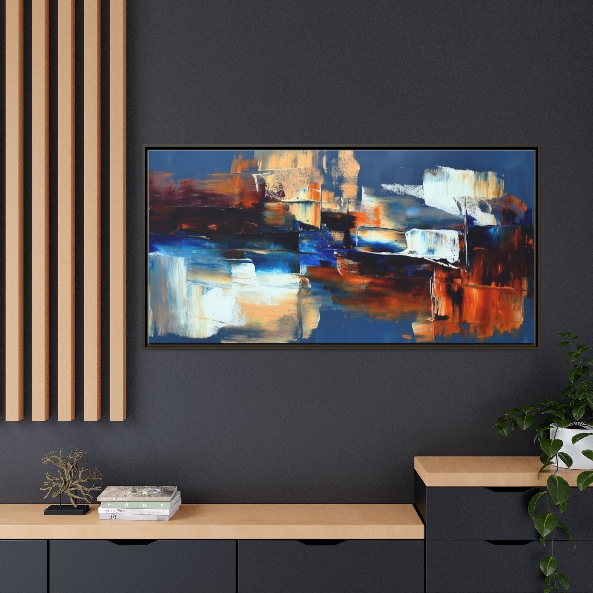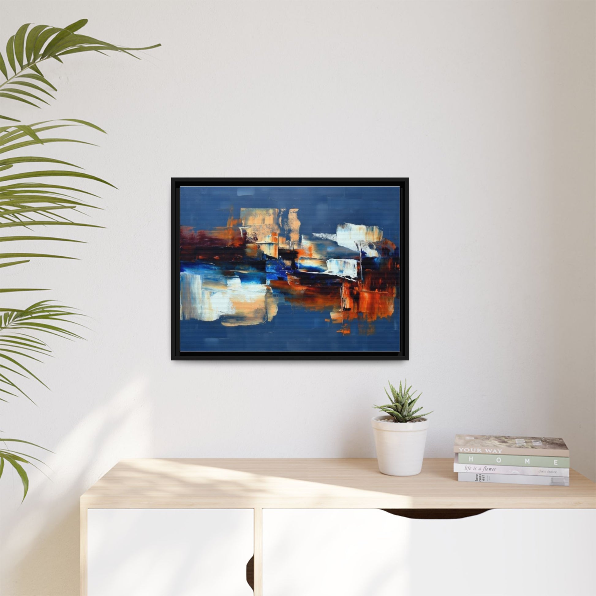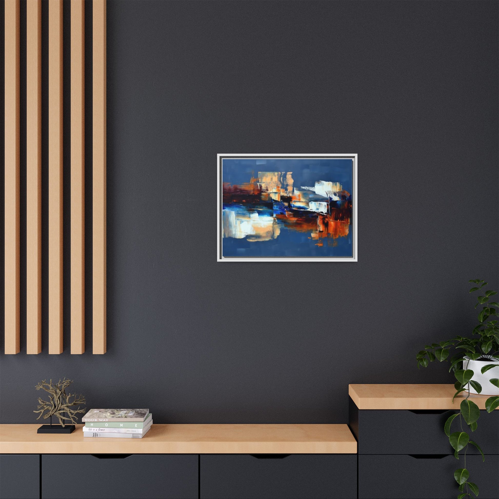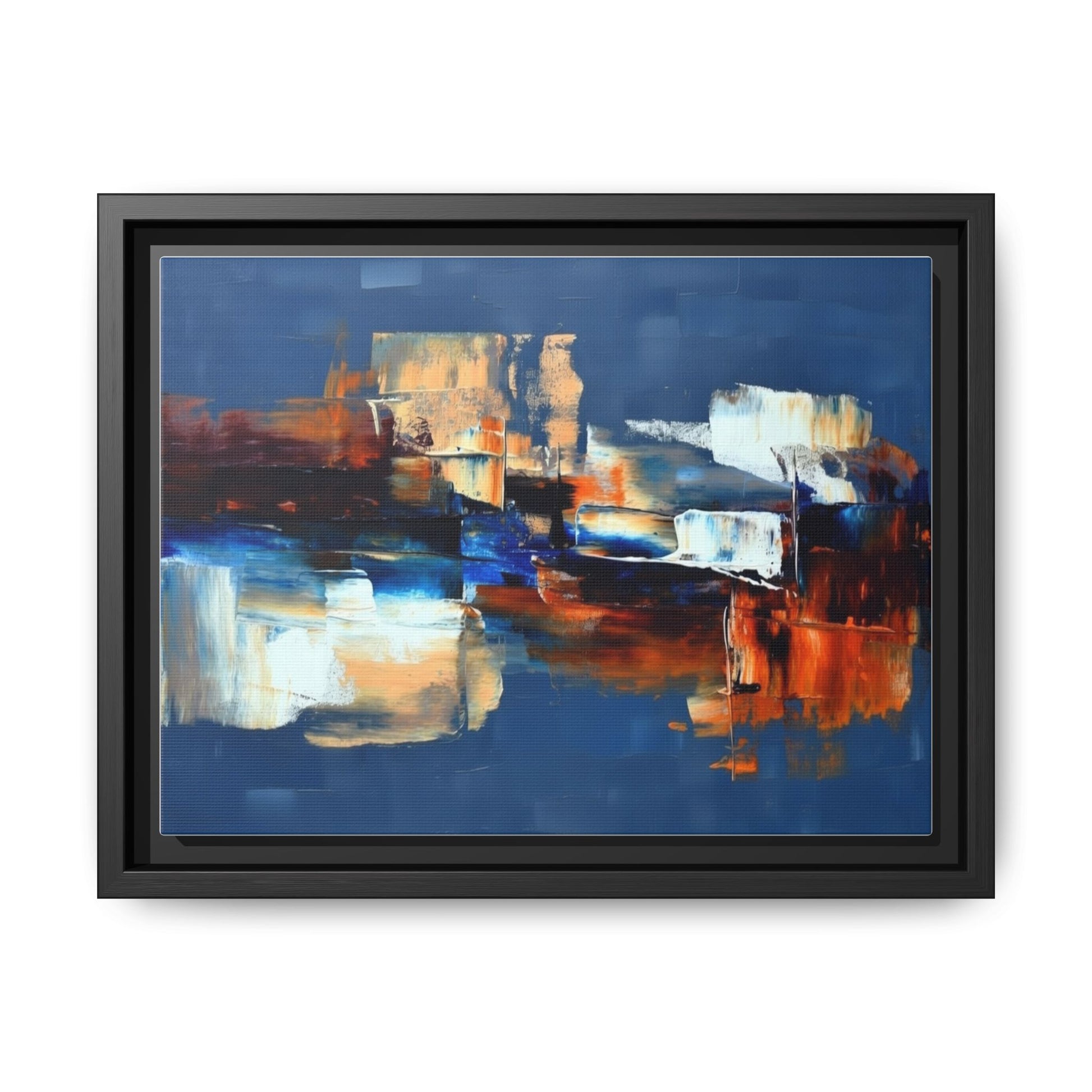 This framed matte canvas brings painterly depth and modern energy to walls that need personality. Rich indigo and warm amber strokes form an abstract landscape that reads differently from every angle — bold where it needs to be, quietly layered elsewhere. The slim pine frame in black gives the piece a gallery-ready presence while the matte coating keeps glare low and colors true. Hang it over a sofa, in a hallway, or above a desk to anchor a room with color and movement. It pairs naturally with mid-century and contemporary interiors, and adds a confident, handcrafted touch to curated spaces.