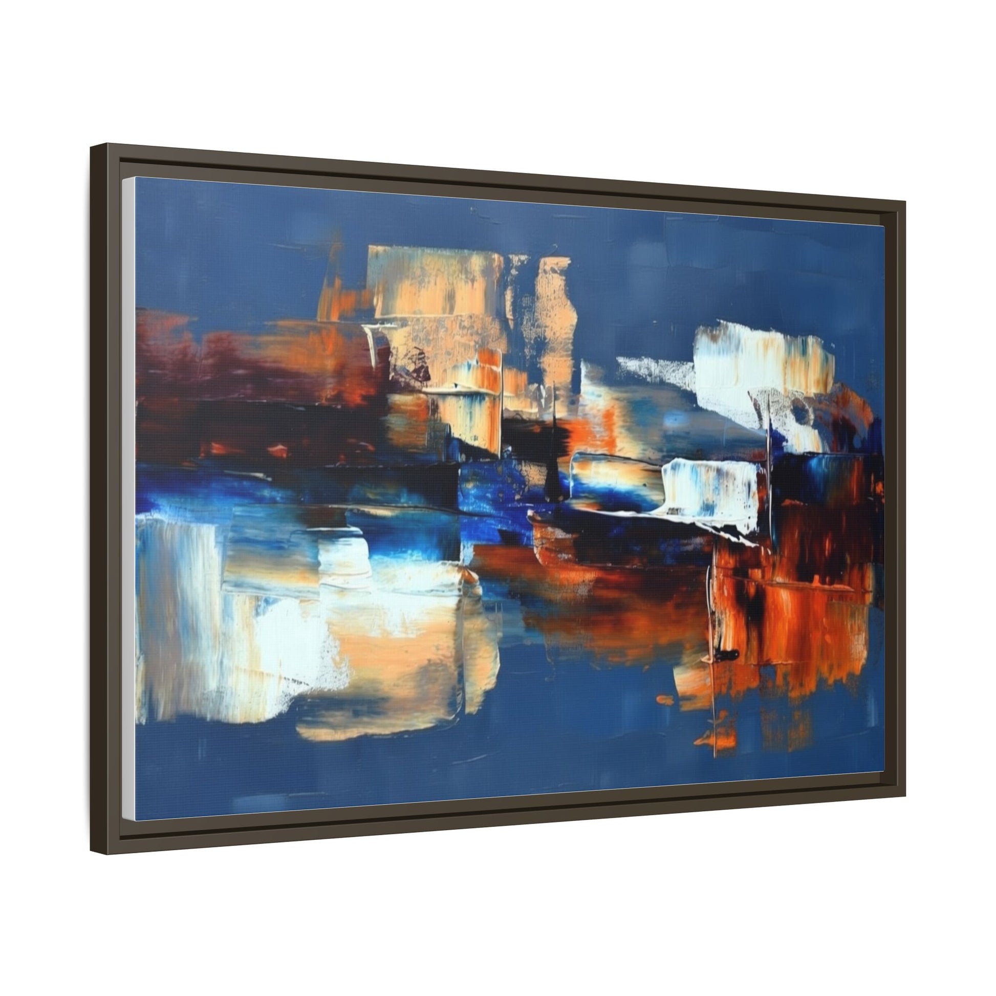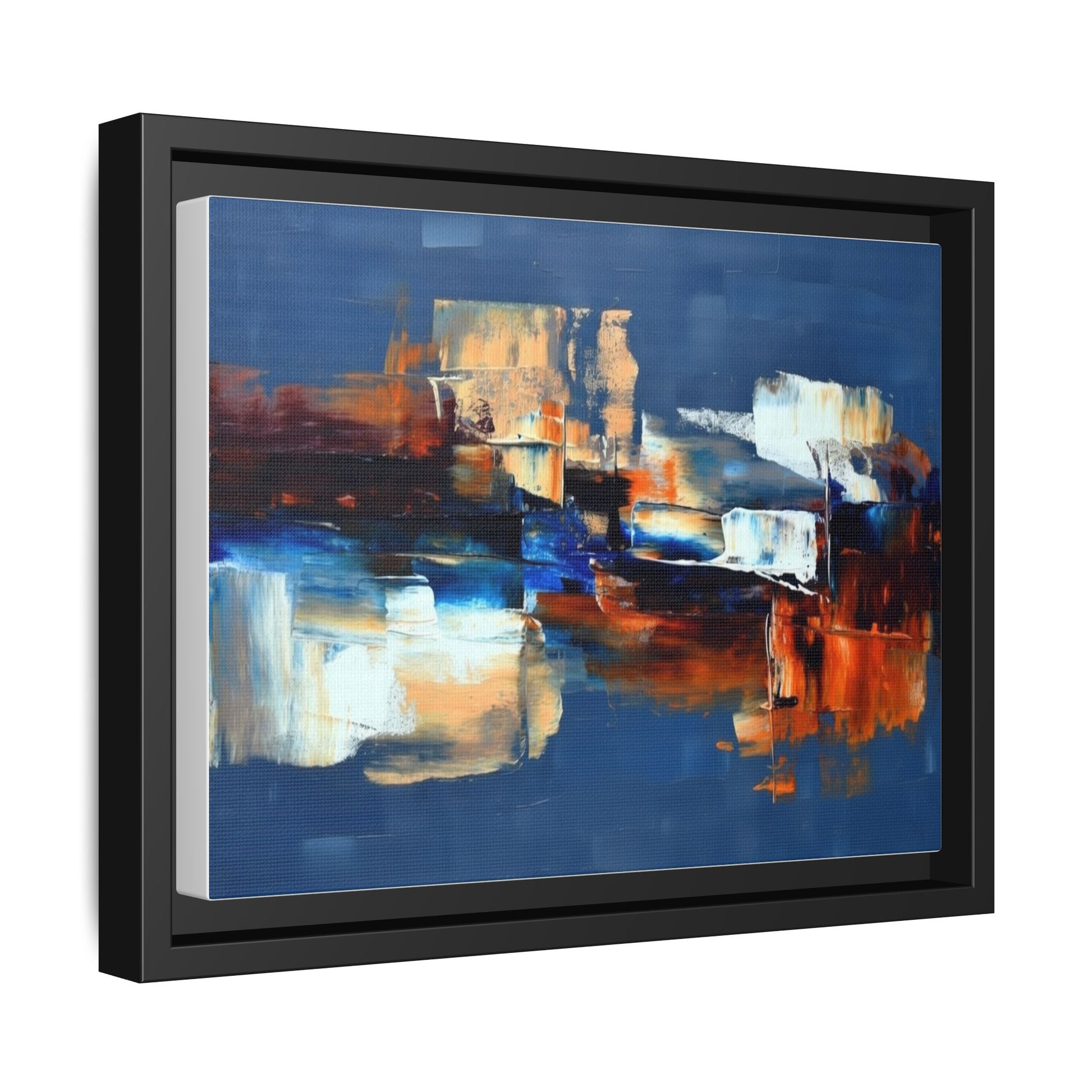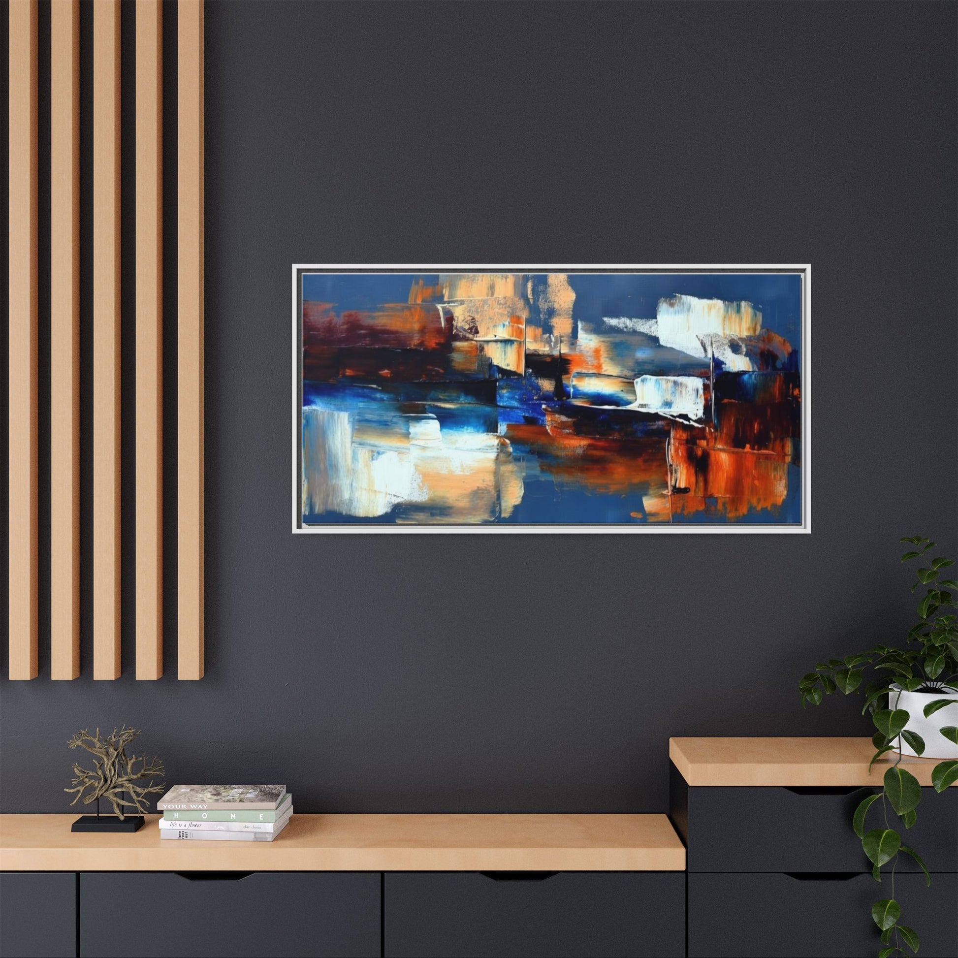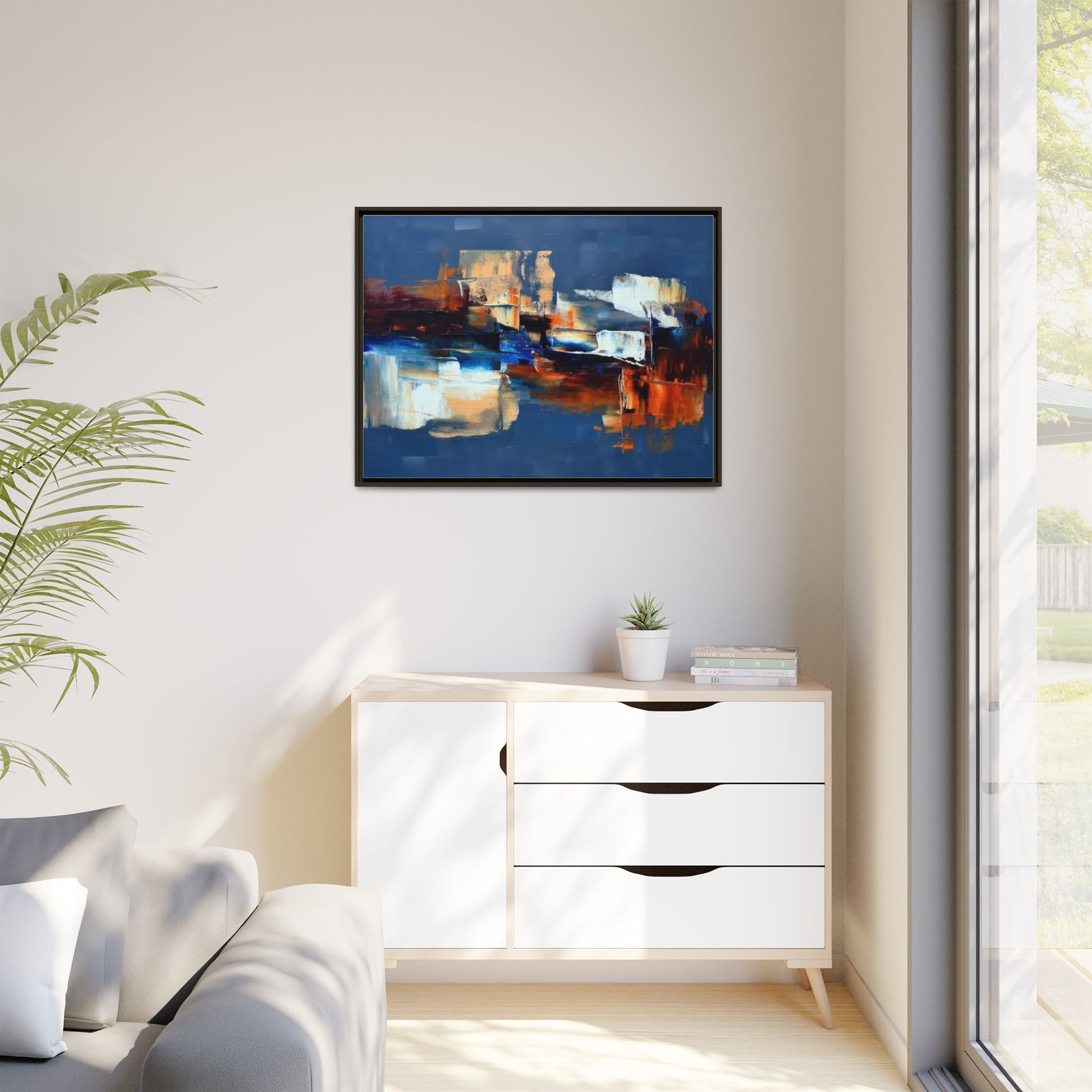 This framed matte canvas brings painterly depth and modern energy to walls that need personality. Rich indigo and warm amber strokes form an abstract landscape that reads differently from every angle — bold where it needs to be, quietly layered elsewhere. The slim pine frame in black gives the piece a gallery-ready presence while the matte coating keeps glare low and colors true. Hang it over a sofa, in a hallway, or above a desk to anchor a room with color and movement. It pairs naturally with mid-century and contemporary interiors, and adds a confident, handcrafted touch to curated spaces.