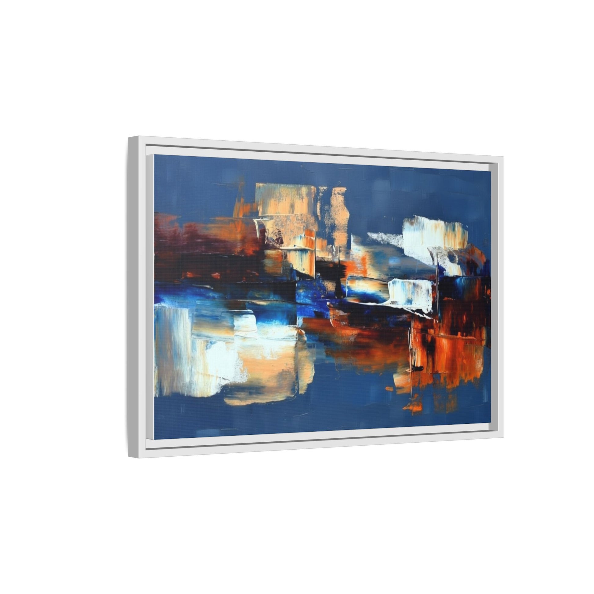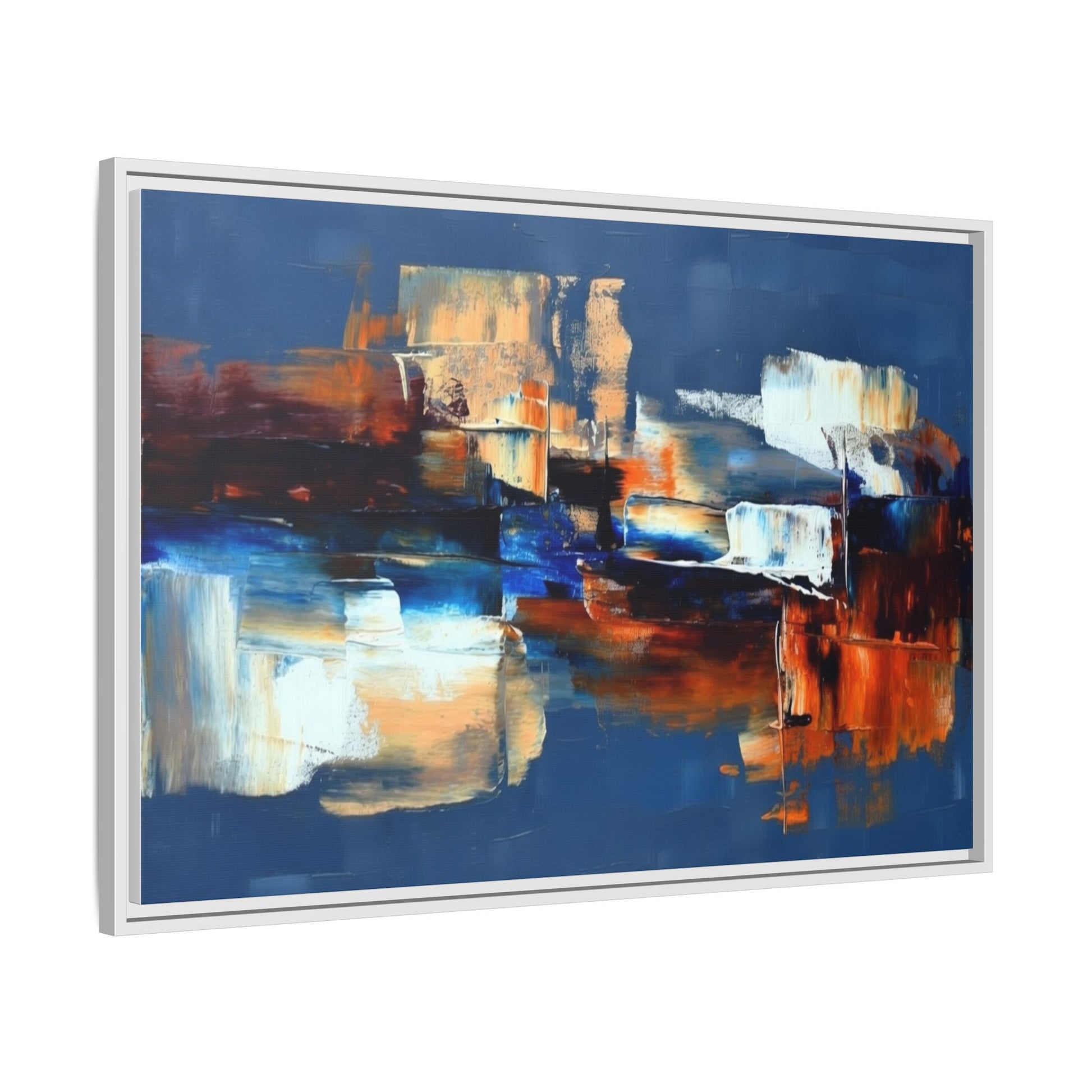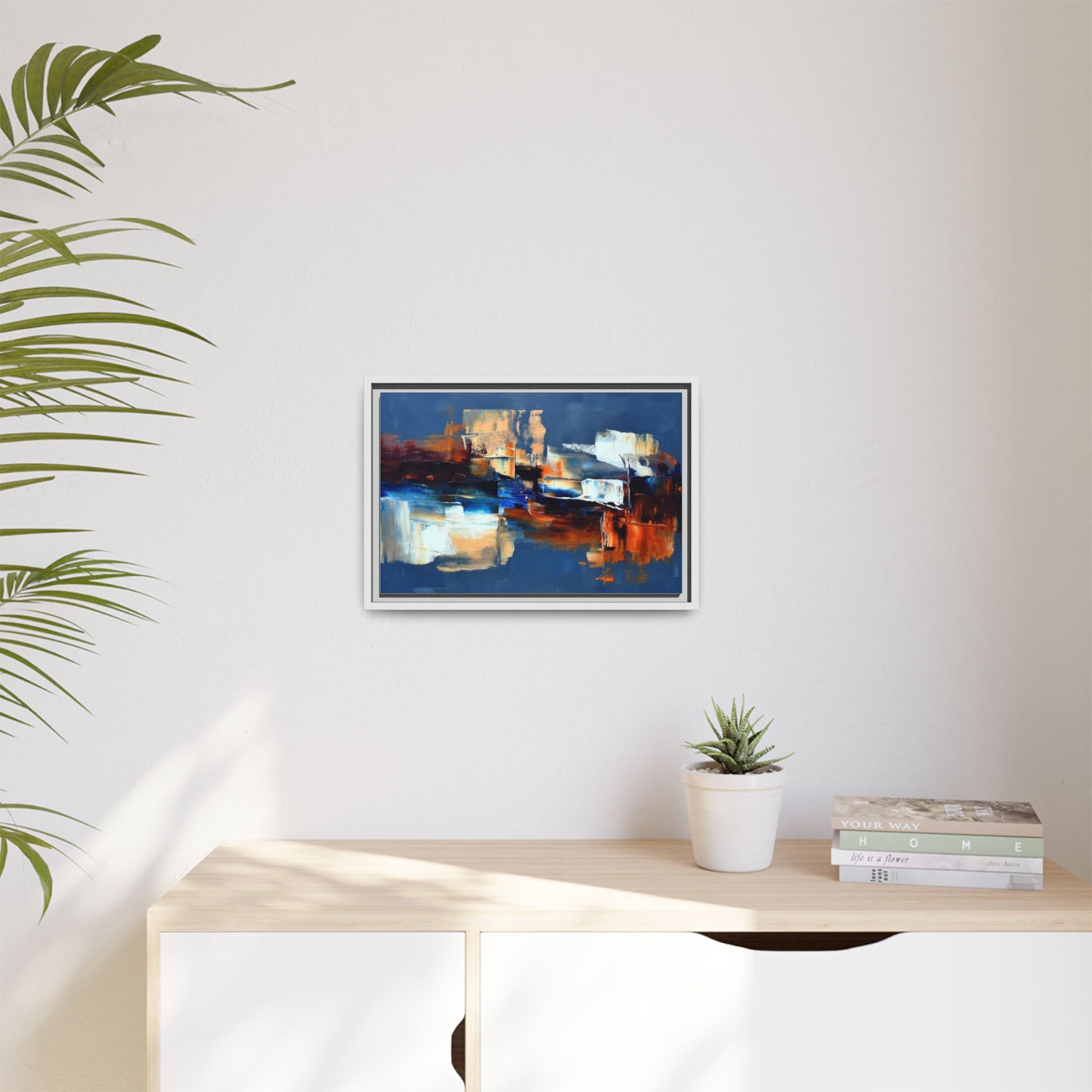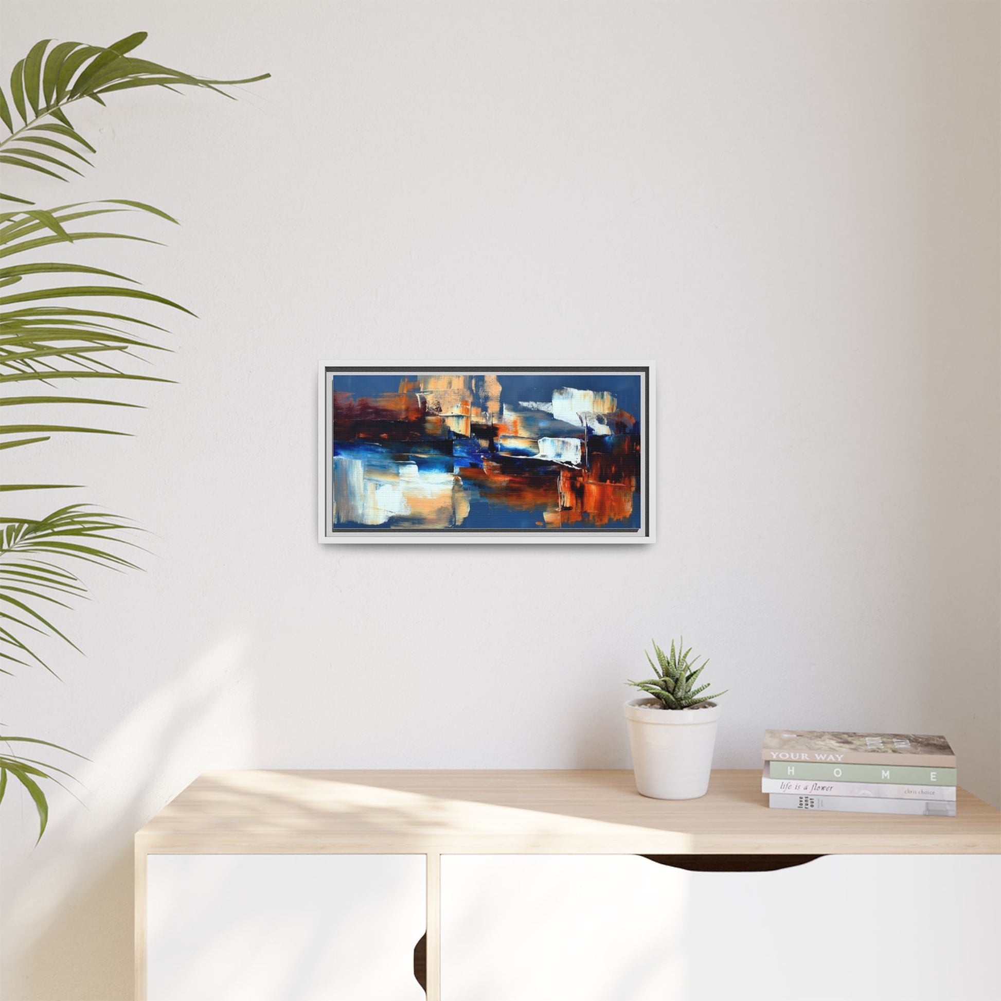 This framed matte canvas brings painterly depth and modern energy to walls that need personality. Rich indigo and warm amber strokes form an abstract landscape that reads differently from every angle — bold where it needs to be, quietly layered elsewhere. The slim pine frame in black gives the piece a gallery-ready presence while the matte coating keeps glare low and colors true. Hang it over a sofa, in a hallway, or above a desk to anchor a room with color and movement. It pairs naturally with mid-century and contemporary interiors, and adds a confident, handcrafted touch to curated spaces.