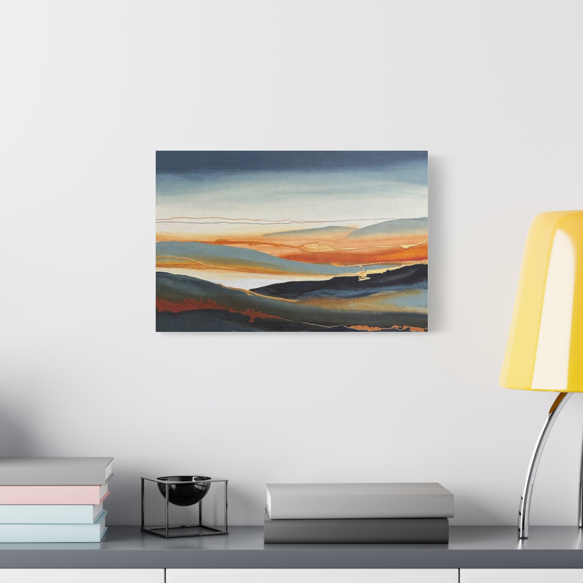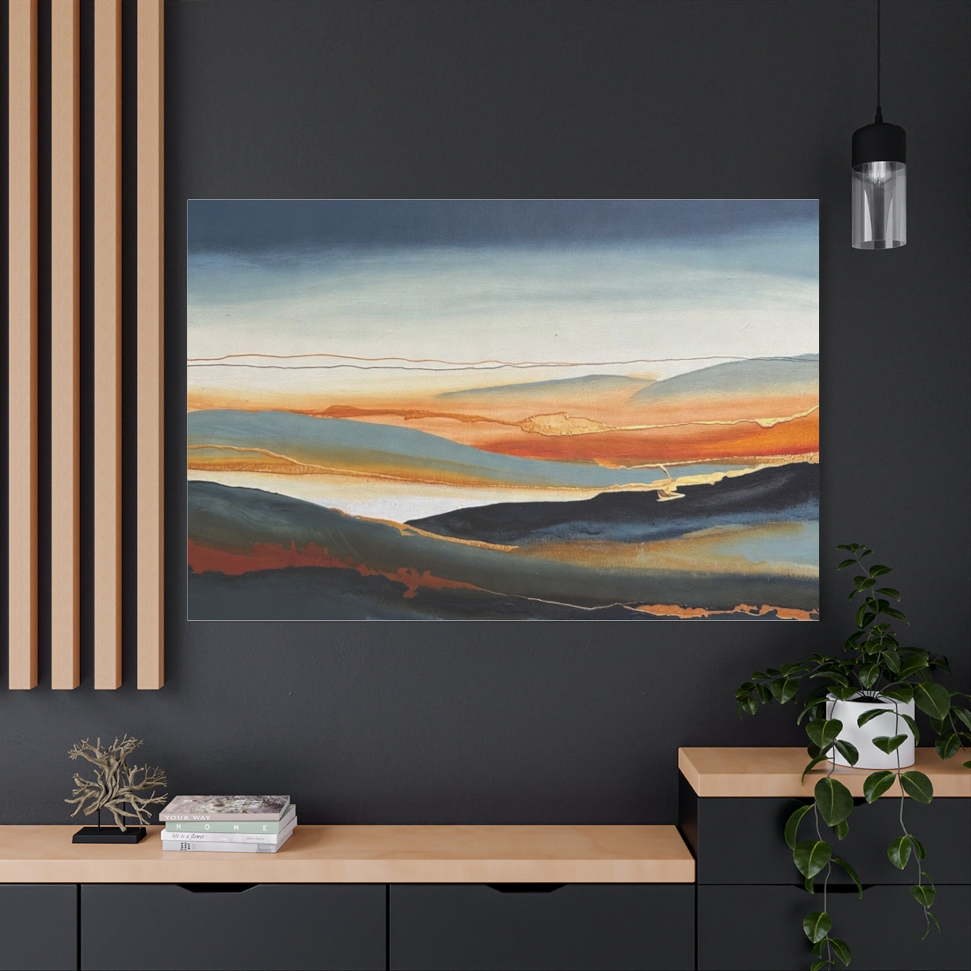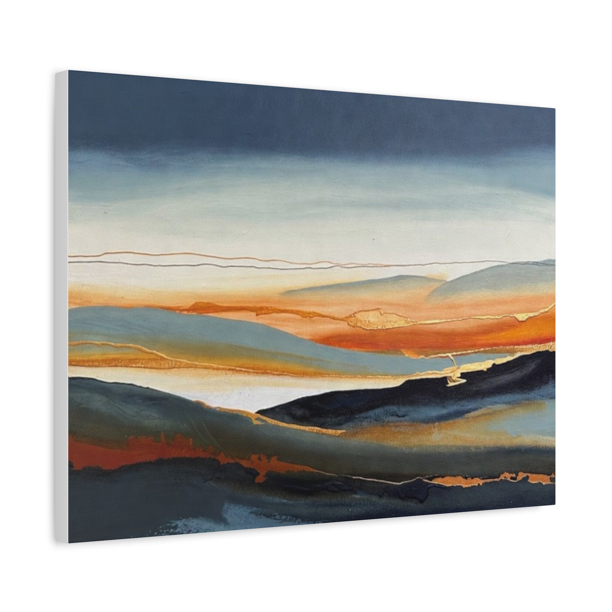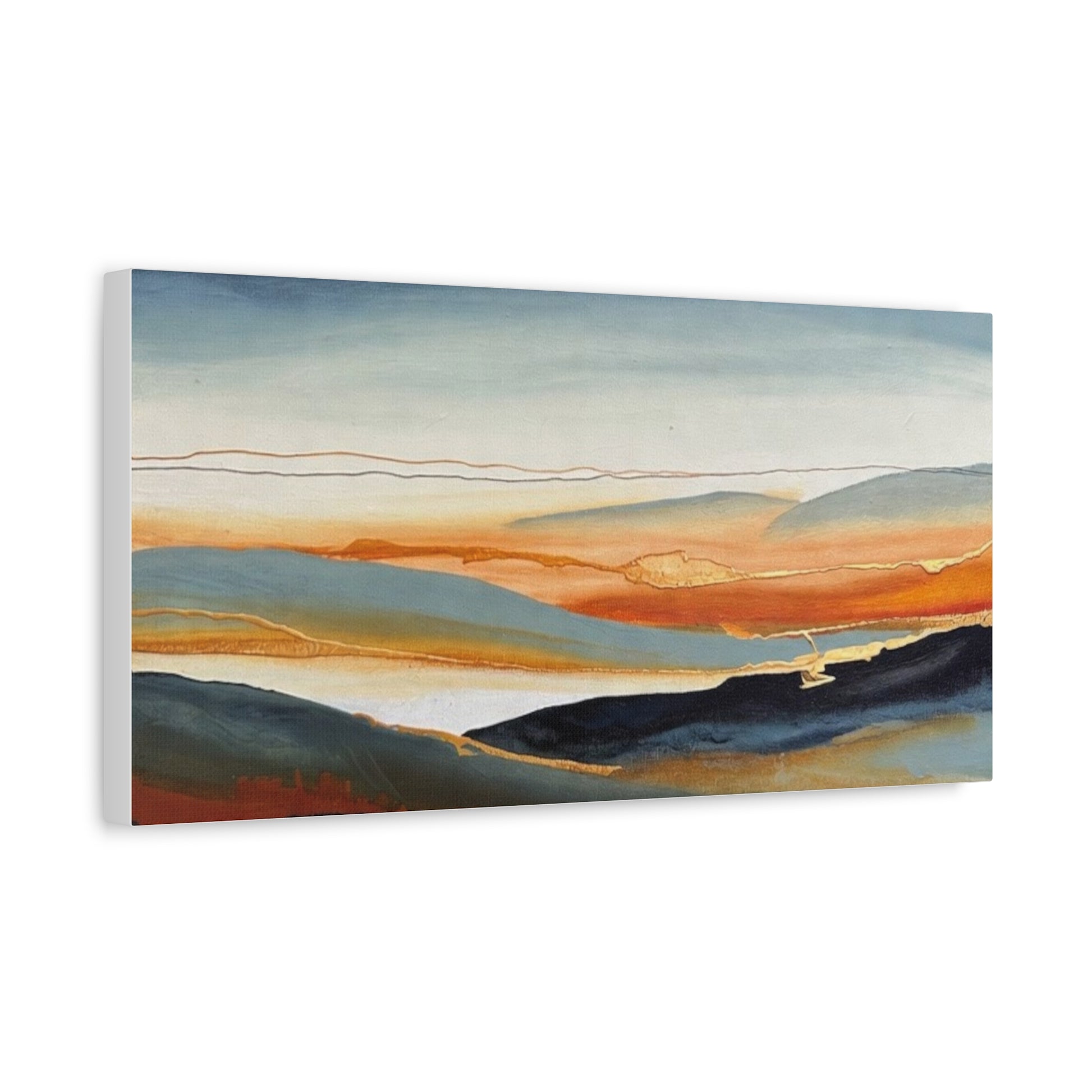 A matte stretched canvas that brings a calm, painterly landscape into your room. The surface has a soft, non-reflective finish that highlights layered washes of deep indigo, warm amber, and muted teal, letting brush-like textures and subtle gold accents breathe. Stretched on a slim 1.25" pine profile, it hangs with a low silhouette that complements modern, coastal, and rustic interiors alike. The print’s gentle horizon and fluid lines create a quiet, contemplative focal point — the kind of piece that settles a space and invites a slow inhale after a busy day.