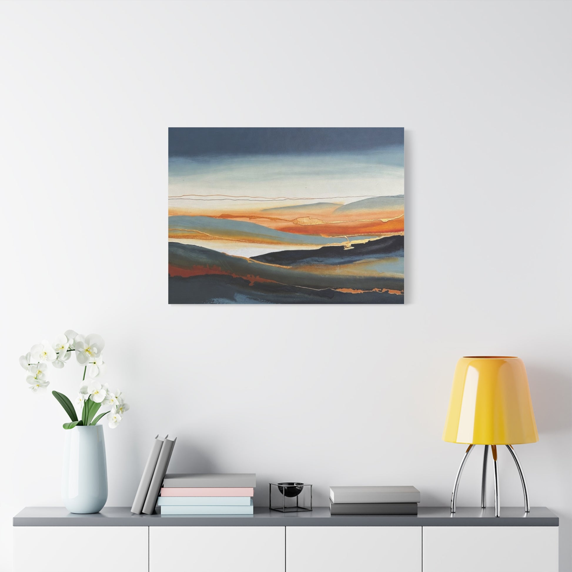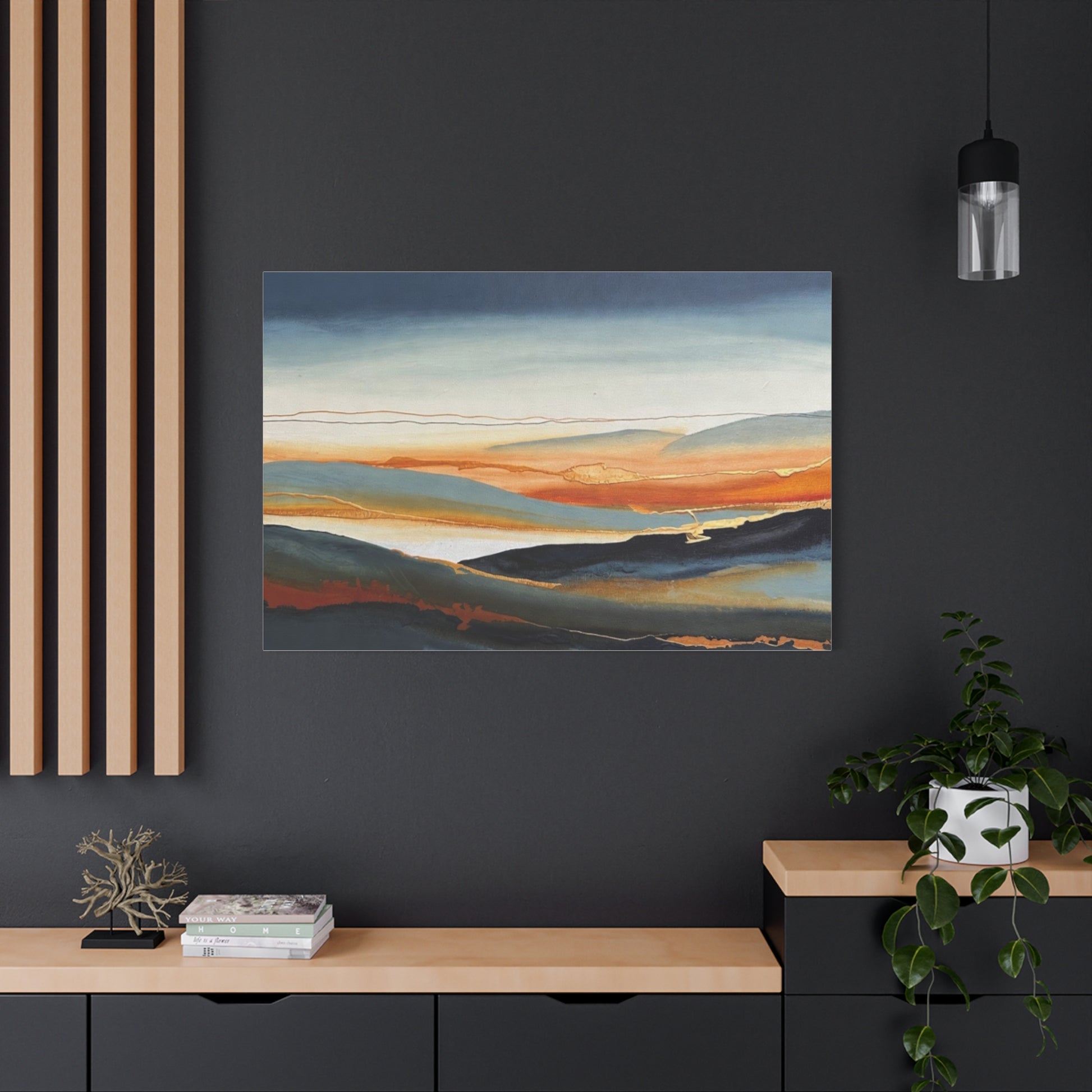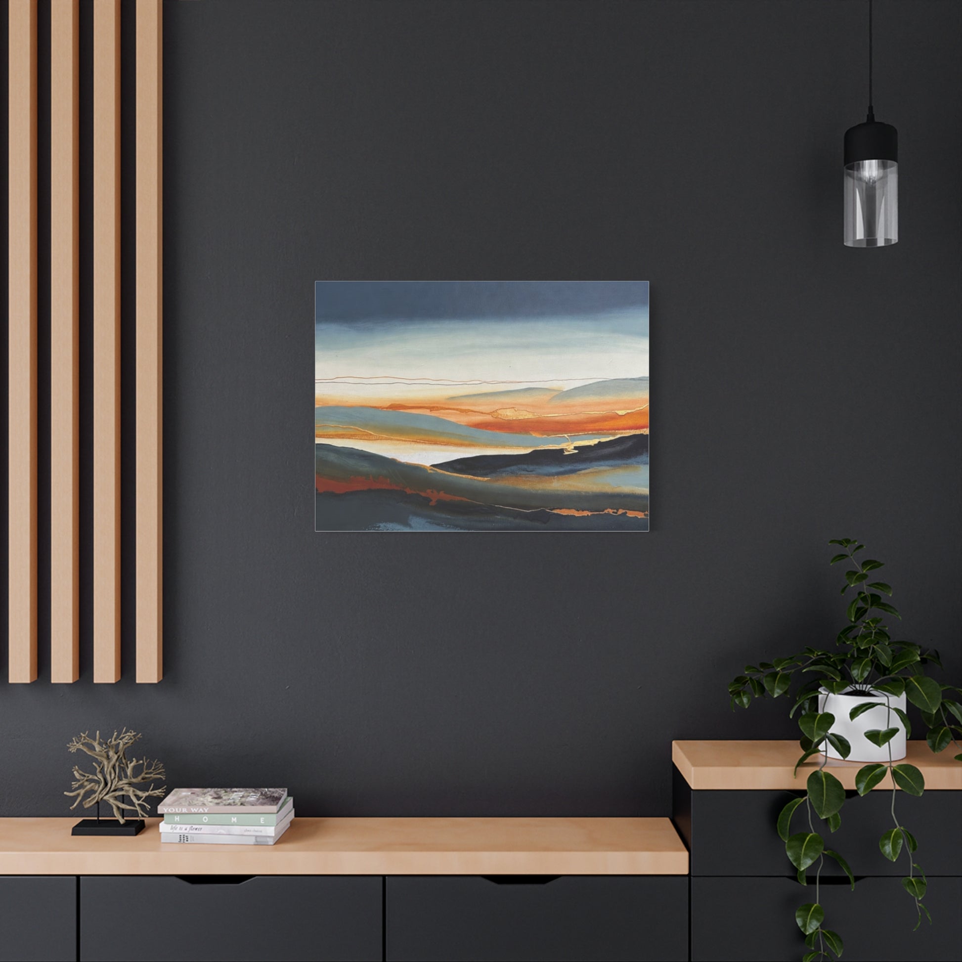 A matte stretched canvas that brings a calm, painterly landscape into your room. The surface has a soft, non-reflective finish that highlights layered washes of deep indigo, warm amber, and muted teal, letting brush-like textures and subtle gold accents breathe. Stretched on a slim 1.25" pine profile, it hangs with a low silhouette that complements modern, coastal, and rustic interiors alike. The print’s gentle horizon and fluid lines create a quiet, contemplative focal point — the kind of piece that settles a space and invites a slow inhale after a busy day.