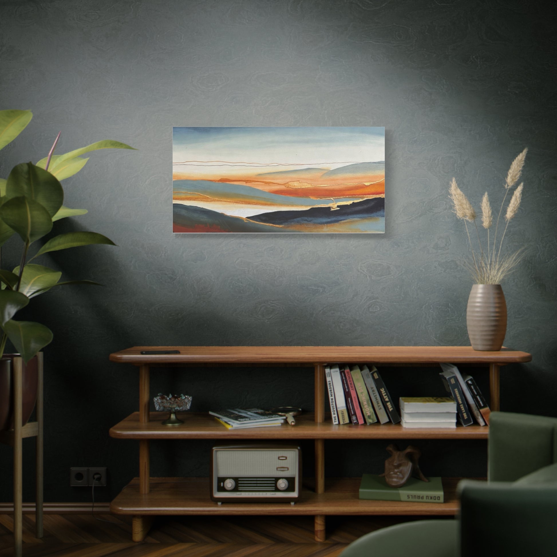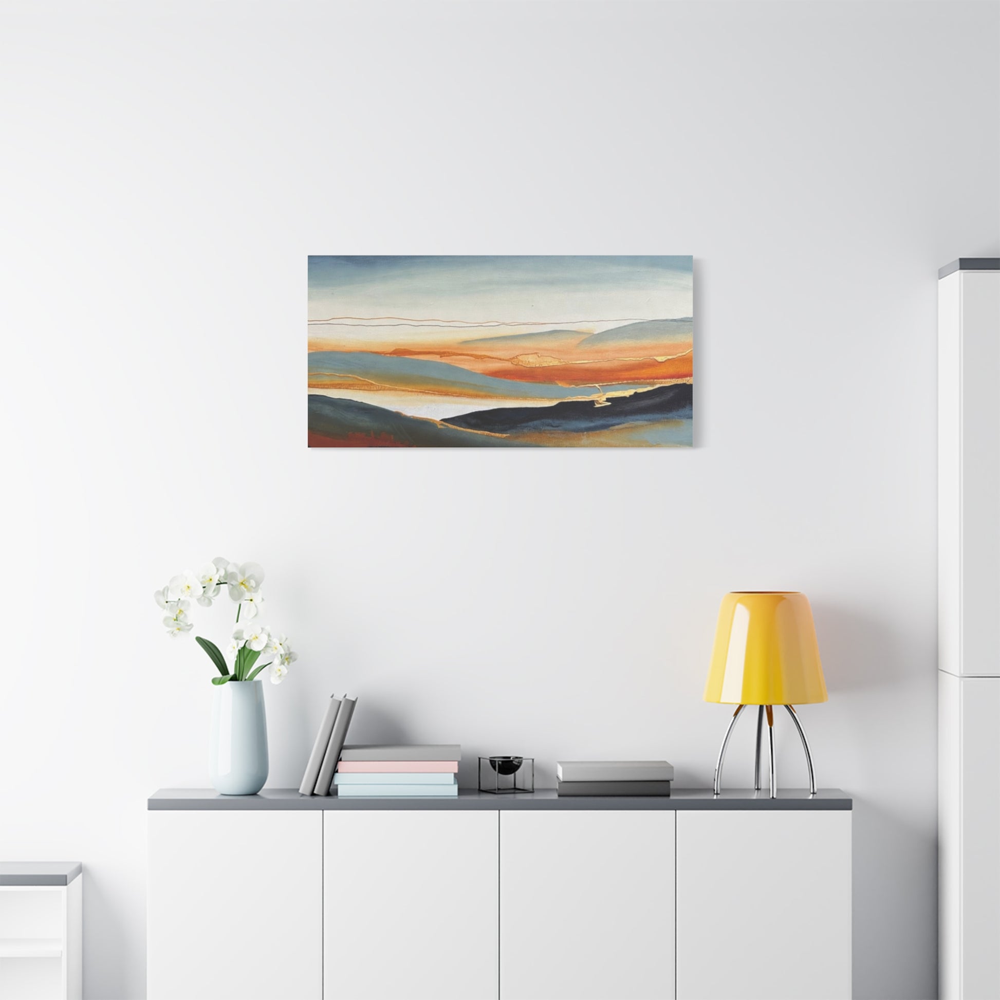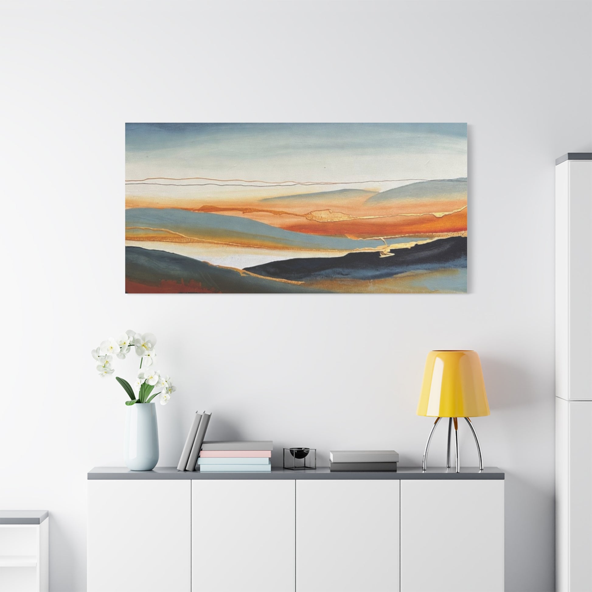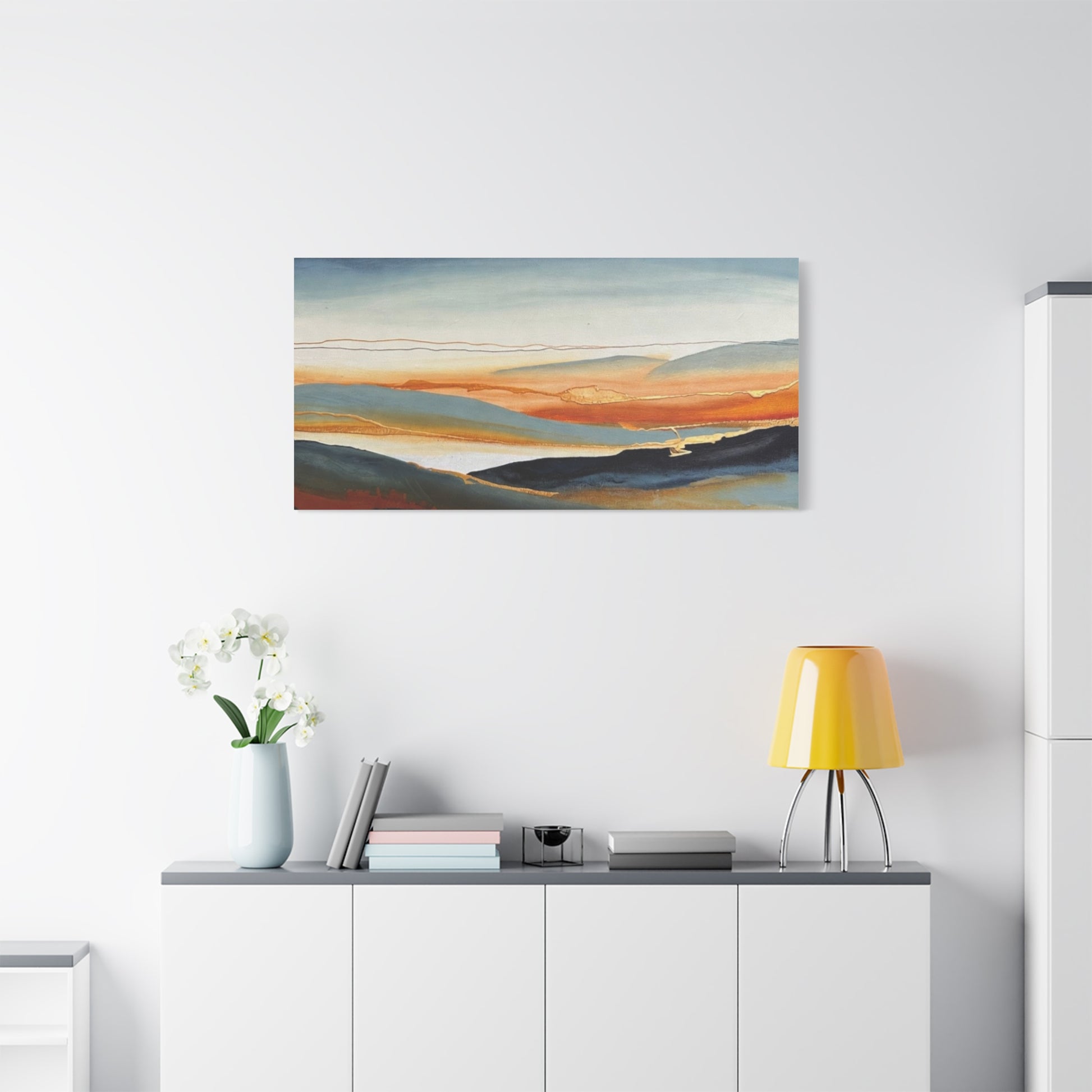 A matte stretched canvas that brings a calm, painterly landscape into your room. The surface has a soft, non-reflective finish that highlights layered washes of deep indigo, warm amber, and muted teal, letting brush-like textures and subtle gold accents breathe. Stretched on a slim 1.25" pine profile, it hangs with a low silhouette that complements modern, coastal, and rustic interiors alike. The print’s gentle horizon and fluid lines create a quiet, contemplative focal point — the kind of piece that settles a space and invites a slow inhale after a busy day.