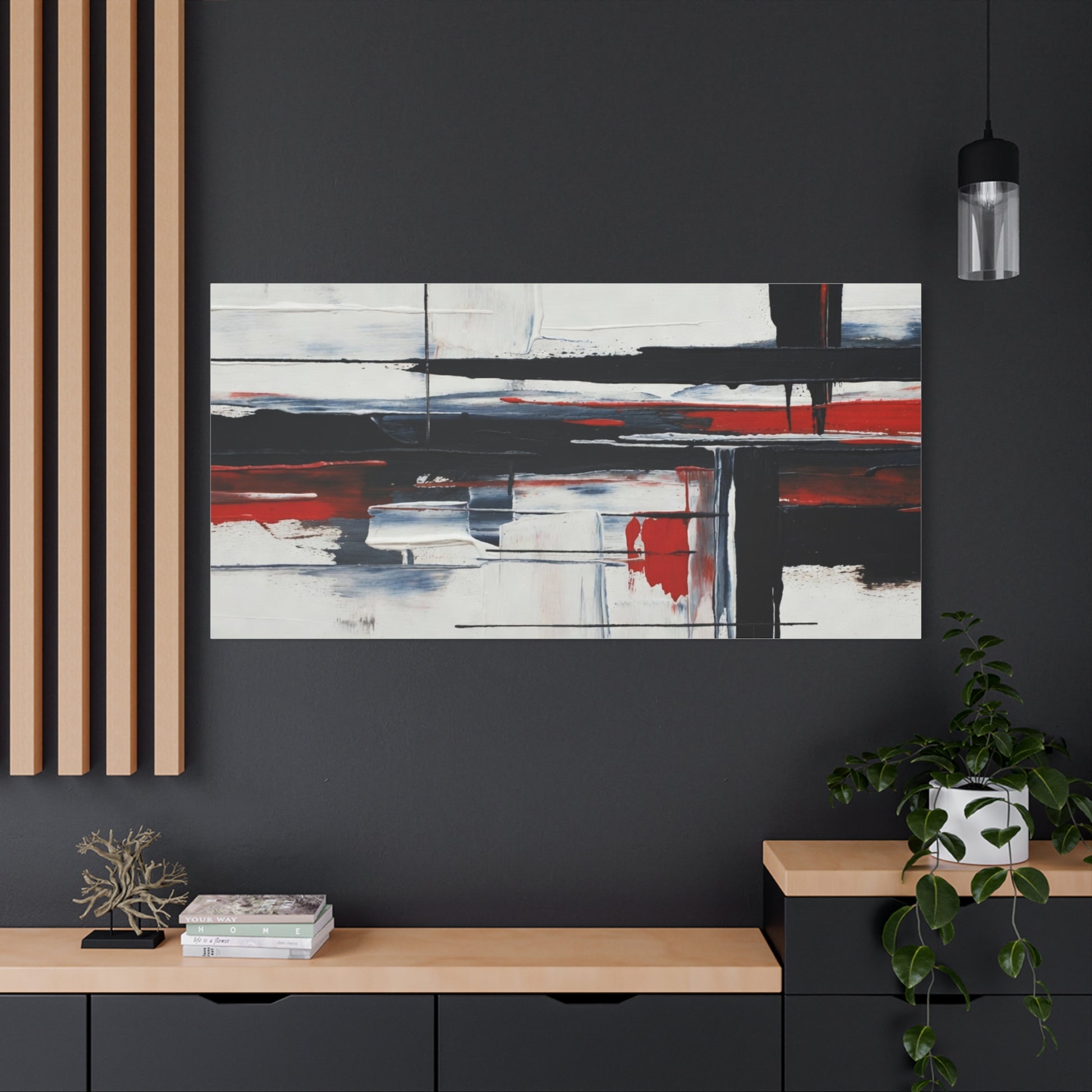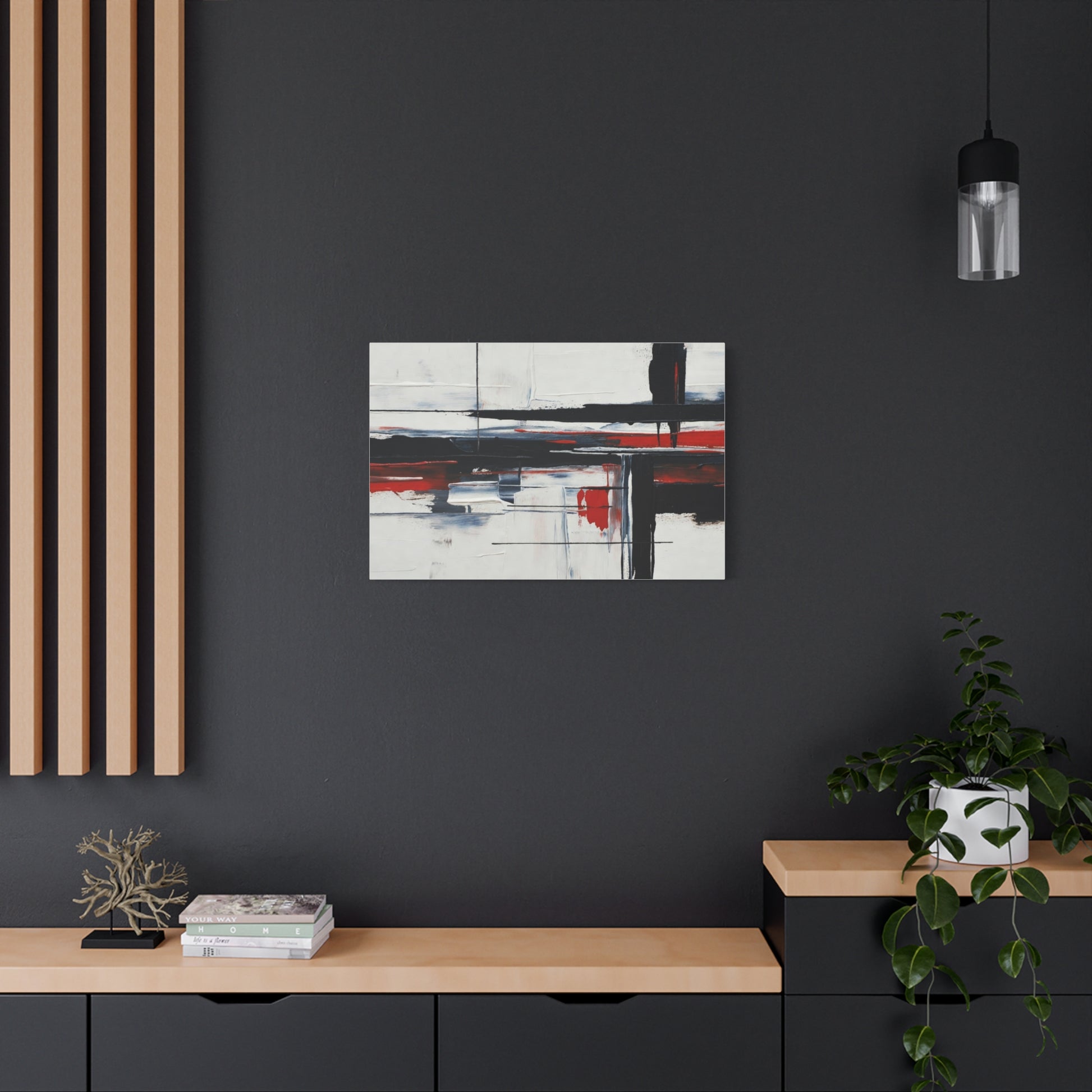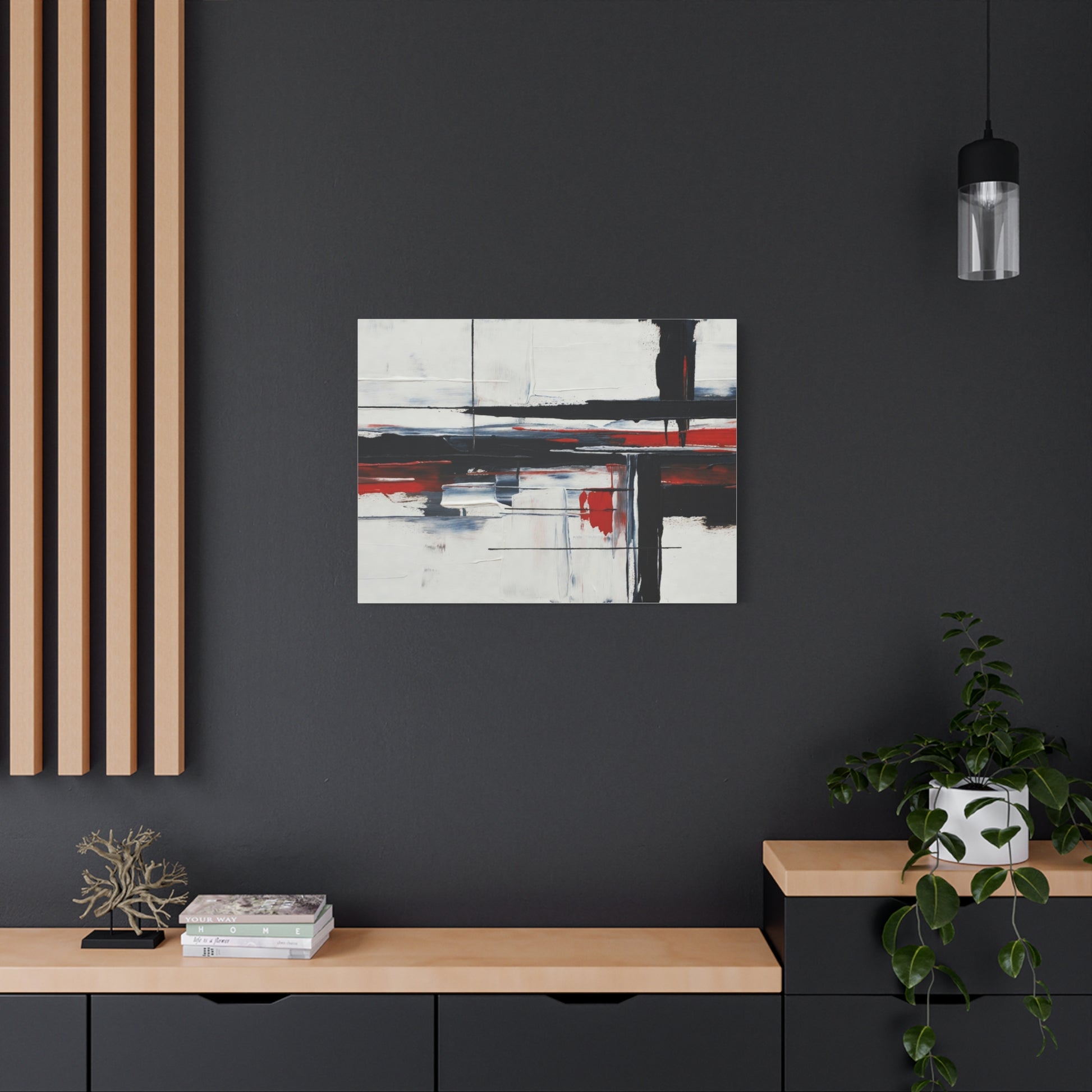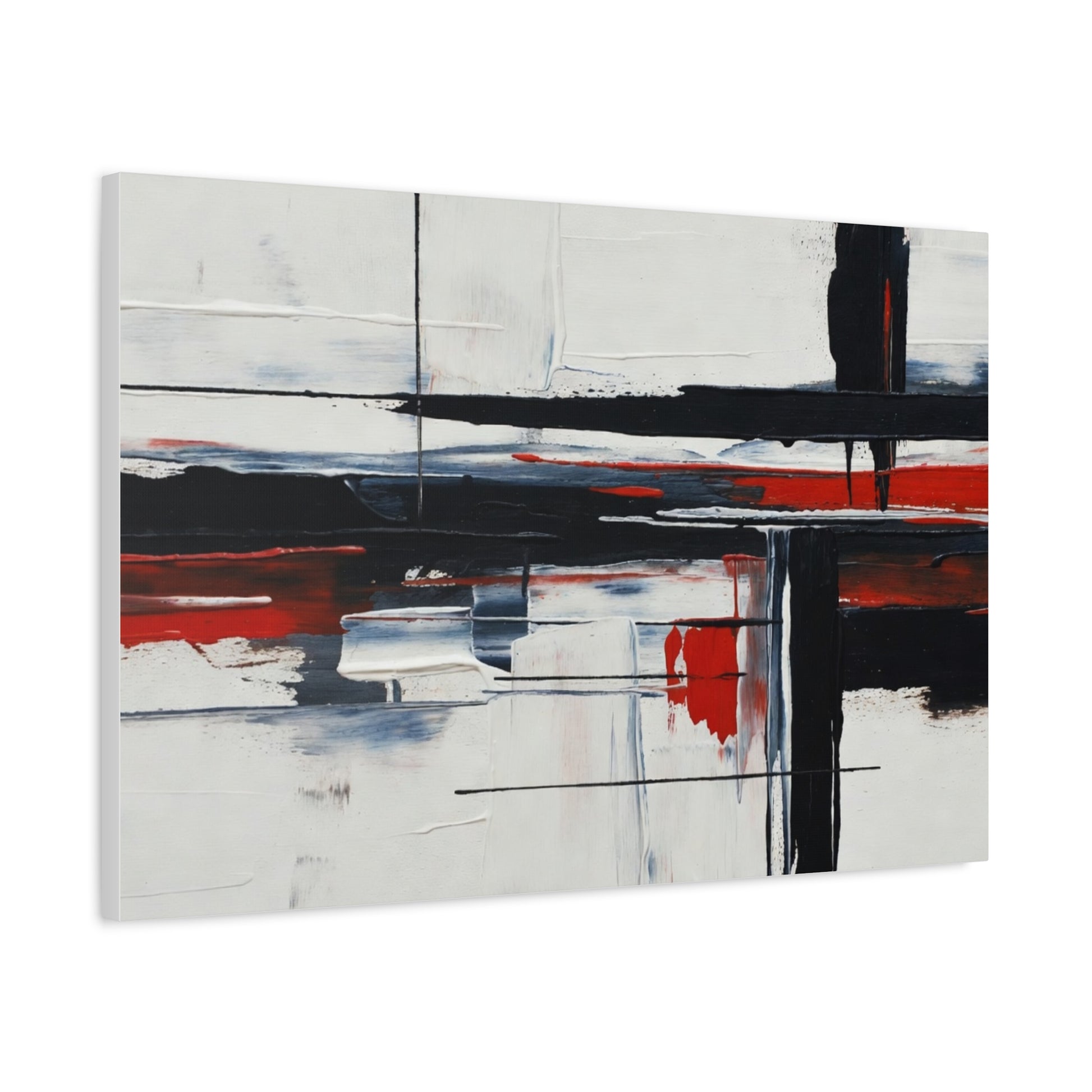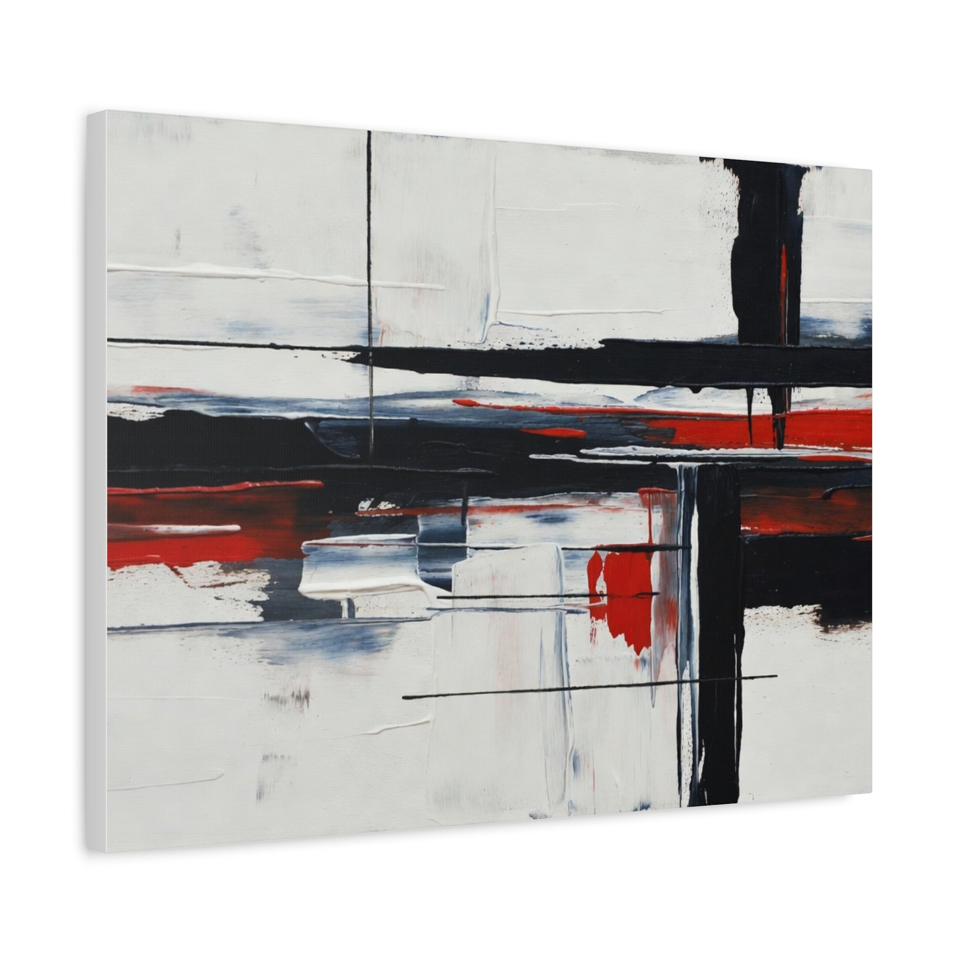 A modern stretched canvas print that brings calm structure and bold contrast into a living space. Broad, painterly strokes of black and deep red lay over a soft, muted background, creating a balanced, architectural composition that works quietly with minimalist, industrial, or contemporary decor. The 1.25" depth gives the piece presence on the wall while the matte finish reduces glare and emphasizes brush texture. Ready to hang with a discreet back mount and soft rubber dots to keep it steady, this canvas feels considered and lasting — a piece that complements quiet mornings, focused workspaces, or evenings by lamplight.
