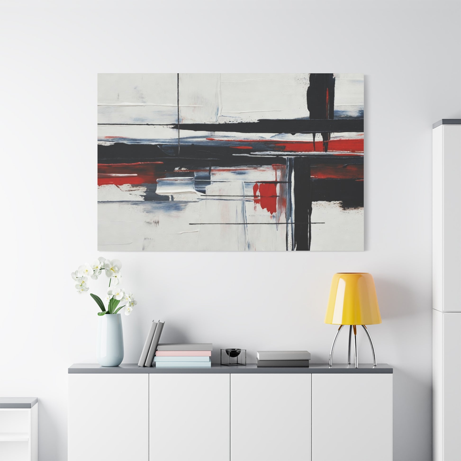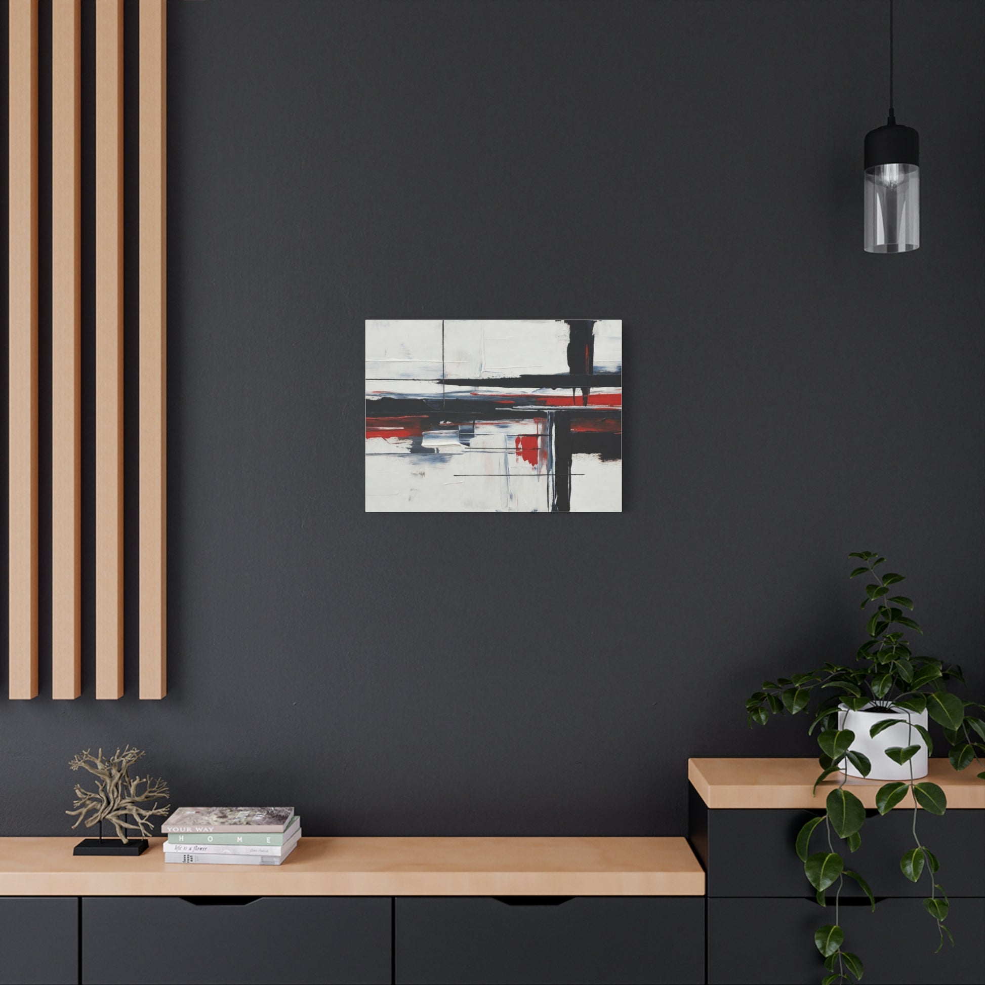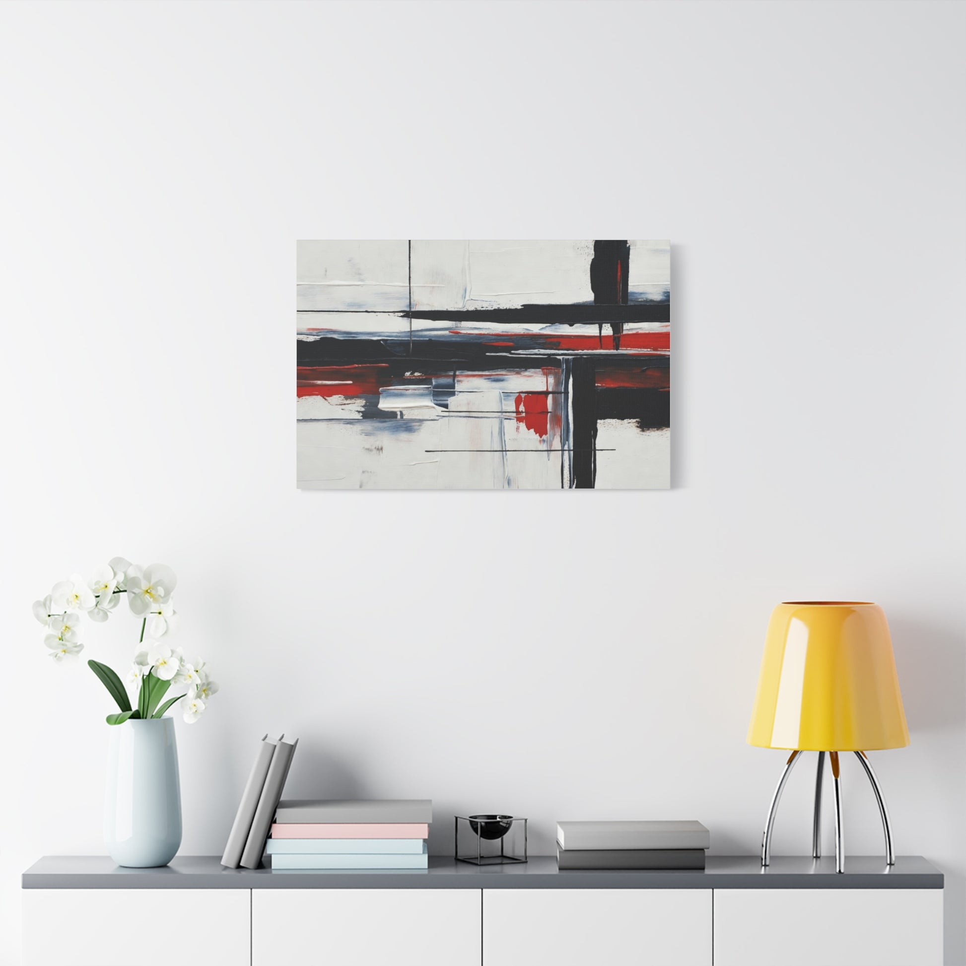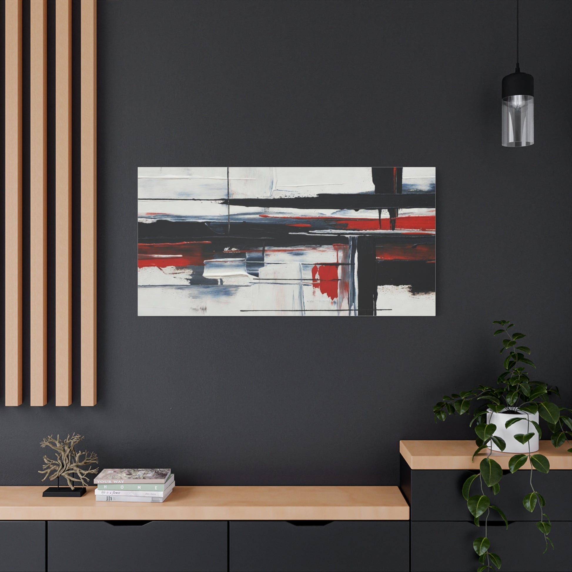 A modern stretched canvas print that brings calm structure and bold contrast into a living space. Broad, painterly strokes of black and deep red lay over a soft, muted background, creating a balanced, architectural composition that works quietly with minimalist, industrial, or contemporary decor. The 1.25" depth gives the piece presence on the wall while the matte finish reduces glare and emphasizes brush texture. Ready to hang with a discreet back mount and soft rubber dots to keep it steady, this canvas feels considered and lasting — a piece that complements quiet mornings, focused workspaces, or evenings by lamplight.