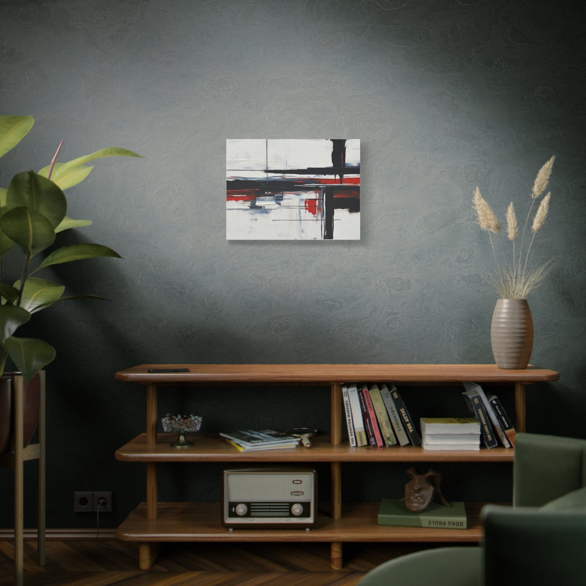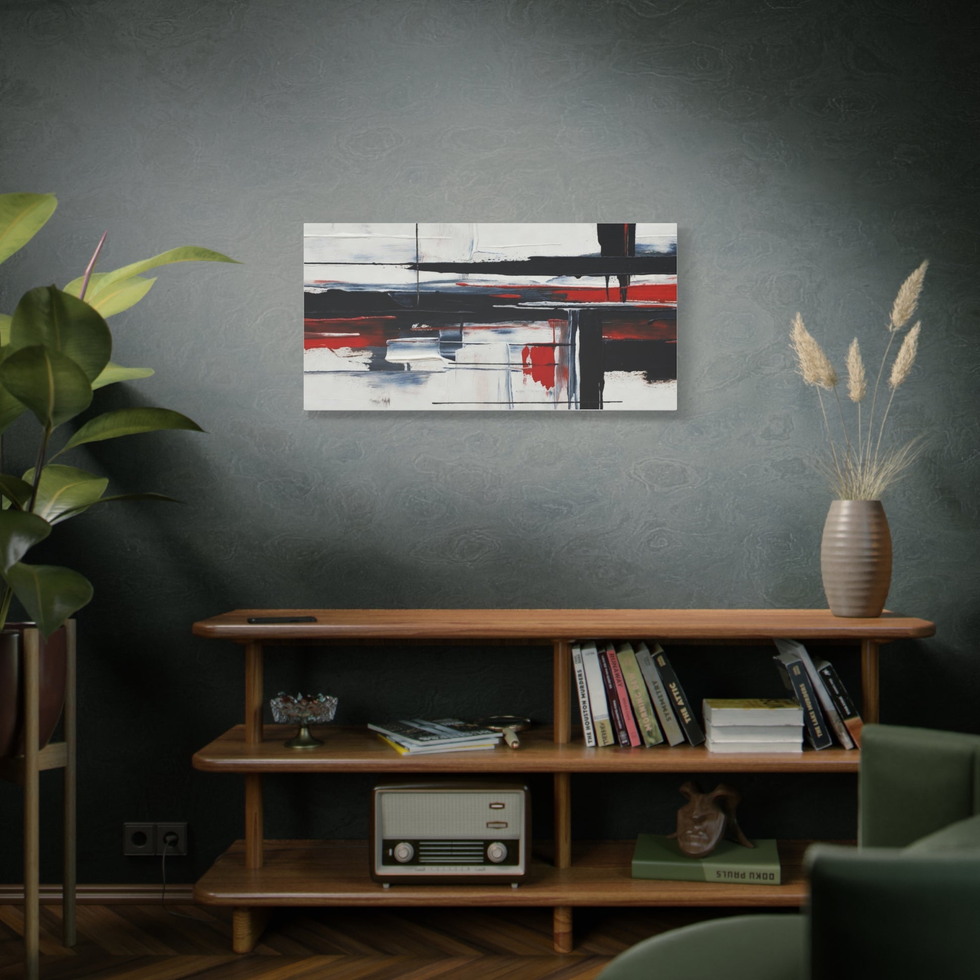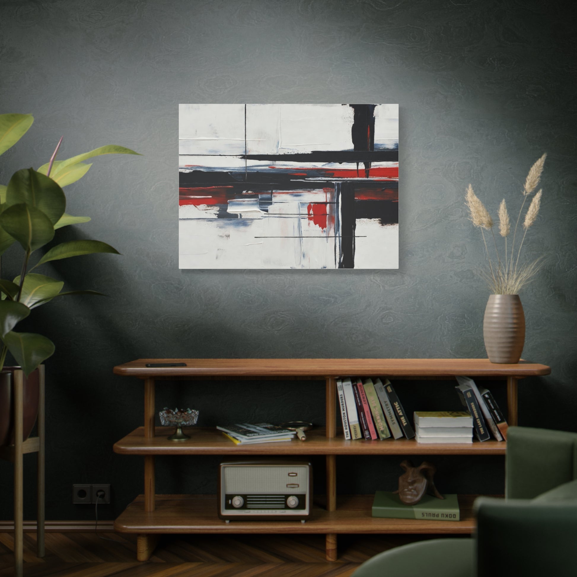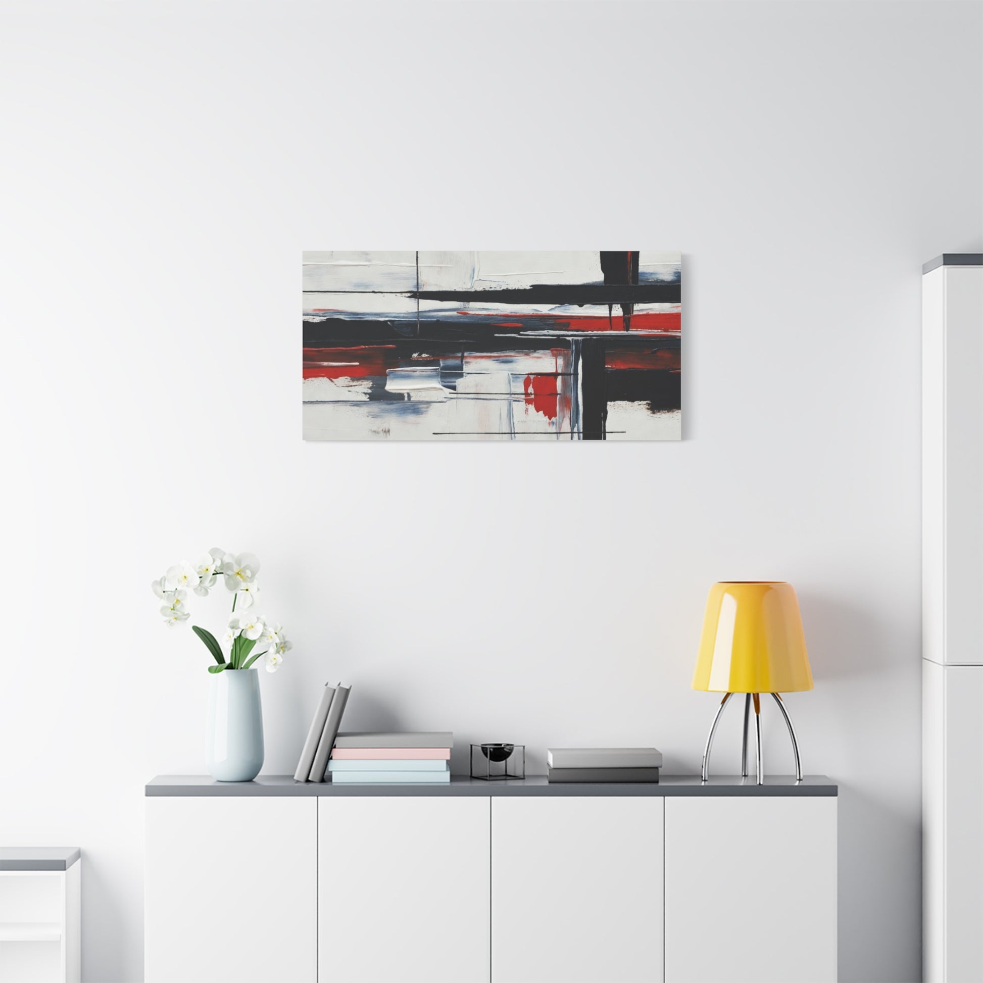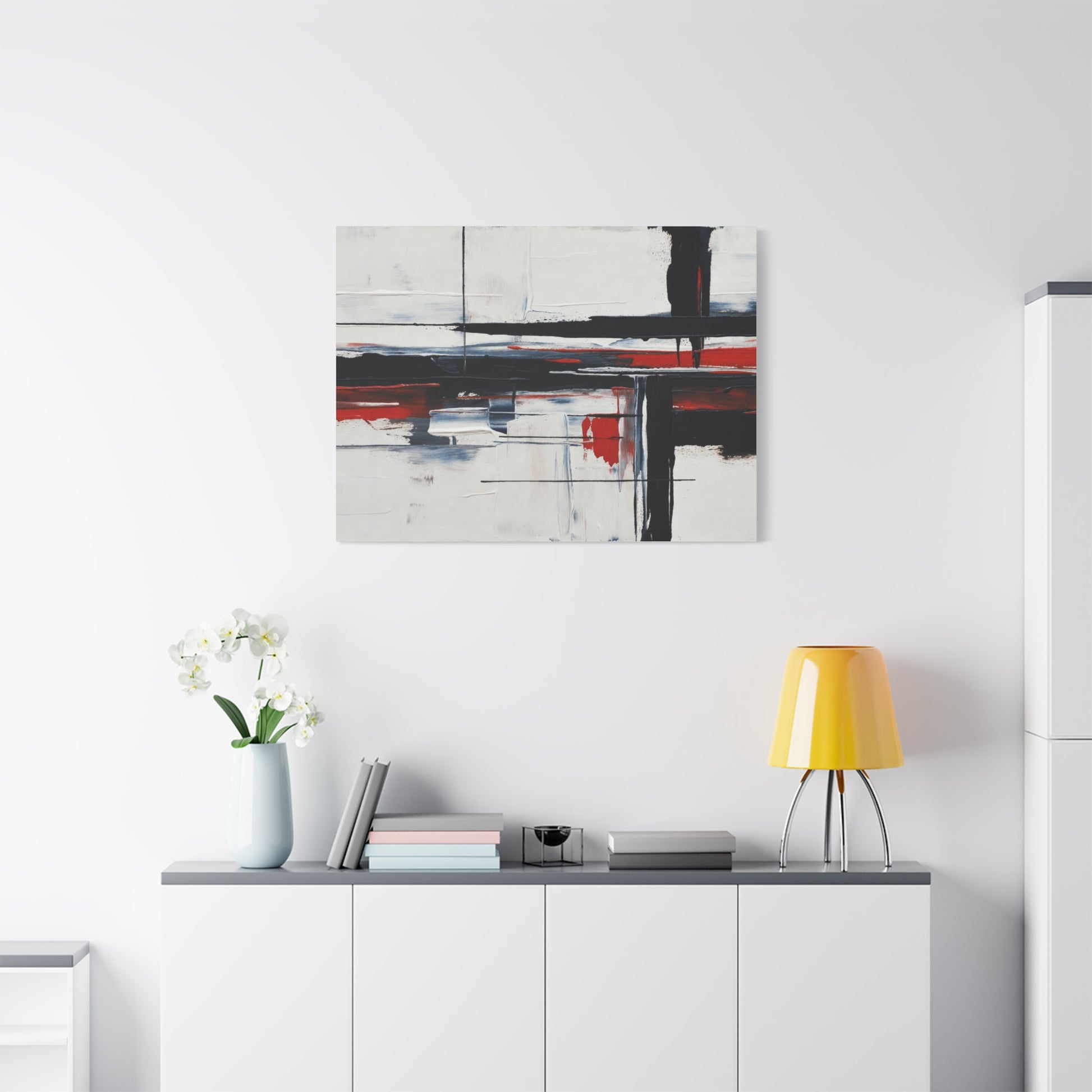 A modern stretched canvas print that brings calm structure and bold contrast into a living space. Broad, painterly strokes of black and deep red lay over a soft, muted background, creating a balanced, architectural composition that works quietly with minimalist, industrial, or contemporary decor. The 1.25" depth gives the piece presence on the wall while the matte finish reduces glare and emphasizes brush texture. Ready to hang with a discreet back mount and soft rubber dots to keep it steady, this canvas feels considered and lasting — a piece that complements quiet mornings, focused workspaces, or evenings by lamplight.