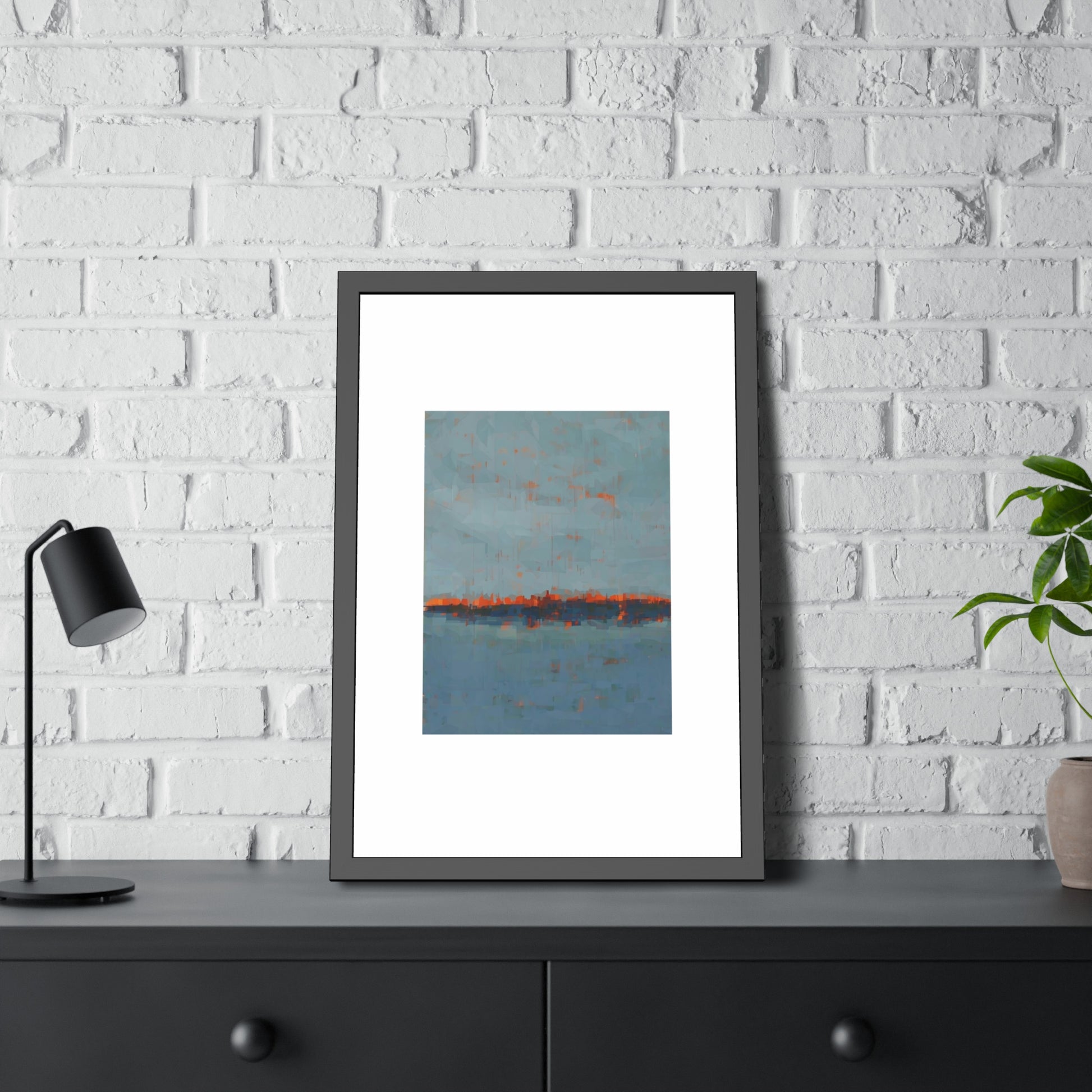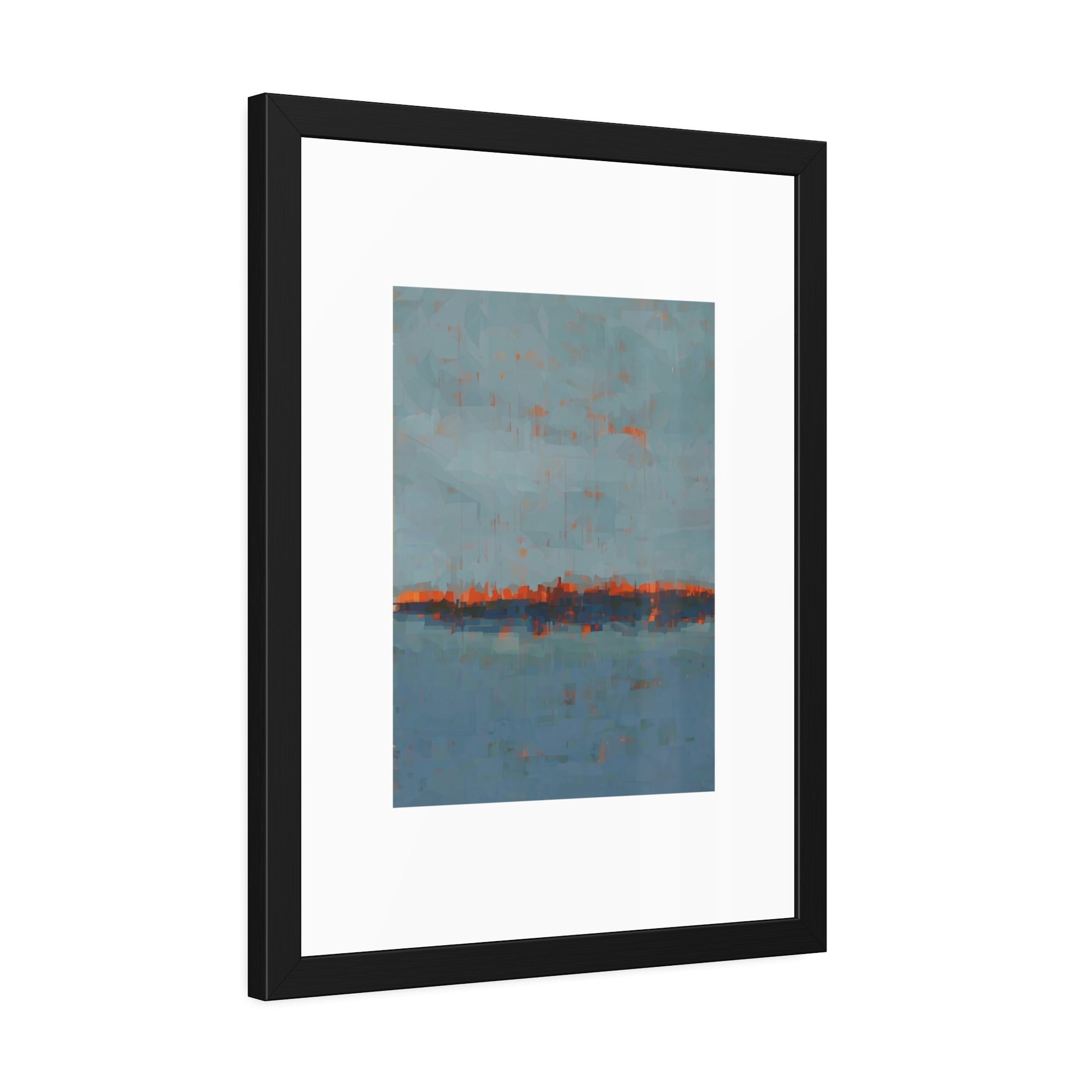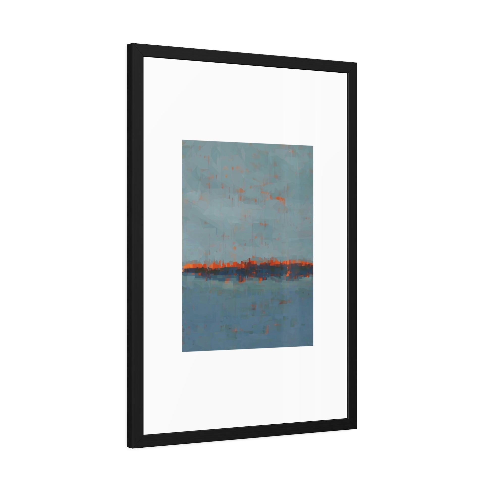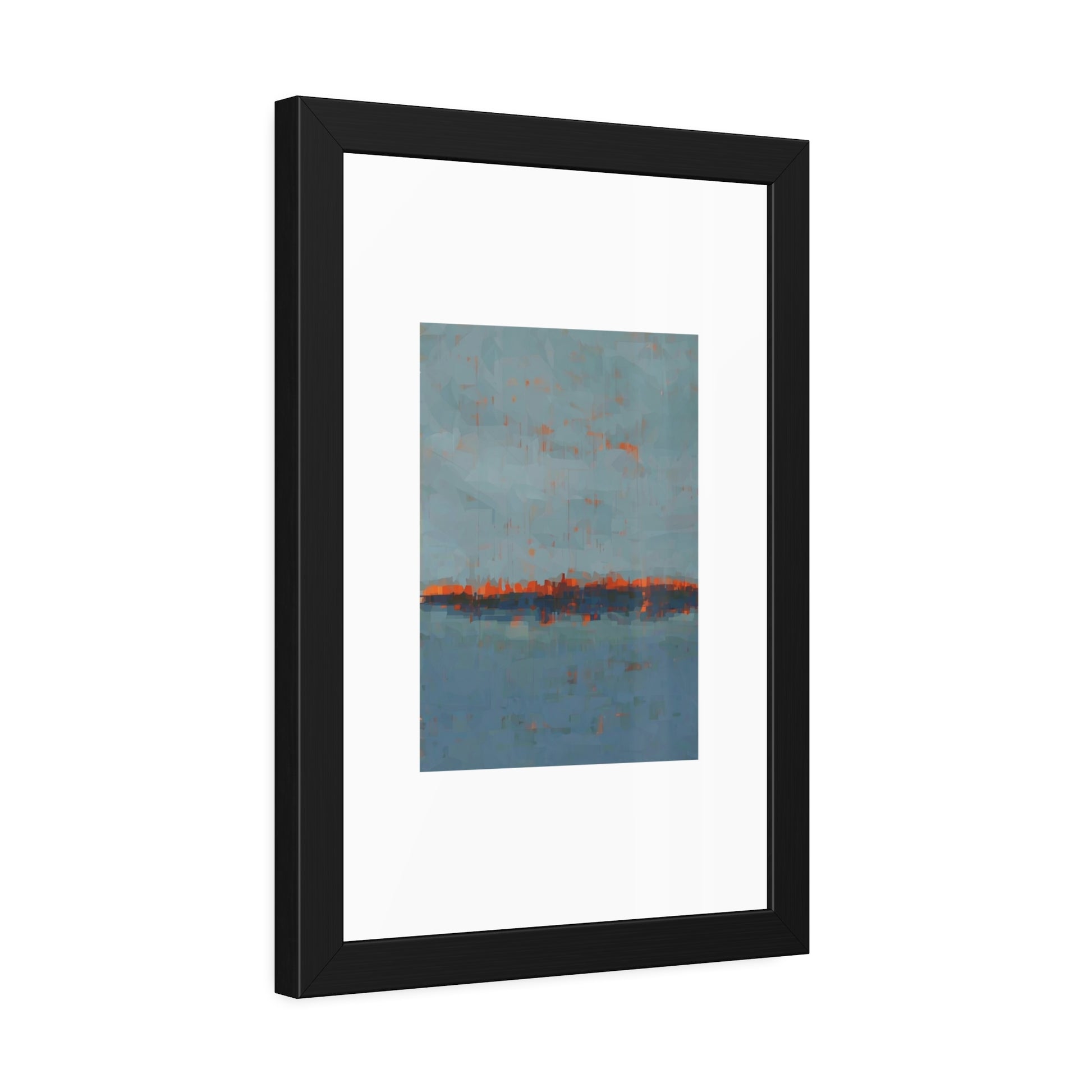 A framed paper poster that brings calm and color to any wall. The artwork sits on a generous white mat inside a matte black pinewood frame, protected by shatter‑proof plexiglass. Choose a fine art paper for a textured, gallery feel or a semi‑gloss option for brighter, more vibrant tones. The result reads like a quiet horizon—soft blues with warm rust accents—making it an easy way to anchor a living room, hallway, or bedside nook.