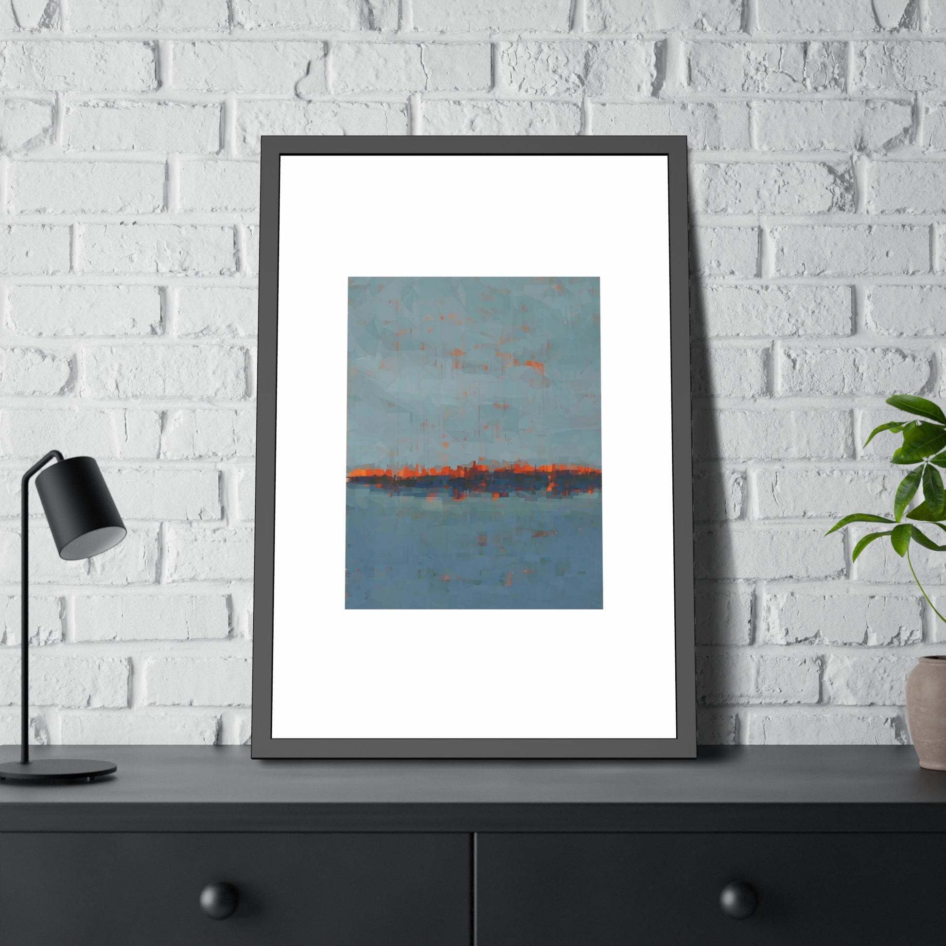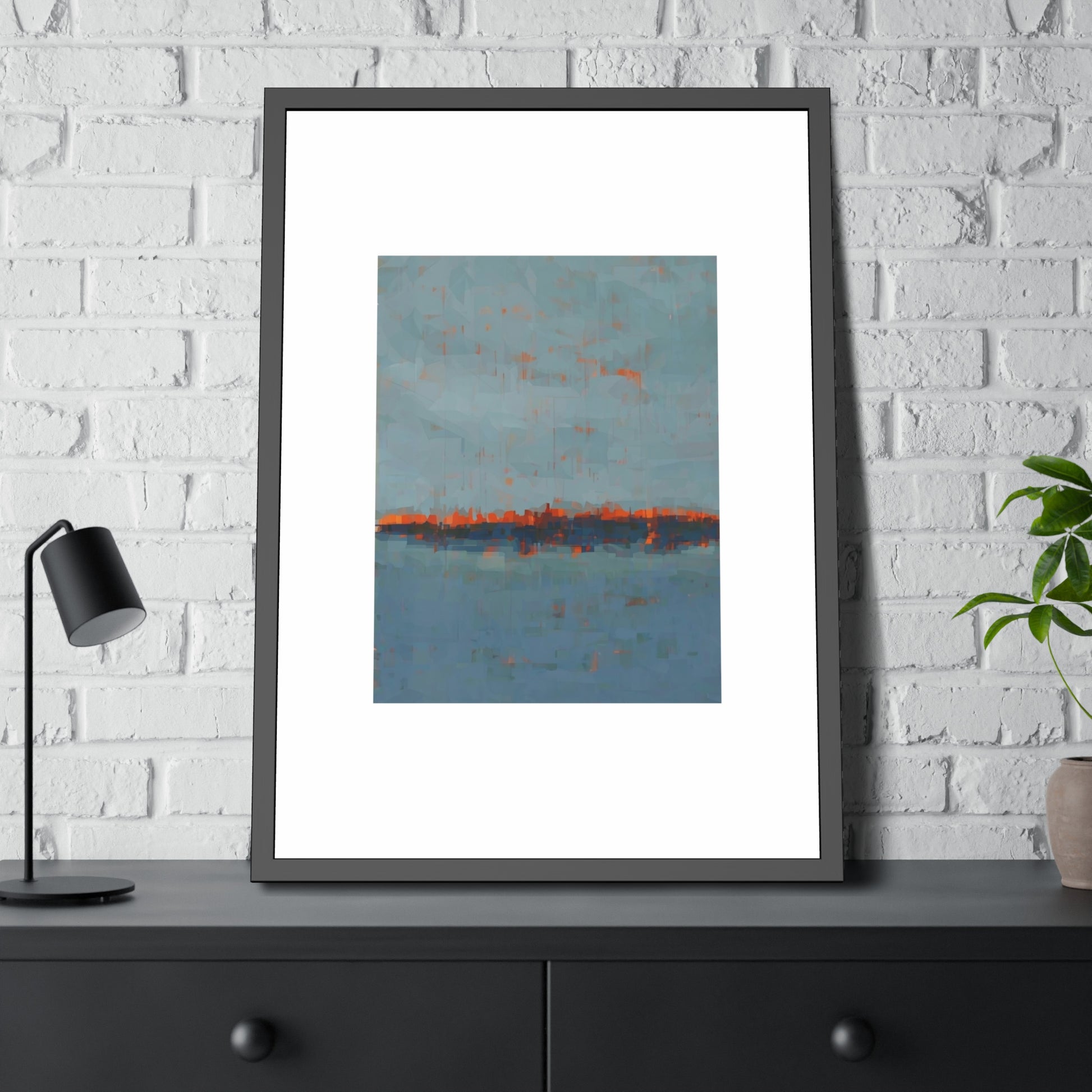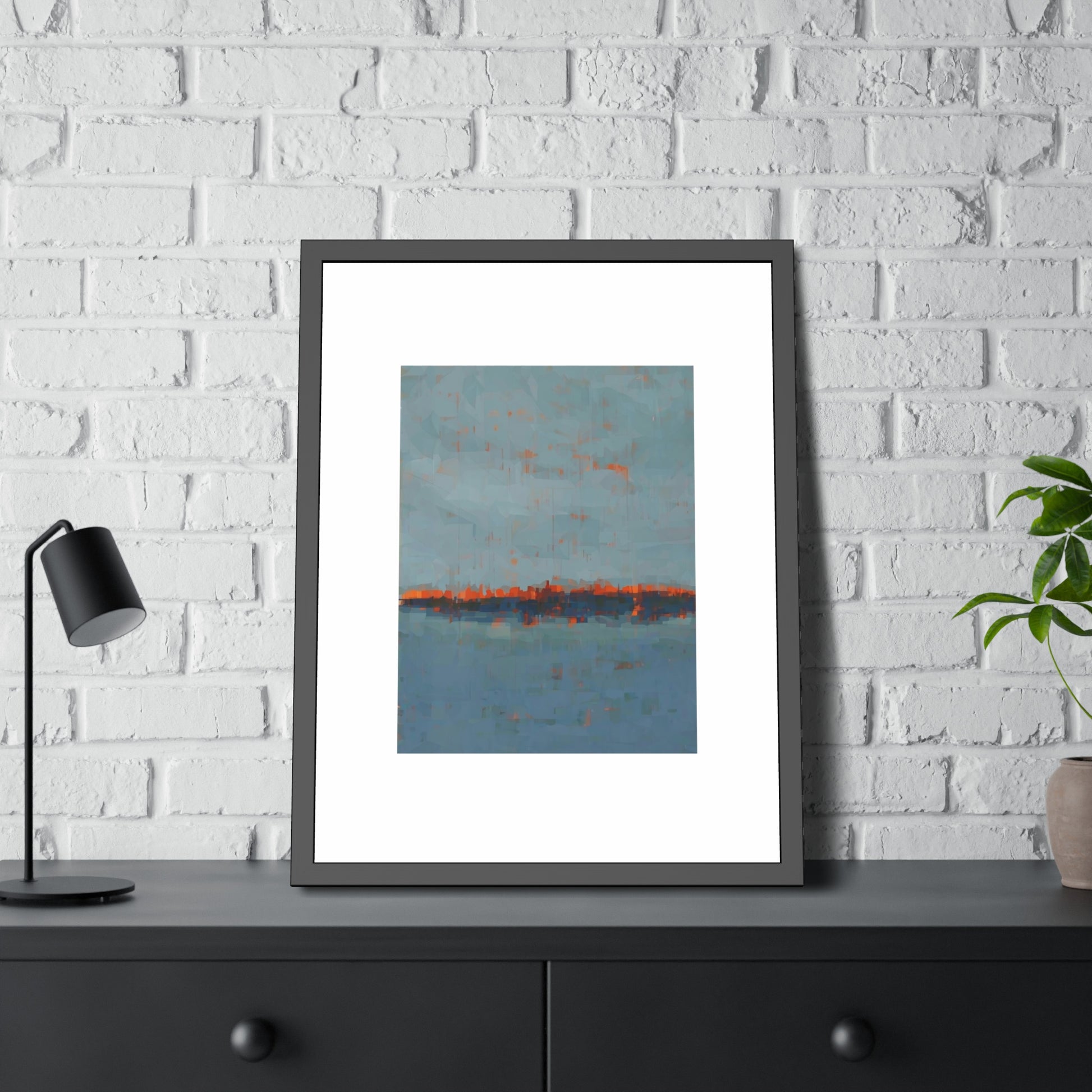 A framed paper poster that brings calm and color to any wall. The artwork sits on a generous white mat inside a matte black pinewood frame, protected by shatter‑proof plexiglass. Choose a fine art paper for a textured, gallery feel or a semi‑gloss option for brighter, more vibrant tones. The result reads like a quiet horizon—soft blues with warm rust accents—making it an easy way to anchor a living room, hallway, or bedside nook.