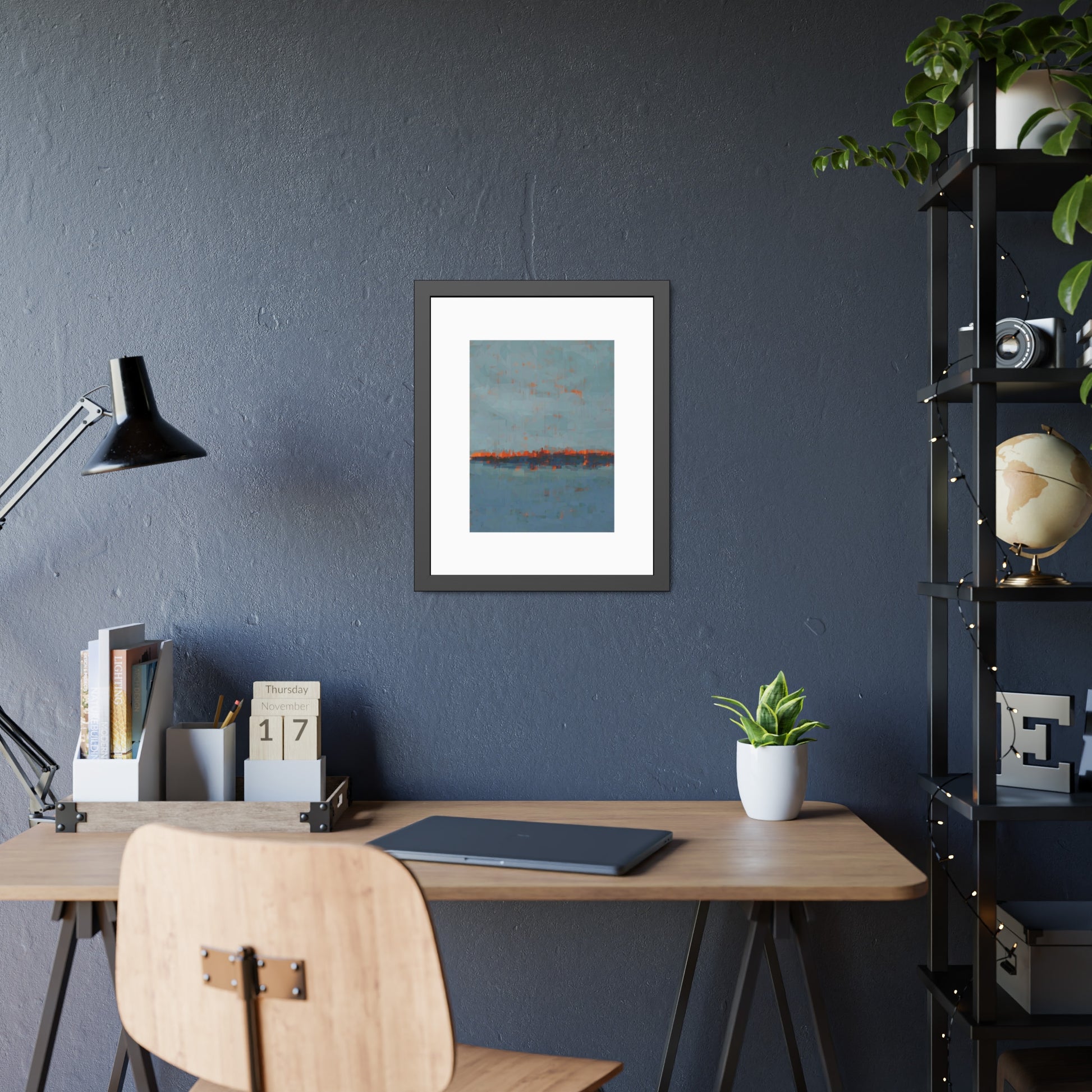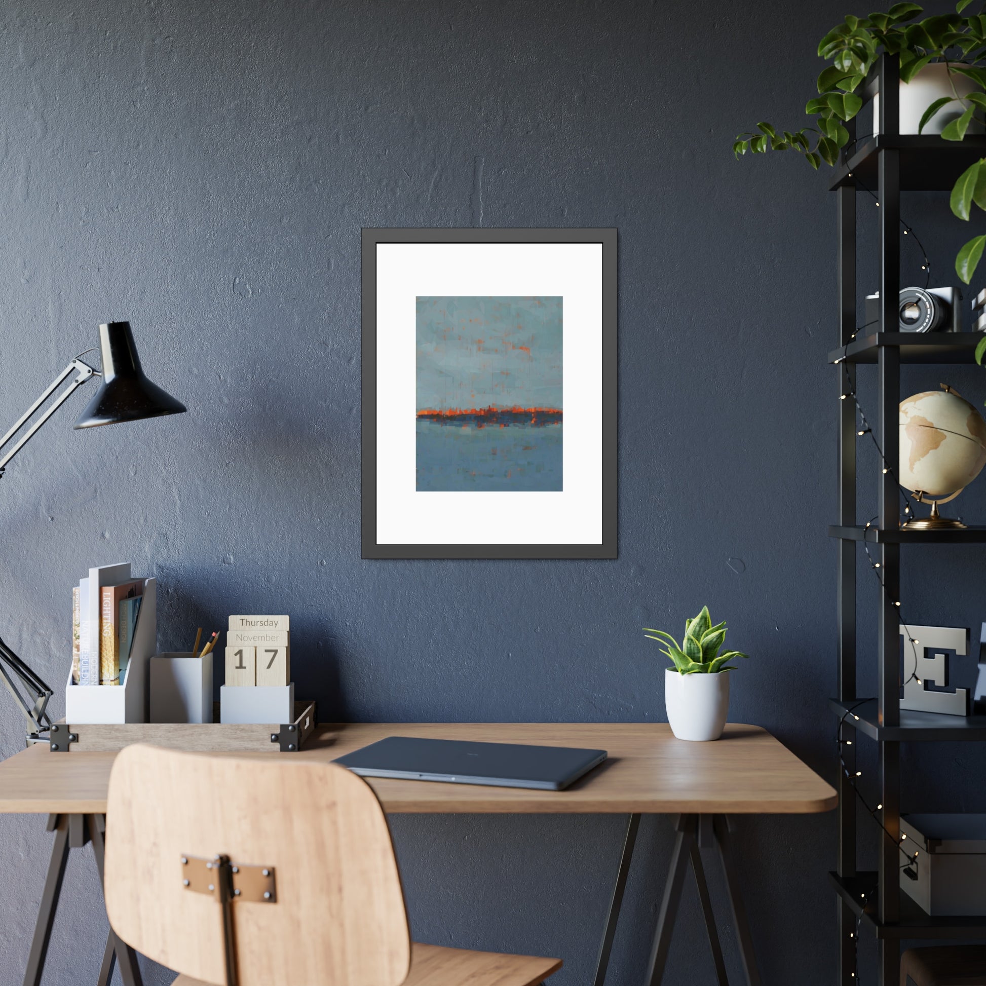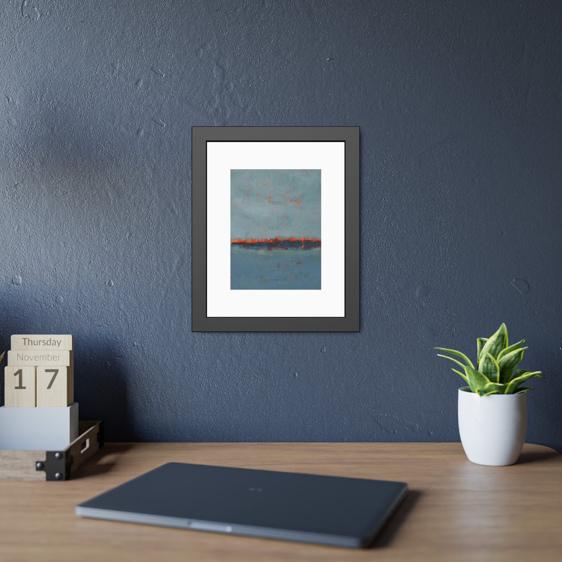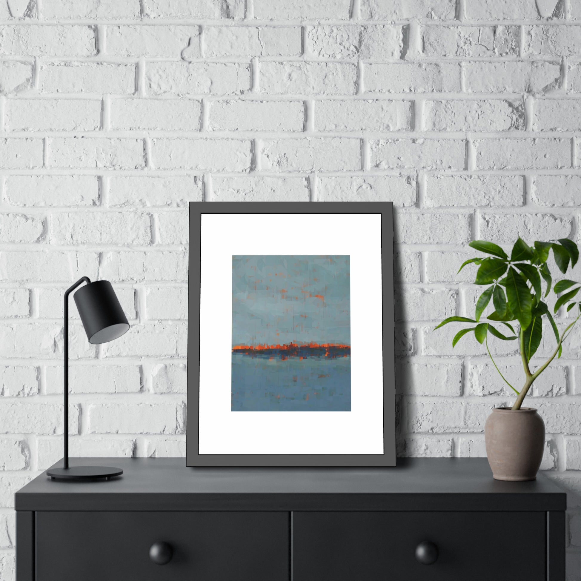 A framed paper poster that brings calm and color to any wall. The artwork sits on a generous white mat inside a matte black pinewood frame, protected by shatter‑proof plexiglass. Choose a fine art paper for a textured, gallery feel or a semi‑gloss option for brighter, more vibrant tones. The result reads like a quiet horizon—soft blues with warm rust accents—making it an easy way to anchor a living room, hallway, or bedside nook.
