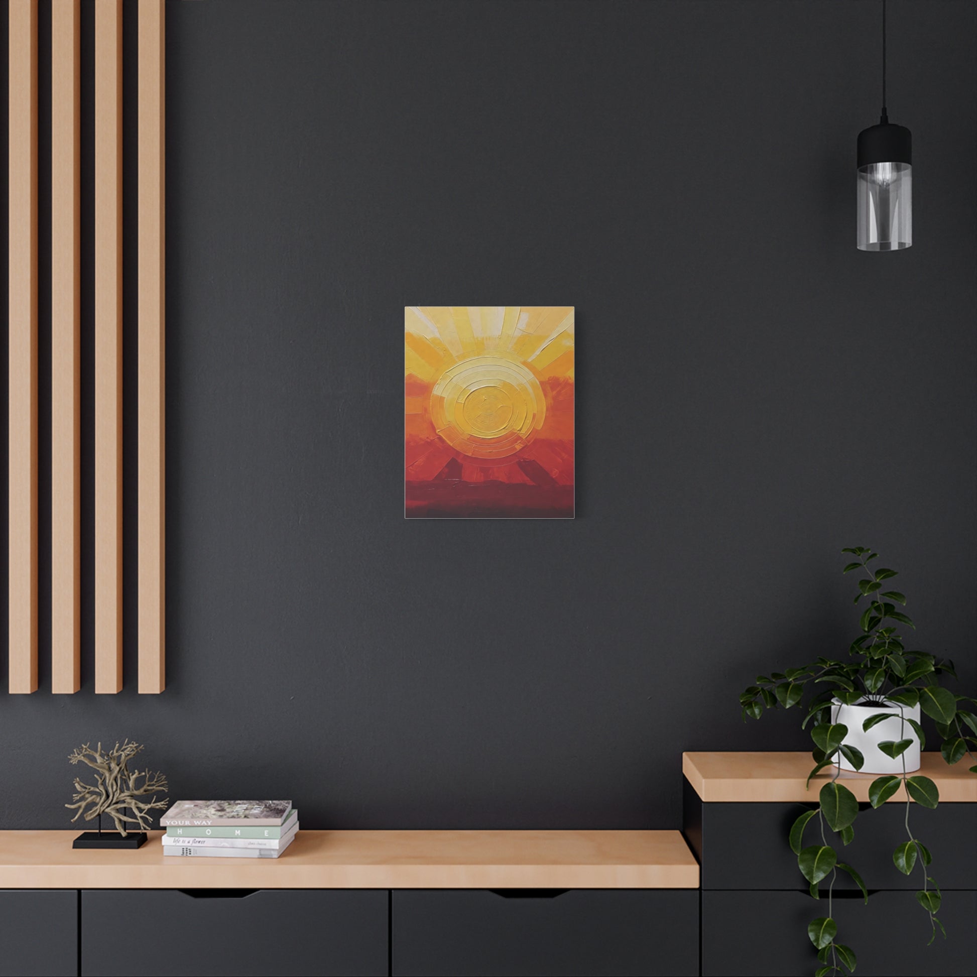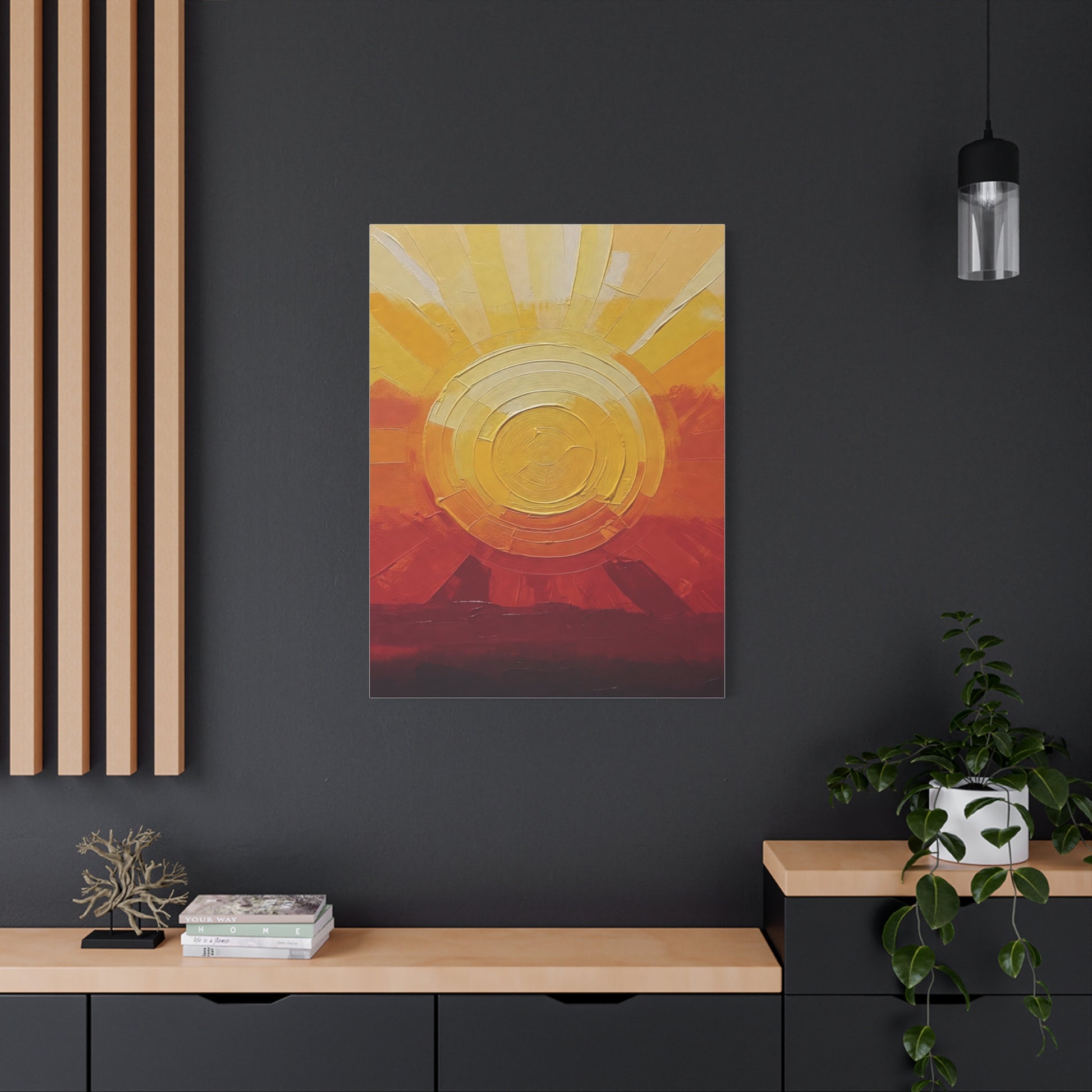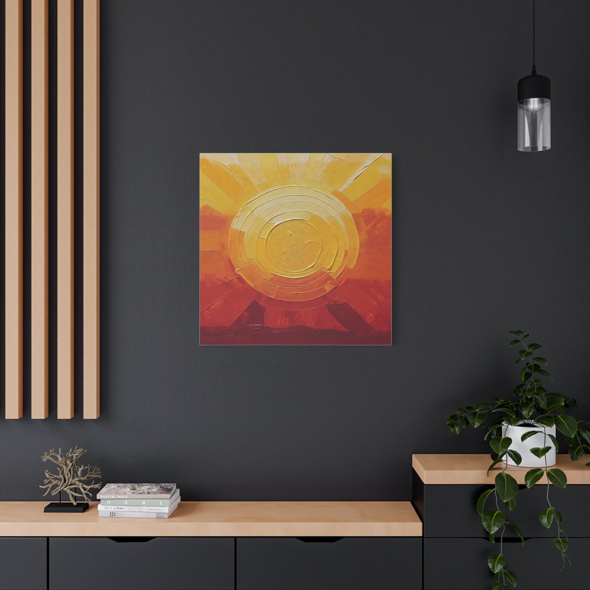 Warm light spills across textured paint and cotton-linen weave. This stretched matte canvas brings a golden sunrise into a living room, studio, or entryway — layers of ochre, amber and deep russet build a tactile horizon that reads like both landscape and memory. The subtle matte finish tames glare and puts brushwork front and center, while the slim 1.25" profile keeps the piece modern and easy to hang. It settles into slow mornings, creative corners, and homes that favor handcrafted warmth over glossy decor trends.