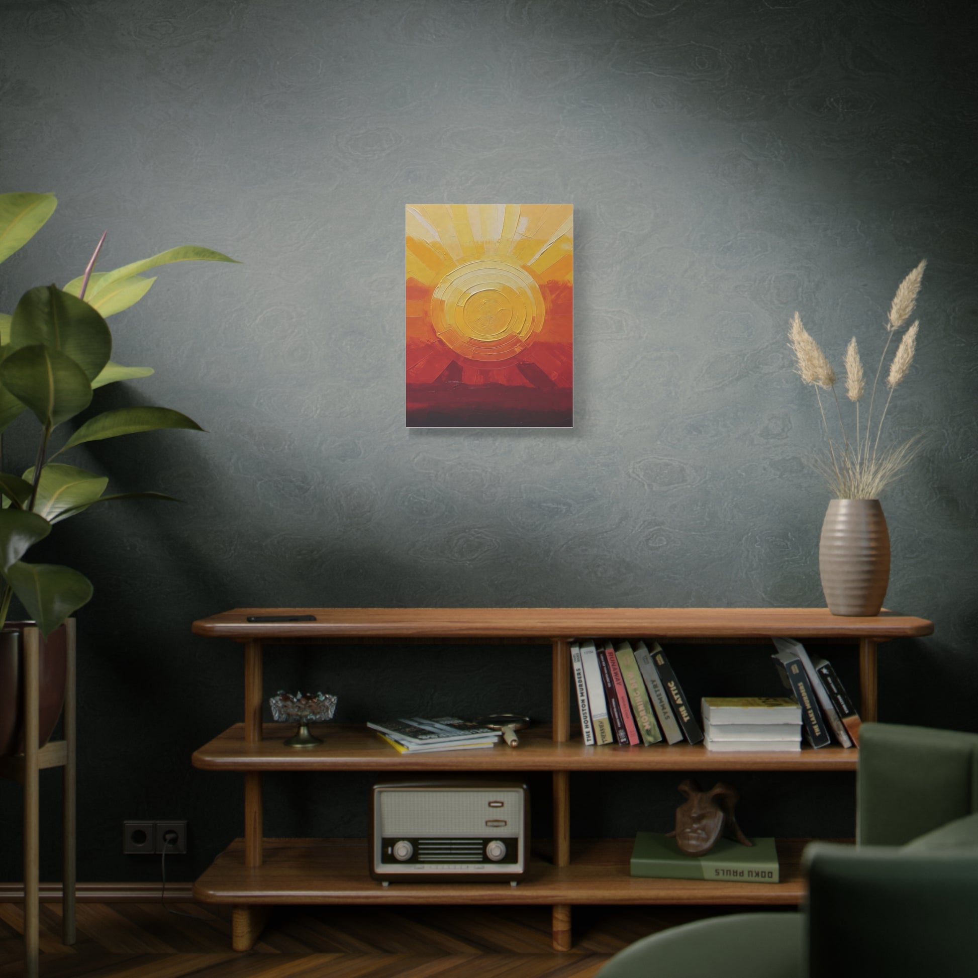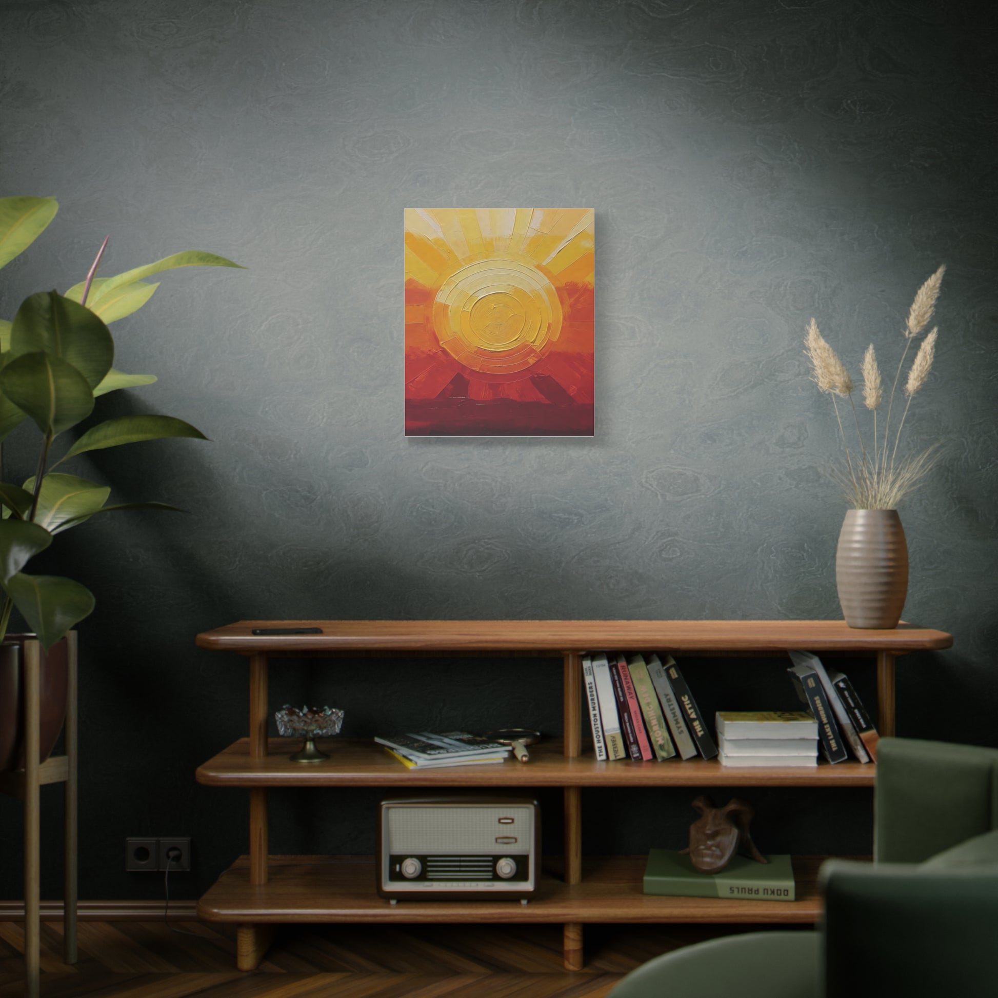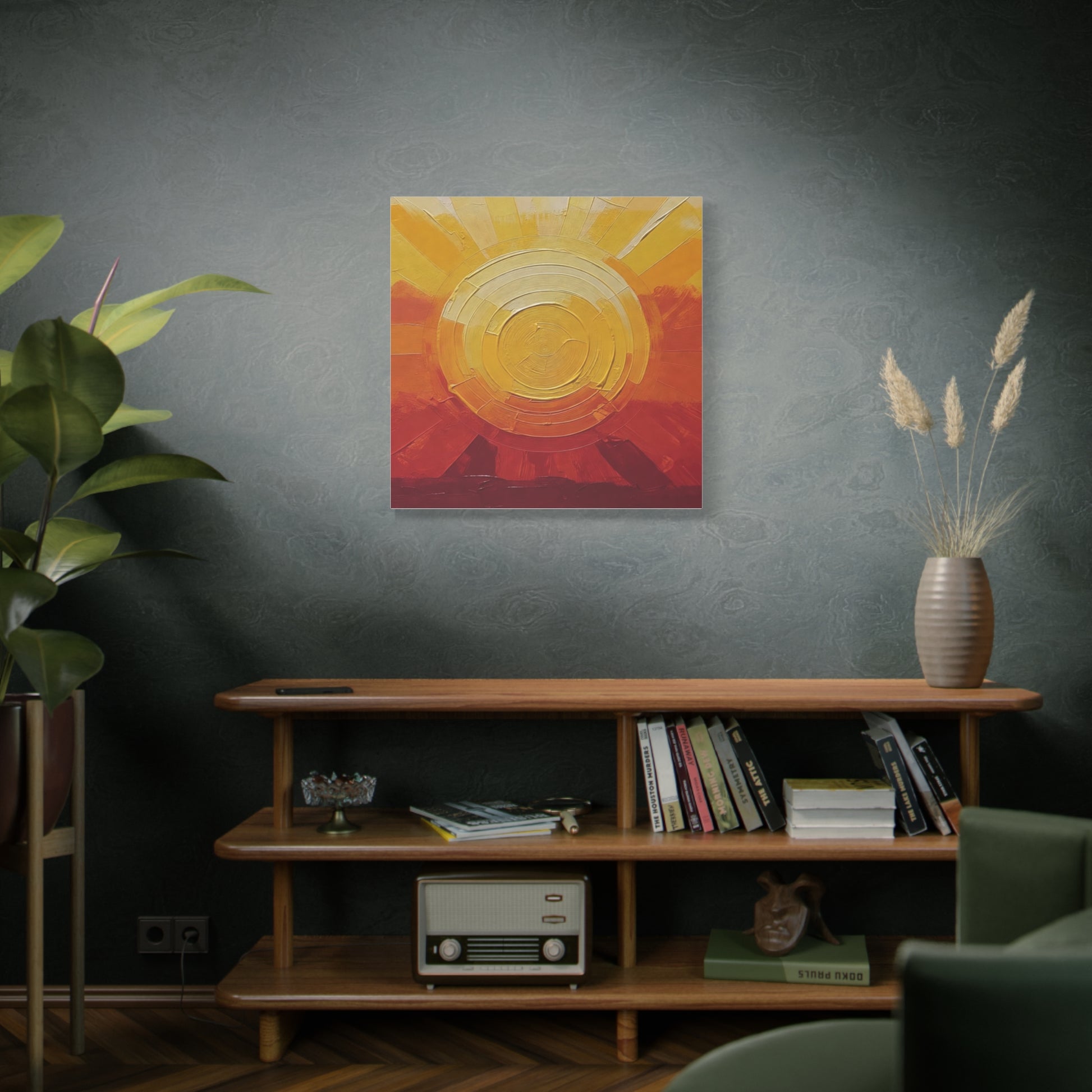 Warm light spills across textured paint and cotton-linen weave. This stretched matte canvas brings a golden sunrise into a living room, studio, or entryway — layers of ochre, amber and deep russet build a tactile horizon that reads like both landscape and memory. The subtle matte finish tames glare and puts brushwork front and center, while the slim 1.25" profile keeps the piece modern and easy to hang. It settles into slow mornings, creative corners, and homes that favor handcrafted warmth over glossy decor trends.