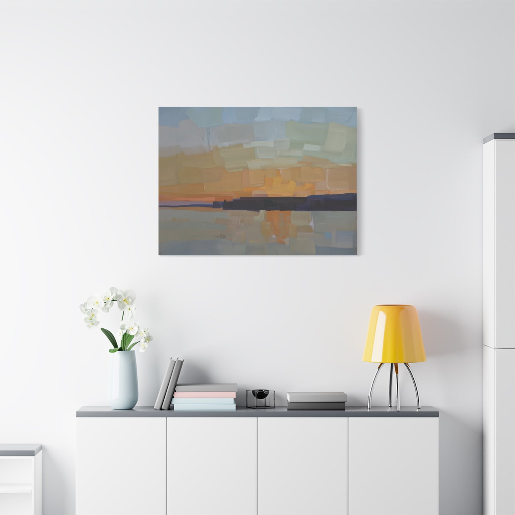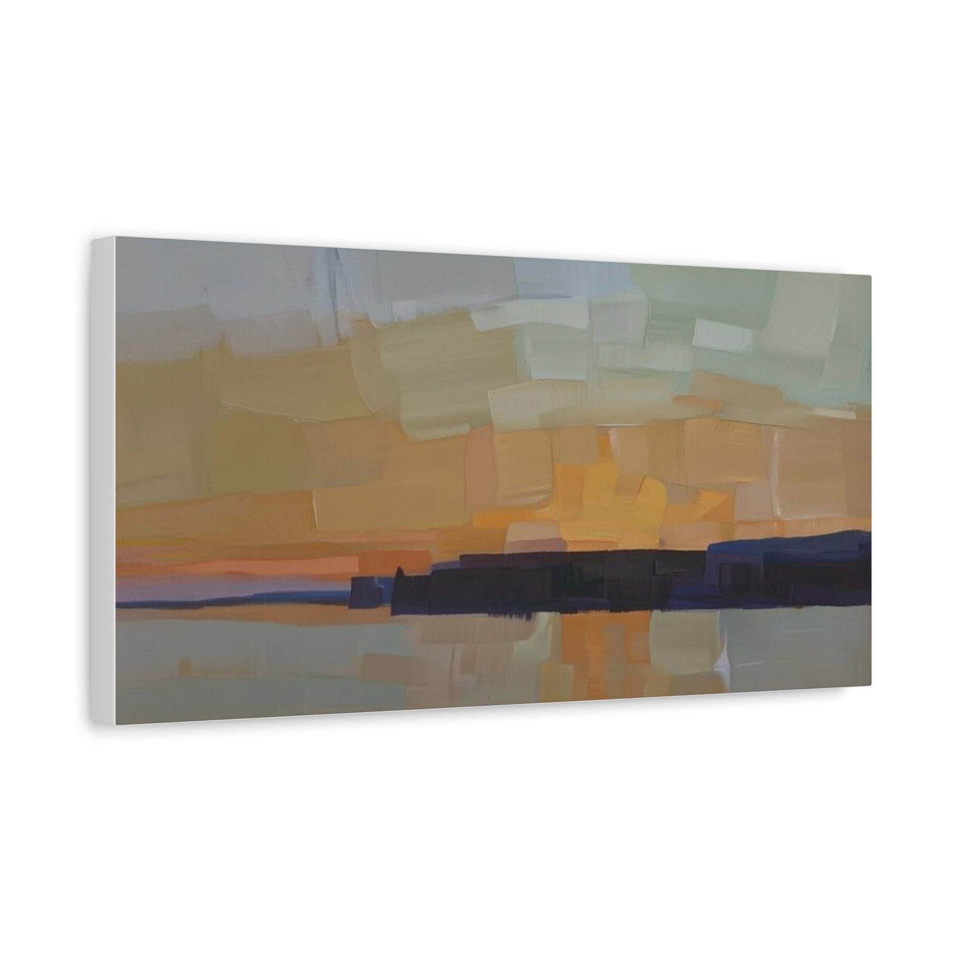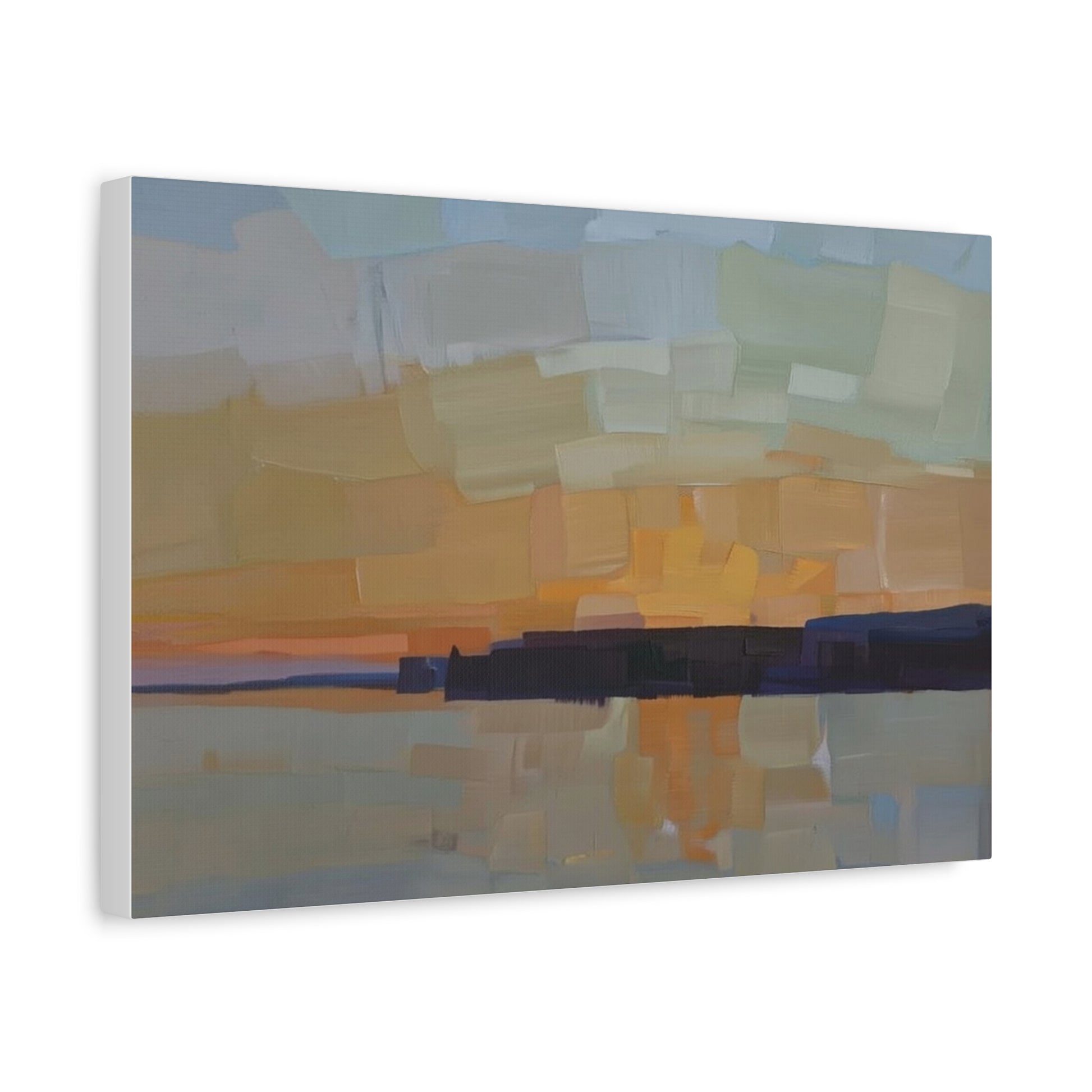 A serene, painterly landscape rendered in soft, muted tones and broad, expressive brushstrokes. This stretched matte canvas brings a quiet horizon into your room — cool blues and dove grays meet warm apricot and honeyed highlights, blending into a reflective, almost misty shoreline. The slim 1.25" depth keeps the piece modern and gallery-ready while the matte finish reduces glare and emphasizes the tactile, painted quality. Hung above a sofa, hallway console, or bedside, it settles the space and invites slow, contemplative moments.