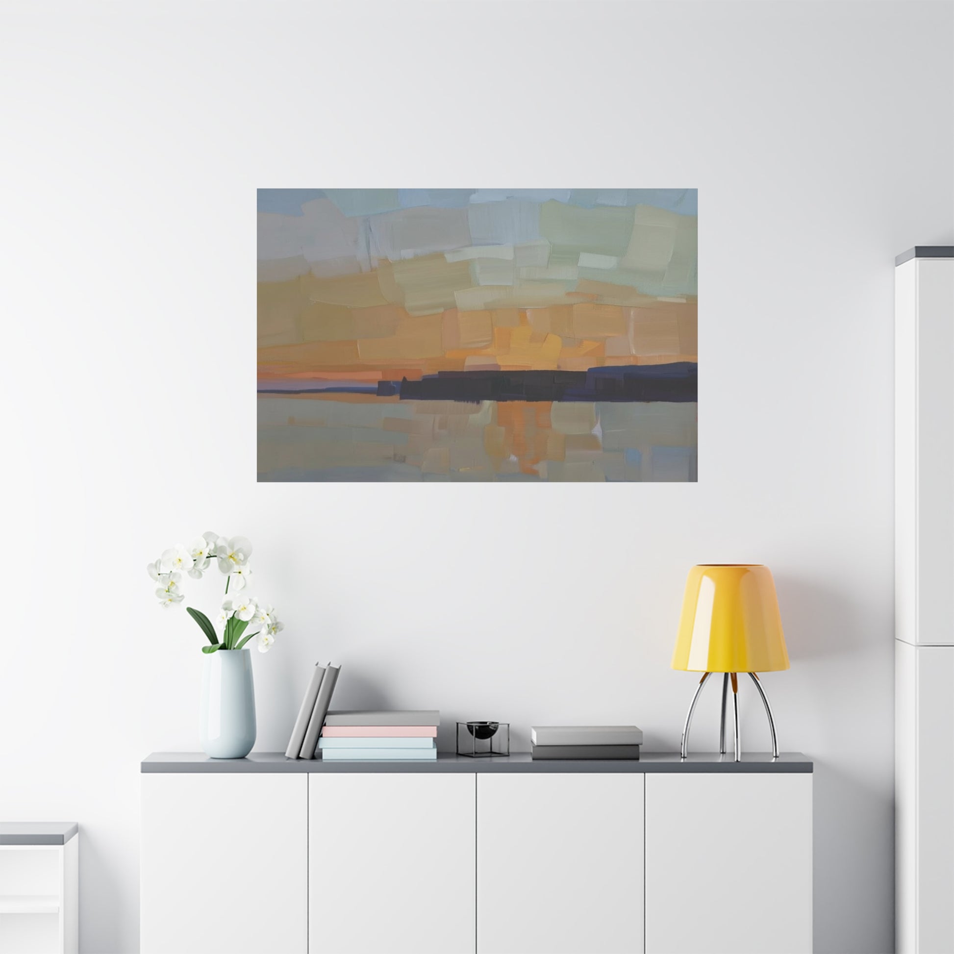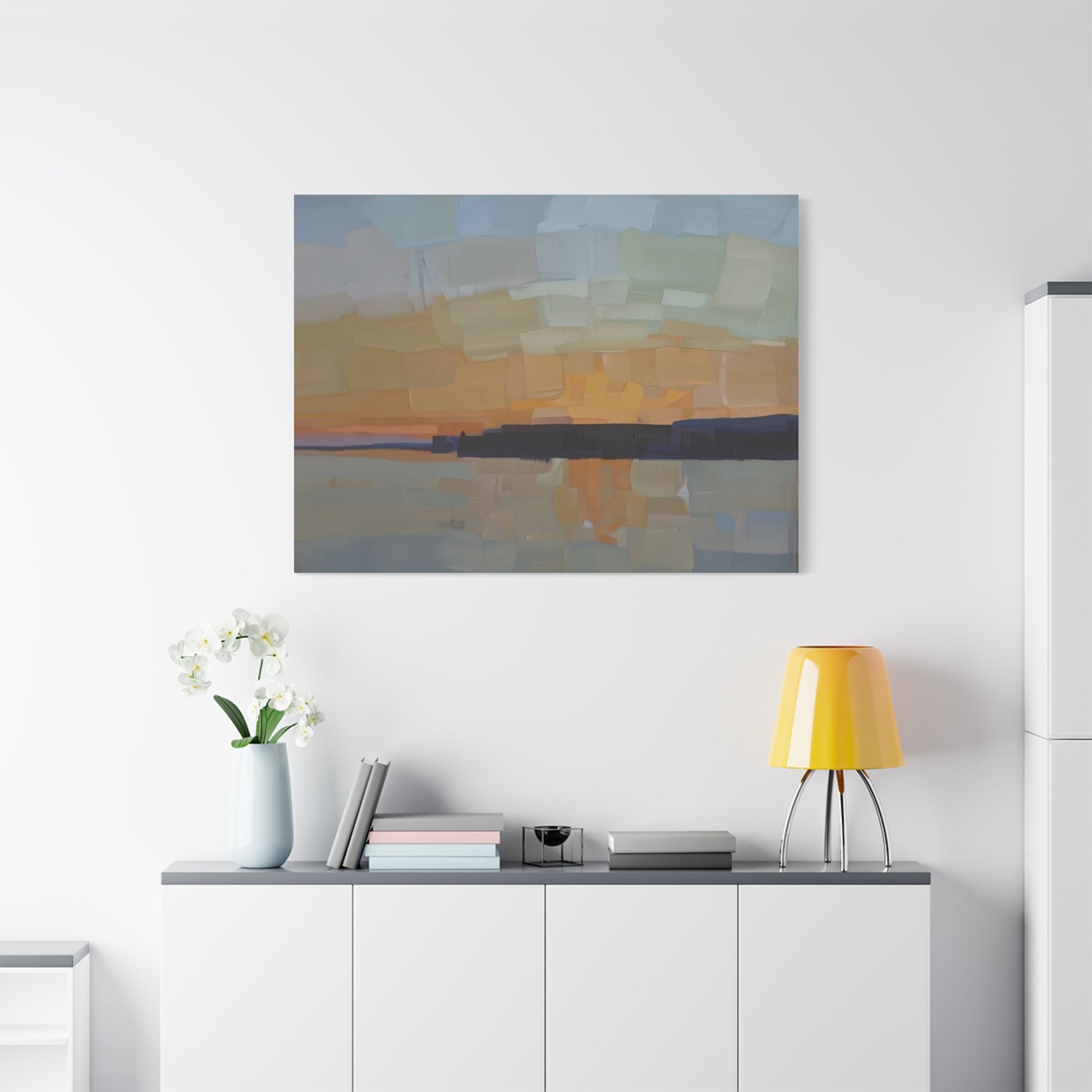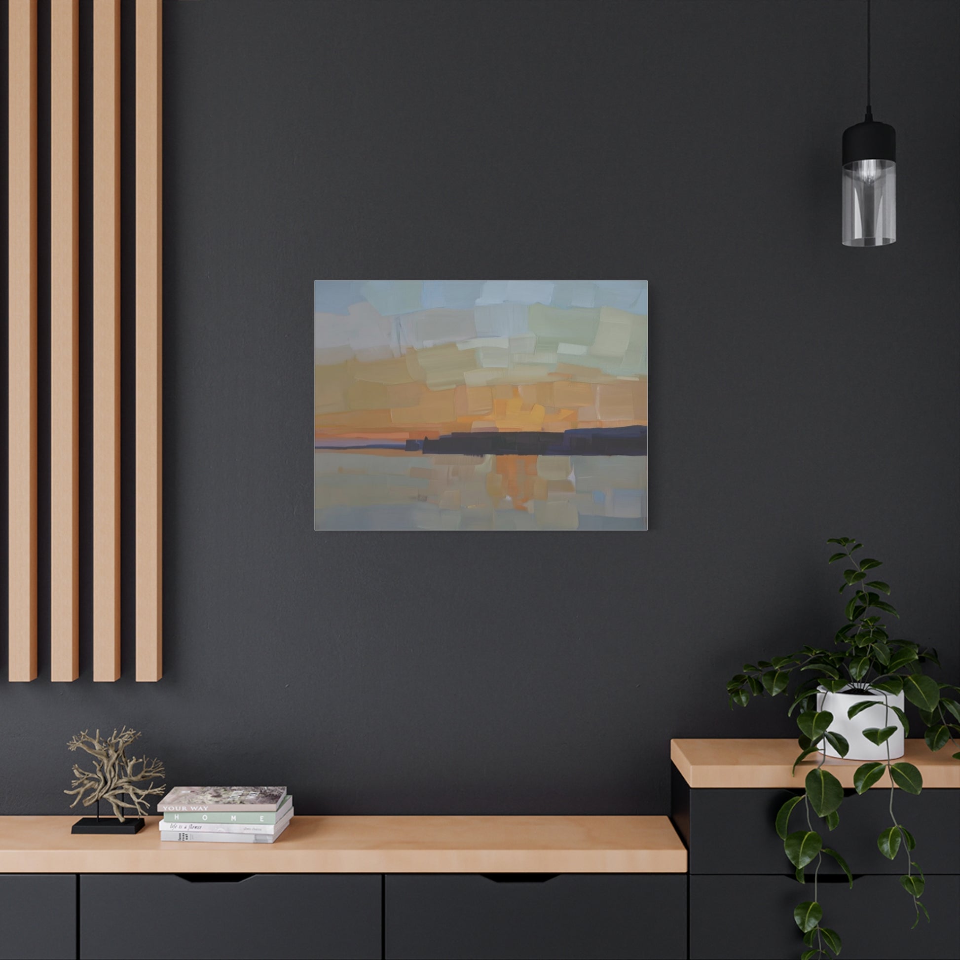 A serene, painterly landscape rendered in soft, muted tones and broad, expressive brushstrokes. This stretched matte canvas brings a quiet horizon into your room — cool blues and dove grays meet warm apricot and honeyed highlights, blending into a reflective, almost misty shoreline. The slim 1.25" depth keeps the piece modern and gallery-ready while the matte finish reduces glare and emphasizes the tactile, painted quality. Hung above a sofa, hallway console, or bedside, it settles the space and invites slow, contemplative moments.