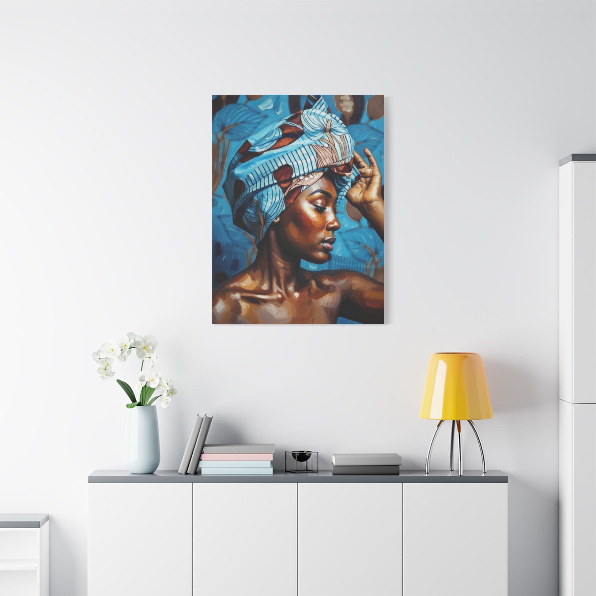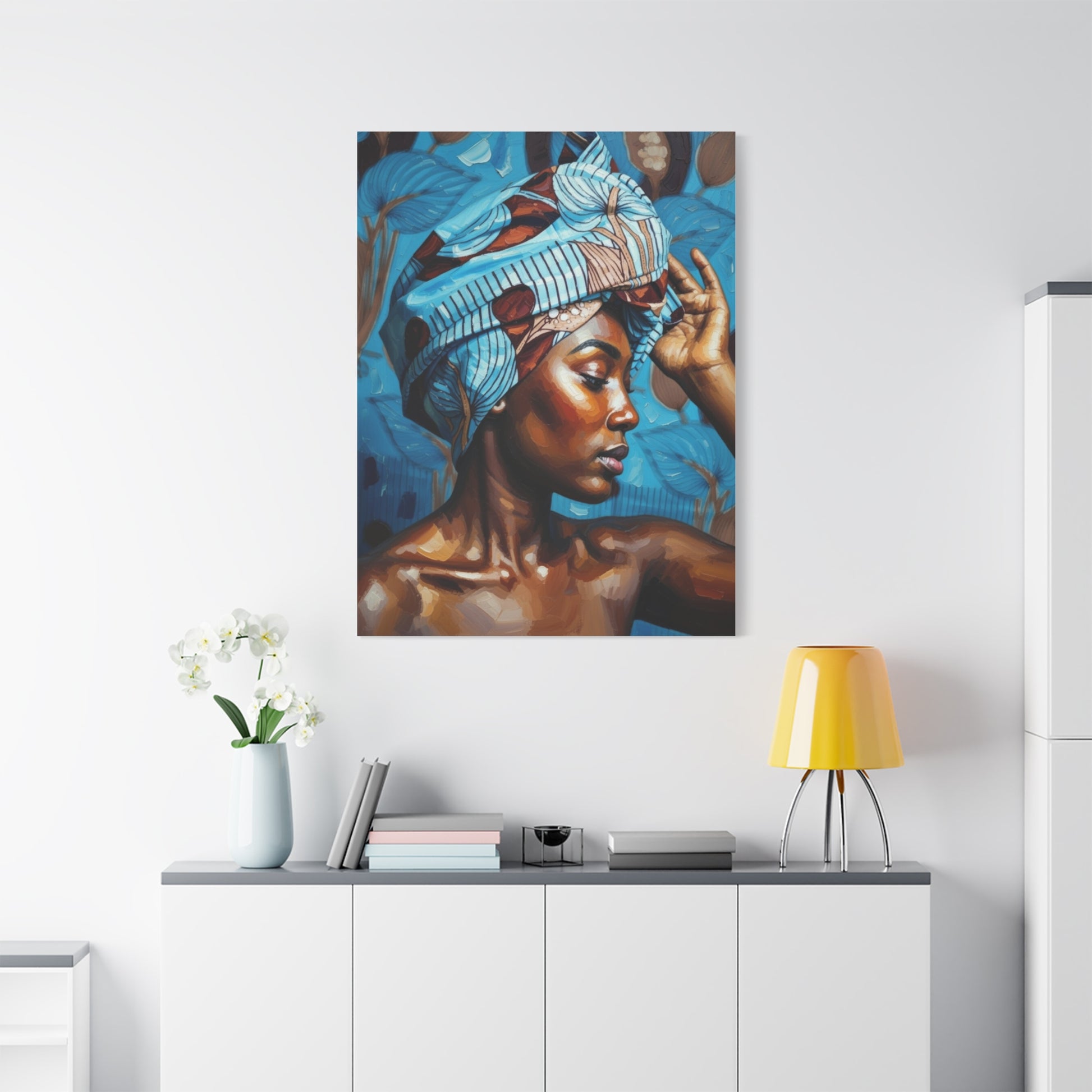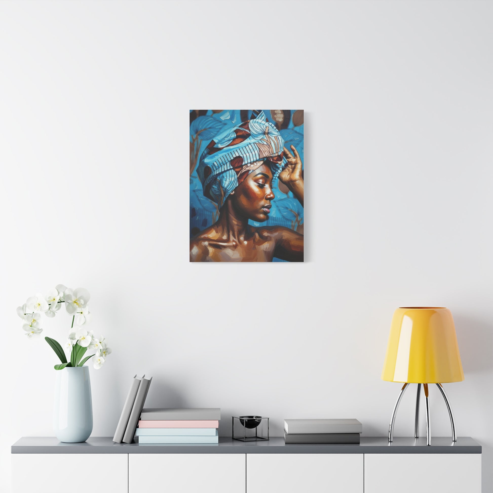 African Woman Portrait Canvas Wall Art - Blue Headwrap Matte Stretched Canvas