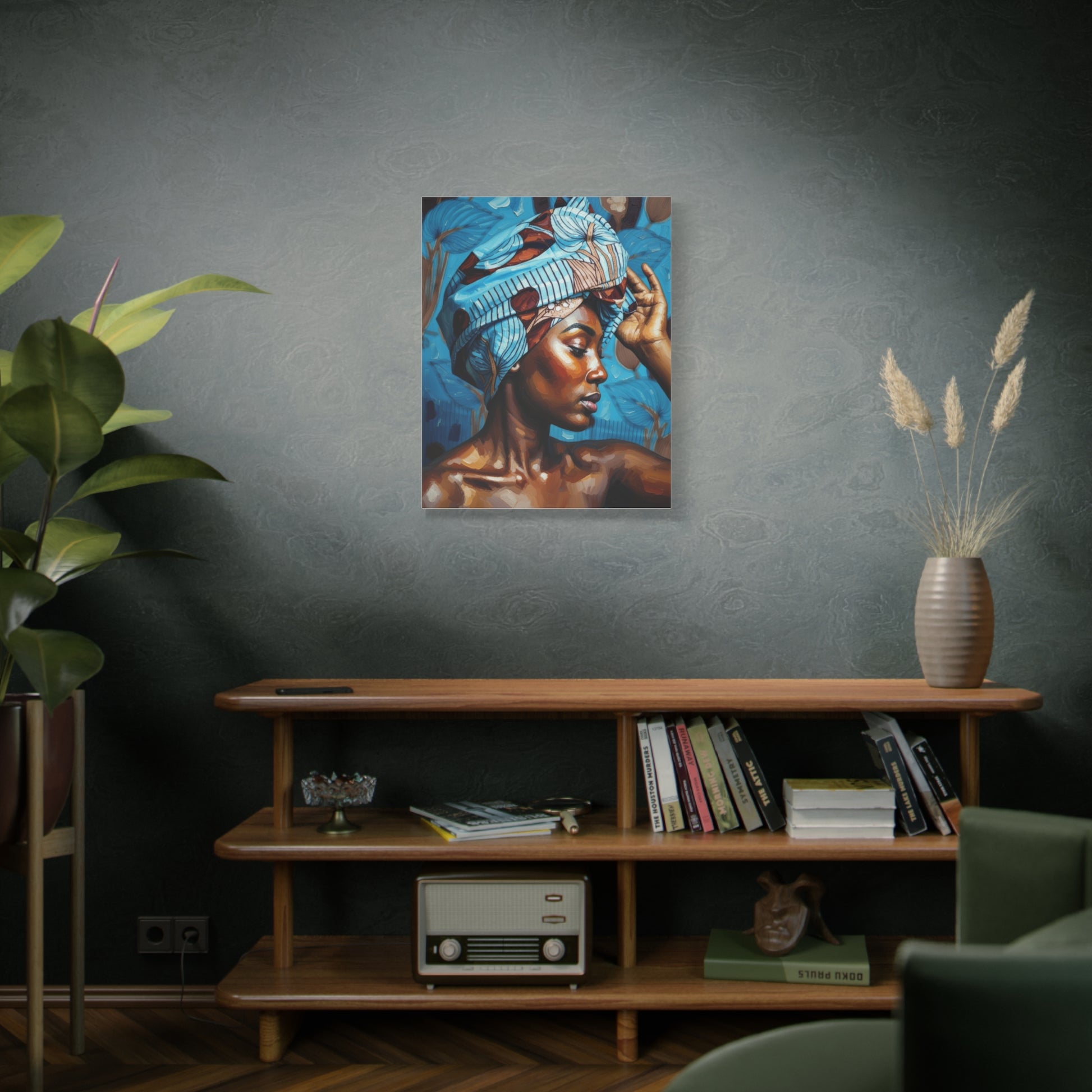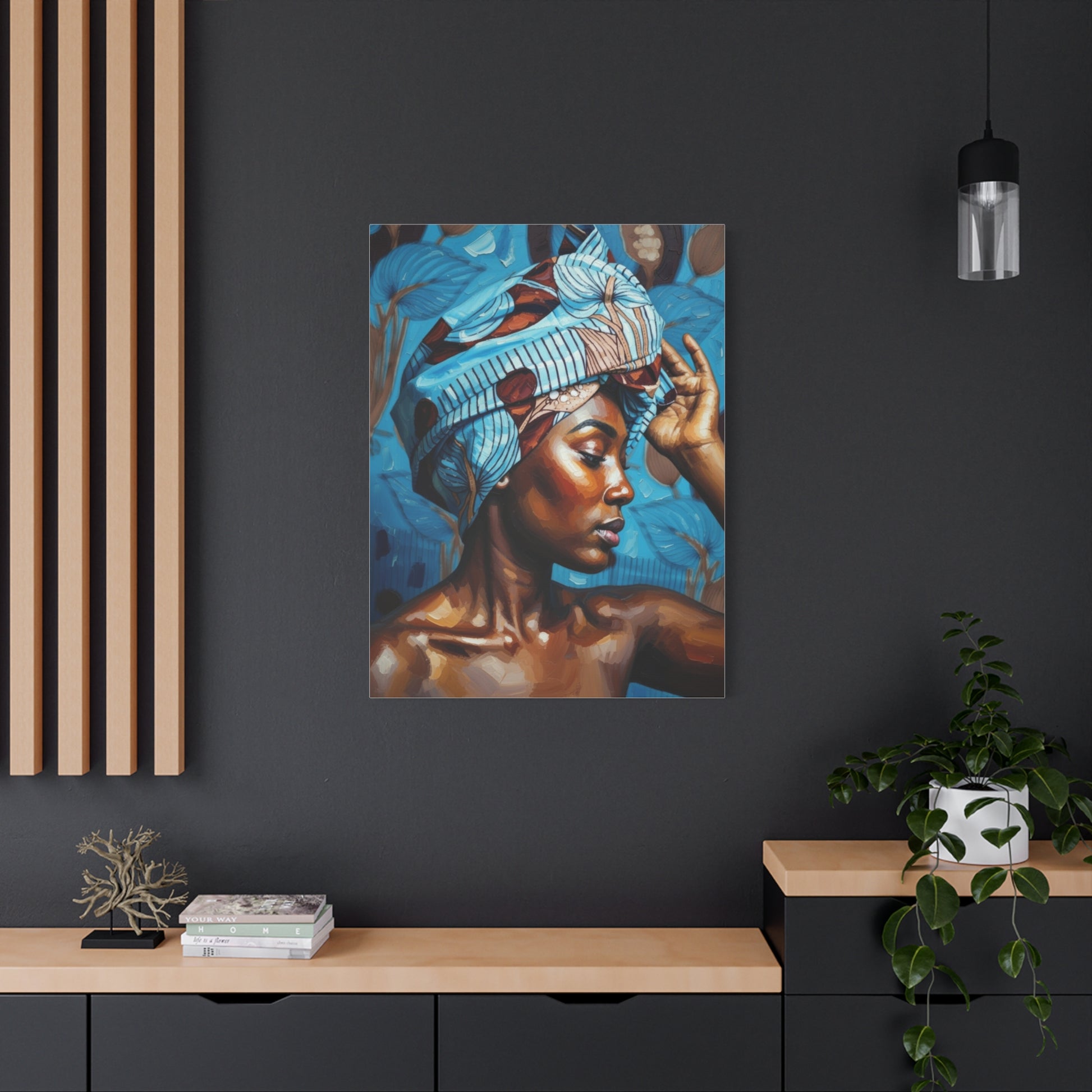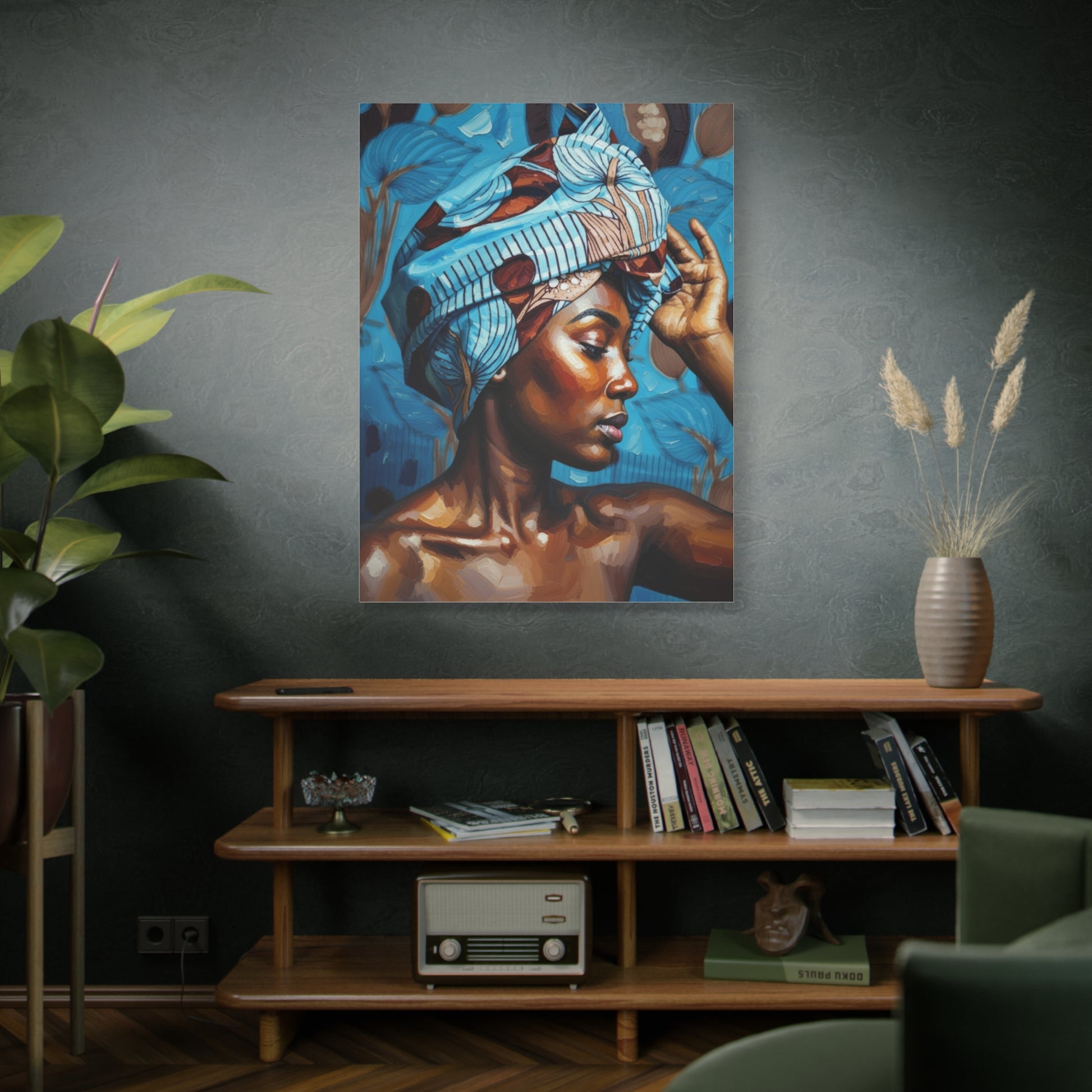 This stretched matte canvas brings a quiet, powerful presence to any room. The rich, painterly portrait captures warm skin tones and a patterned headwrap against a cool, botanical backdrop, creating a balanced contrast that draws the eye. Printed with Greenguard Gold-certified inks on a durable cotton-poly canvas, the image has depth and a soft, non-reflective finish that feels intimate and gallery-ready. The canvas is stretched over a slim 1.25" pine frame made from responsibly sourced wood, with soft rubber dots and a ready-to-hang backing to keep the piece steady on your wall. It’s suited to living rooms, bedrooms, or creative spaces where soulful, contemporary art enhances daily life.