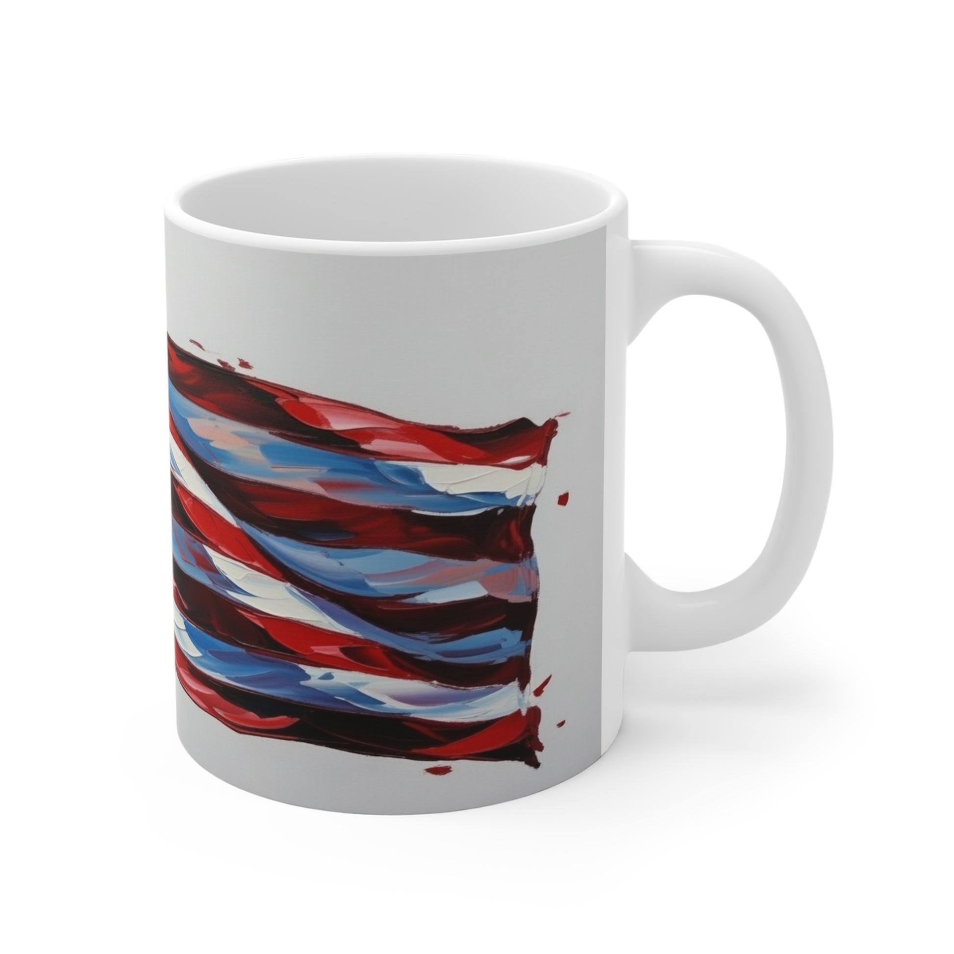 Hold a small, lively piece of home in your hands. This white 11 oz ceramic mug wears a painterly American flag — brushstrokes of deep blue and rich crimson that look like they’re moving in a warm kitchen breeze. It feels familiar: the quiet morning light, the first sip of coffee, a moment to steady yourself before the day begins. The vibrant print keeps its color and shine through daily use, and the comfortable C-handle fits naturally in your grip while you read headlines, plan errands, or take a pause between tasks. For casual mornings, backyard chats, or watching a parade from the porch, this mug brings a subtle, heartfelt nod to country and tradition without shouting for attention.