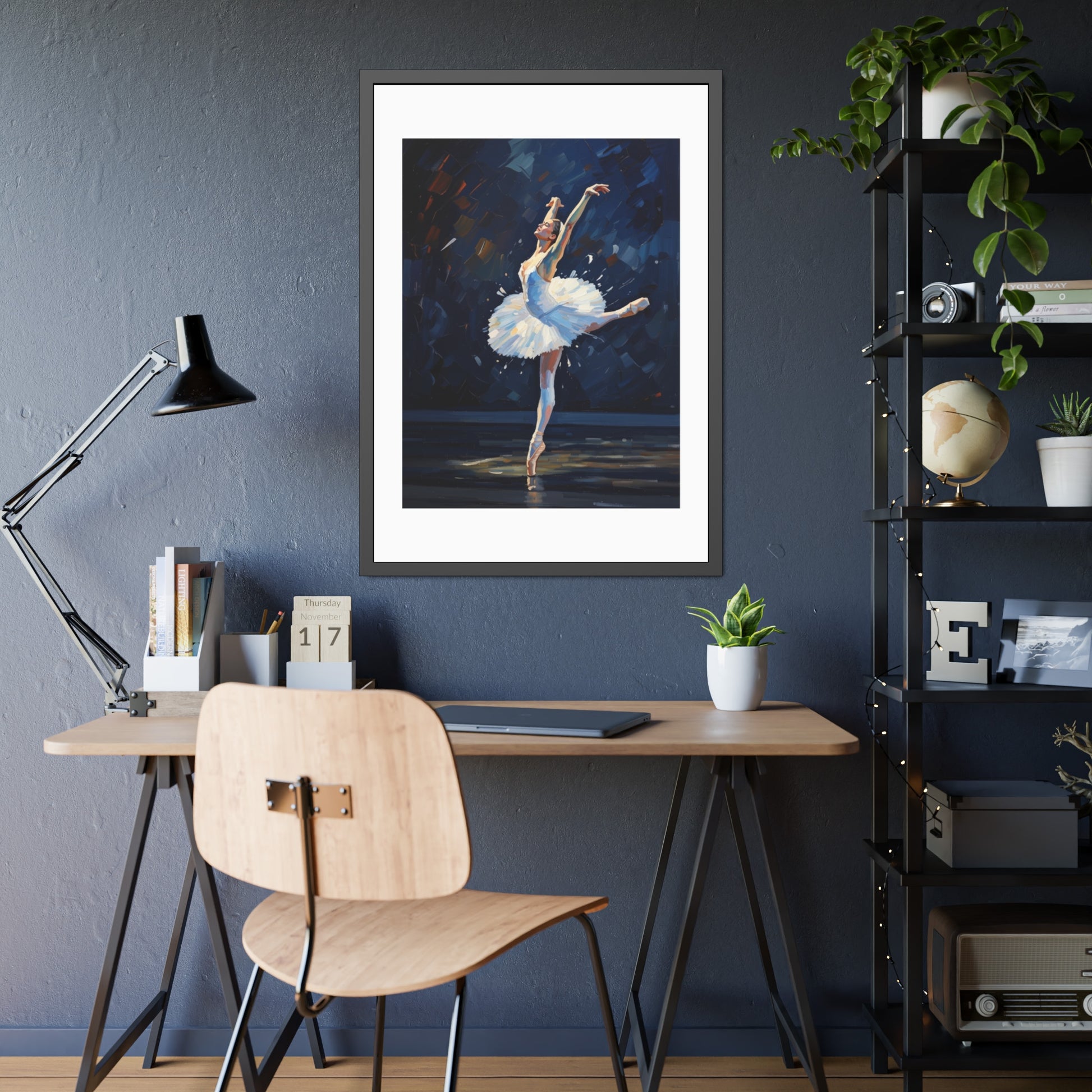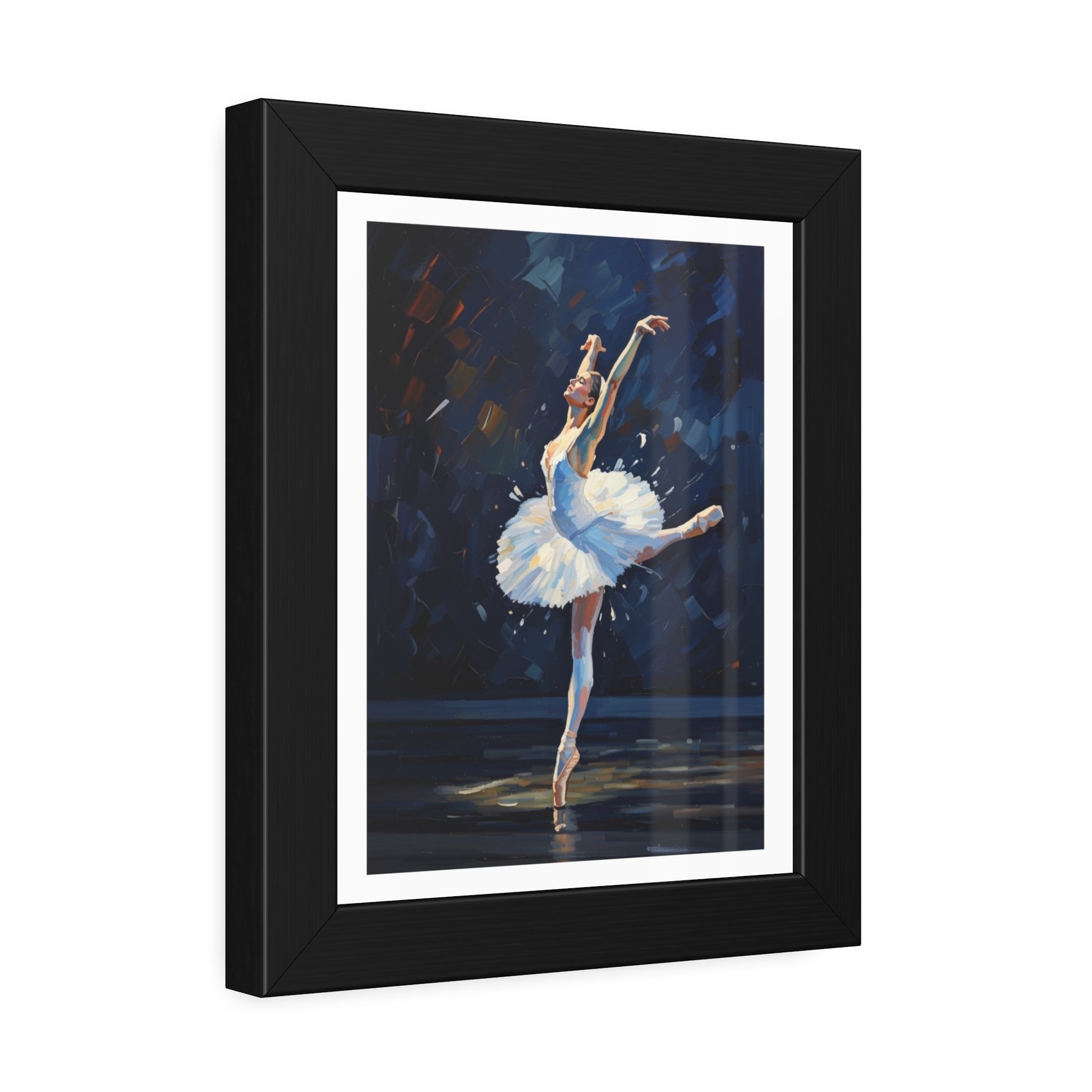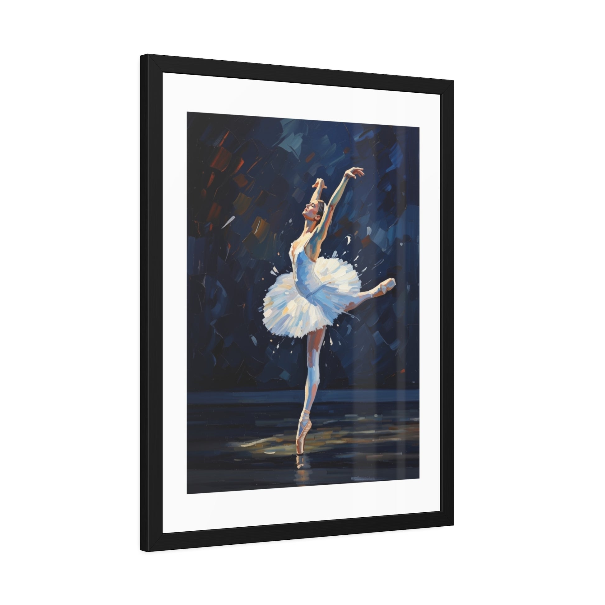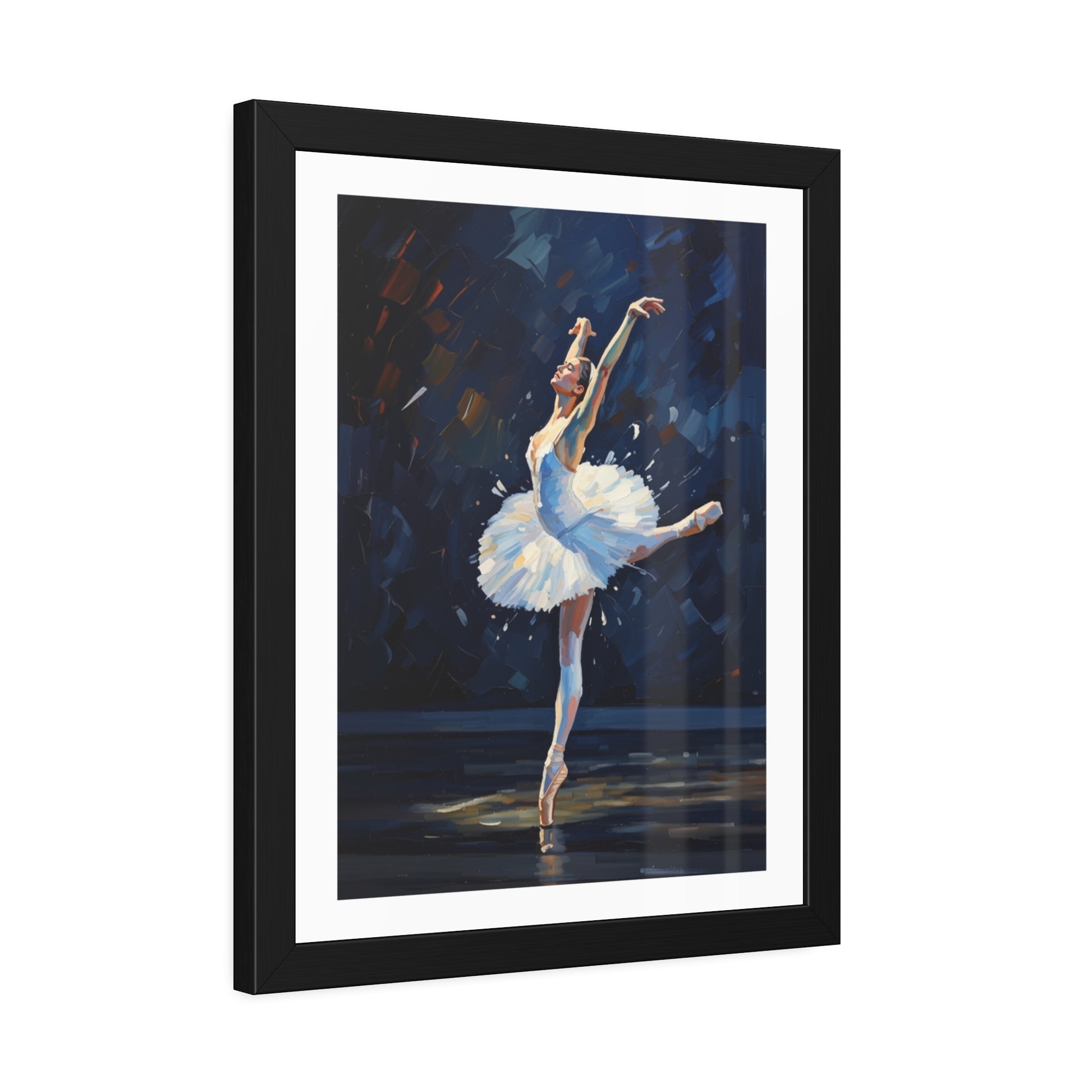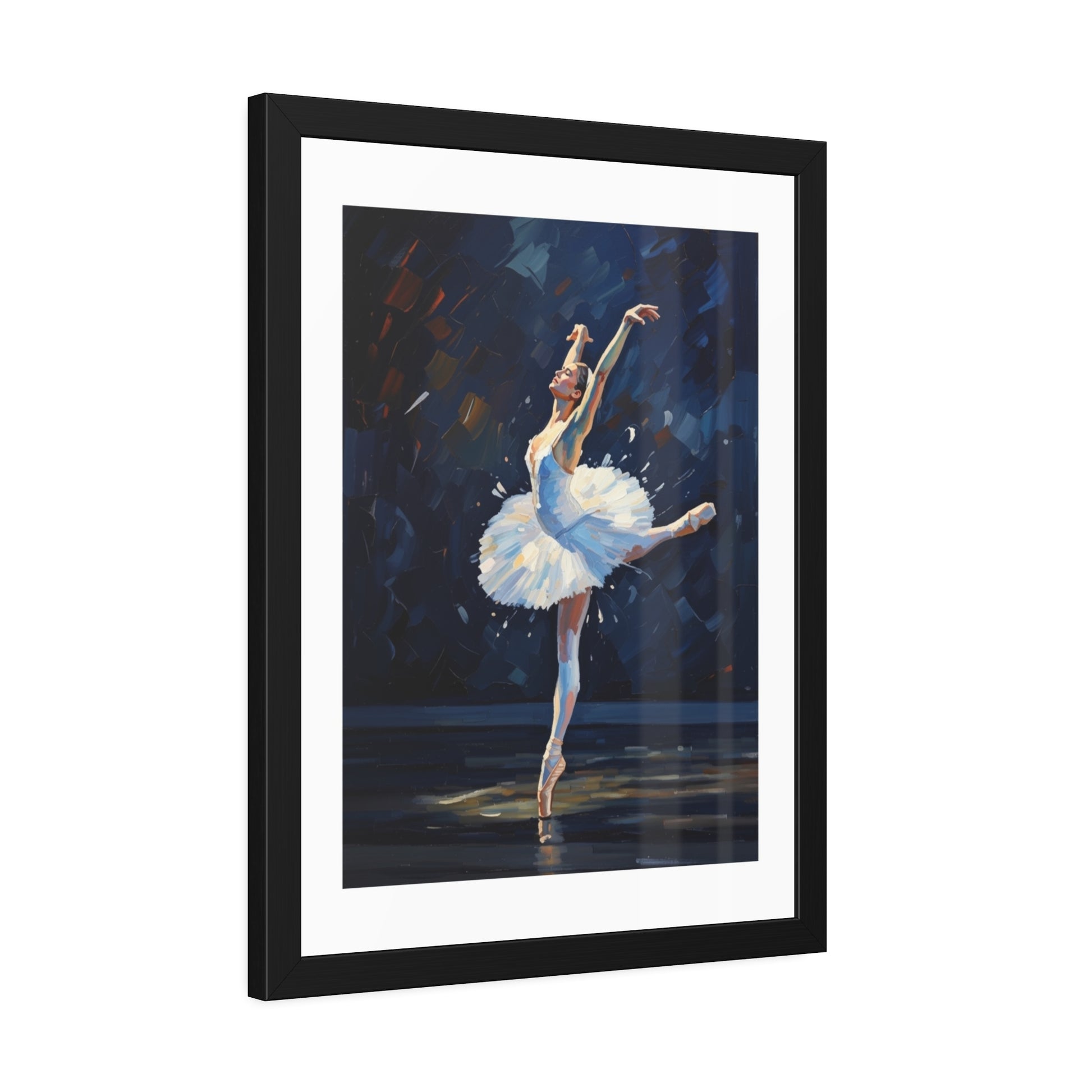 A framed paper poster that brings stage light and graceful motion into your home. The black pinewood frame and crisp white mat draw the eye to the dancer’s arabesque and the textured brushwork of the print. Choose fine art paper for a subtle, tactile surface that echoes traditional watercolors, or semi-gloss for bright whites and vivid contrast that make the blues and golds pop. Hung in a hallway, studio, or living room, this framed poster settles into spaces where movement and quiet focus meet — a visual pause that feels like a held note after the final bow.