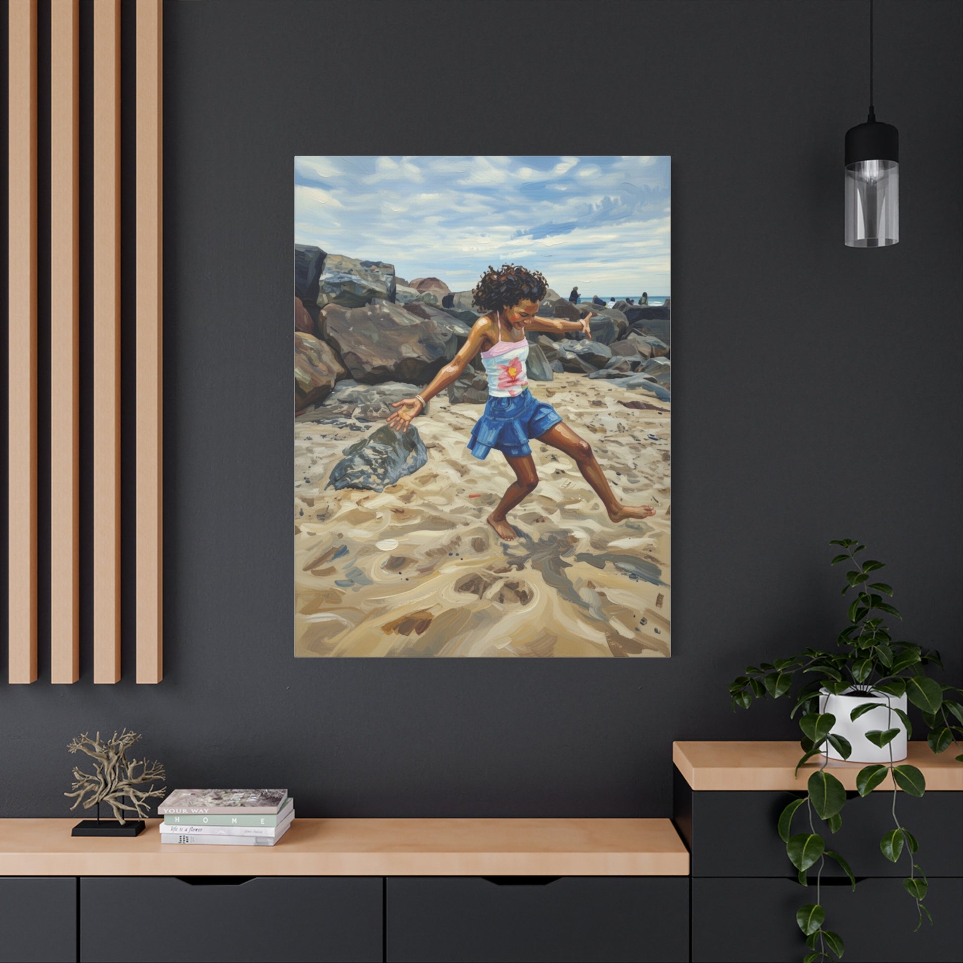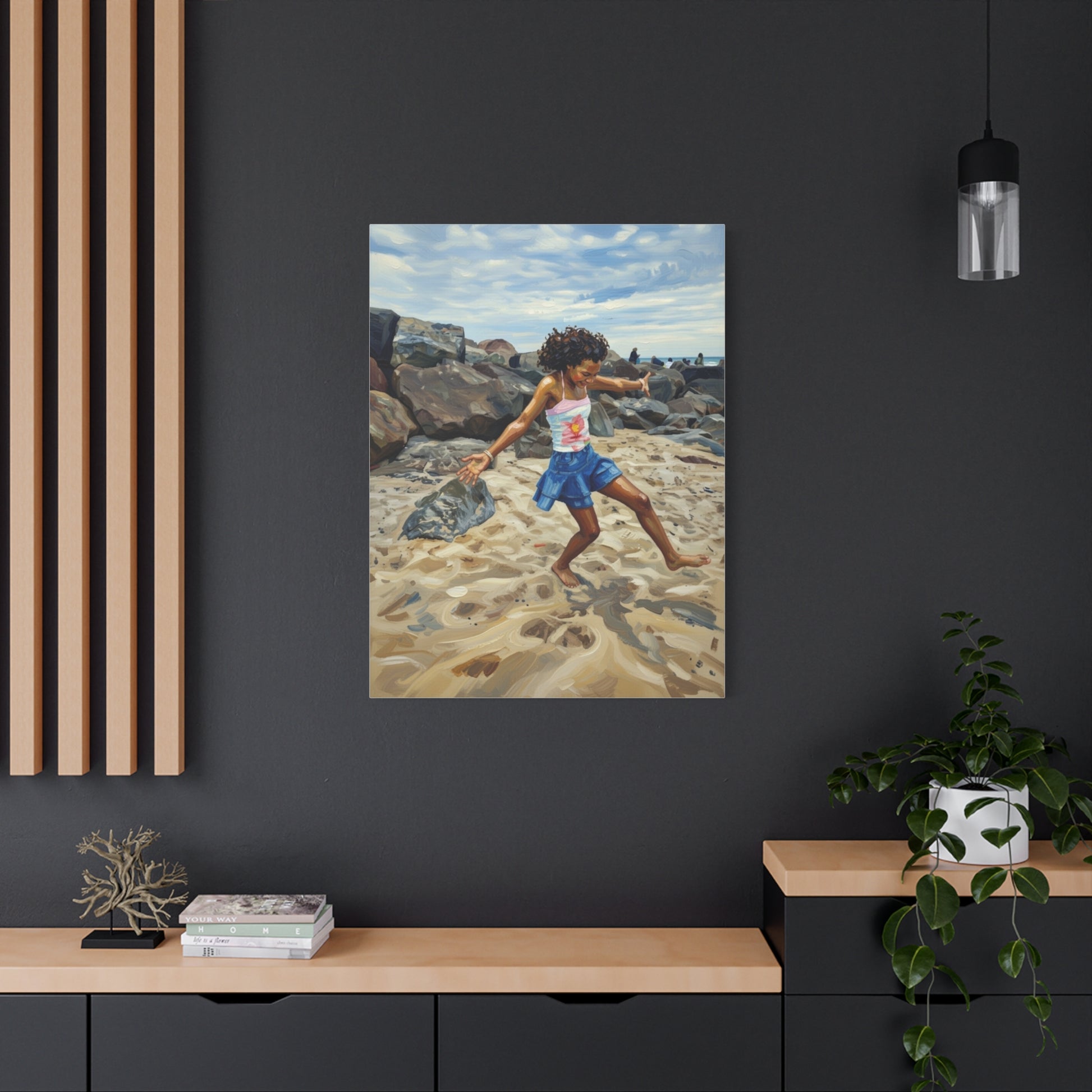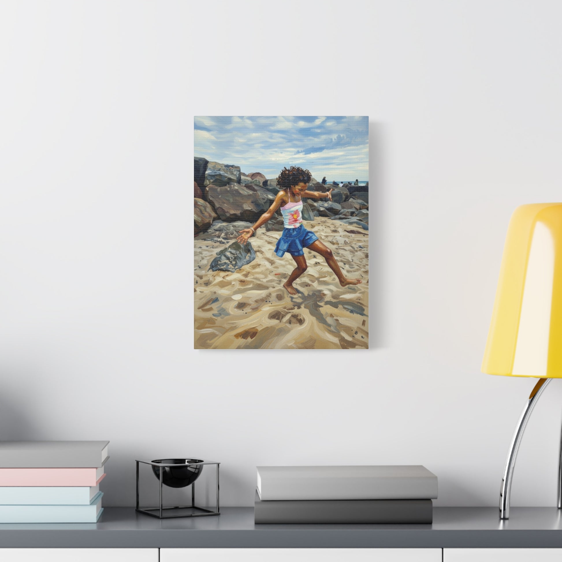This stretched matte canvas brings a warm, sunlit seaside moment into your home. The painterly image of a child dancing along the sand is rendered with rich, fade-resistant inks and a soft, non-reflective finish that keeps focus on texture and color. Light, sustainable pine frames and secure back-hanging hardware make it simple to add to a hallway, nursery, or living room. The subtle rubber feet protect surfaces when the canvas is displayed on a shelf, and the careful printing preserves brush-like detail for a lived-in, nostalgic feel.