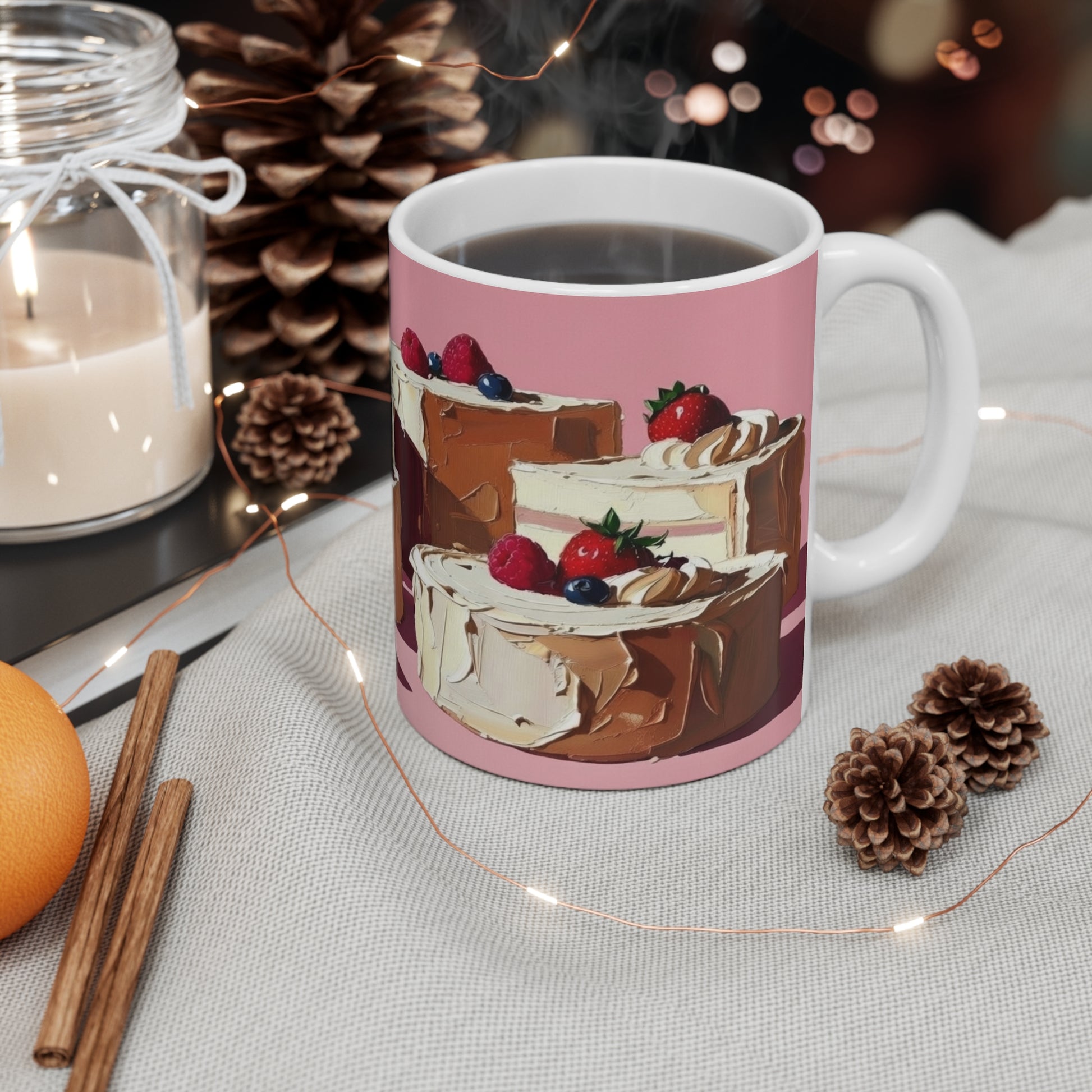 Warm, sweet, and a little indulgent — this white ceramic mug carries a painterly stack of berry-topped cakes against a soft rose background. Each sip becomes a pause: morning light, the hum of a kitchen, a tiny celebration in everyday life. The bright, saturated print keeps the dessert scene lively, while the comfortable C-handle and classic 11 oz size make this mug an easy reach for coffee, tea, or hot chocolate. It wears its color well thanks to AAA+ ORCA coating, and the print holds up through regular dishwasher and microwave use. Cozy companion for slow mornings, baking sessions, or sharing a treat across the table.