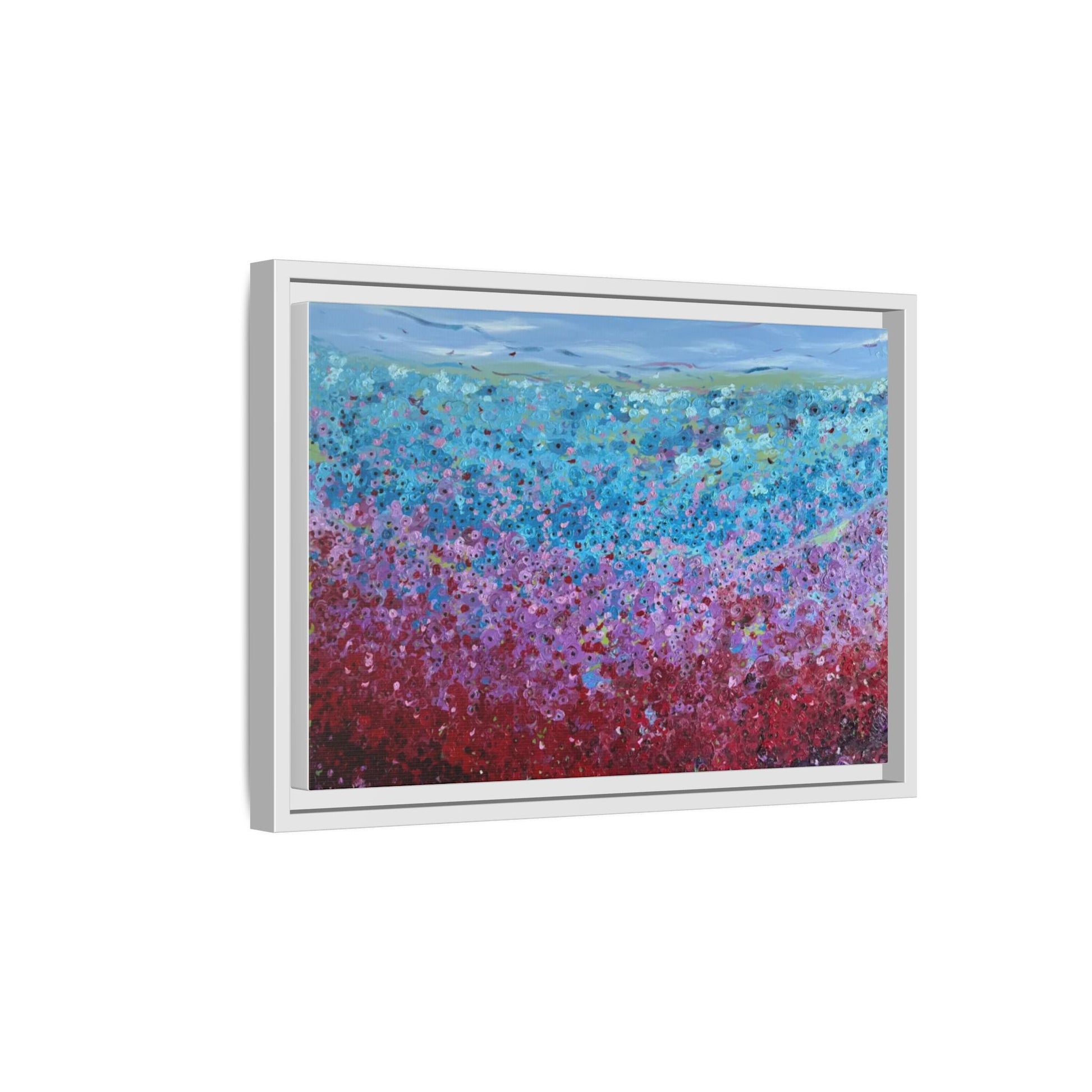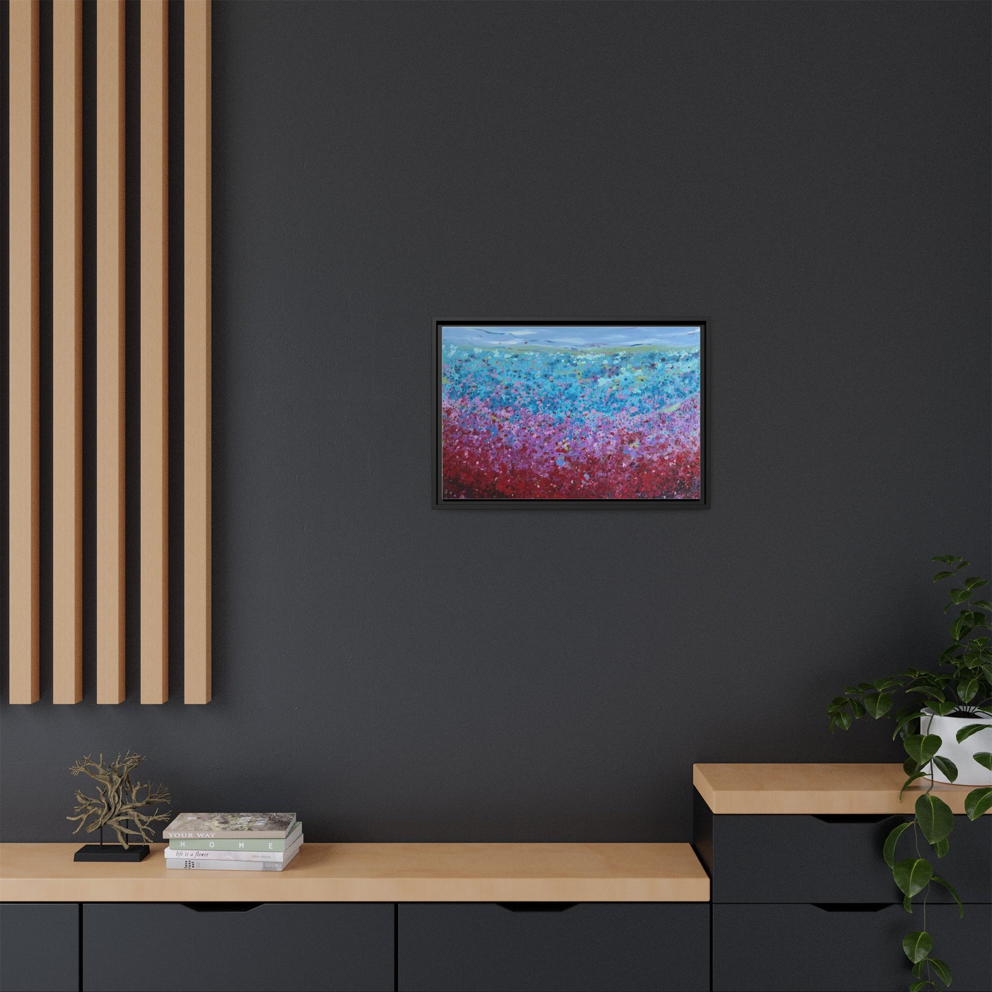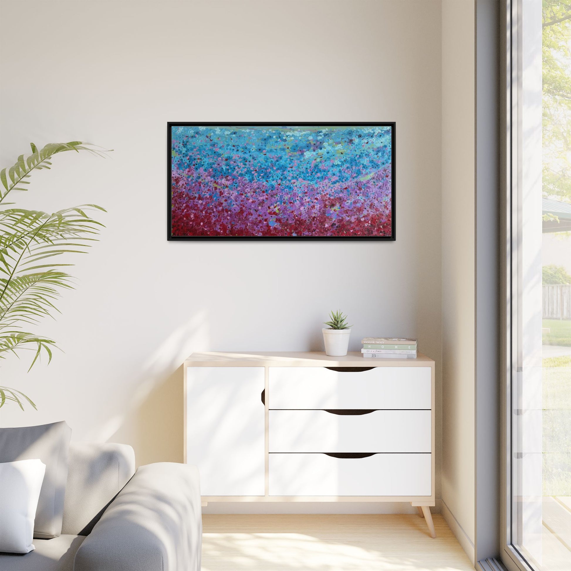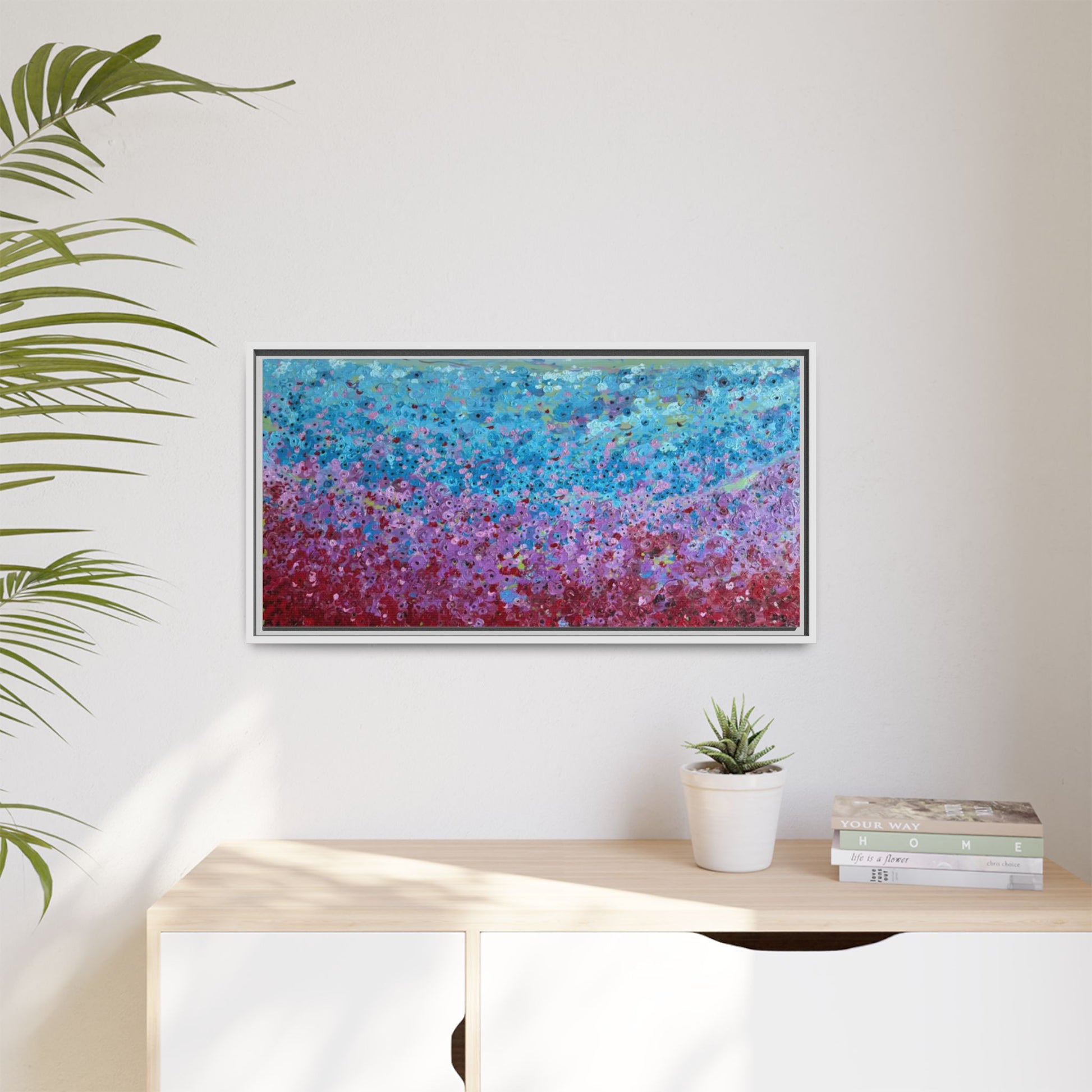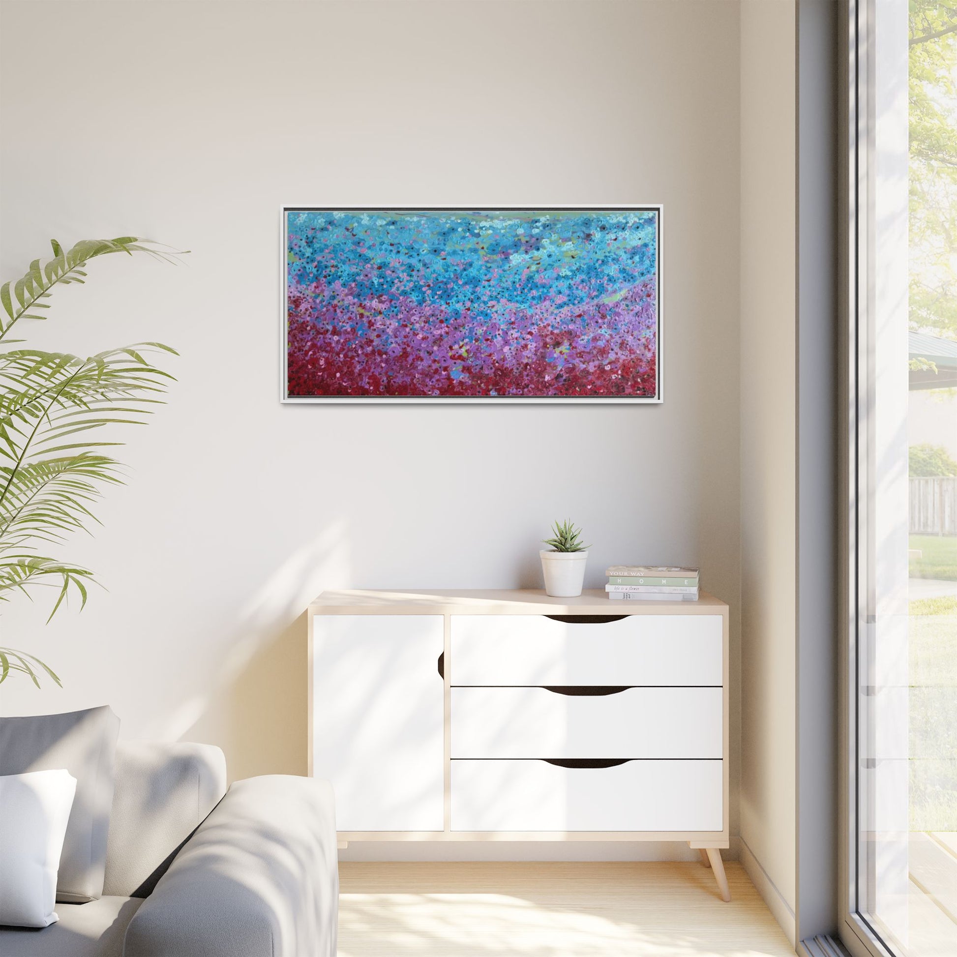 A framed matte canvas that brings painterly color and texture into your living space. Rich washes of blue, teal, pink and crimson come alive on a coated cotton-poly canvas, then sit inside a slim pine frame finished in your choice of color. The surface has a soft, non-reflective matte finish that emphasizes brush-like details and layered pigments. Lightweight yet sturdy, it arrives ready to hang with sawtooth hardware and gives walls a calm, artfully layered focal point that feels collected over time.