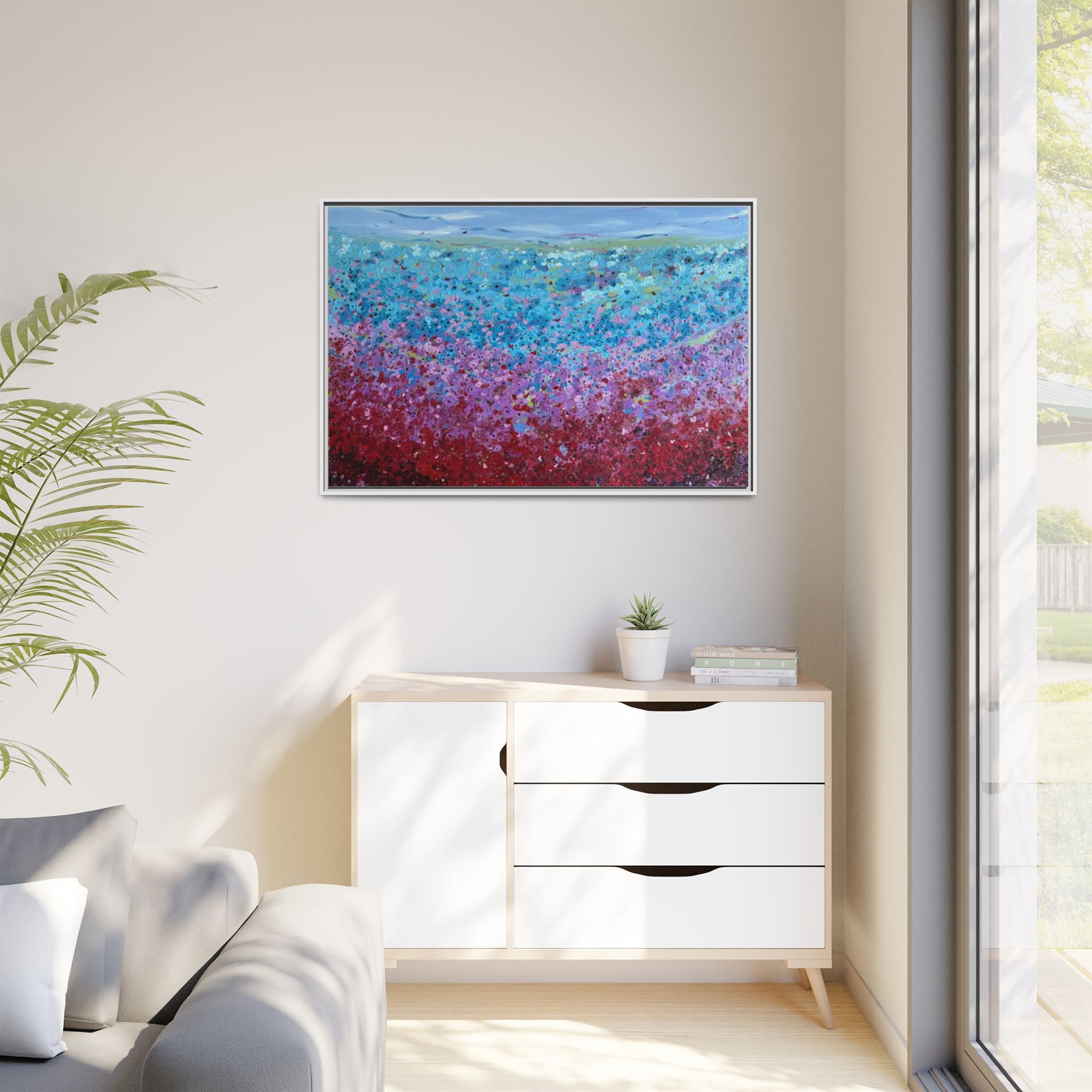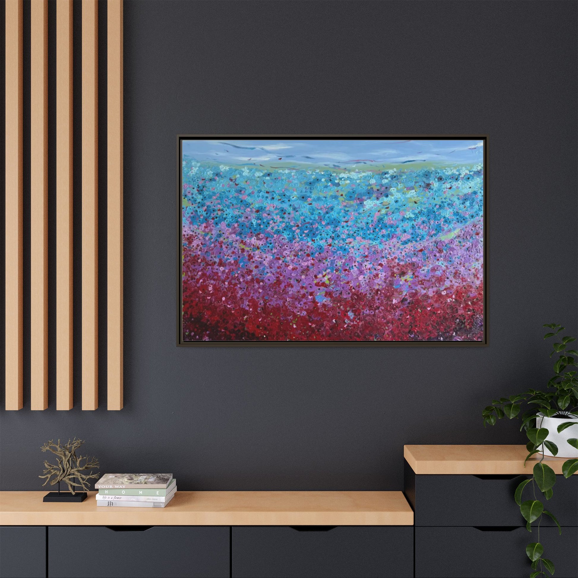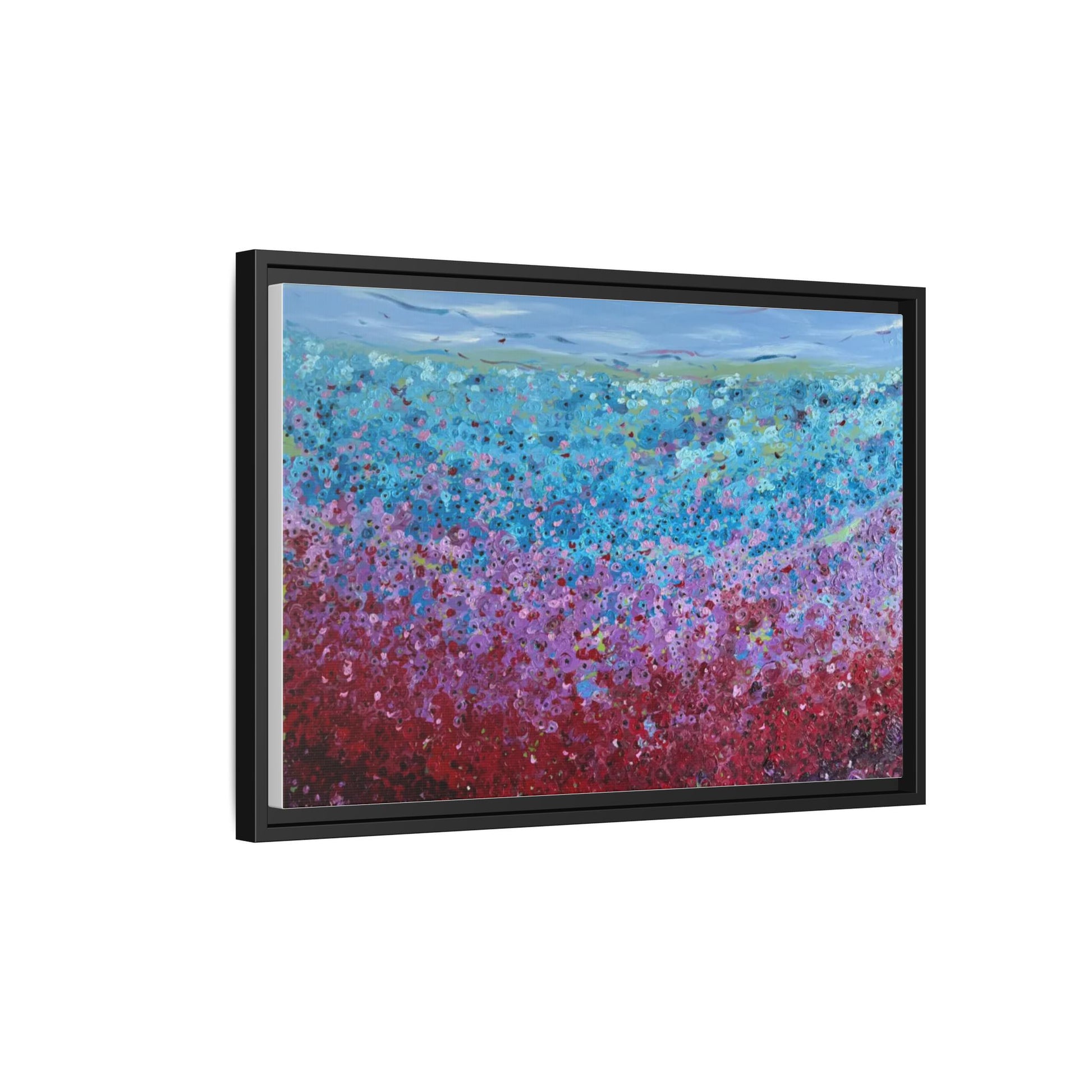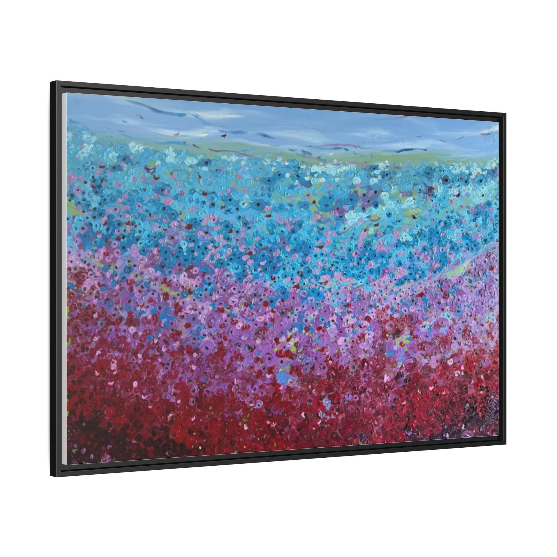 A framed matte canvas that brings painterly color and texture into your living space. Rich washes of blue, teal, pink and crimson come alive on a coated cotton-poly canvas, then sit inside a slim pine frame finished in your choice of color. The surface has a soft, non-reflective matte finish that emphasizes brush-like details and layered pigments. Lightweight yet sturdy, it arrives ready to hang with sawtooth hardware and gives walls a calm, artfully layered focal point that feels collected over time.