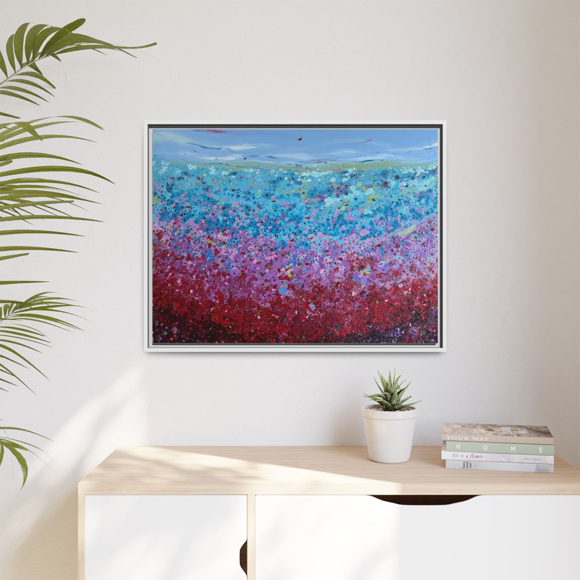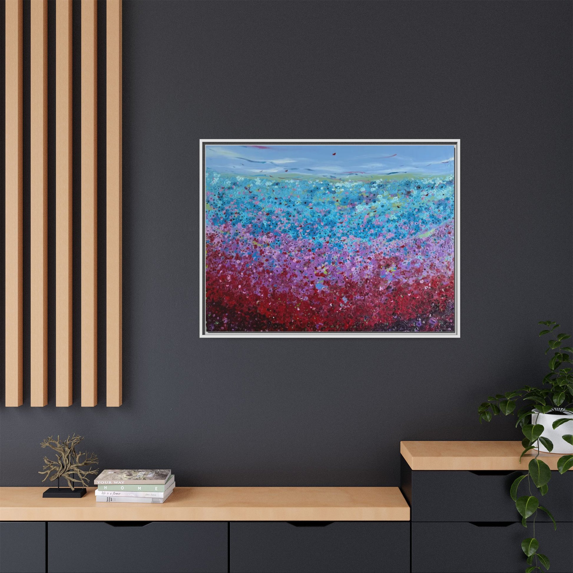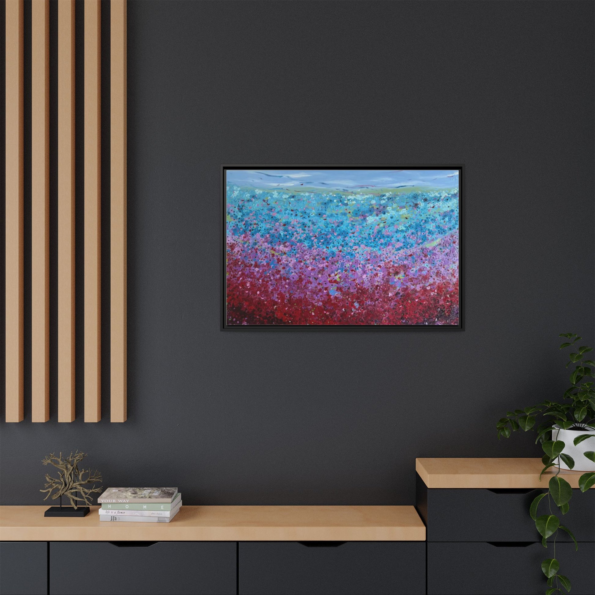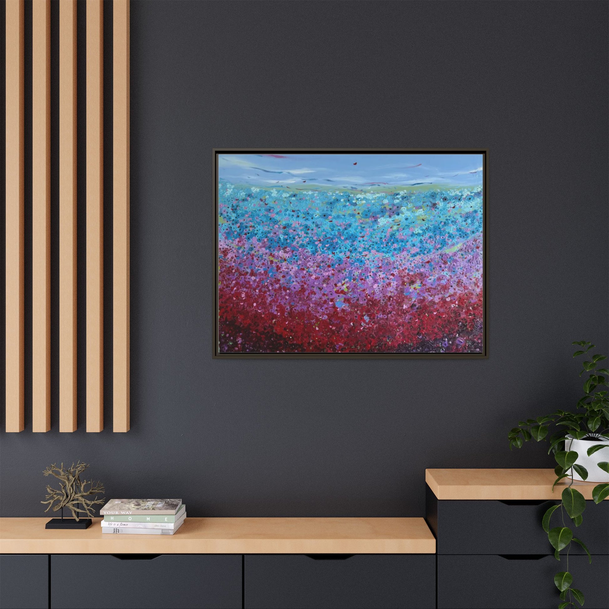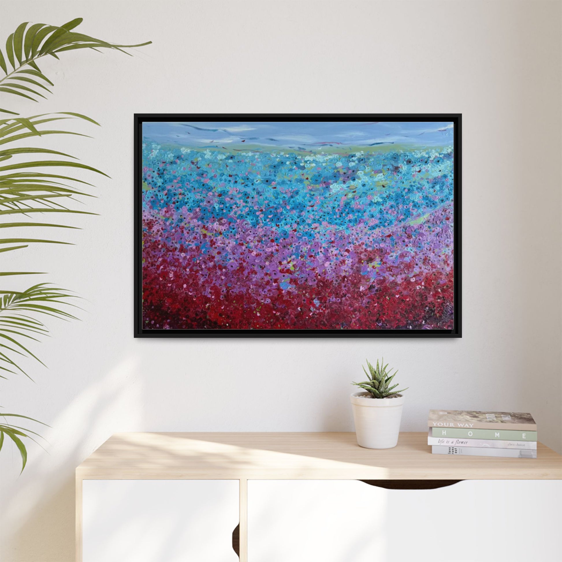 A framed matte canvas that brings painterly color and texture into your living space. Rich washes of blue, teal, pink and crimson come alive on a coated cotton-poly canvas, then sit inside a slim pine frame finished in your choice of color. The surface has a soft, non-reflective matte finish that emphasizes brush-like details and layered pigments. Lightweight yet sturdy, it arrives ready to hang with sawtooth hardware and gives walls a calm, artfully layered focal point that feels collected over time.