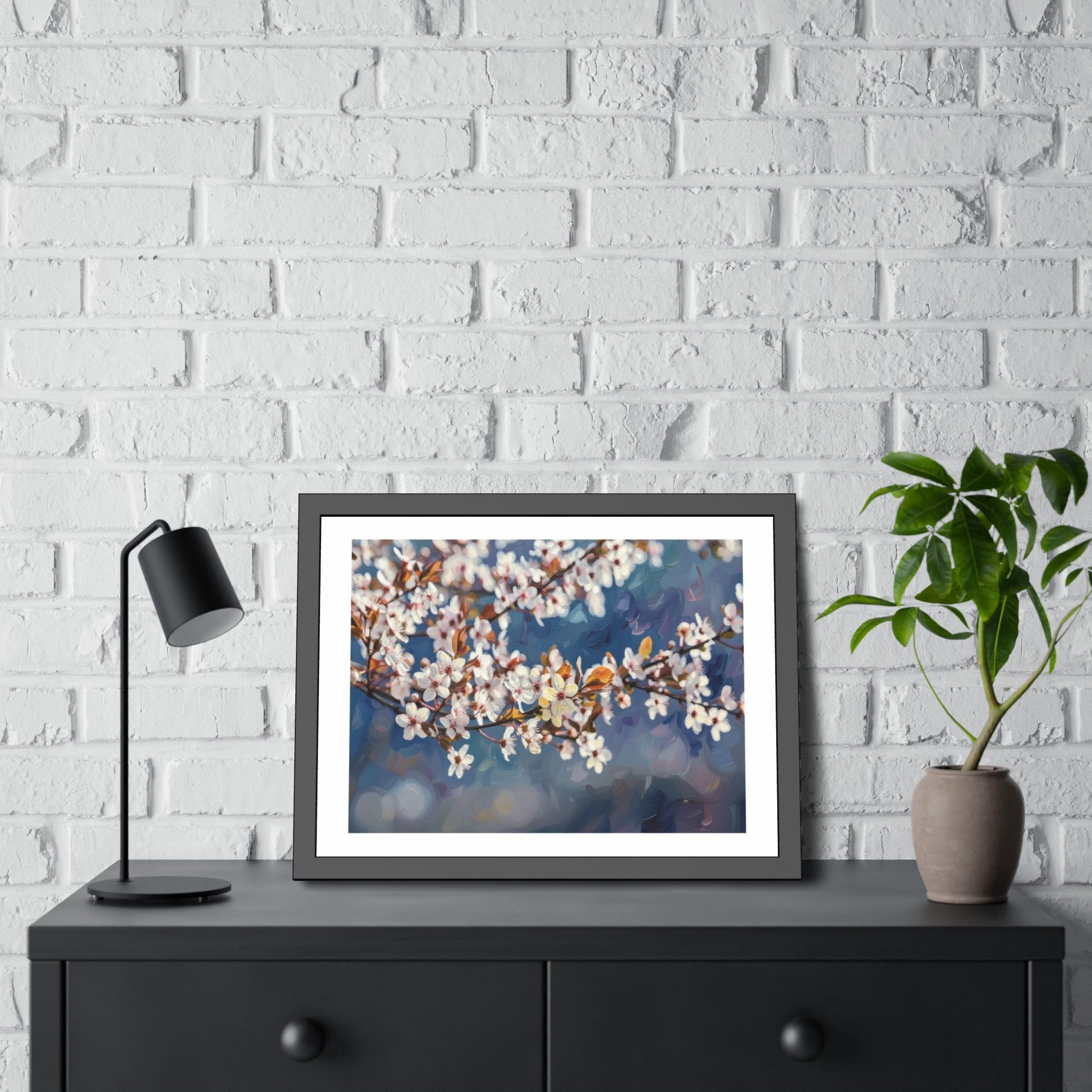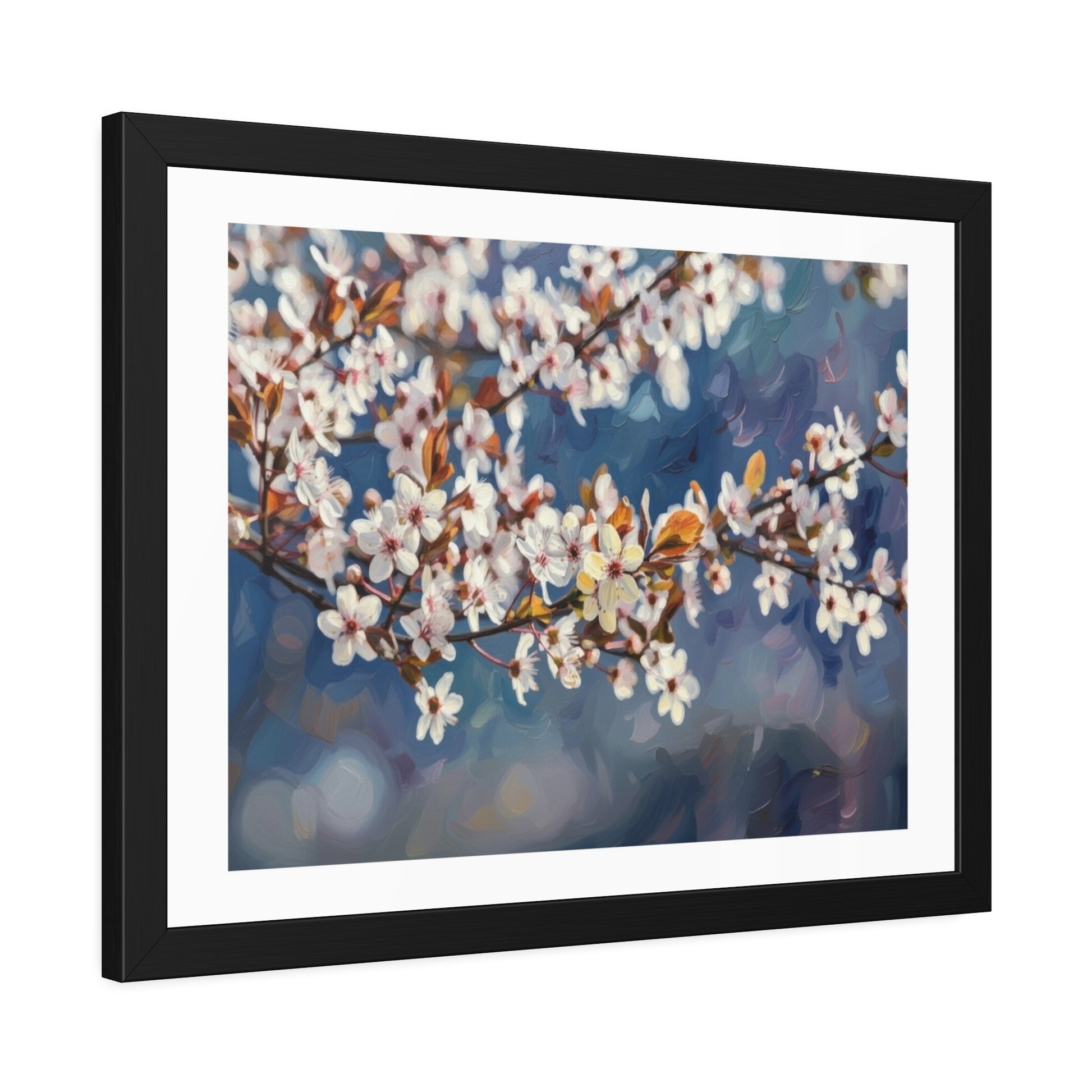A framed paper poster that brings quiet spring mornings indoors. Soft blossoms float across a painterly blue background, printed with rich, true-to-life color onto your choice of textured fine art or bright semi-gloss paper. The print sits inside a matte black pinewood frame with a warm brown paper backing and shatter‑proof plexiglass, ready to hang — a calm, elegant focal point for living rooms, bedrooms, or entryways. It feels like a pause: slow light, gentle color, a breath of seasonal calm on the wall.