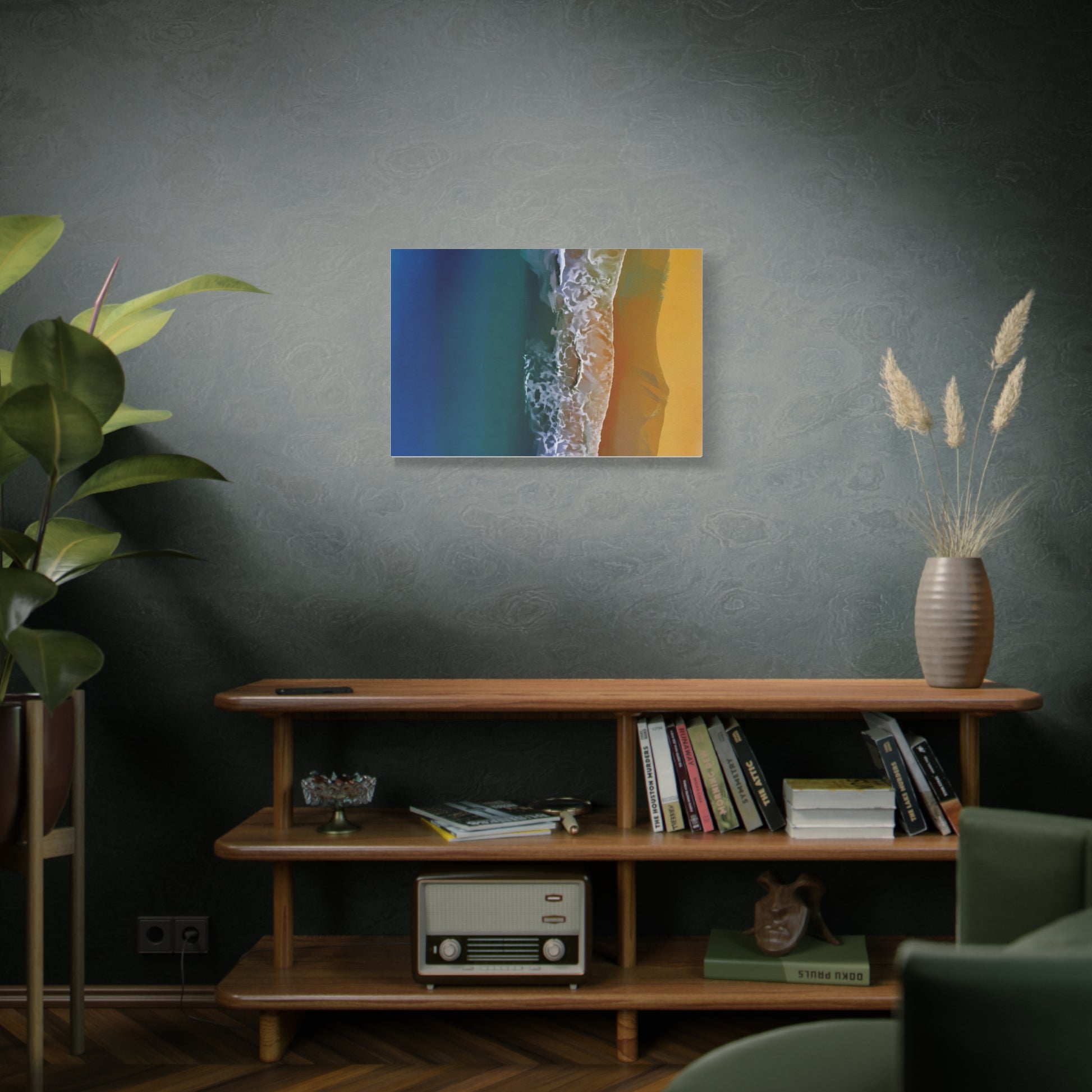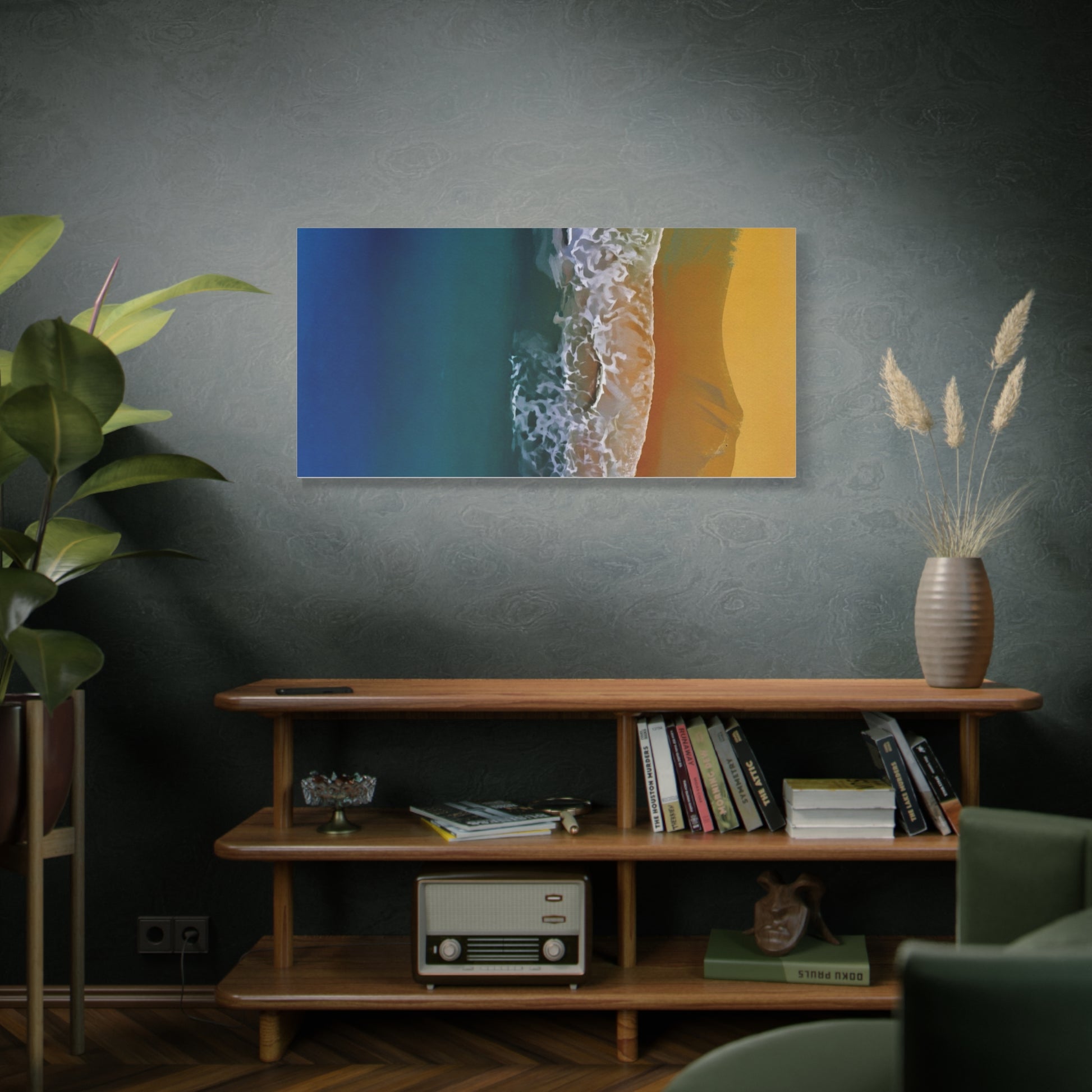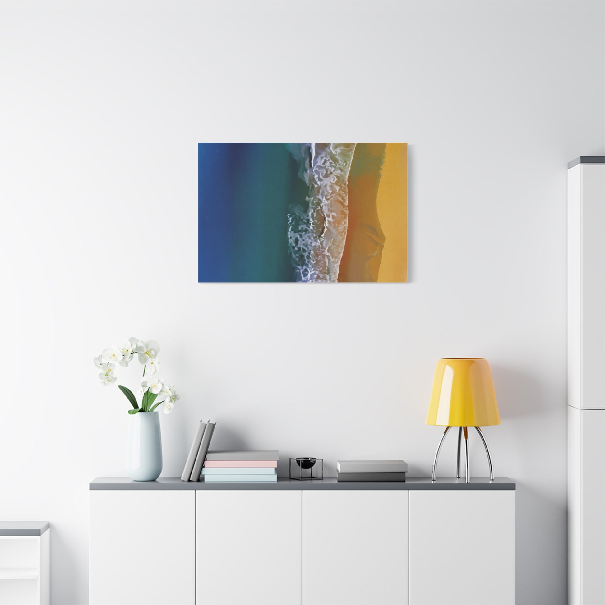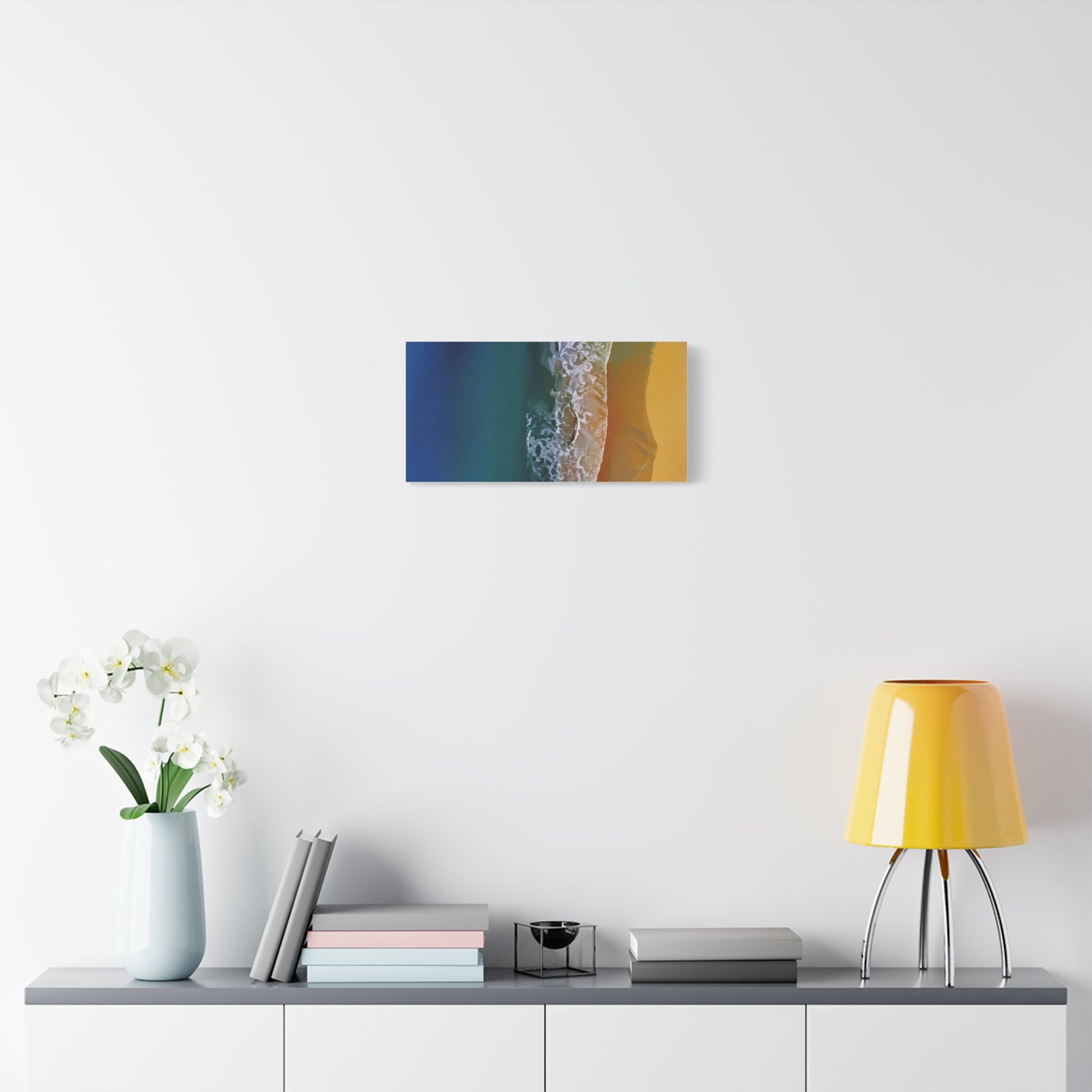 A stretched matte canvas that brings a coastal moment into your home. Deep teal water fades into frothy surf and warm golden sand—captured with high-definition Greenguard Gold inks for rich, long-lasting color on a textured cotton-poly canvas. The image is stretched over a 1.25" radiata pine frame and arrives ready to hang, with soft rubber dots on the back to keep the piece steady on the wall. It hangs horizontally, vertically, or square depending on size chosen, and the muted matte finish cuts glare so the scene reads calm and true from any angle. This print fits a relaxed living room, a seaside-themed bedroom, or a sunlit hallway where you want a quiet, immersive reminder of ocean air and late-afternoon light.