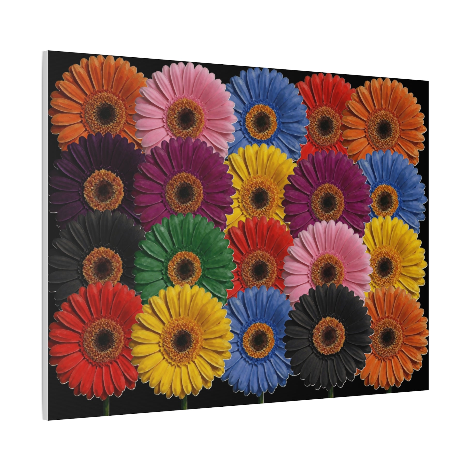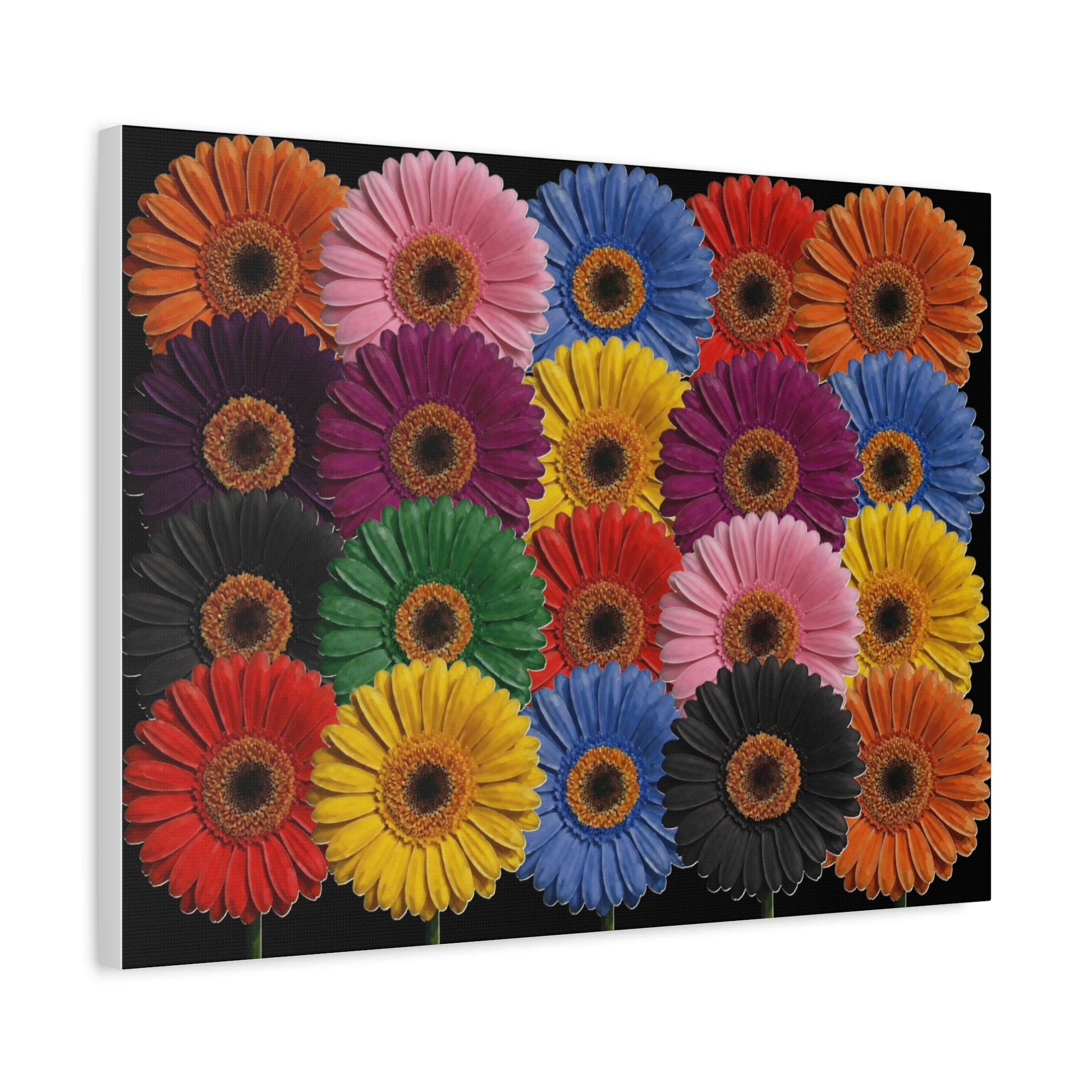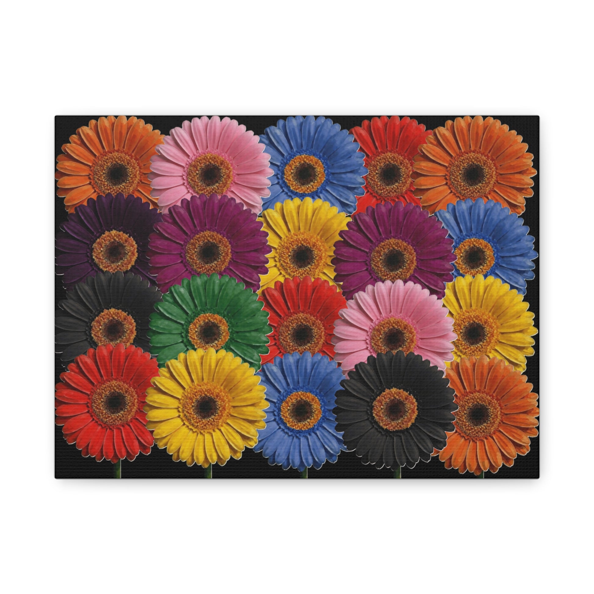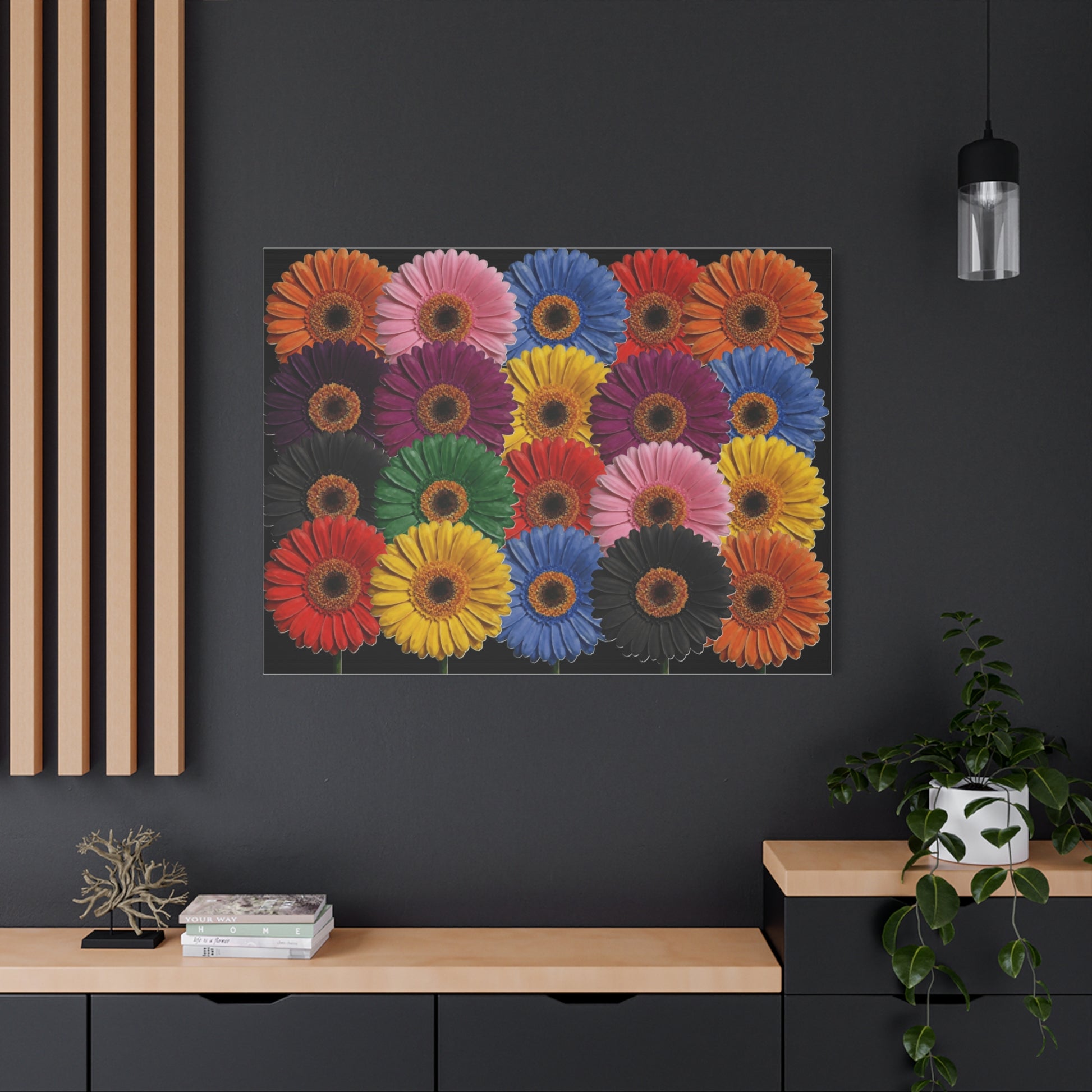 A vibrant stretched canvas that brings bold, joyful color to any wall. Hand-stretched over a 1.25" pine frame, this matte canvas showcases finely detailed gerbera blooms in a rich, saturated palette against a deep black background. The textured cotton-poly surface and UL-certified Greenguard Gold latex inks keep colors true and safe, while the soft rubber dots on the back protect surfaces and help the piece hang straight. It reads like a burst of happy energy — great for brightening living rooms, creative studios, or entryways and for giving gallery walls a lively focal point.