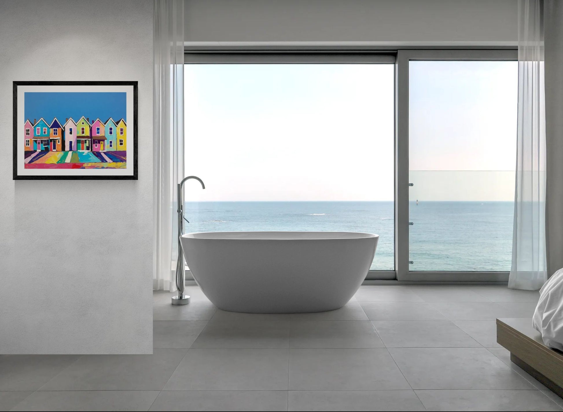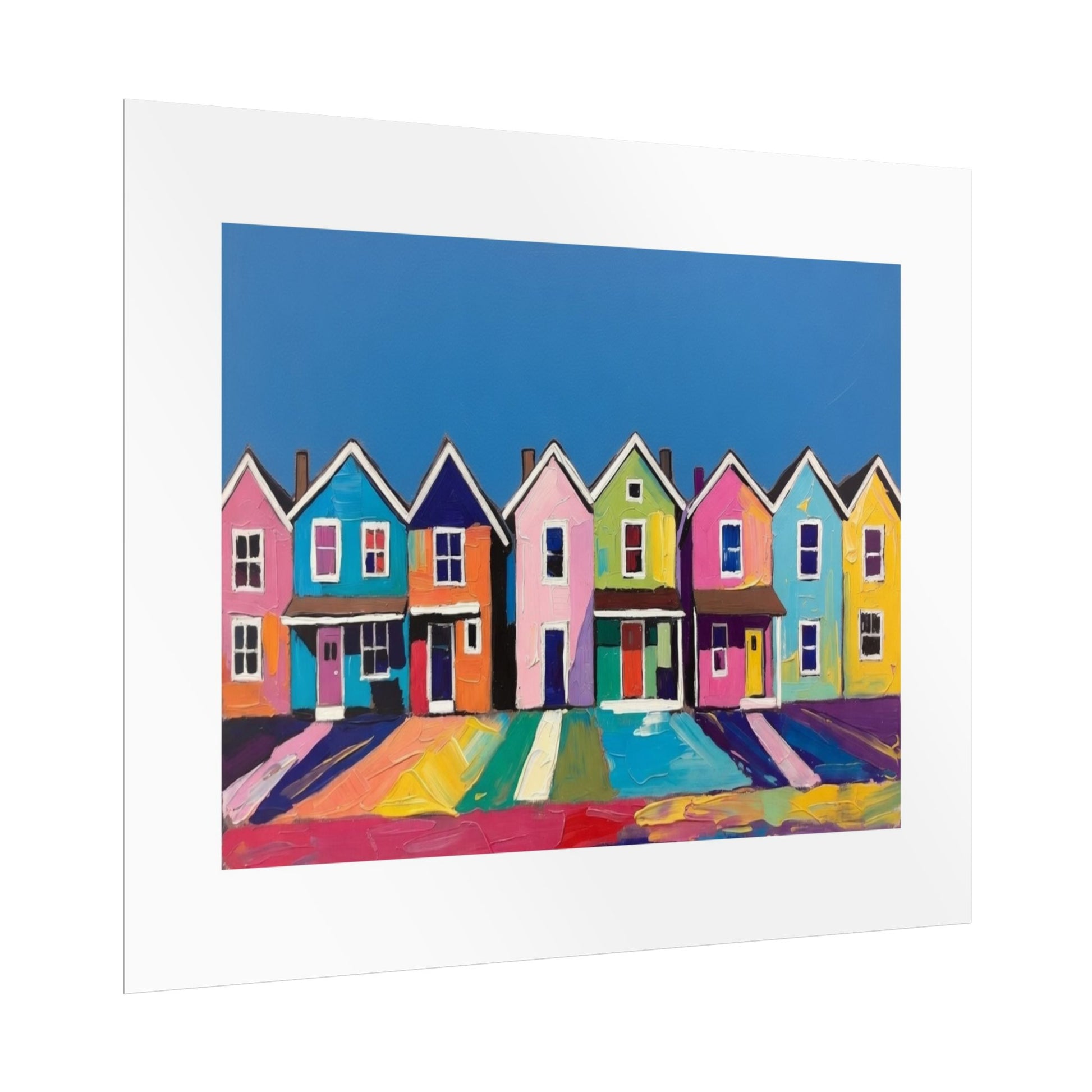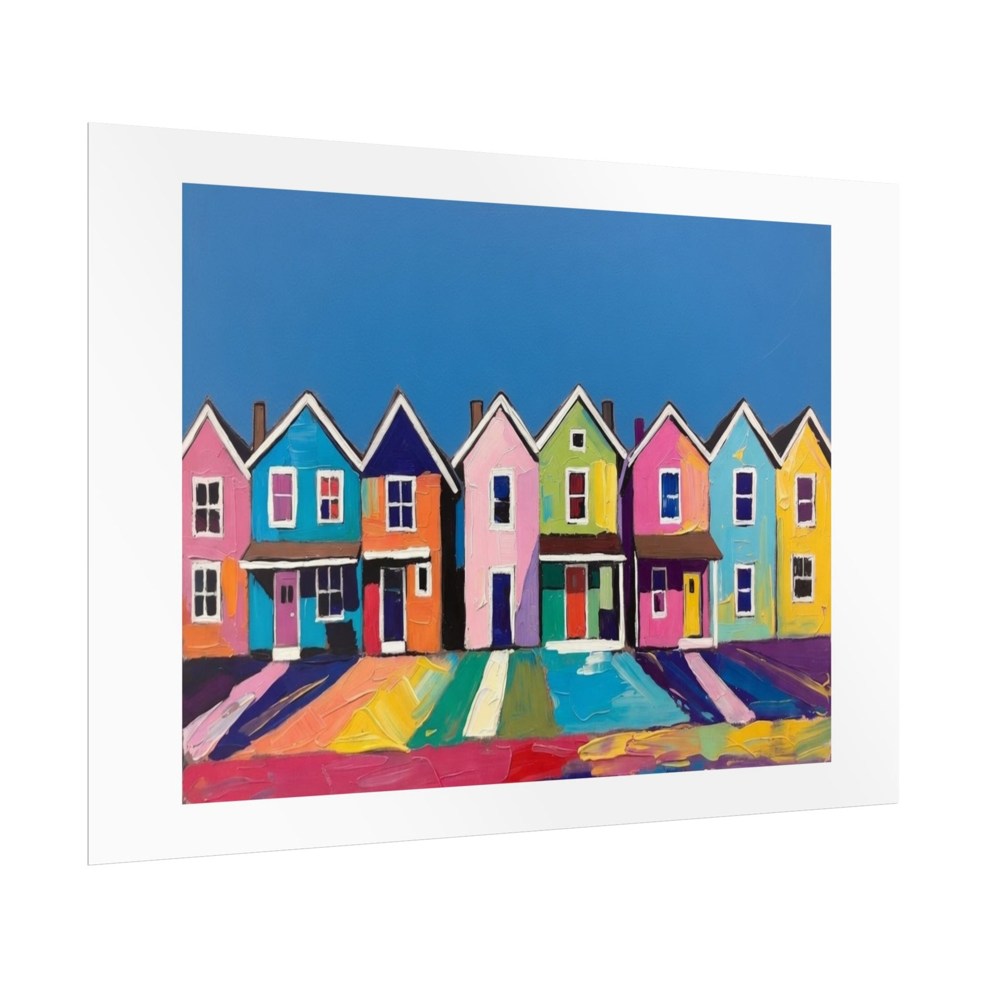 Imagine this print leaning on a shelf in a sunlit studio, or clipped above a workspace where color sparks ideas. The row of playful, colorful houses reads like a small neighborhood captured in bold brushstrokes — familiar, warm, and a little whimsical. It complements eclectic, modern, and bohemian interiors and pairs easily with natural wood frames or minimalist black frames.