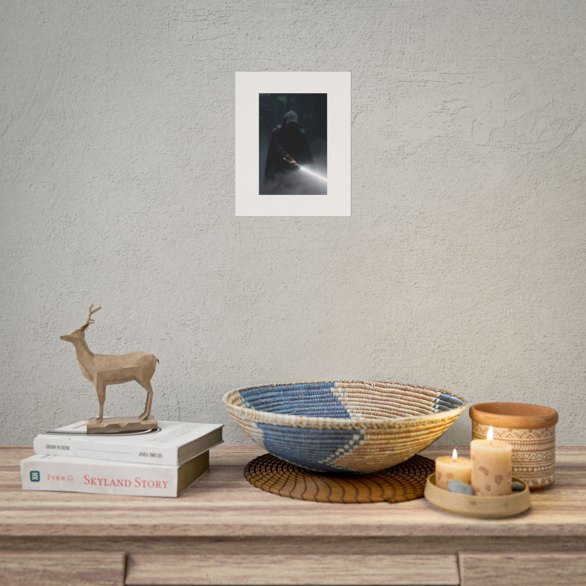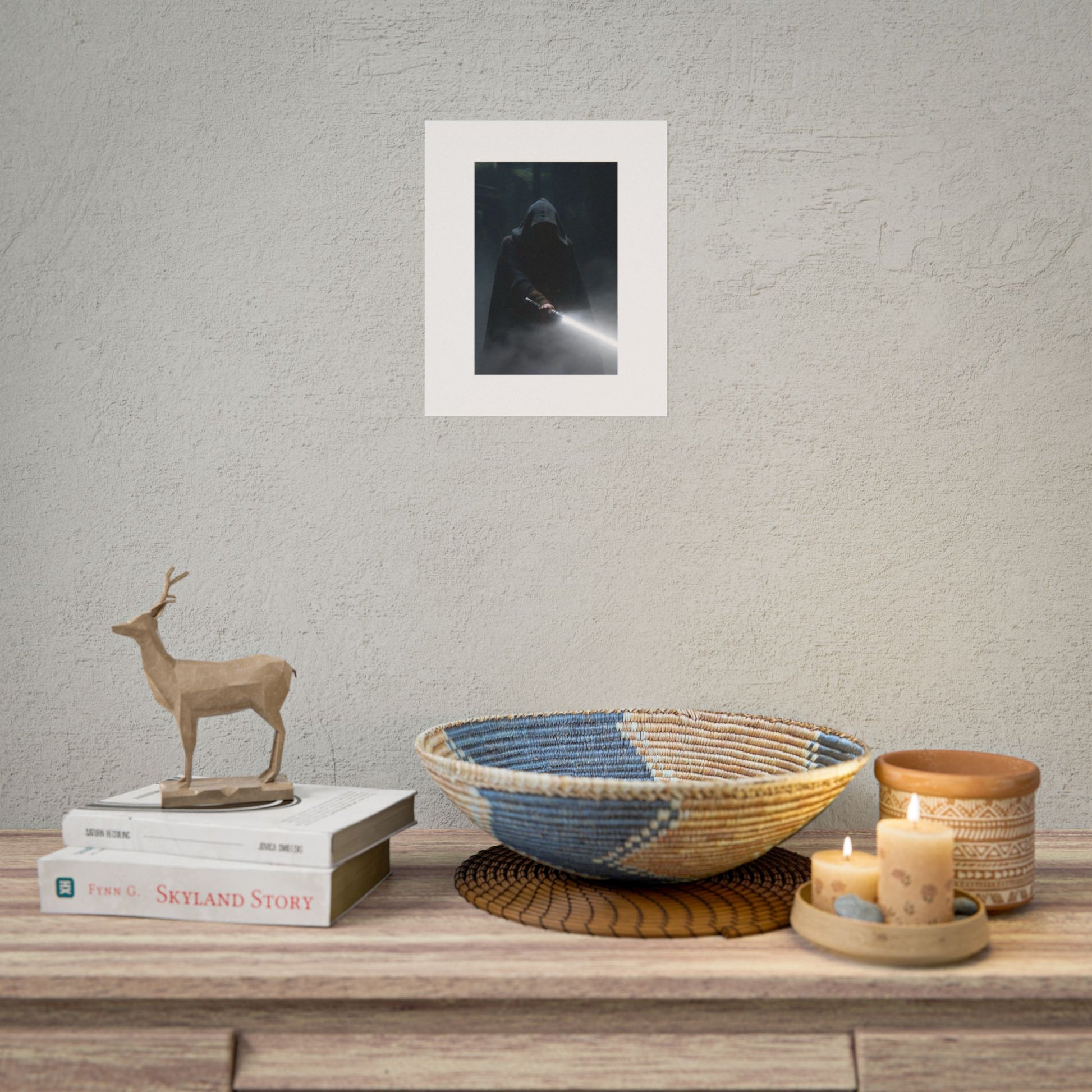 A moody, cinematic poster that brings shadowed mystery and a single blade of light into any room. Printed with rich giclée inks on your choice of fine art, semi-glossy, or matte paper, this piece keeps deep blacks and luminous highlights intact so that the hooded figure and glowing blade read with dramatic clarity from across the room. Hang it in a studio, den, or darkened media corner to build atmosphere—it’s the kind of art that invites quiet focus, late-night stories, and the slow, deliberate rearranging of a personal altar to fandom and mood.