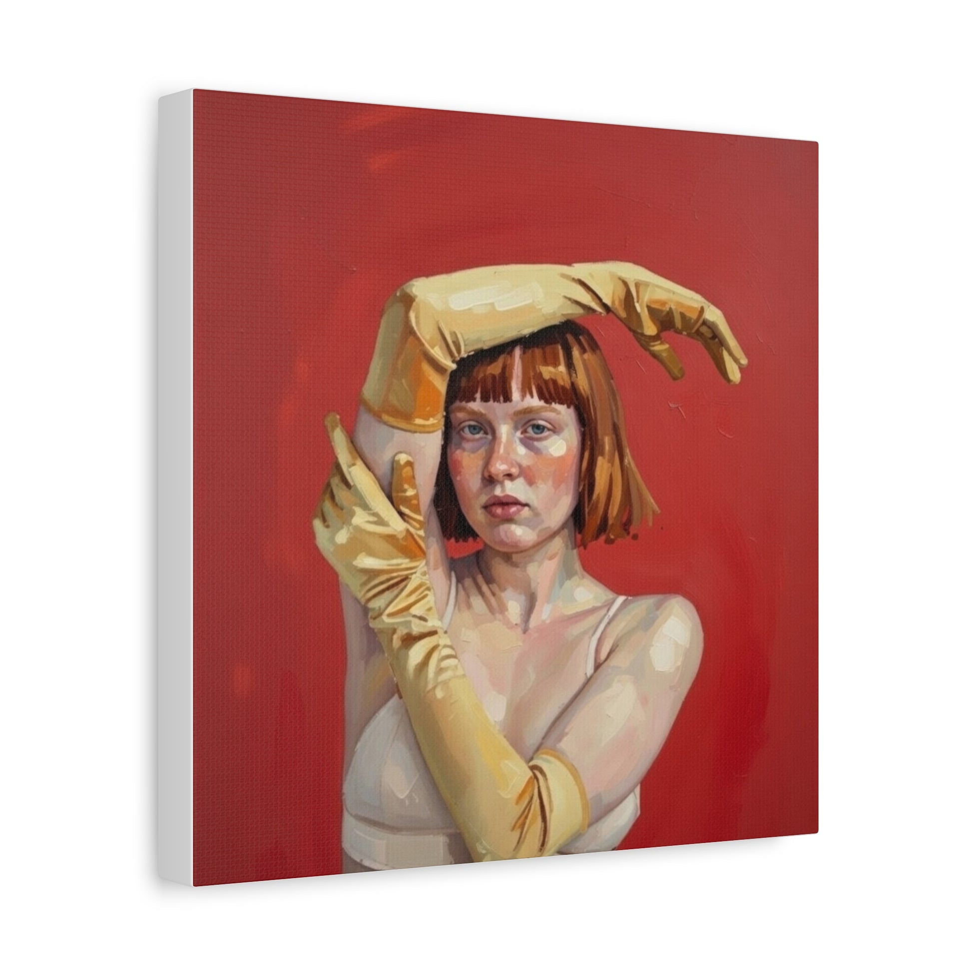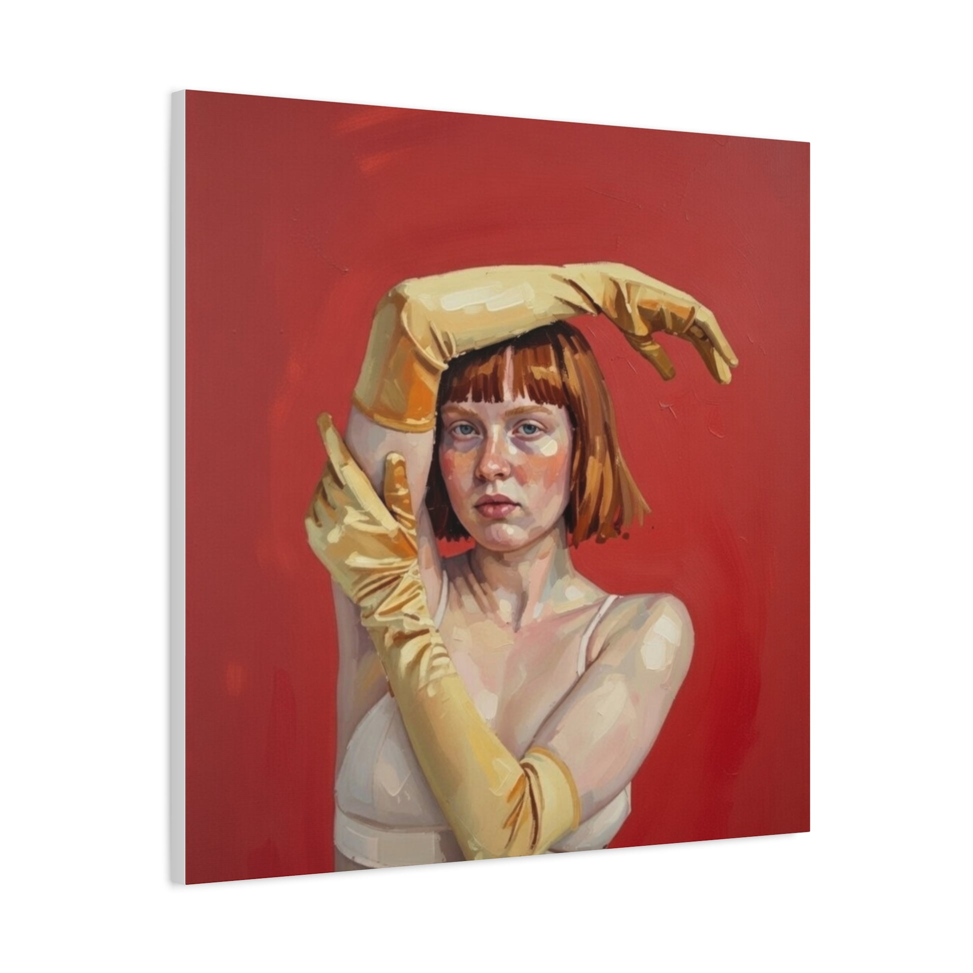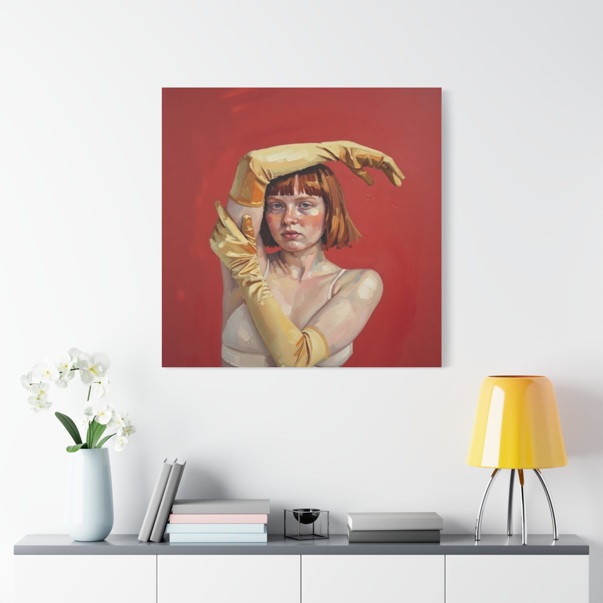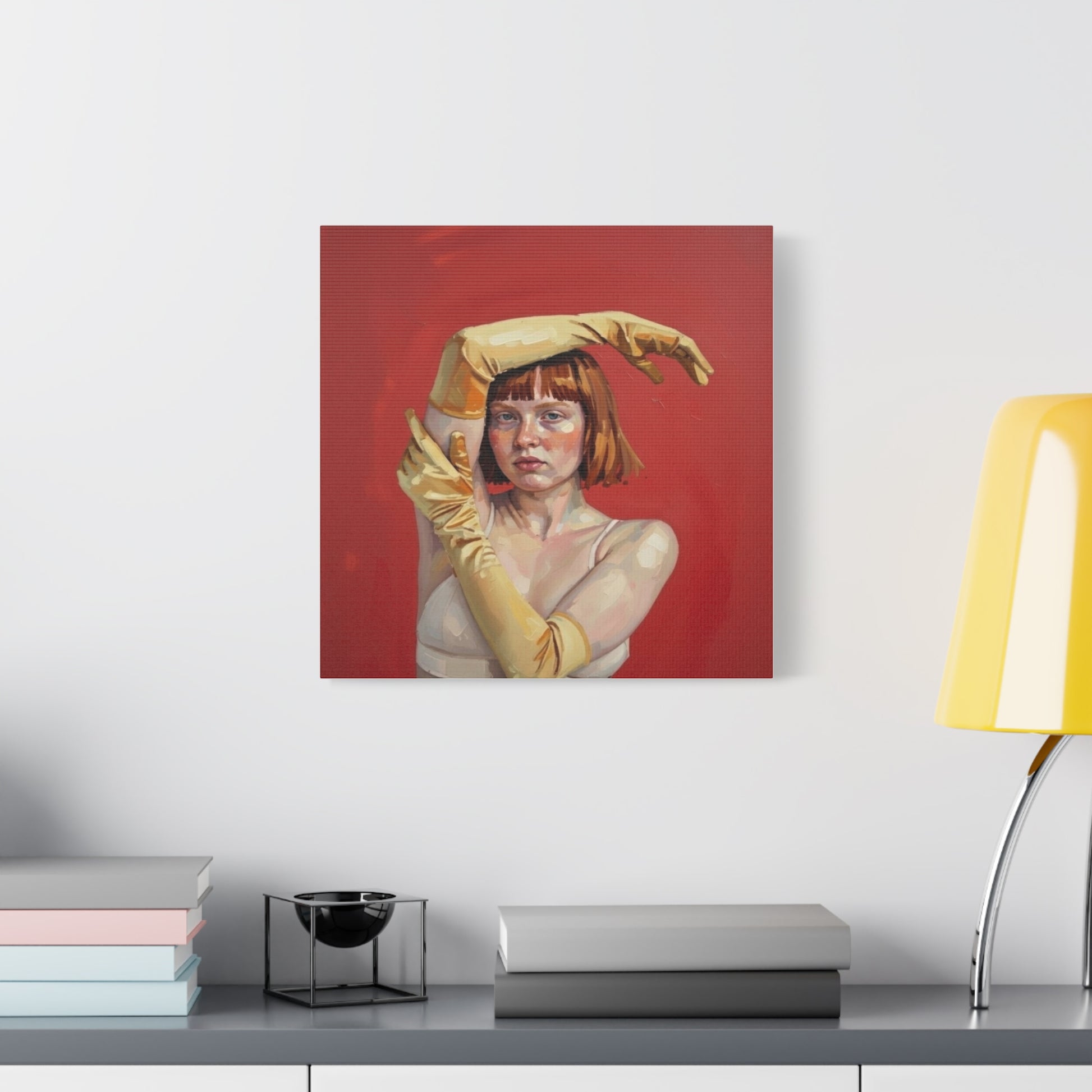 Figurative Portrait Canvas — Woman with Yellow Gloves on Red Background