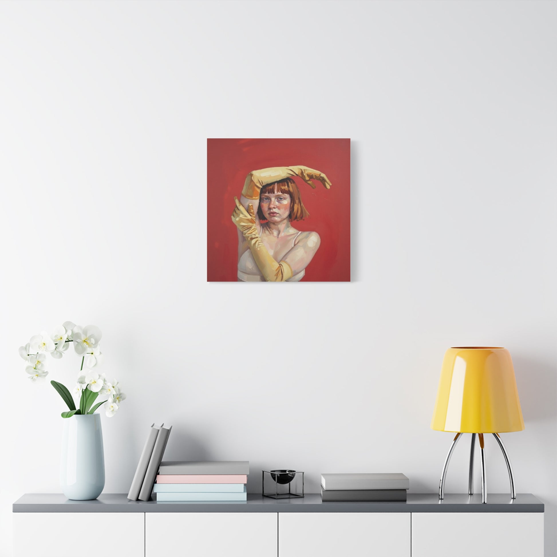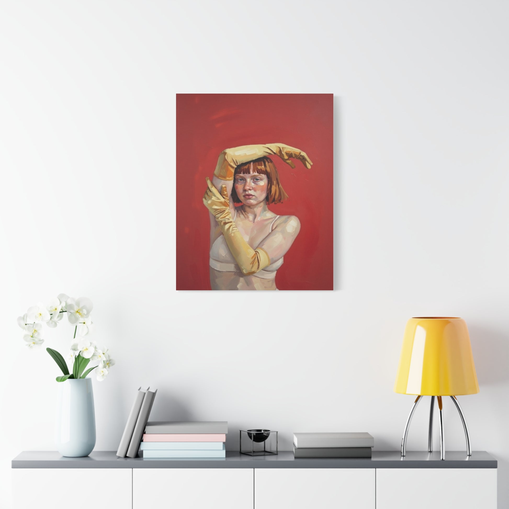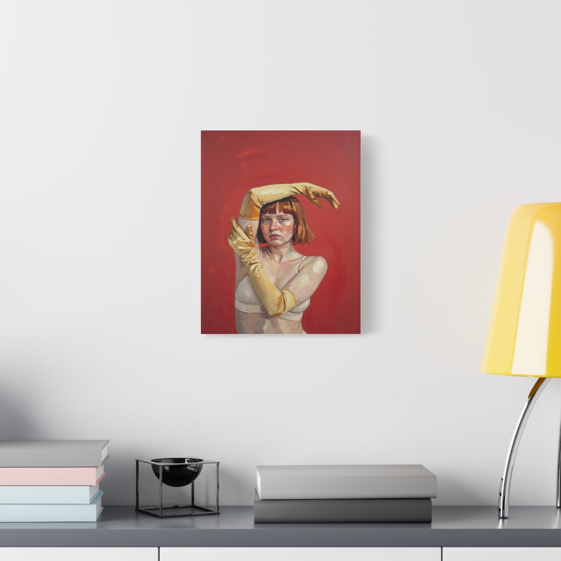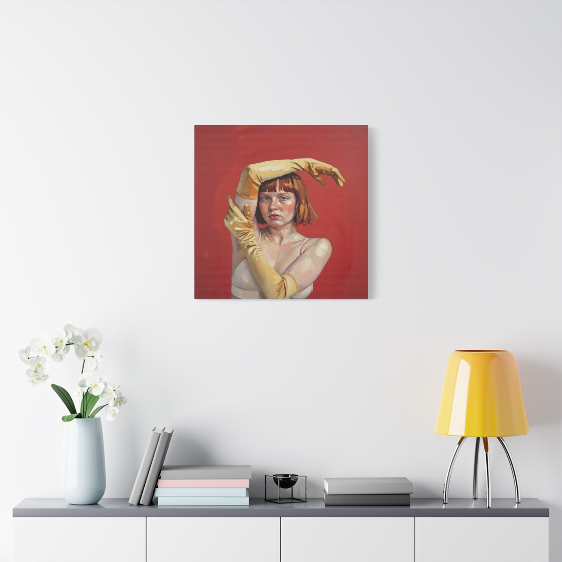 Figurative Portrait Canvas — Woman with Yellow Gloves on Red Background