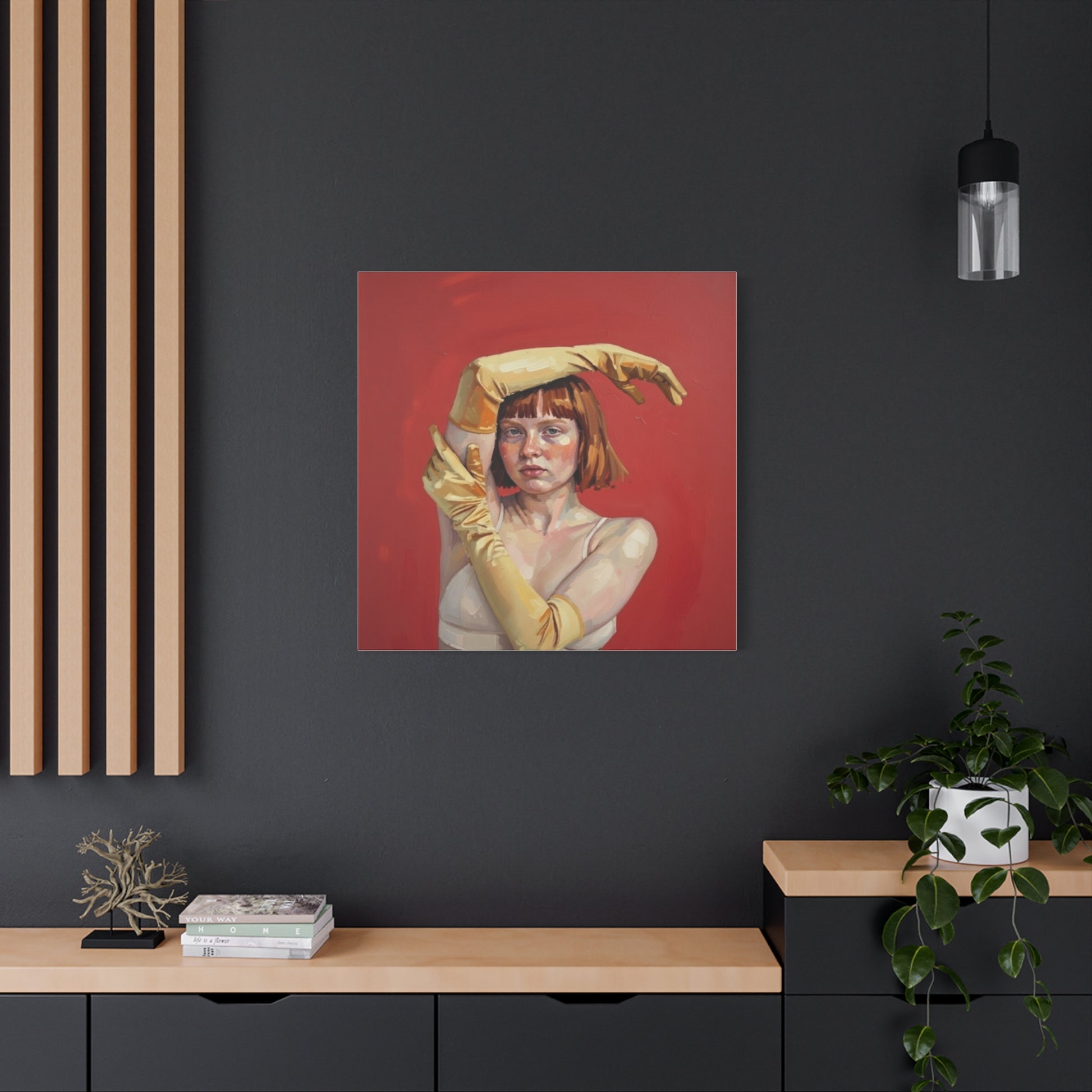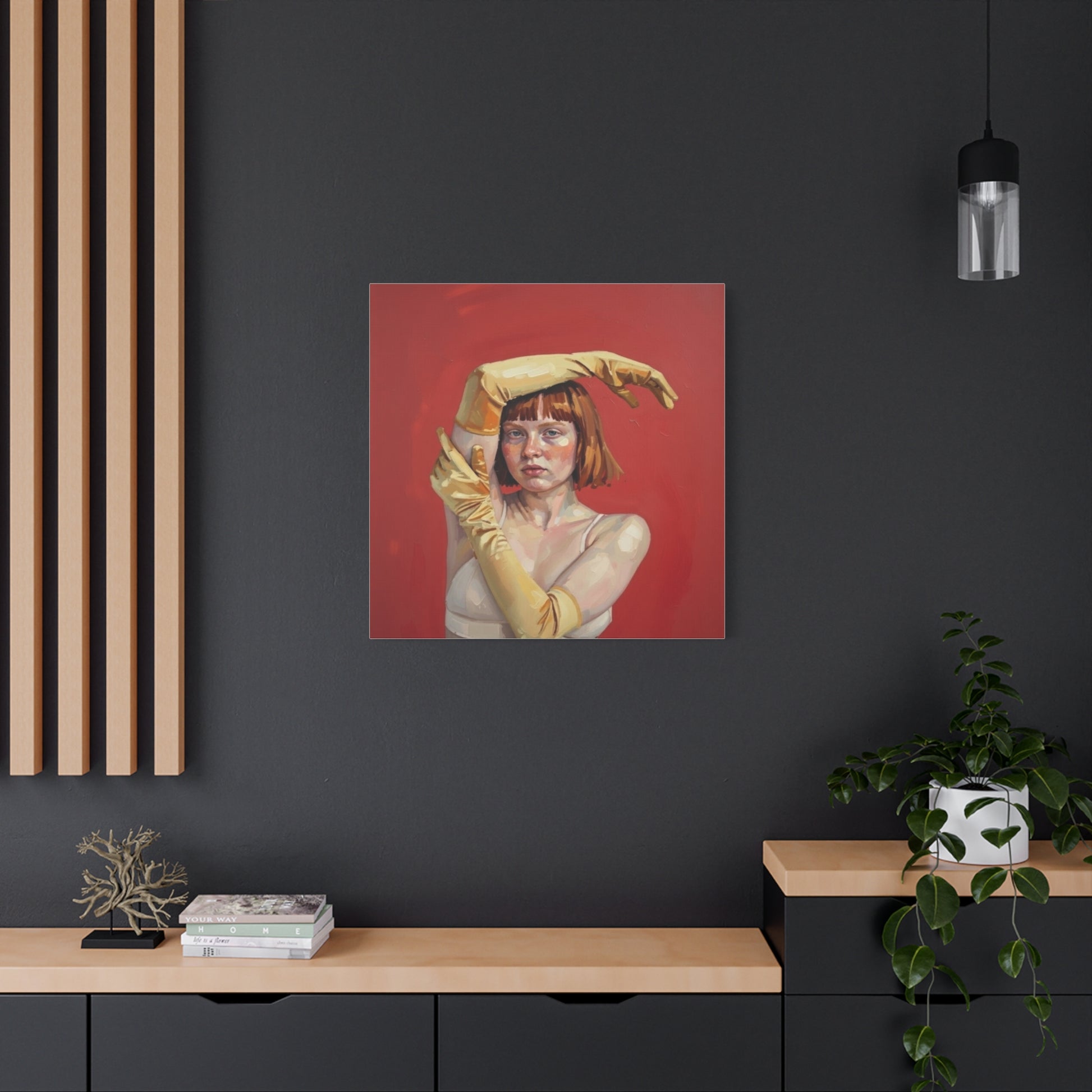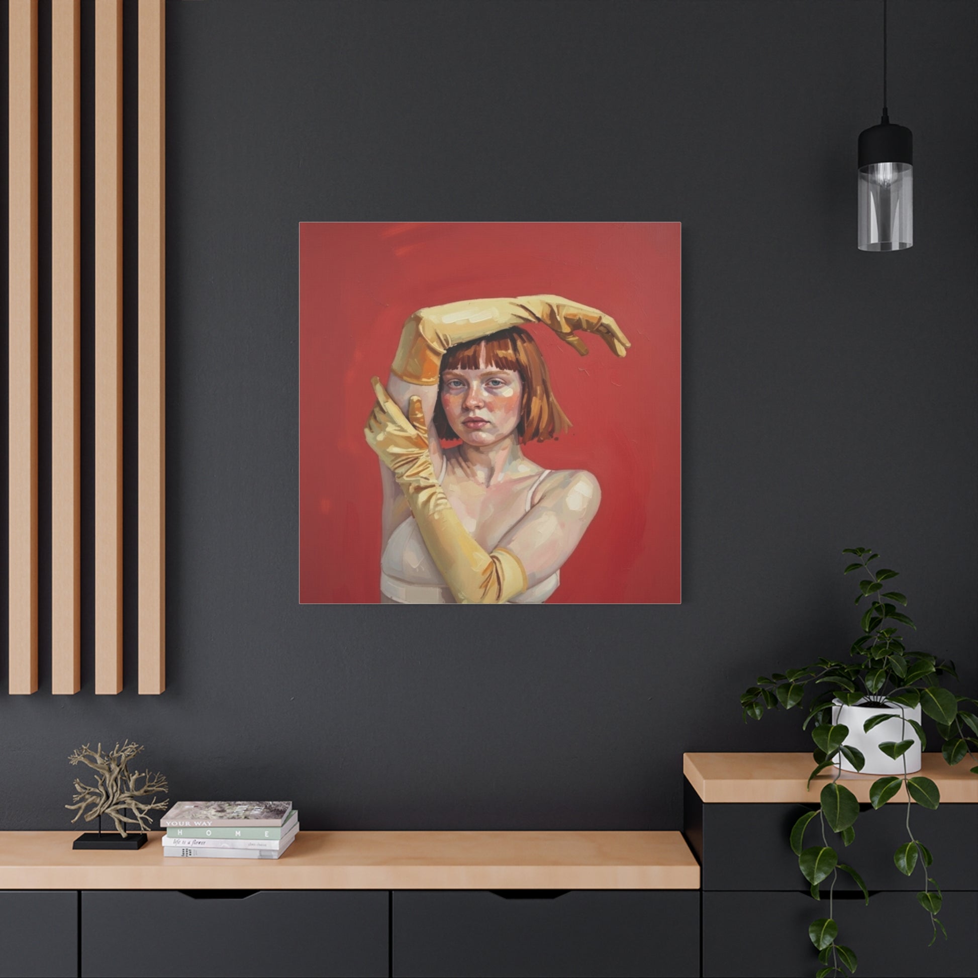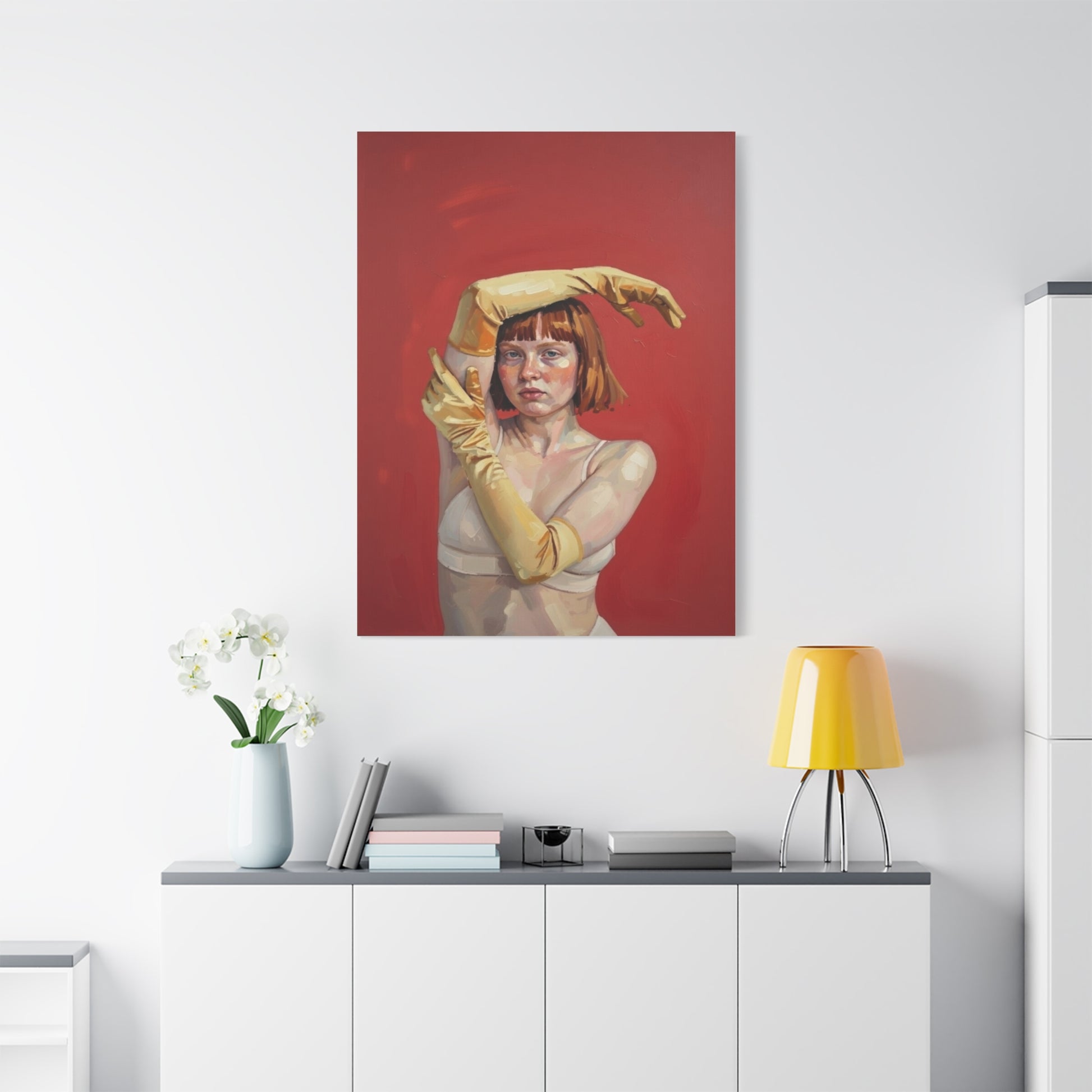 Figurative Portrait Canvas — Woman with Yellow Gloves on Red Background