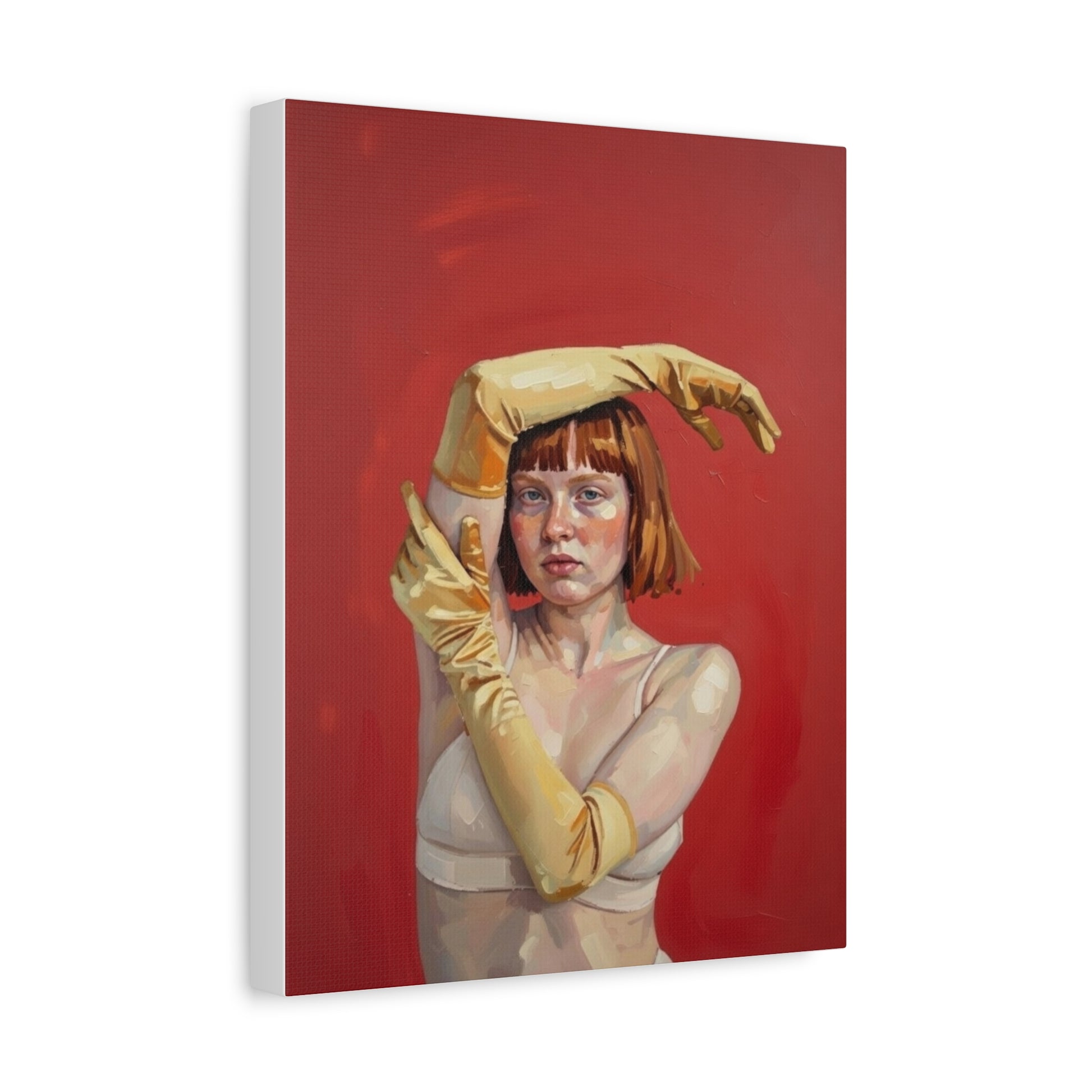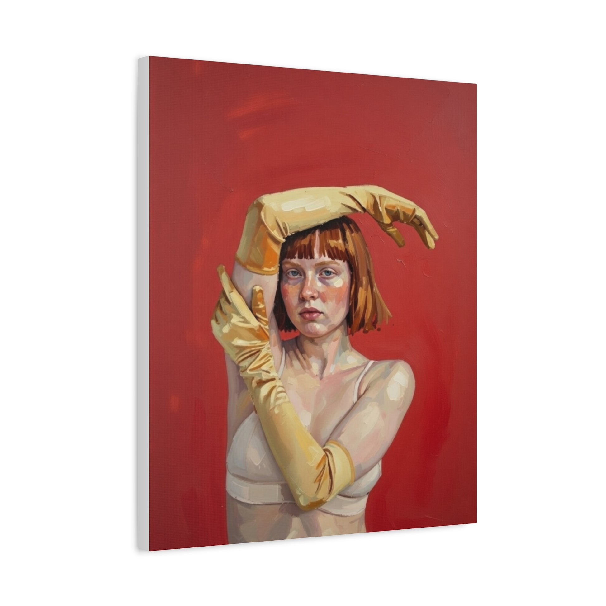 This stretched matte canvas brings contemporary portraiture into a warm, tactile presence. The rich crimson background and painterly brushwork make the subject — a poised figure in soft gloves and muted tones — feel immediate and quietly charged. Mounted on a slim 1.25" pine frame, the image wraps the edges for a floating, gallery-ready look. It settles into bedrooms, studio walls, or living rooms where thoughtful, slightly surreal art holds conversation. The finish is low-reflective, so the tones remain deep and true under natural light, and the lightweight build makes it effortless to hang and reposition as your space evolves.