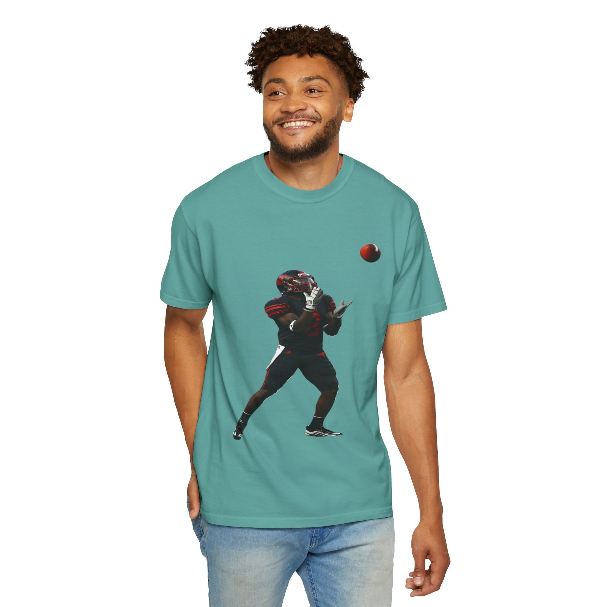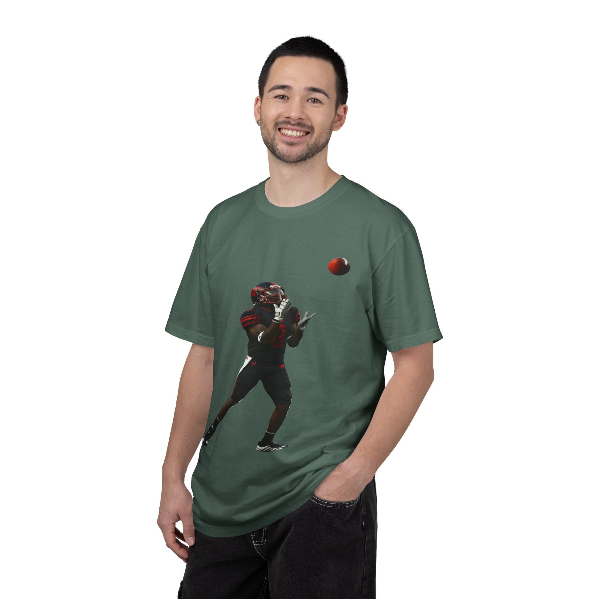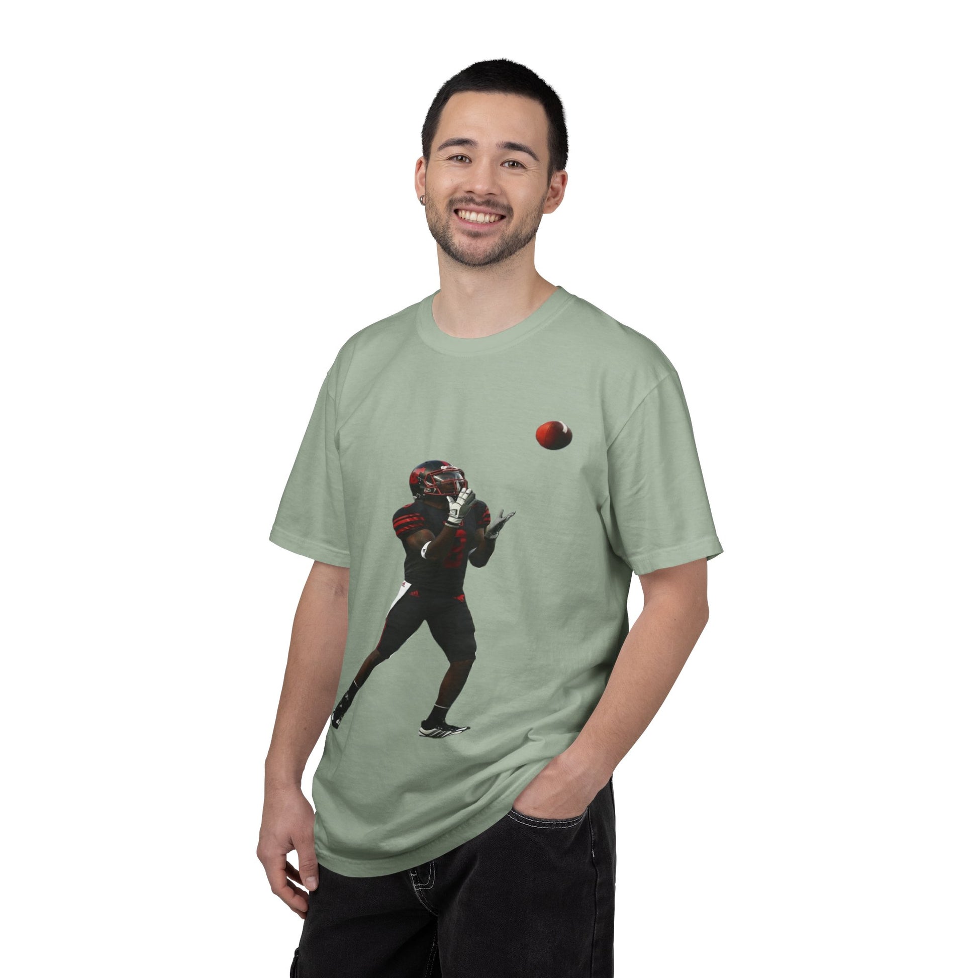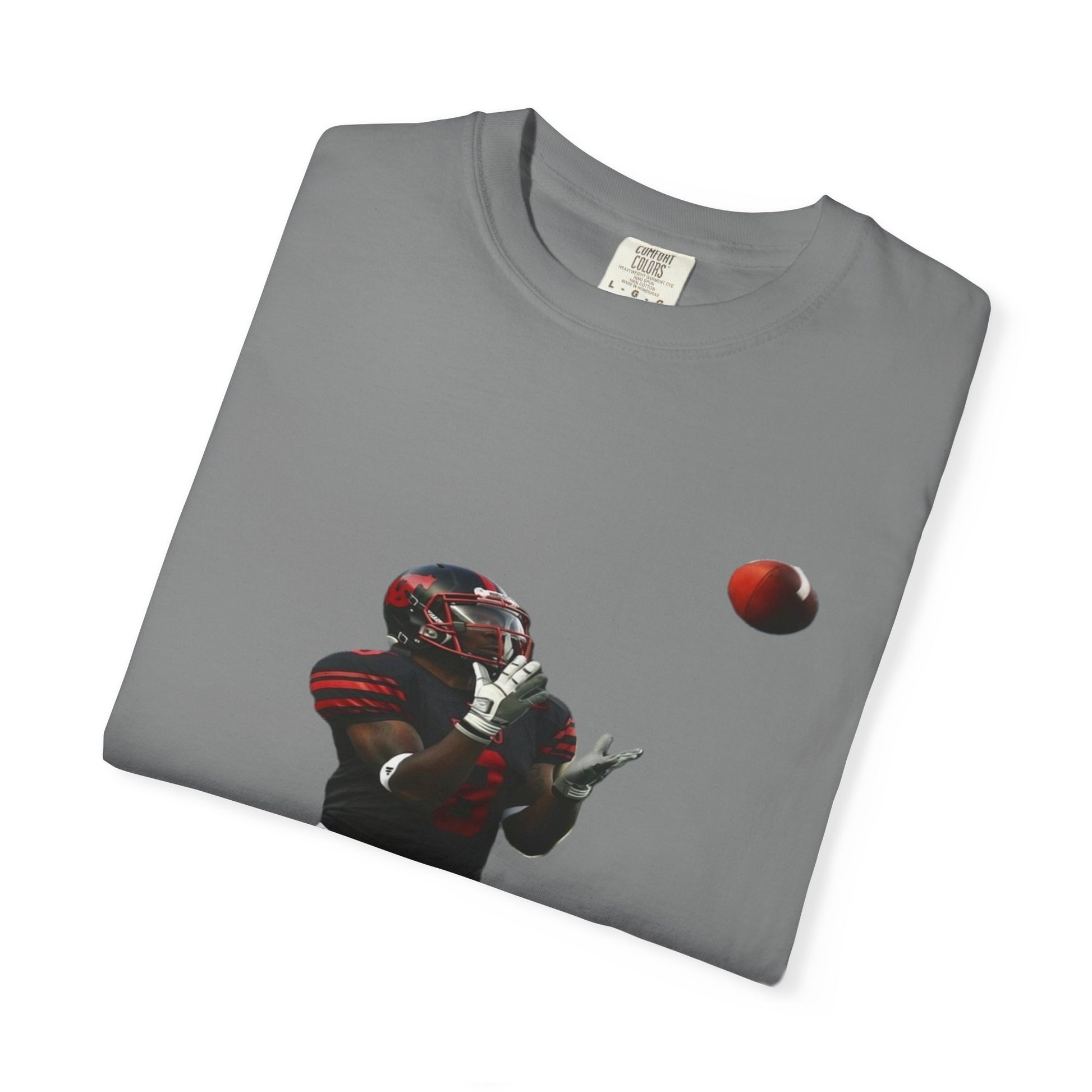 This heavyweight garment-dyed tee brings the turf to everyday life. The soft, broken-in hand of the fabric and relaxed fit make it feel lived-in from the first wear. A bold, action-ready football silhouette sits on the chest — a snapshot of focus, motion, and the split-second between catch and celebration. Wear it to practices, tailgates, or weekend hangs; it layers easily under a hoodie or pairs with jeans for a simple, athletic look. Built to last with double-needle seams and pre-shrunk ring-spun cotton, the shirt ages with character and color, not with fading comfort.