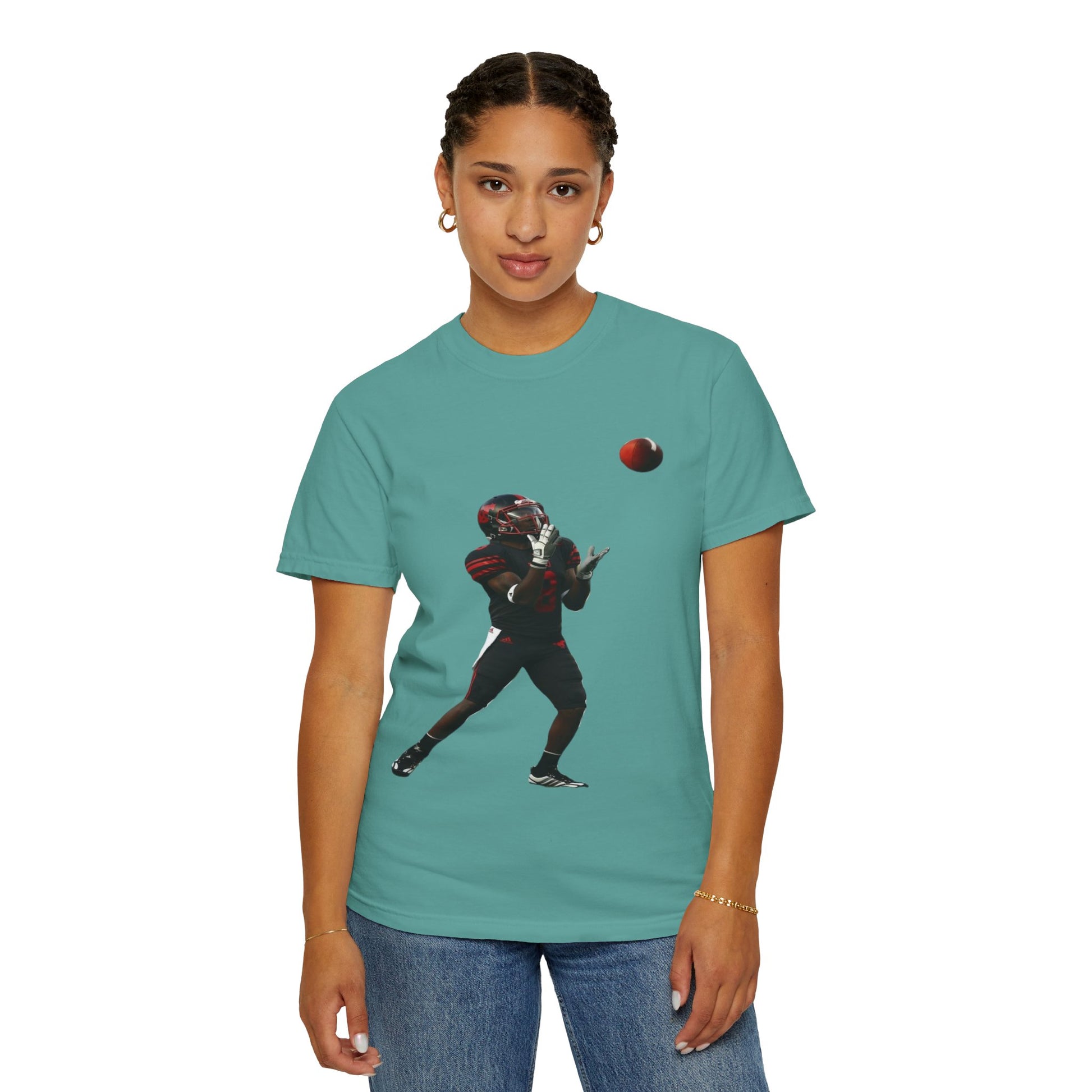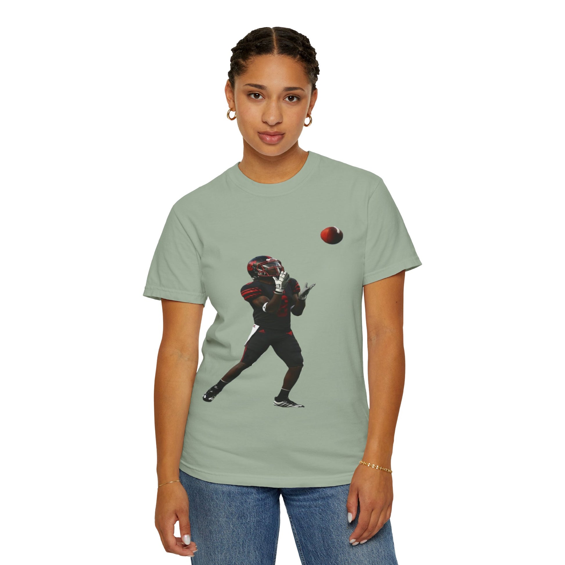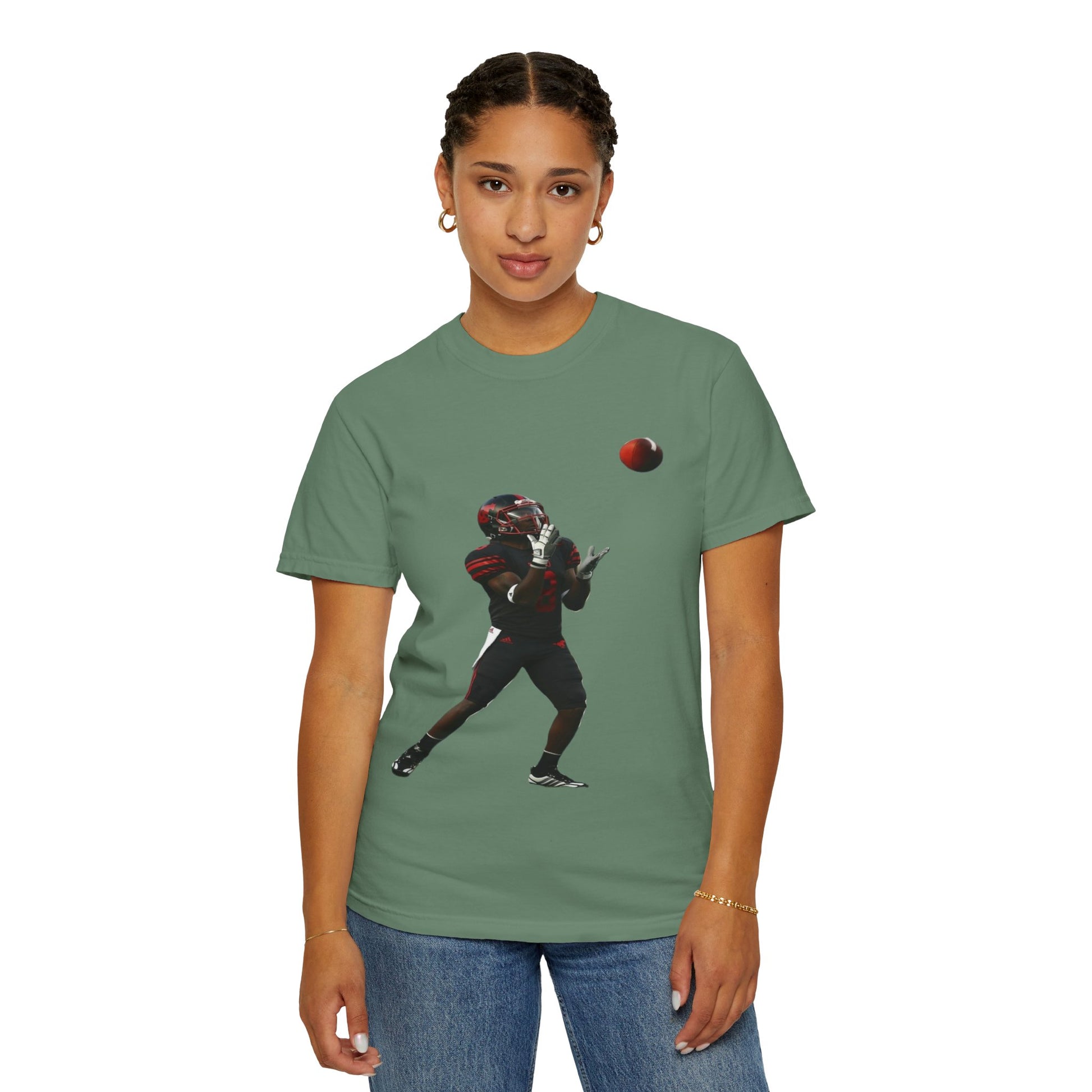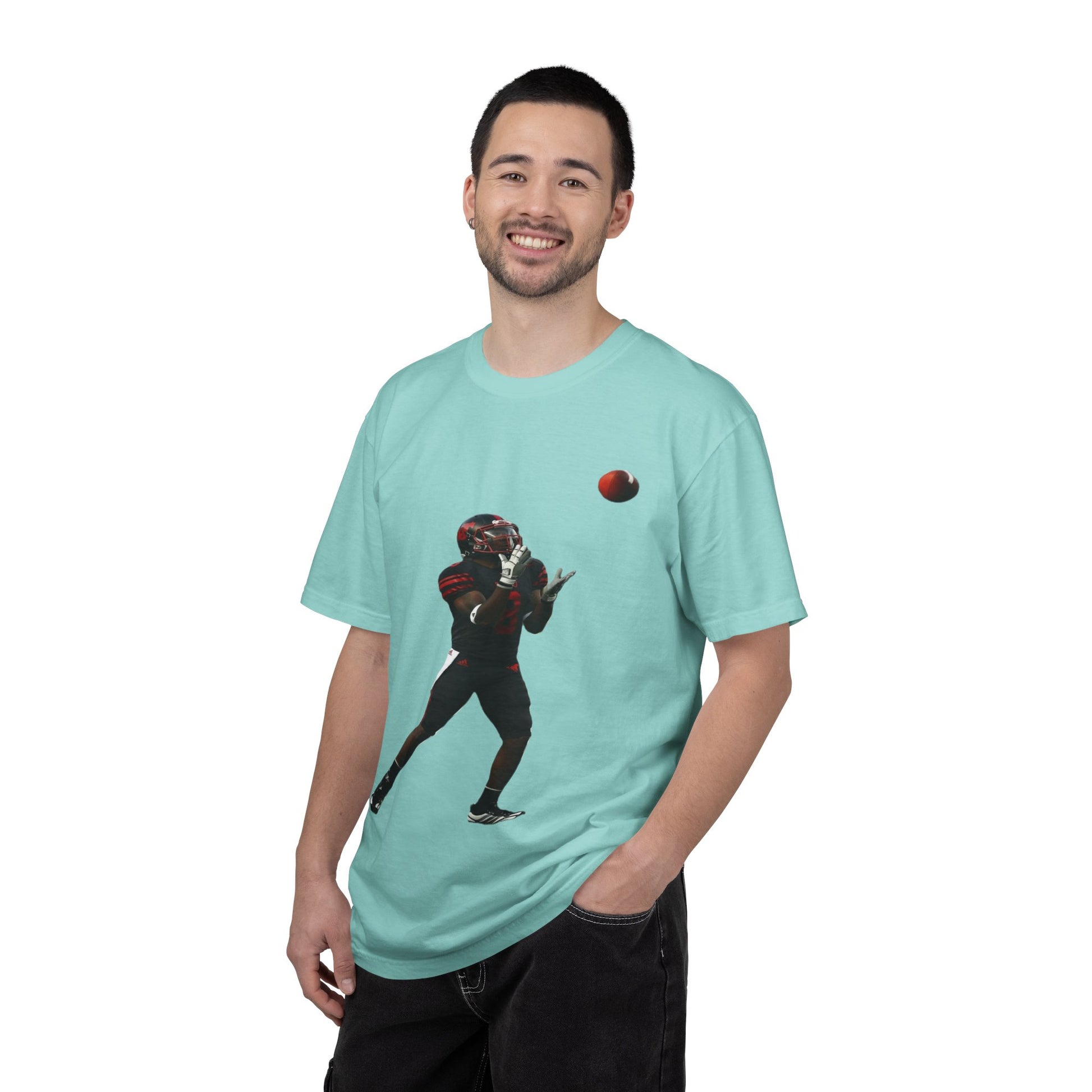 This heavyweight garment-dyed tee brings the turf to everyday life. The soft, broken-in hand of the fabric and relaxed fit make it feel lived-in from the first wear. A bold, action-ready football silhouette sits on the chest — a snapshot of focus, motion, and the split-second between catch and celebration. Wear it to practices, tailgates, or weekend hangs; it layers easily under a hoodie or pairs with jeans for a simple, athletic look. Built to last with double-needle seams and pre-shrunk ring-spun cotton, the shirt ages with character and color, not with fading comfort.