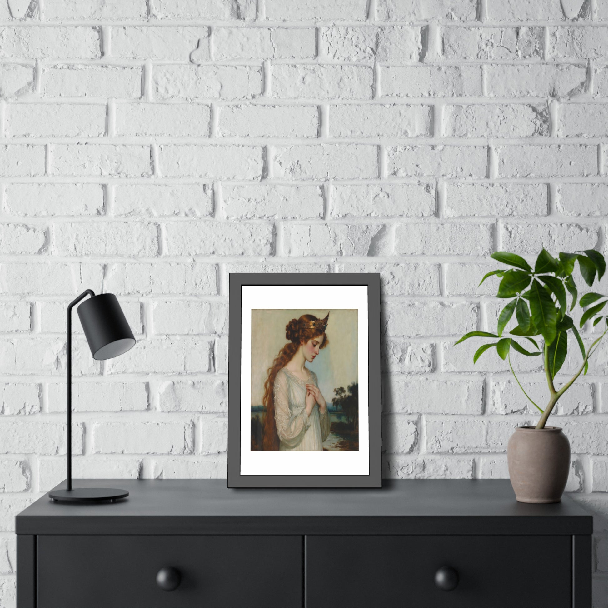 Soft light and quiet grace: this framed paper poster brings a touch of old-world reverence to modern walls. The matte black pine frame and brown paper backing form a calm, understated border that lets the portrait breathe. Choose fine art paper for a textured, painterly depth, or semi-gloss for brighter, crisp tones — both printed with vibrant color fidelity on thick archival stock. Arrives ready to hang with pre-installed hardware and rubber bumpers so it sits perfectly straight and gentle against the wall. Whether it joins a gallery wall, anchors a reading nook, or rests above a mantel, this framed print creates a peaceful, contemplative corner in the home.