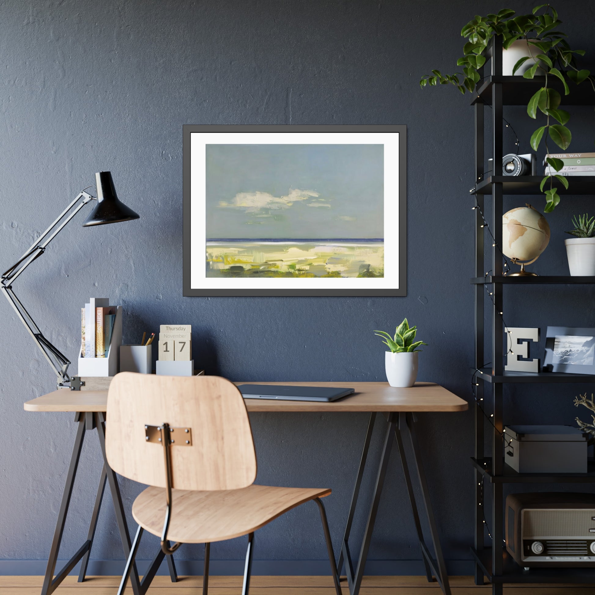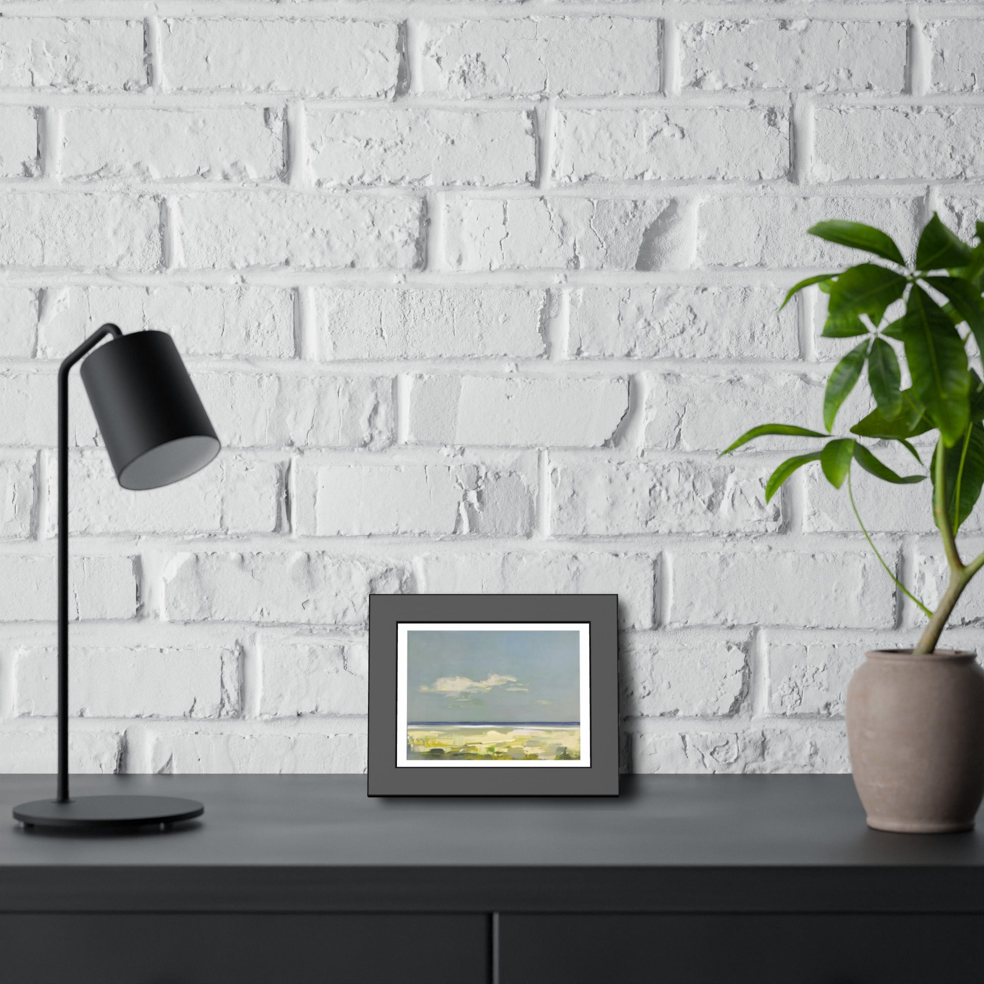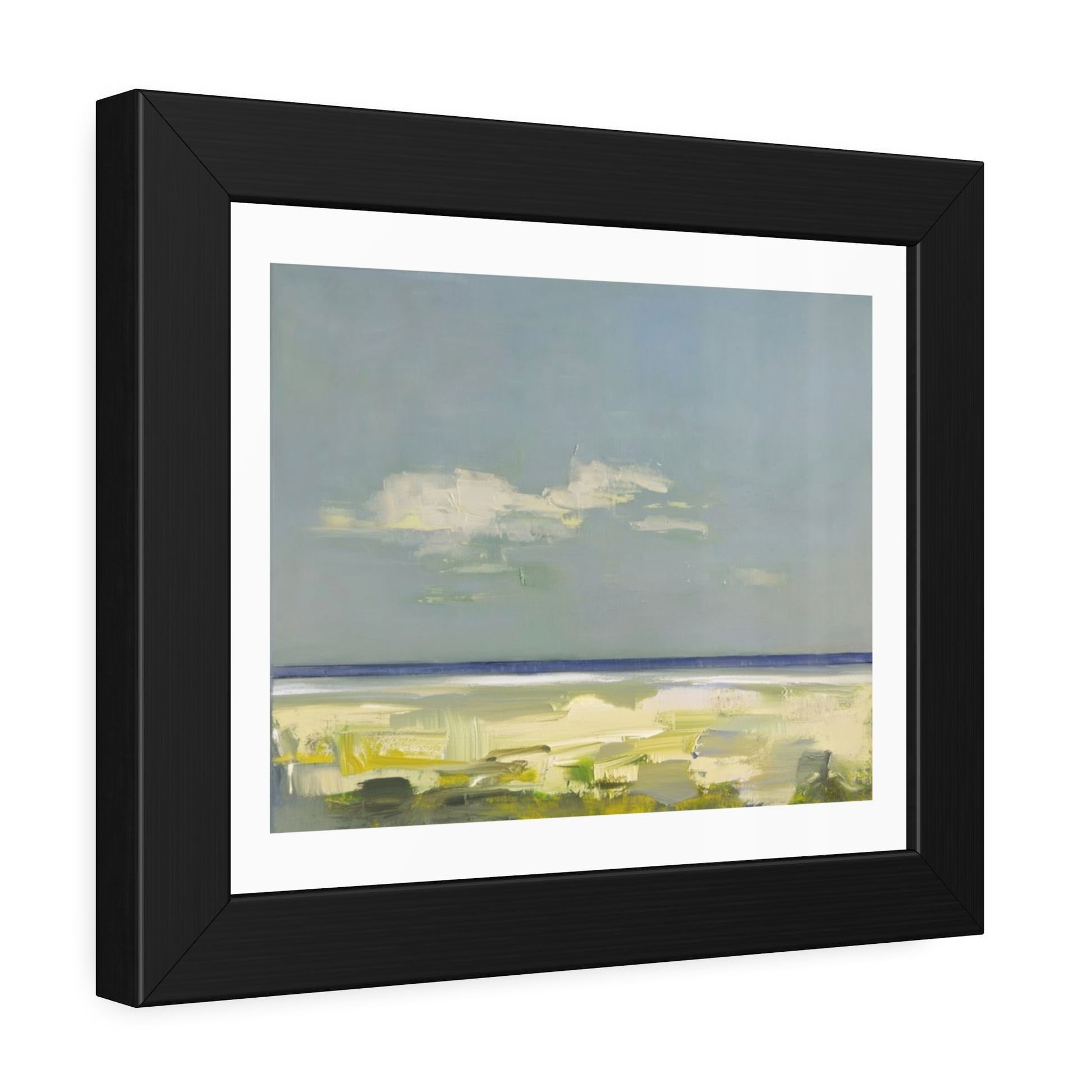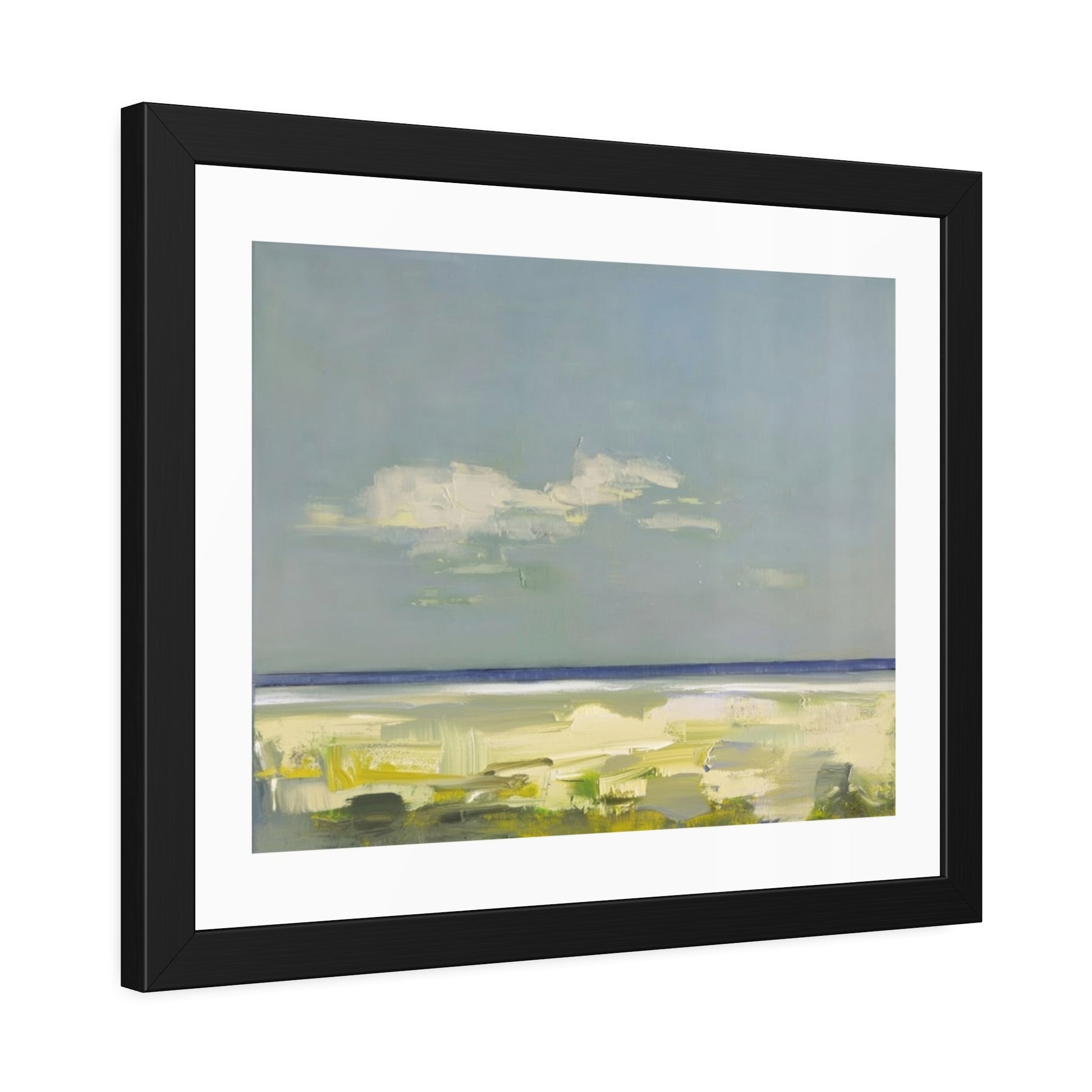 Soft, muted seascape tones meet a clean, modern frame. This framed paper poster brings a quiet shoreline into your room — pale blues and sandy greens suggest an easy, wind-worn afternoon by the water. The matte black pine frame gives the artwork a grounded, gallery-ready presence while the white border around the print keeps the composition airy and calm. It hangs straight from pre-installed hardware and arrives ready to display, protected behind shatter-proof plexiglass.