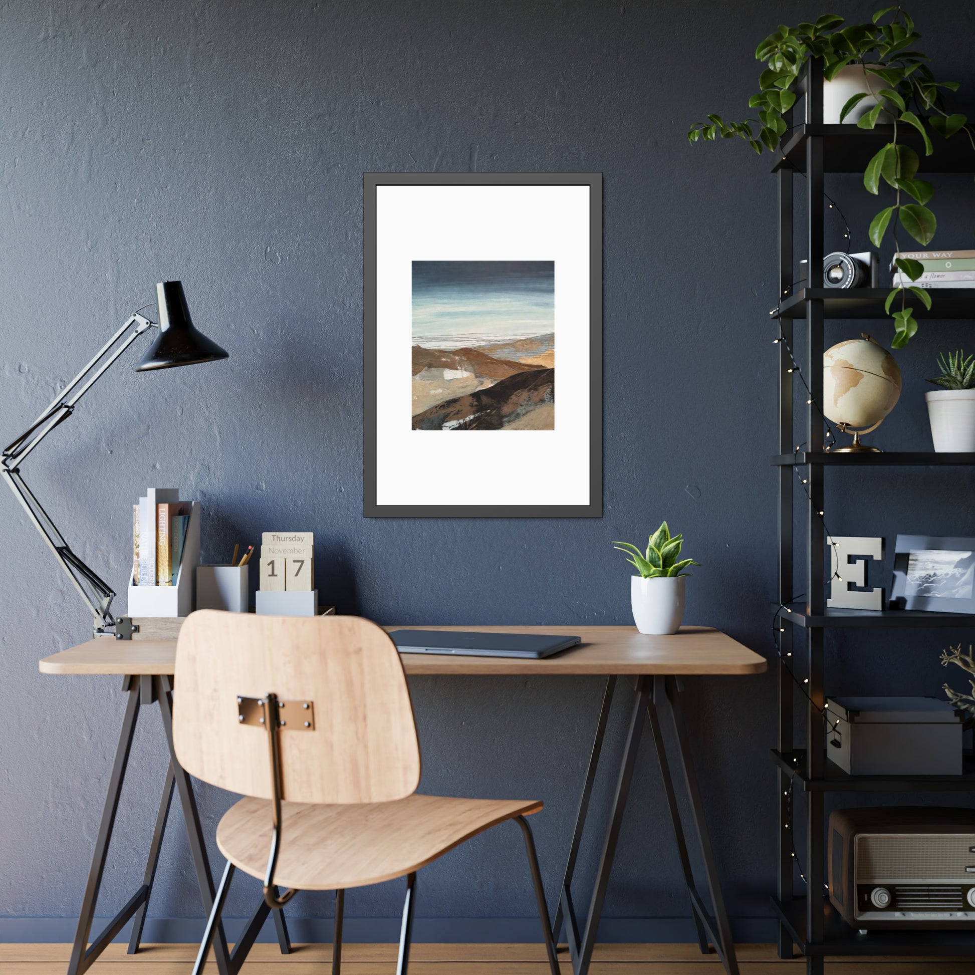 A framed paper poster that brings quiet landscape moments into any room. Printed with vivid, archival inks on your choice of textured fine art paper or bright semi-gloss photo paper, the artwork sits behind shatter-proof plexiglass in a matte black pinewood frame. The warm brown paper backing and pre-installed hanging hardware make it ready to display straight from the box. It’s the kind of piece that softens a living room, anchors a hallway vignette, or layers into a cozy reading nook — subtle, grounded, and made to age beautifully alongside your home.