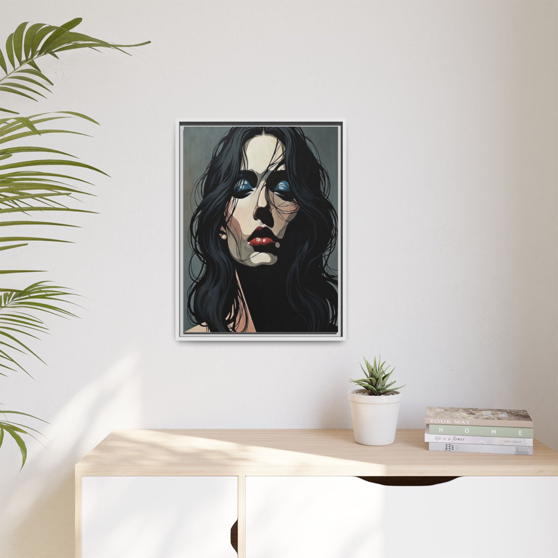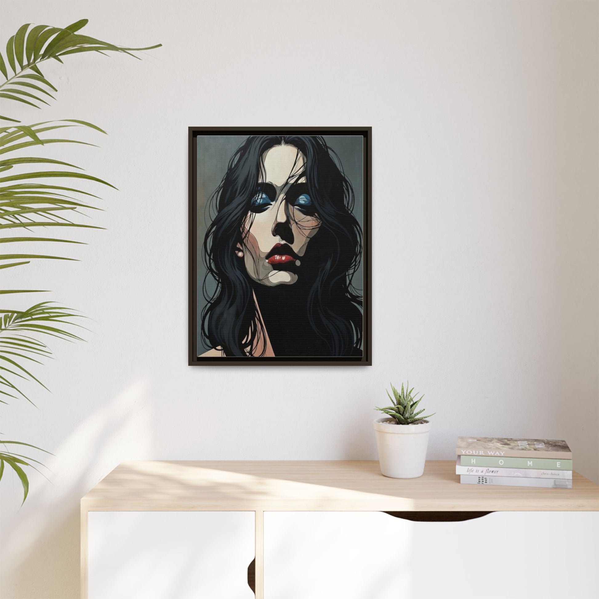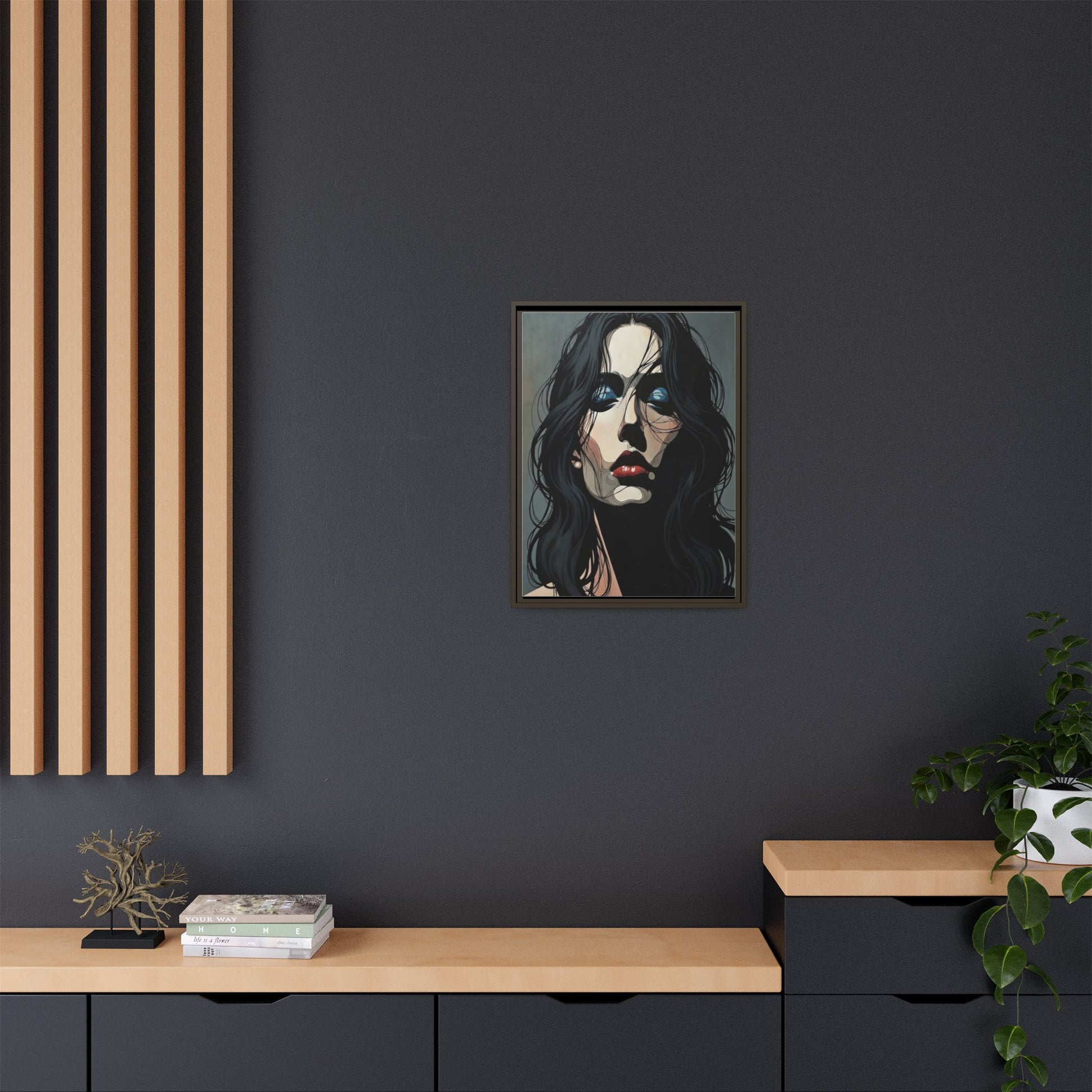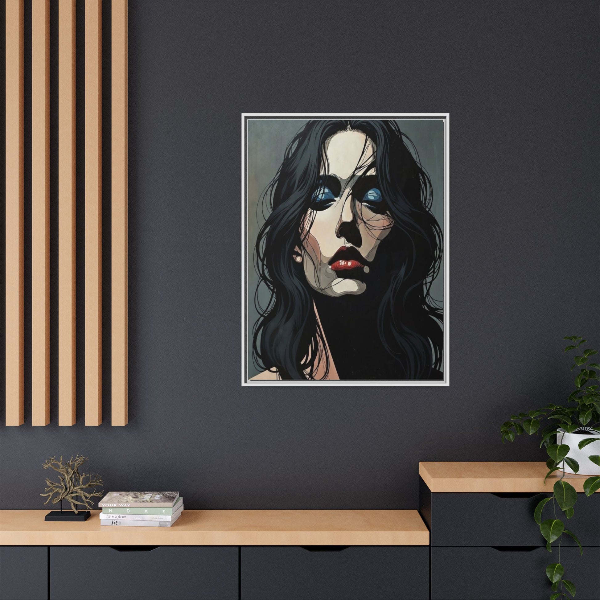 A framed matte canvas print that brings modern portraiture into any room with quiet intensity. Deep shadows and jewel-toned highlights hold the eye, while the textured matte surface softens glare and gives the image a gallery-quality presence. The slim pine frame and subtle float mount create a breathing space around the artwork, letting the face feel like it’s emerging from the wall rather than sitting flat against it. Hang it in a living room, studio, or hallway to anchor a moody, contemporary interior or to punctuate a curated wall grouping.