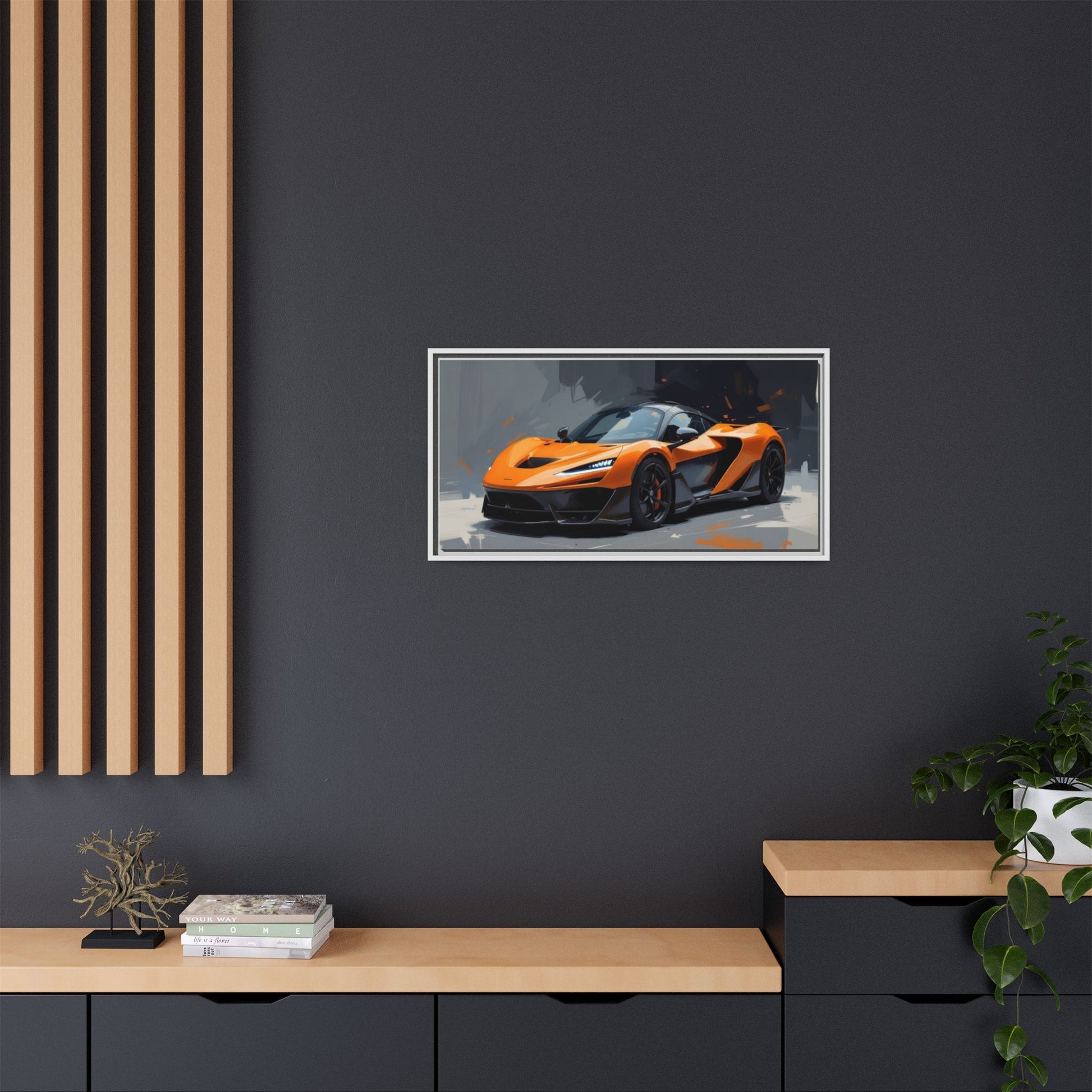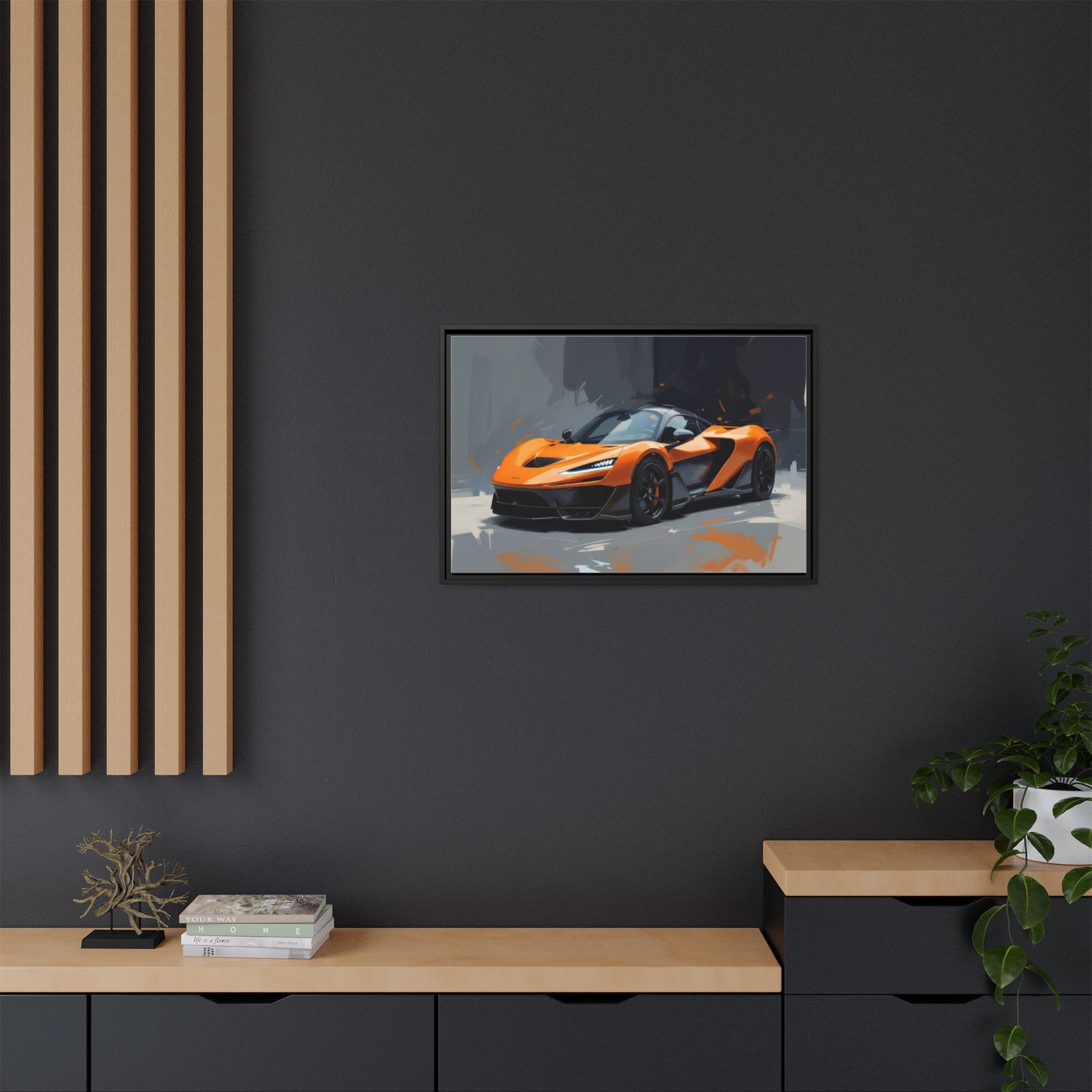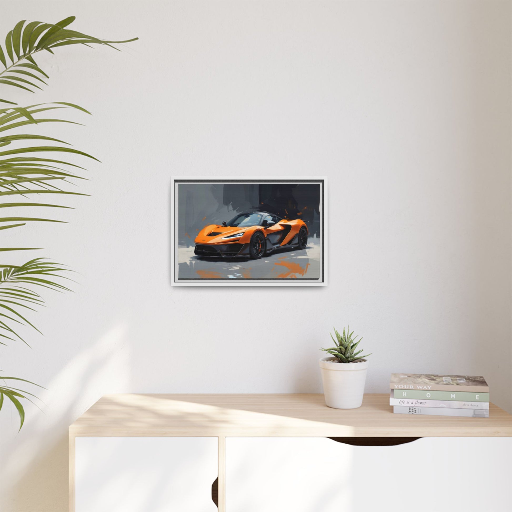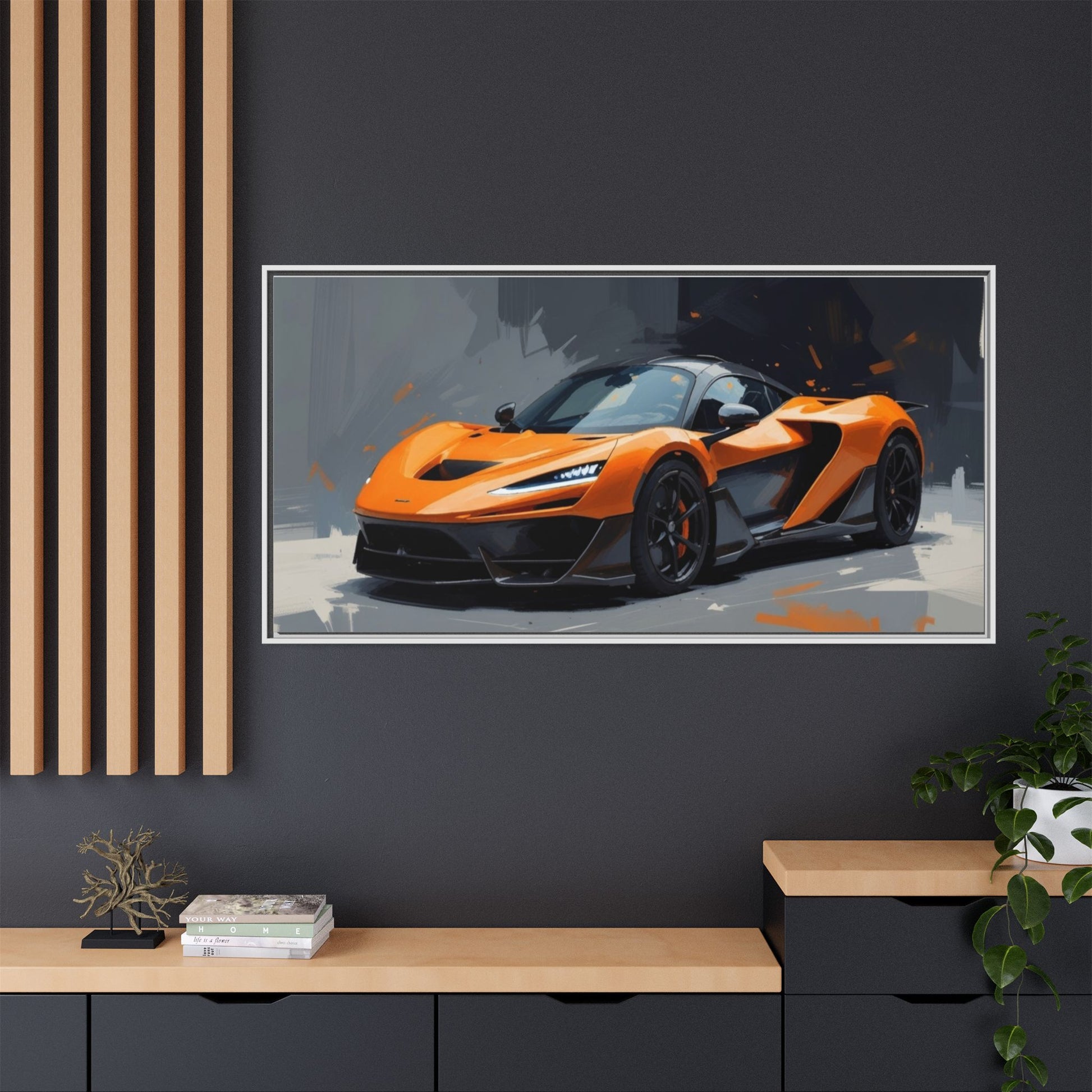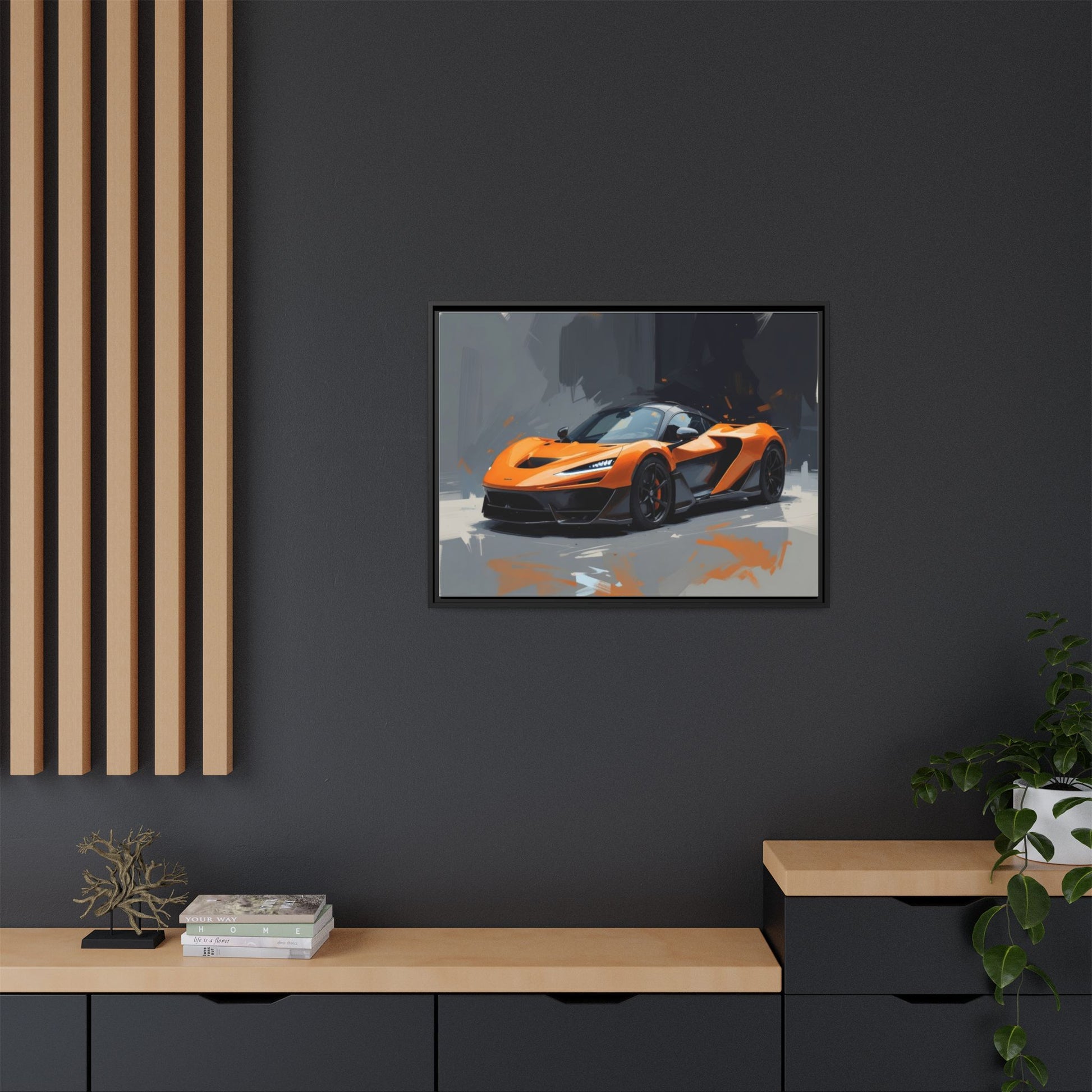A matte canvas print with a slim black frame that captures the raw energy of a bright orange supercar. Brushstroke-style rendering and high-contrast highlights give the image motion and attitude, while the muted background keeps focus on the car’s sculpted lines. Hung in a studio, man-cave, or office, this framed canvas brings speed and modern design into a room without shouting—it’s a discreet statement piece that reads as both art and automotive obsession.