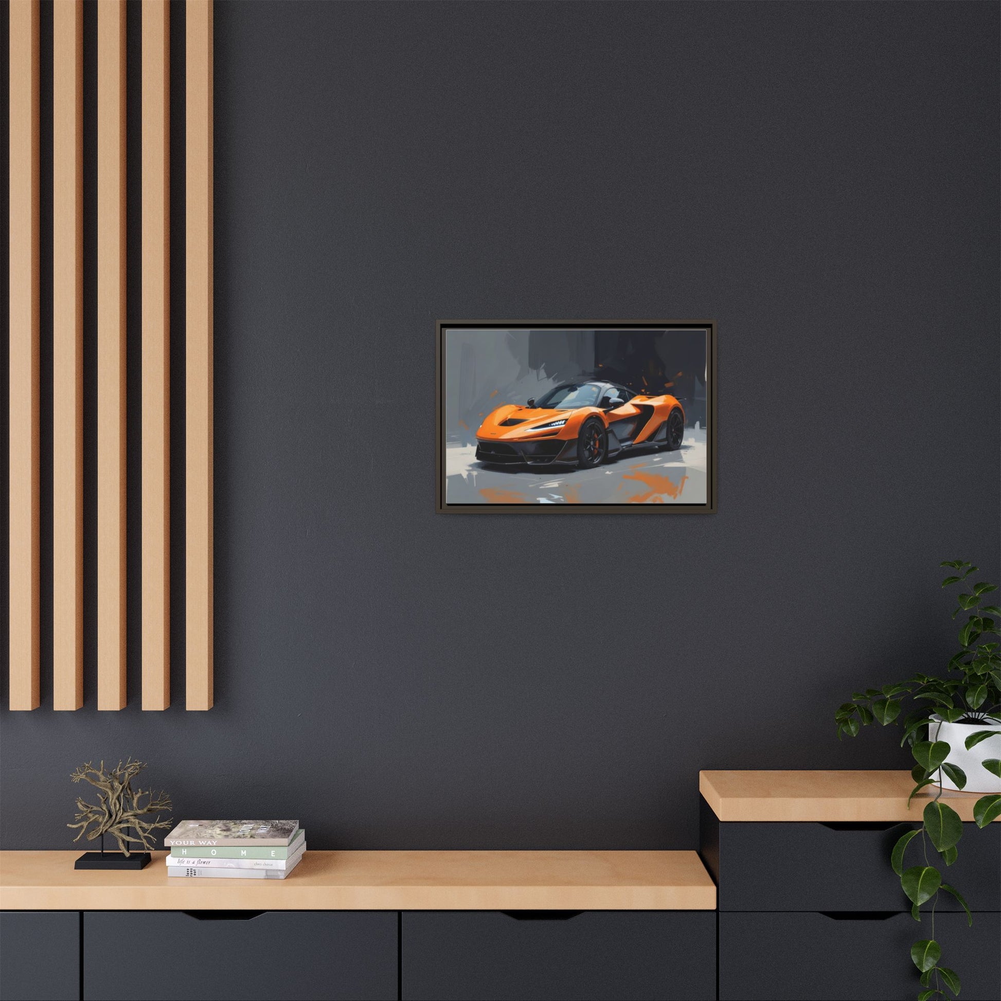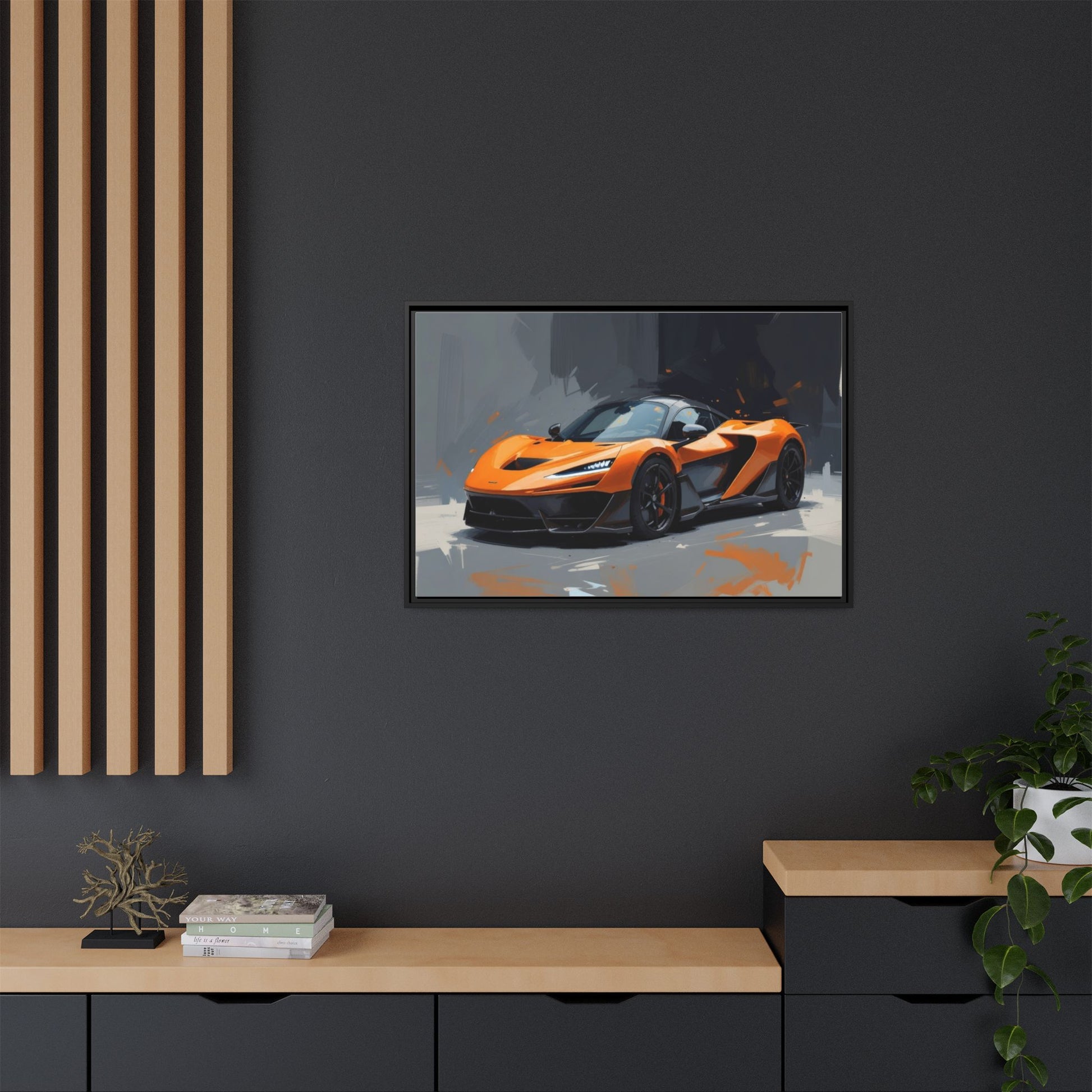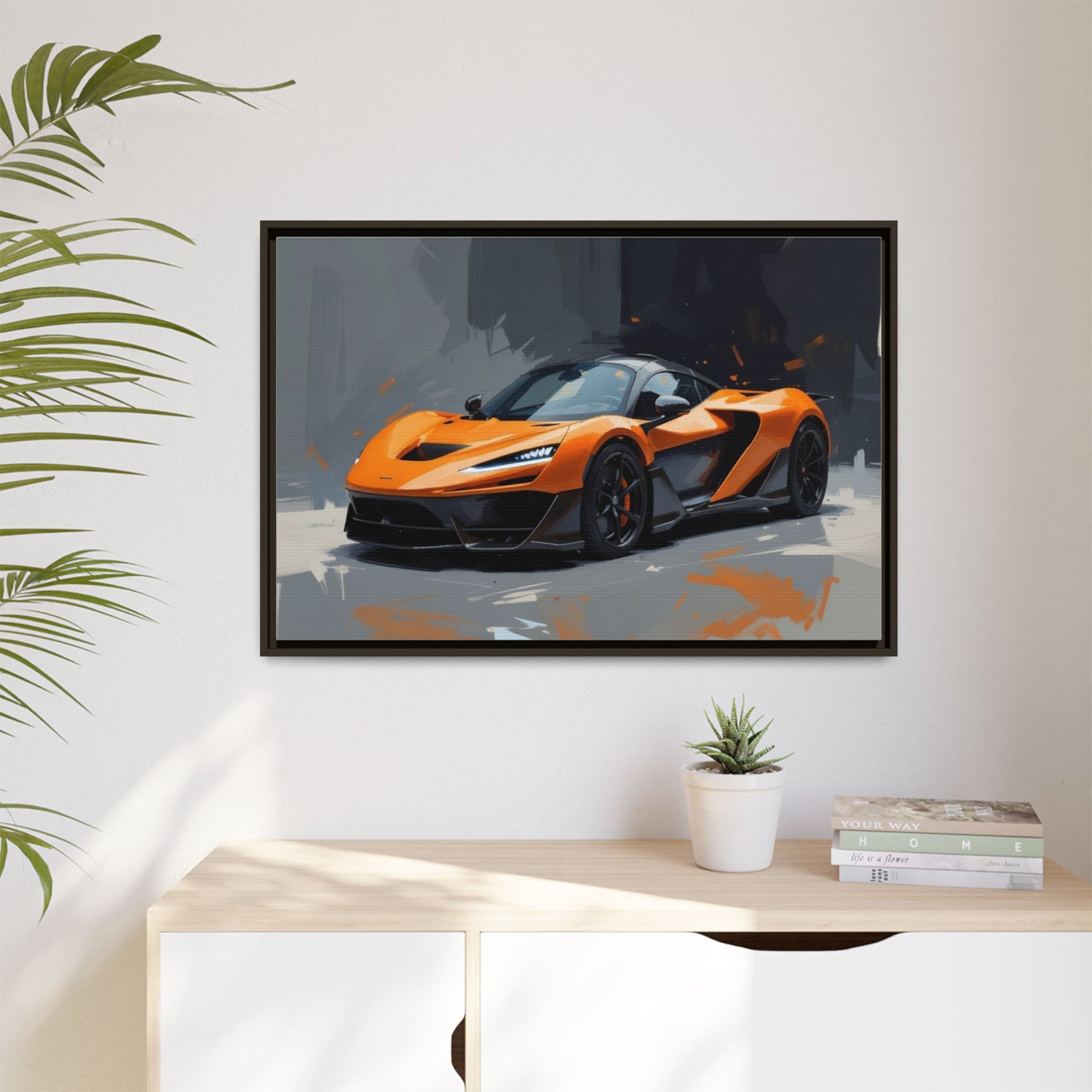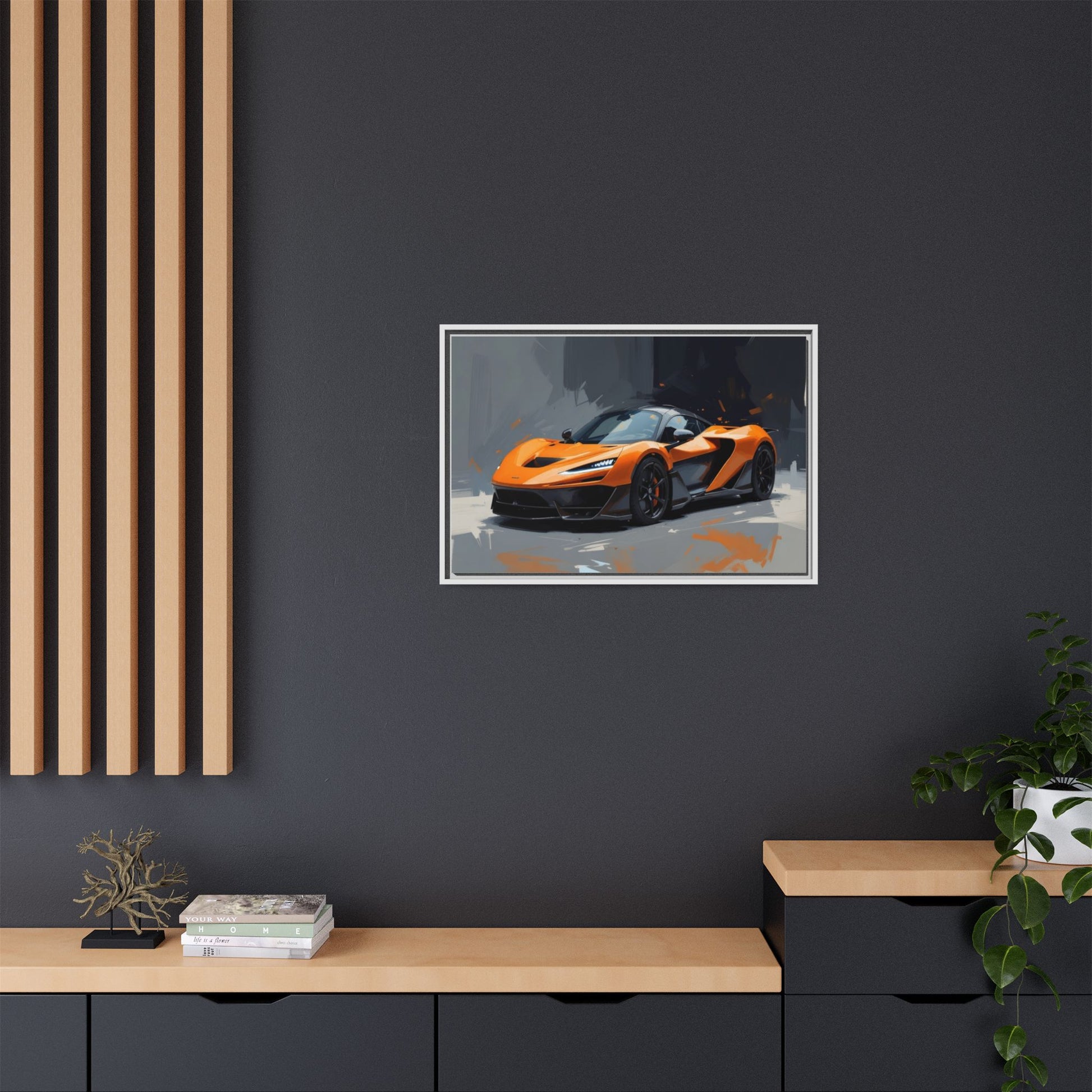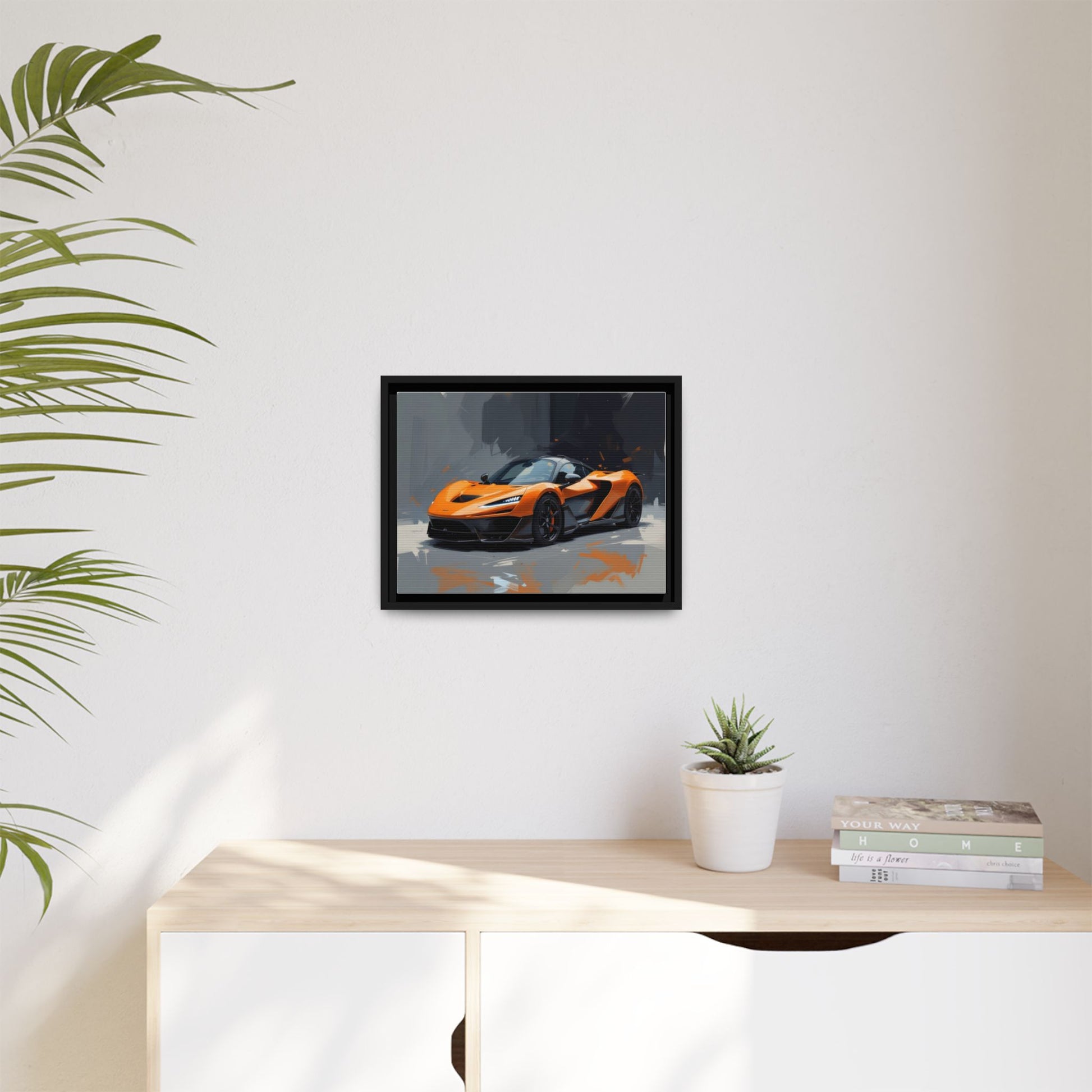 A matte canvas print with a slim black frame that captures the raw energy of a bright orange supercar. Brushstroke-style rendering and high-contrast highlights give the image motion and attitude, while the muted background keeps focus on the car’s sculpted lines. Hung in a studio, man-cave, or office, this framed canvas brings speed and modern design into a room without shouting—it’s a discreet statement piece that reads as both art and automotive obsession.