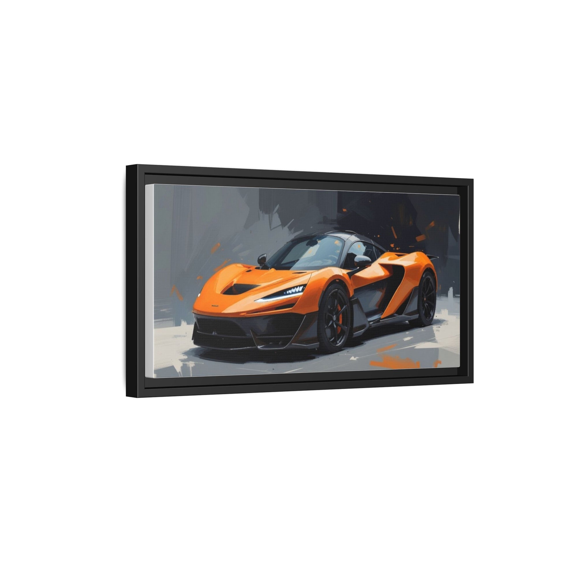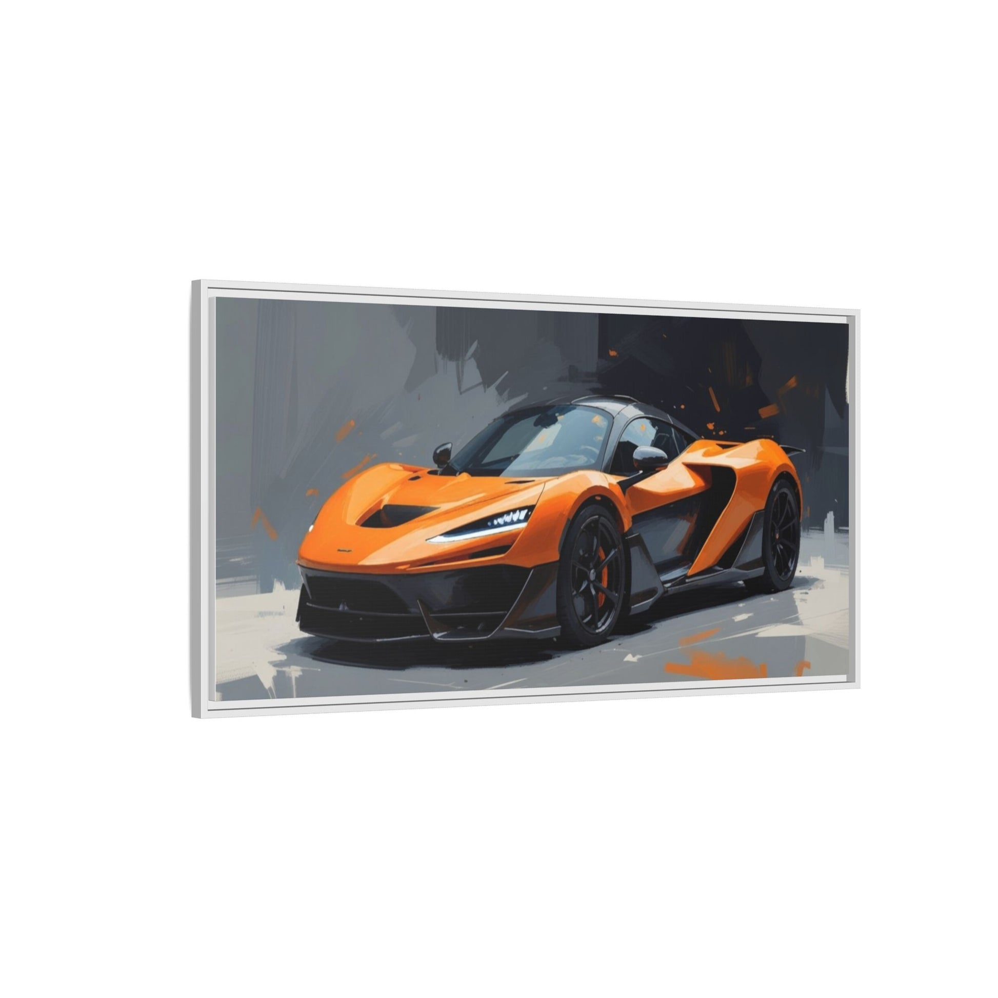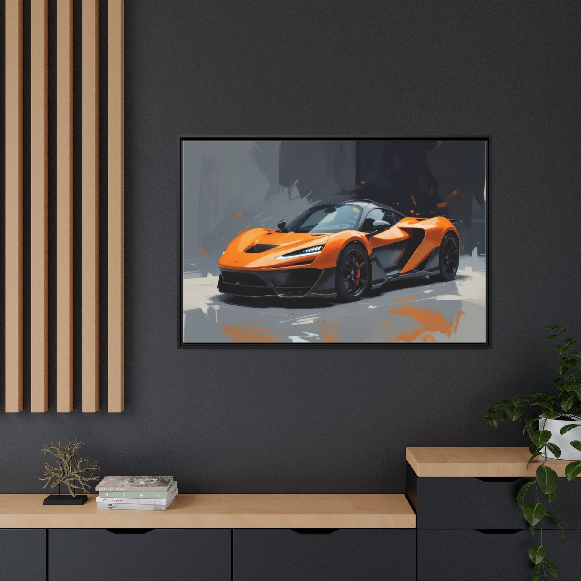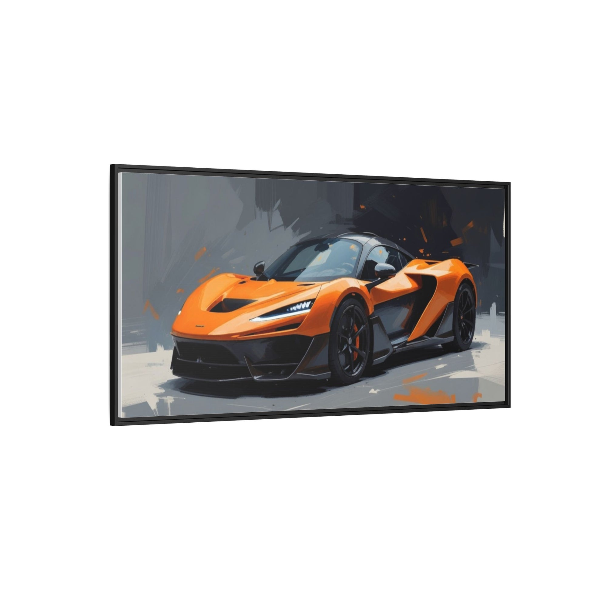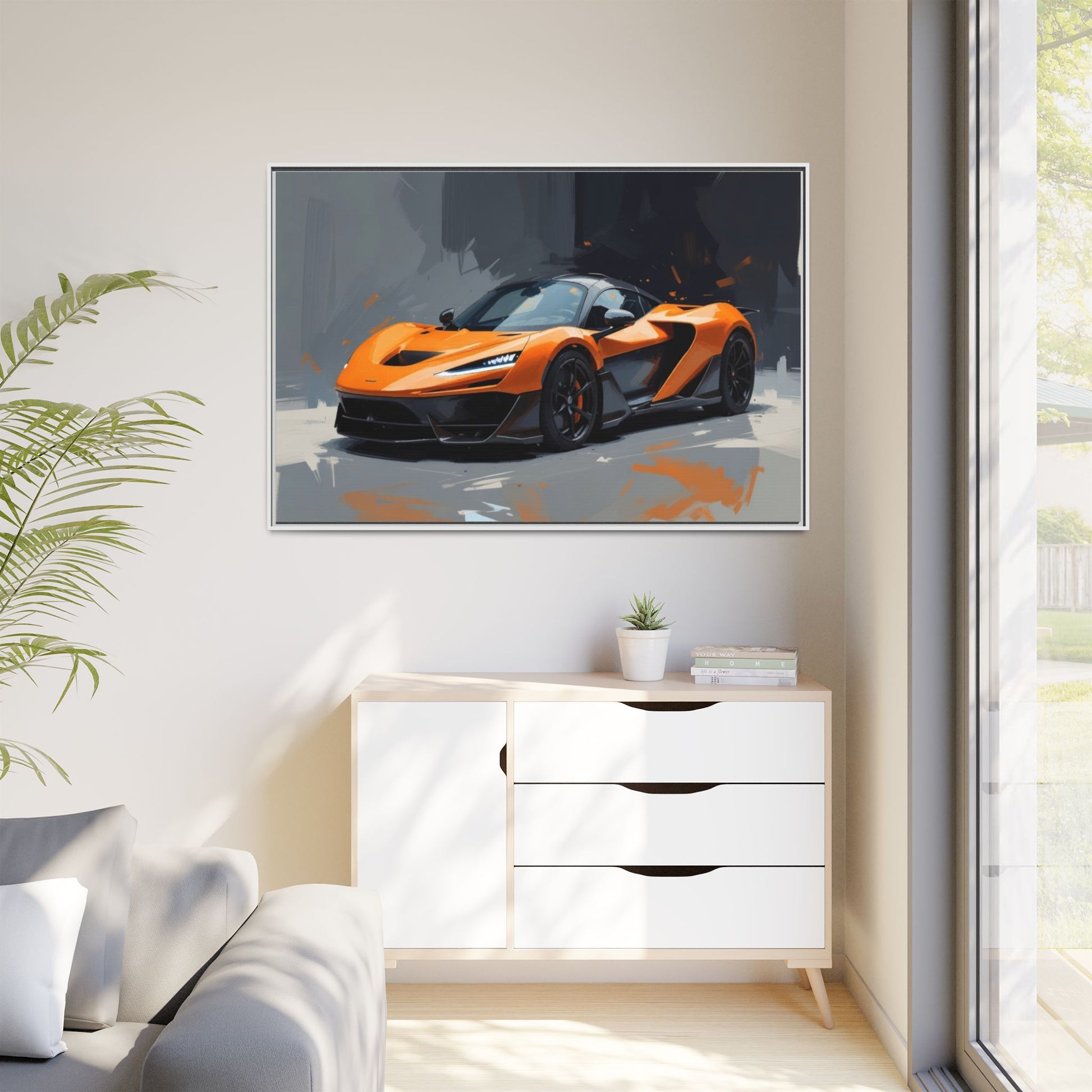 A matte canvas print with a slim black frame that captures the raw energy of a bright orange supercar. Brushstroke-style rendering and high-contrast highlights give the image motion and attitude, while the muted background keeps focus on the car’s sculpted lines. Hung in a studio, man-cave, or office, this framed canvas brings speed and modern design into a room without shouting—it’s a discreet statement piece that reads as both art and automotive obsession.