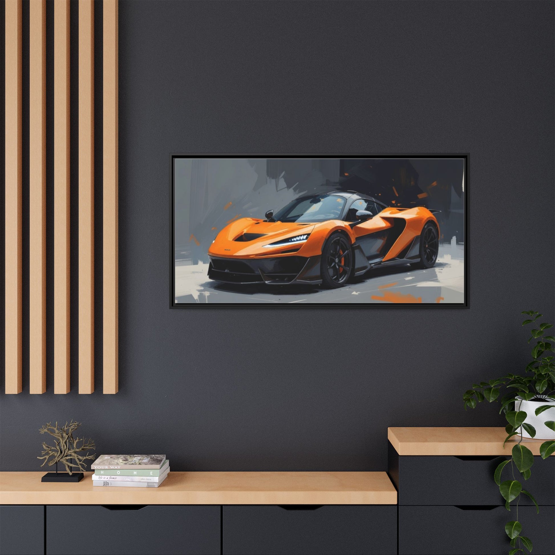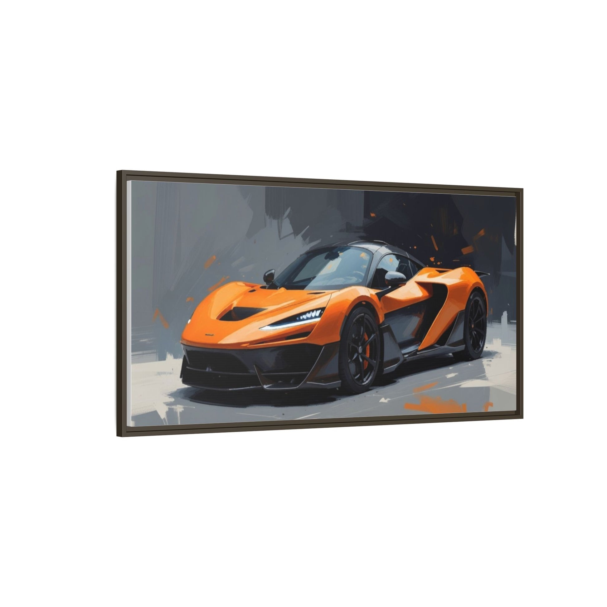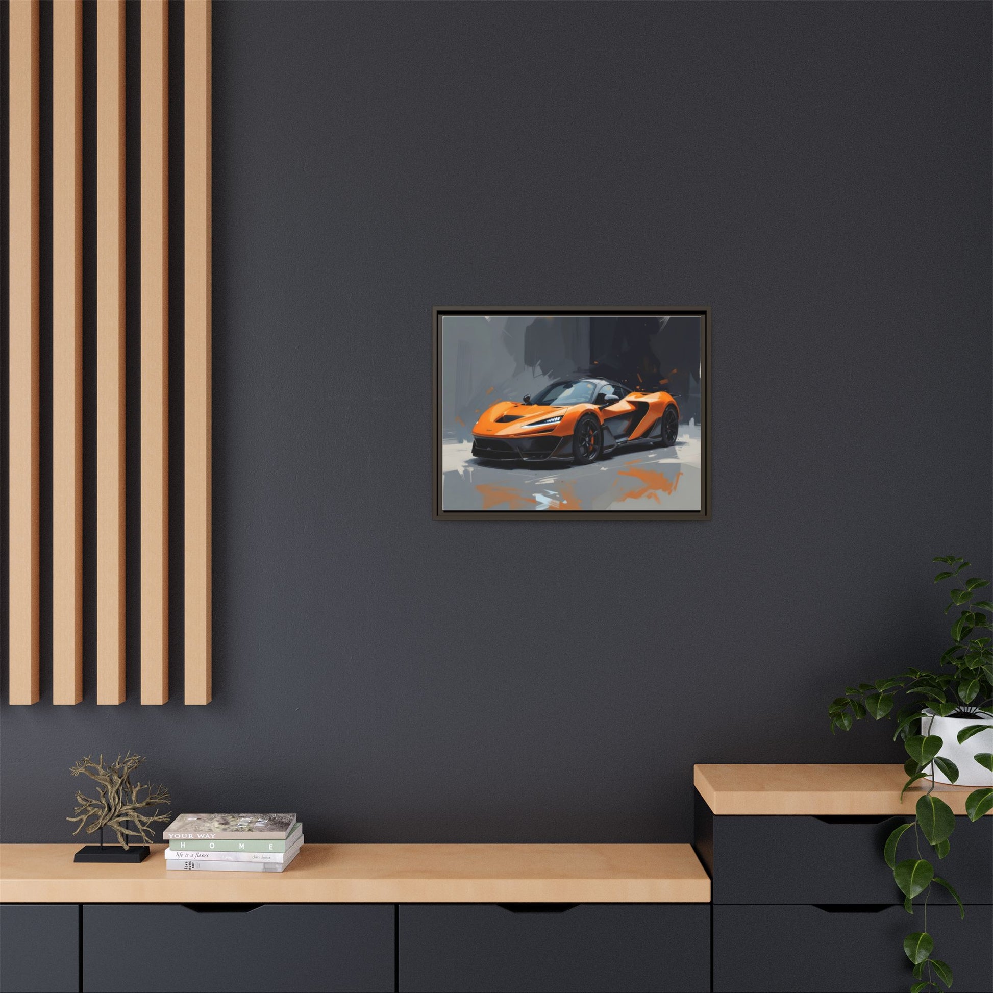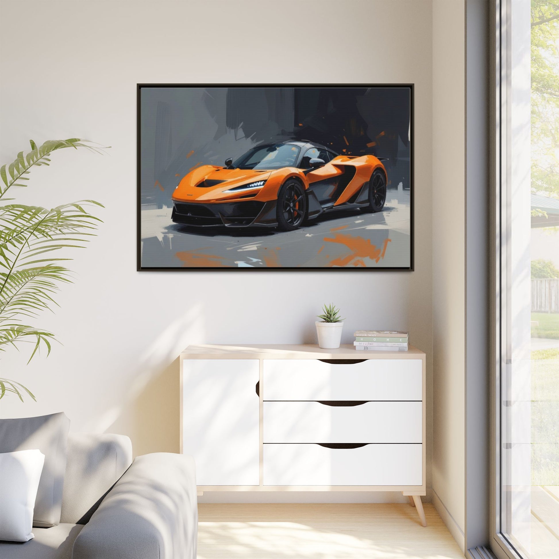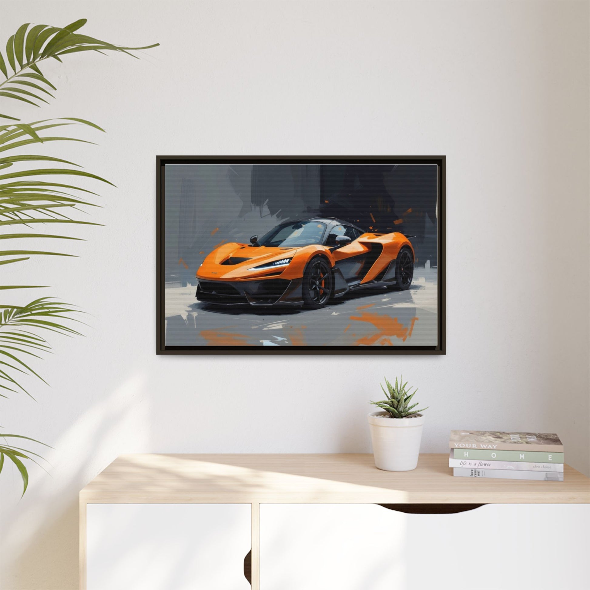 A matte canvas print with a slim black frame that captures the raw energy of a bright orange supercar. Brushstroke-style rendering and high-contrast highlights give the image motion and attitude, while the muted background keeps focus on the car’s sculpted lines. Hung in a studio, man-cave, or office, this framed canvas brings speed and modern design into a room without shouting—it’s a discreet statement piece that reads as both art and automotive obsession.