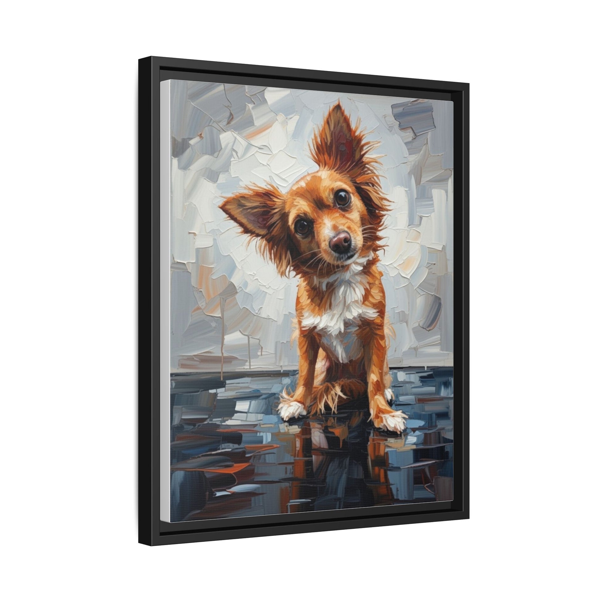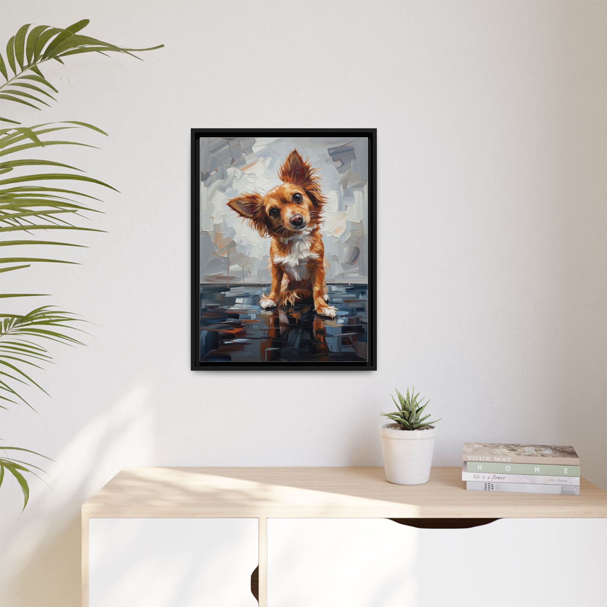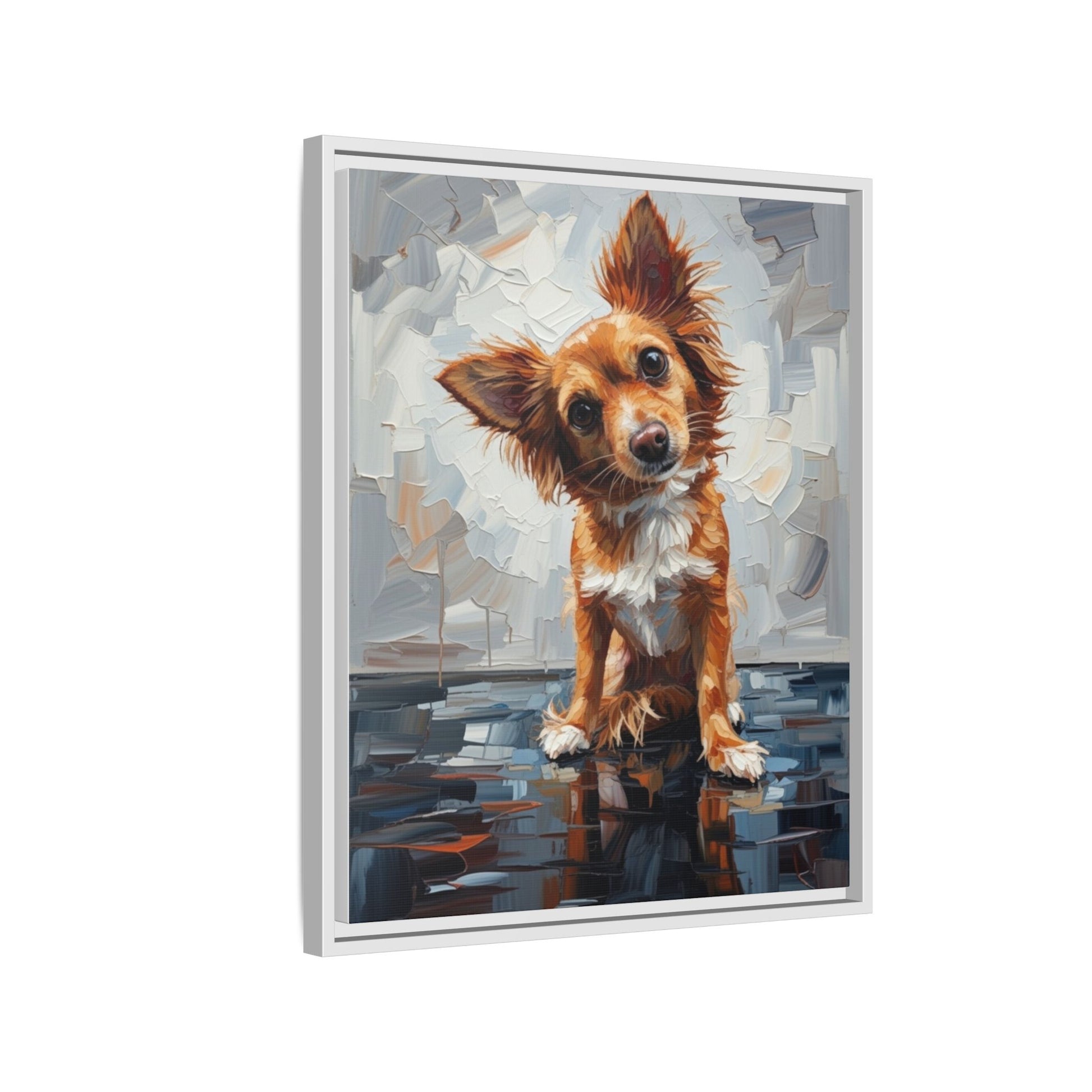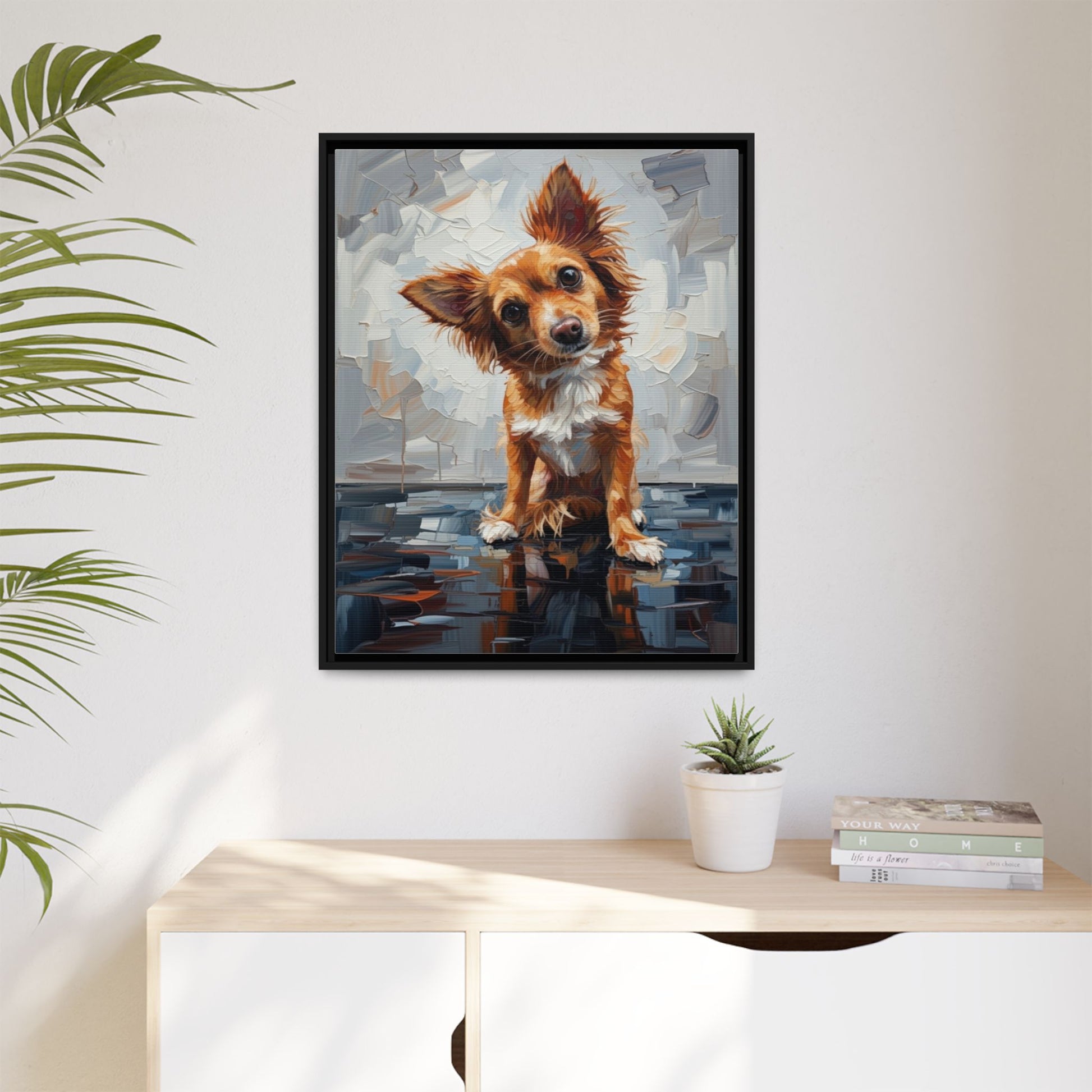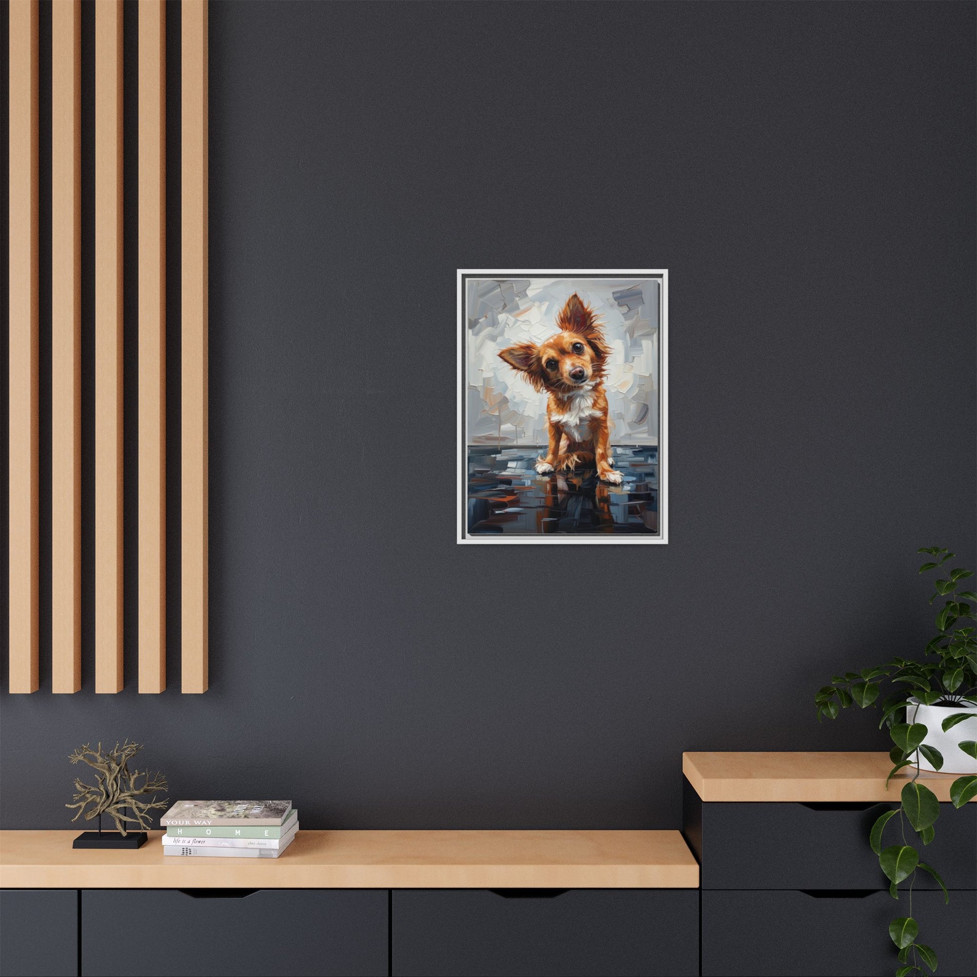 Bring home a warm, lively moment with this framed matte canvas print. The artwork captures a curious little dog with a head-tilt that feels like a private joke—painted with lively brushstrokes and rich, layered color that pop against a soft, abstract background. Hung in a hallway, beside a reading nook, or over a mantel, the portrait adds a touch of playful charm and handcrafted character to everyday life. The subtle matte finish keeps reflections low and the textured surface gives depth to each brushstroke, so the image reads like an original painting from across the room.