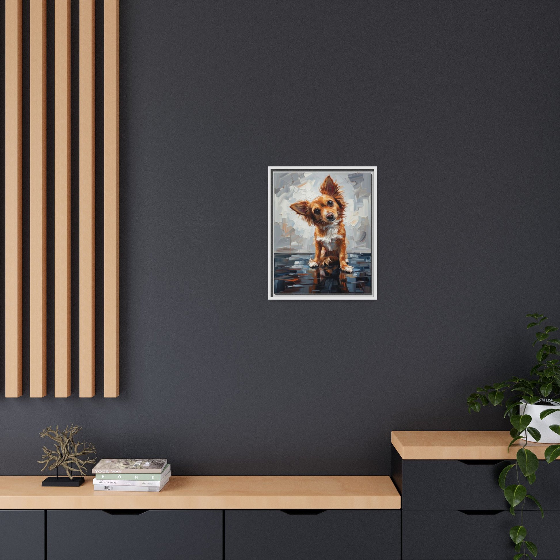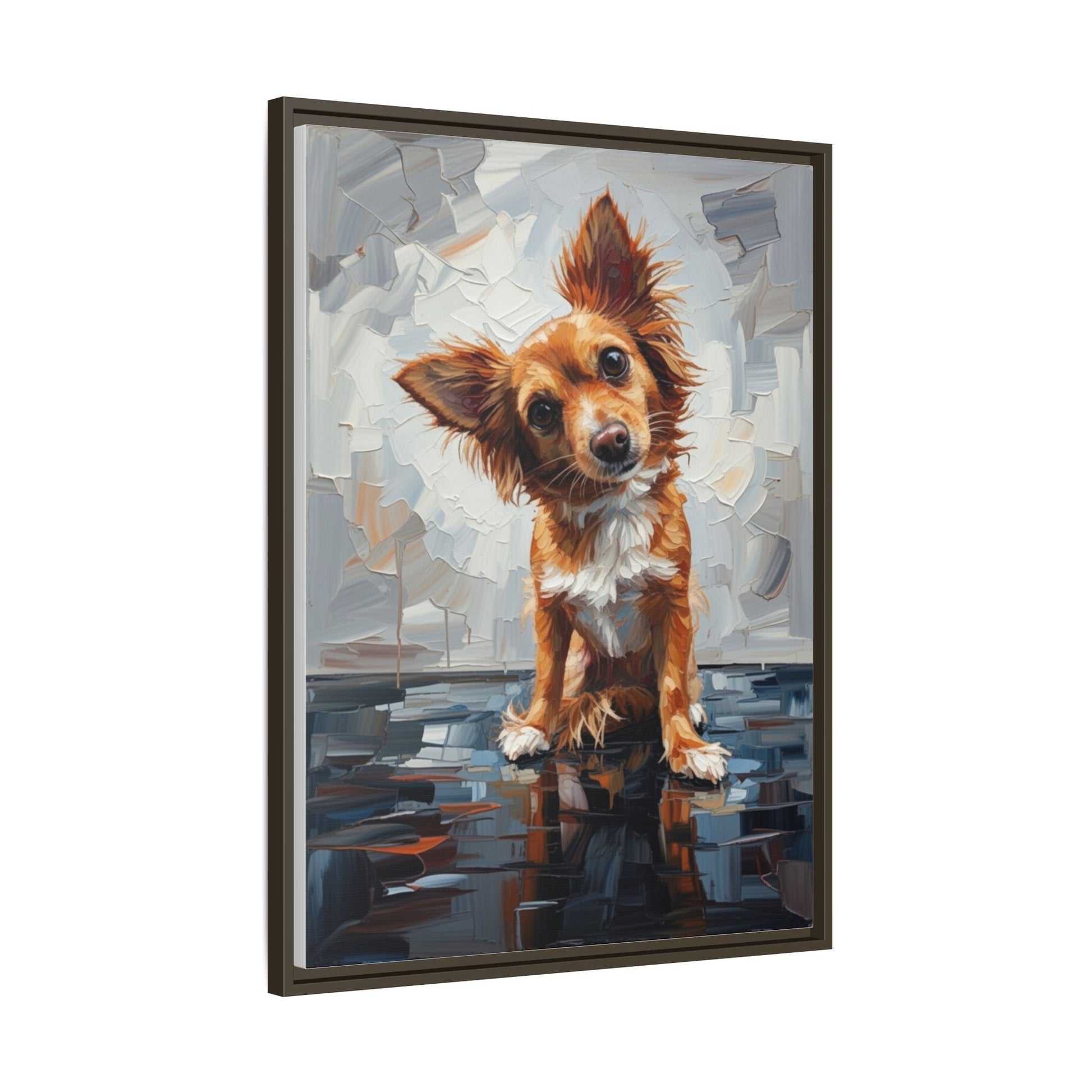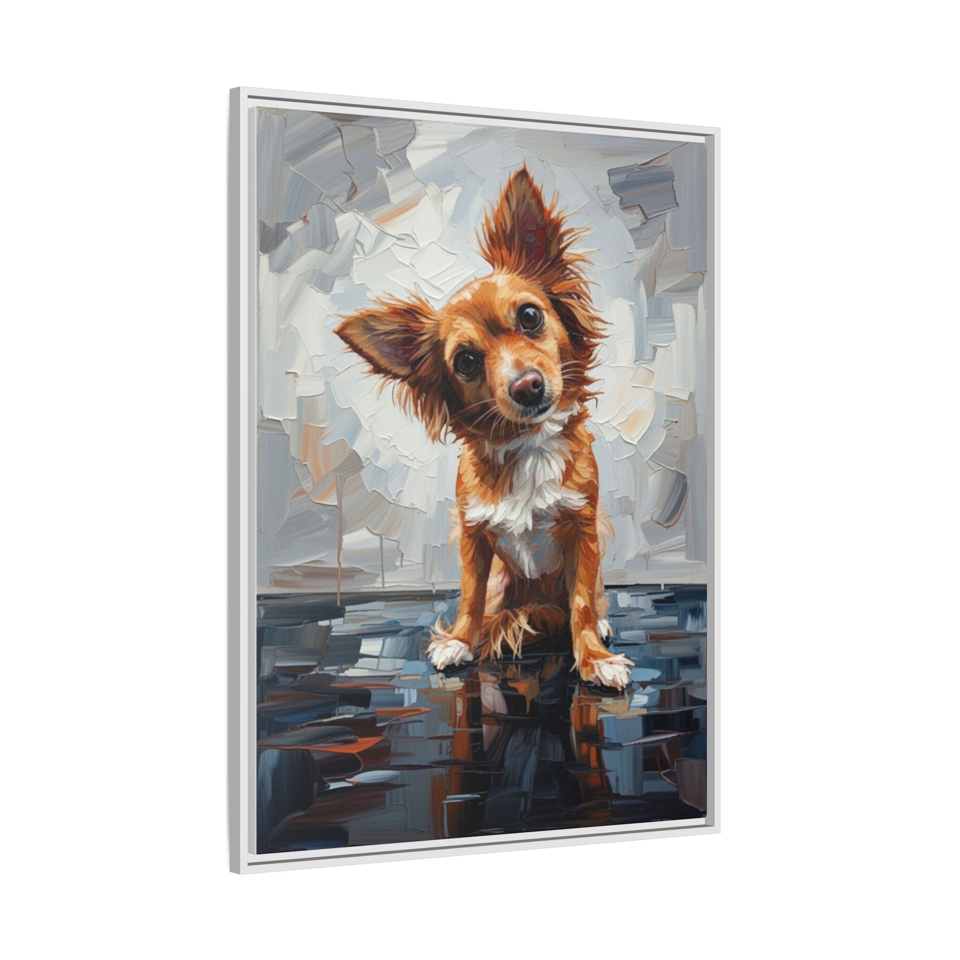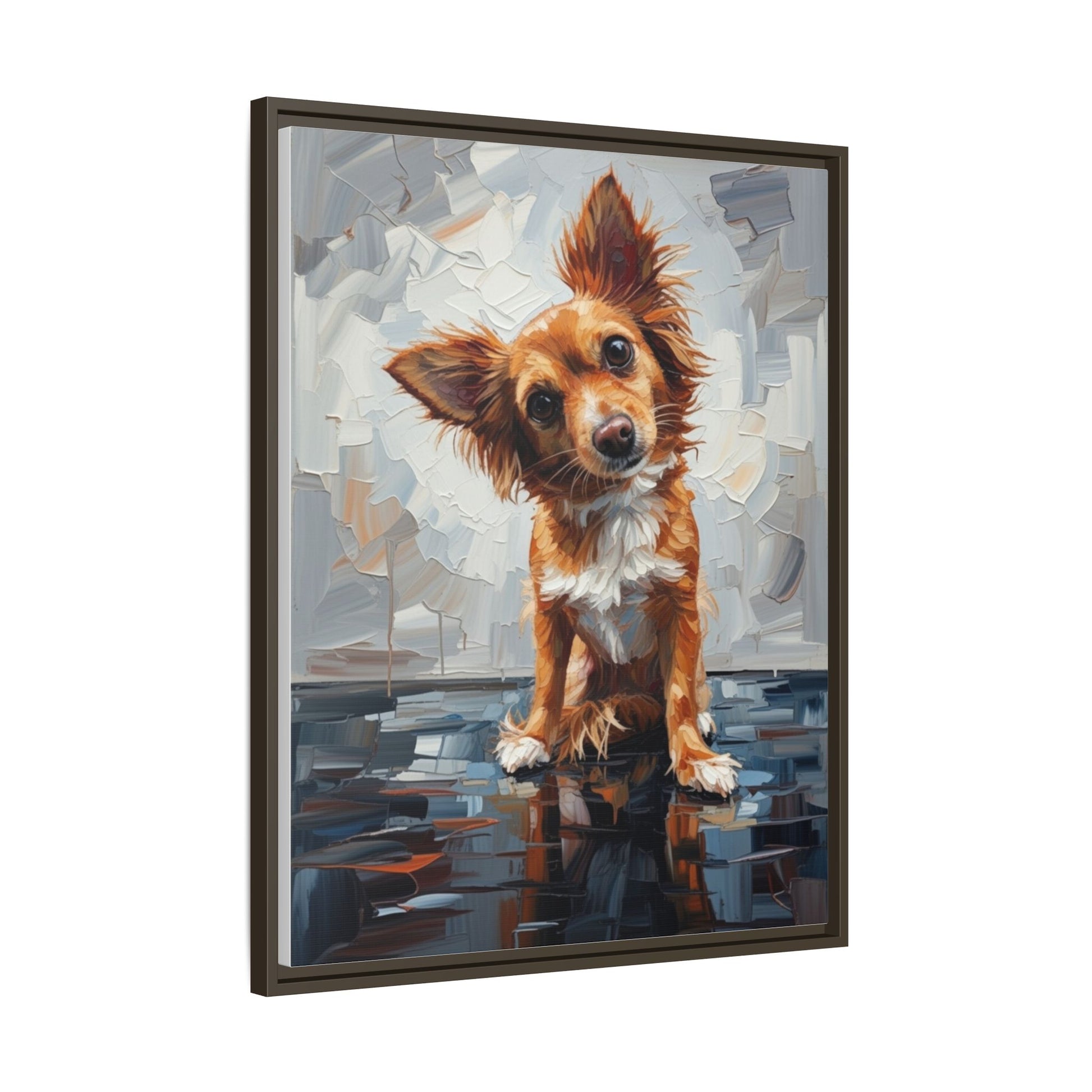 Bring home a warm, lively moment with this framed matte canvas print. The artwork captures a curious little dog with a head-tilt that feels like a private joke—painted with lively brushstrokes and rich, layered color that pop against a soft, abstract background. Hung in a hallway, beside a reading nook, or over a mantel, the portrait adds a touch of playful charm and handcrafted character to everyday life. The subtle matte finish keeps reflections low and the textured surface gives depth to each brushstroke, so the image reads like an original painting from across the room.
